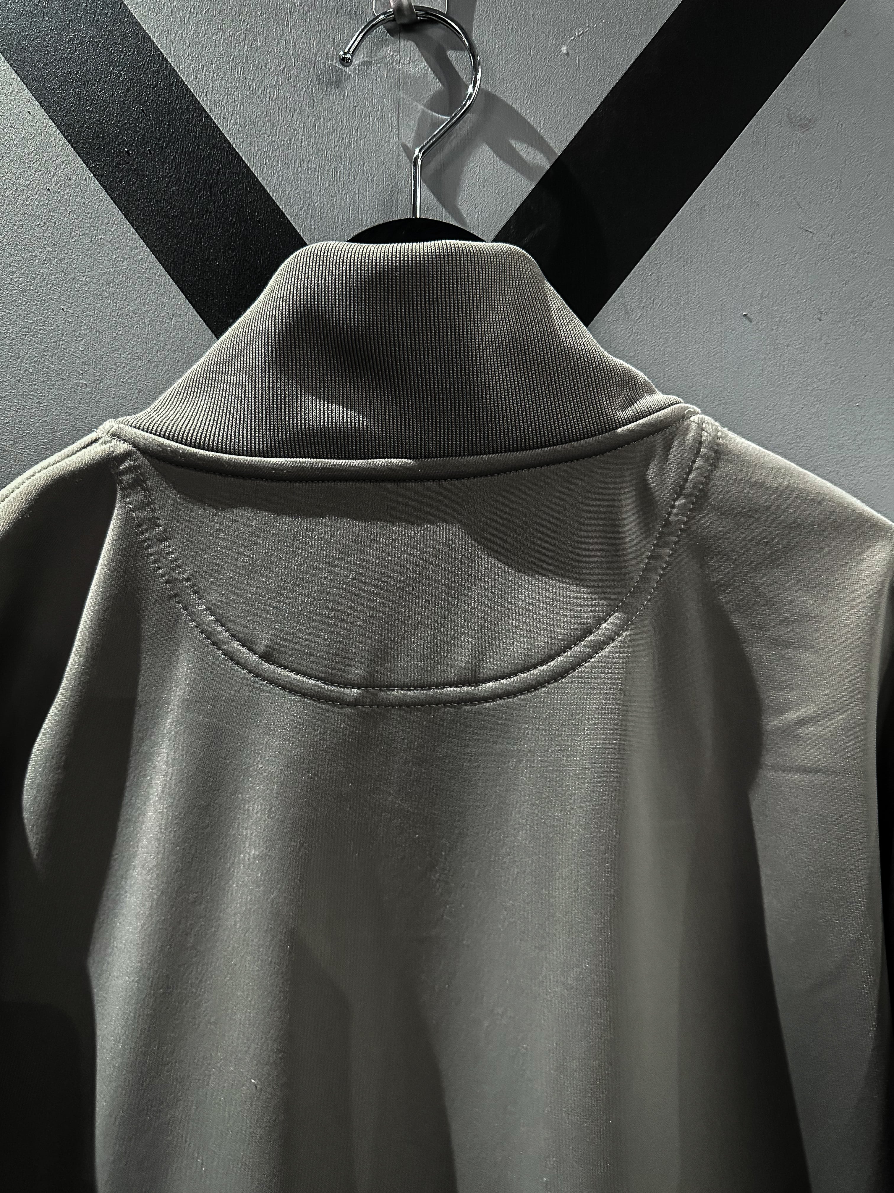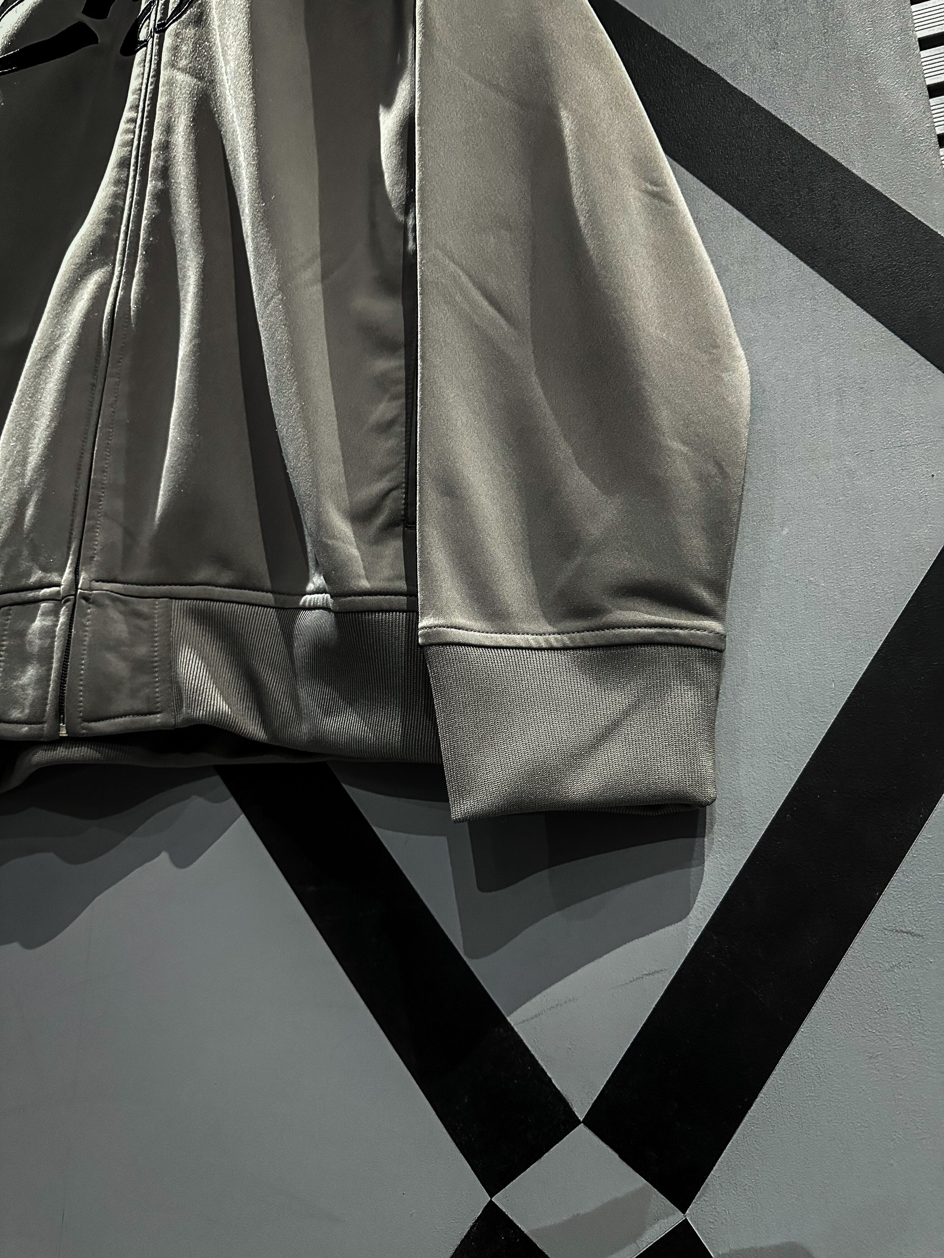フロントにブランドのロゴを、黒のカラー切り替えと刺繍によって施し、袖には黒のナイロンラインを切り替えたデザインのトラックジャケット。