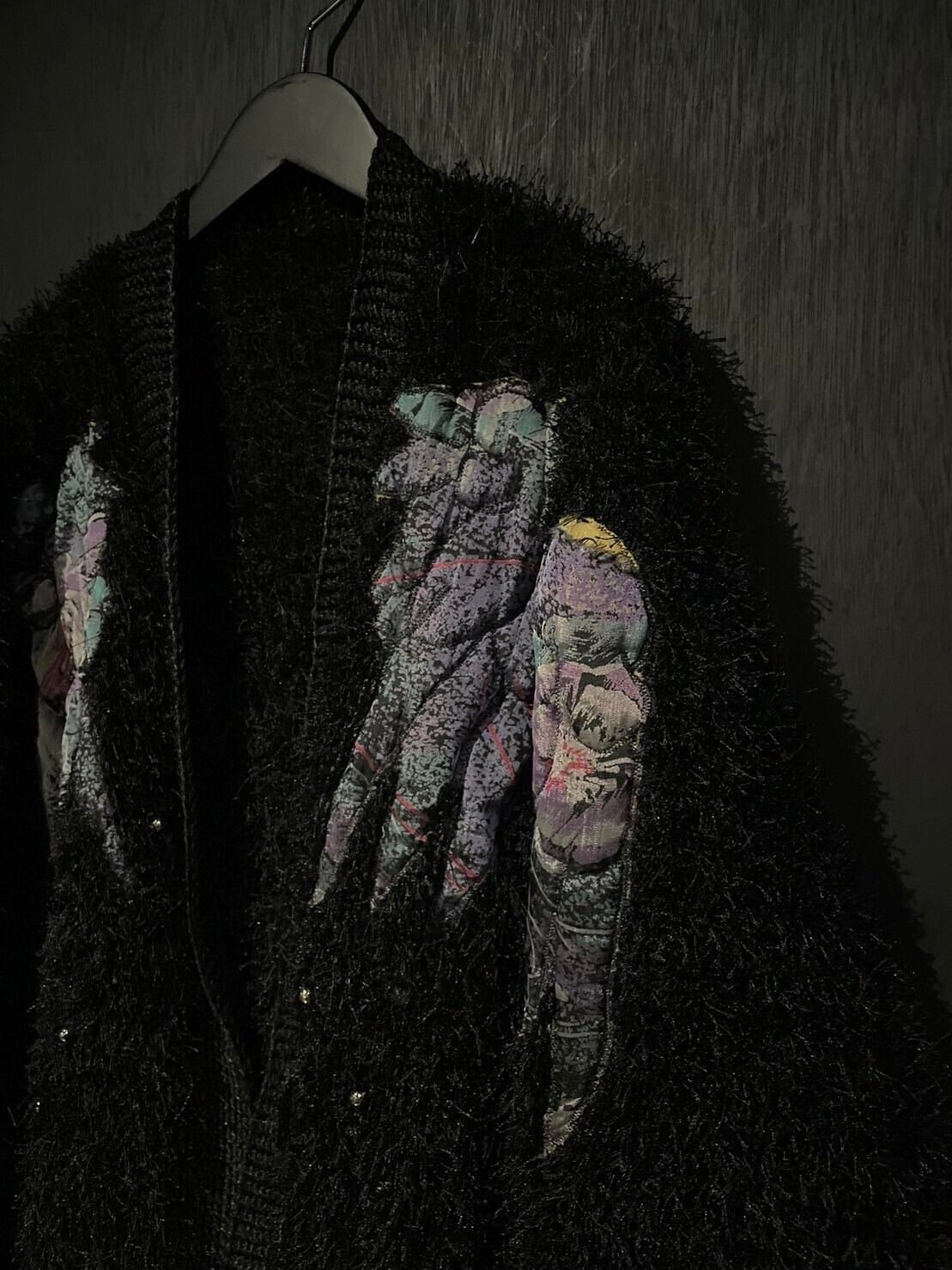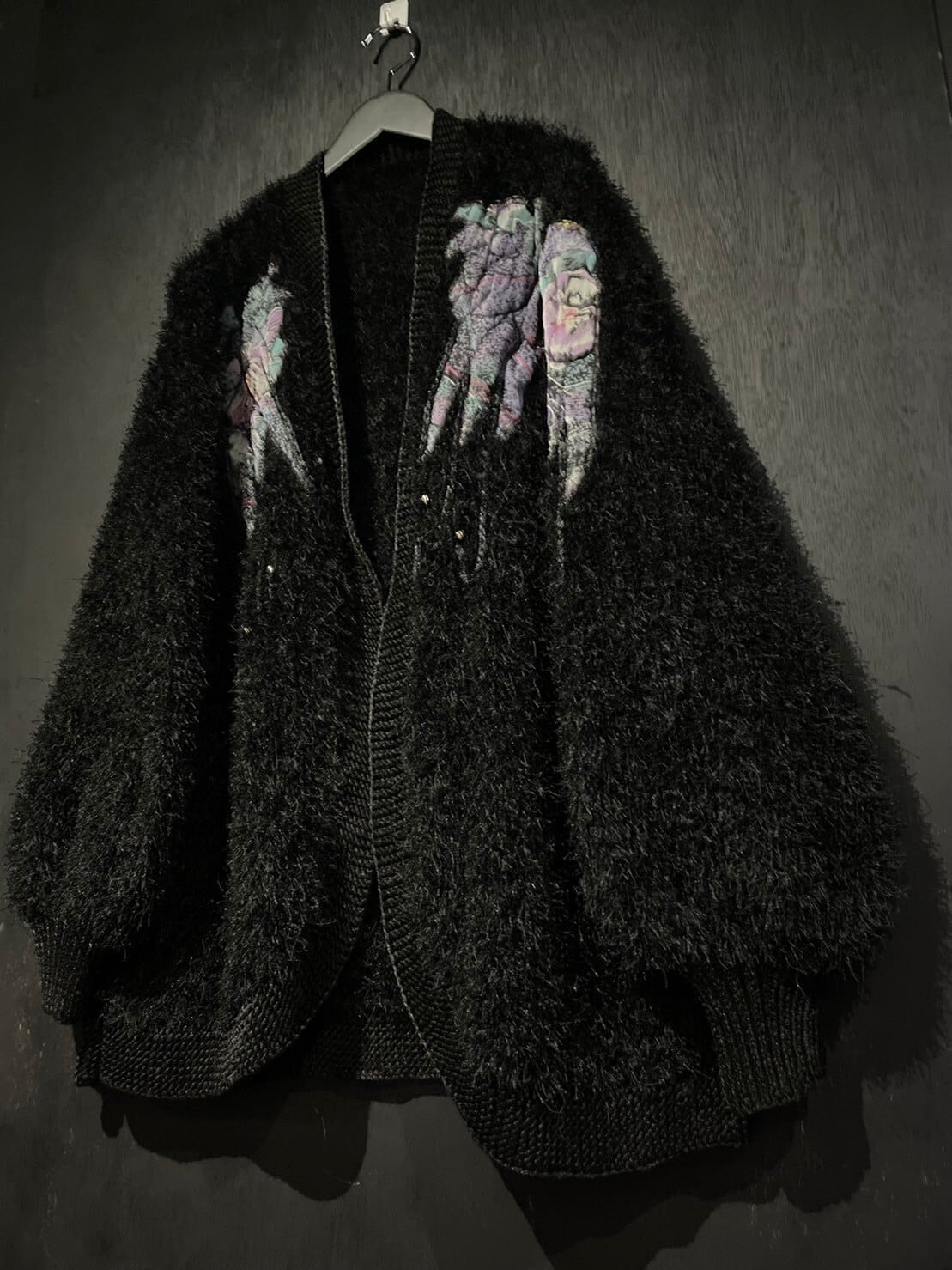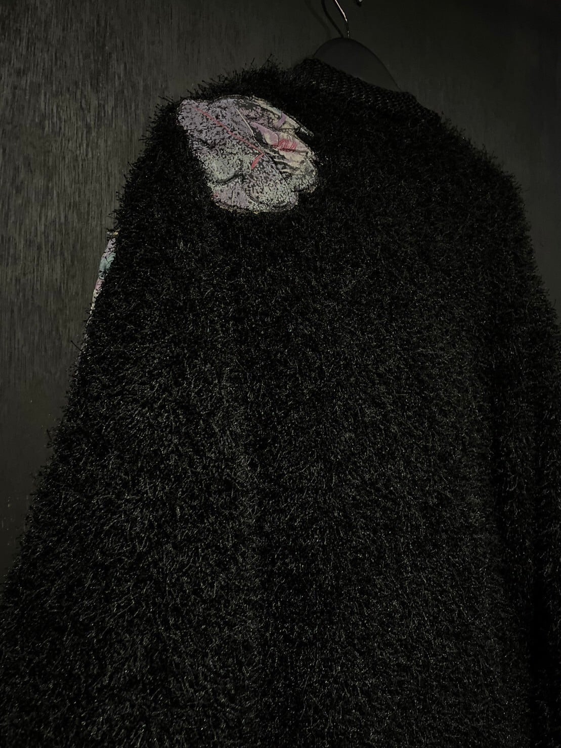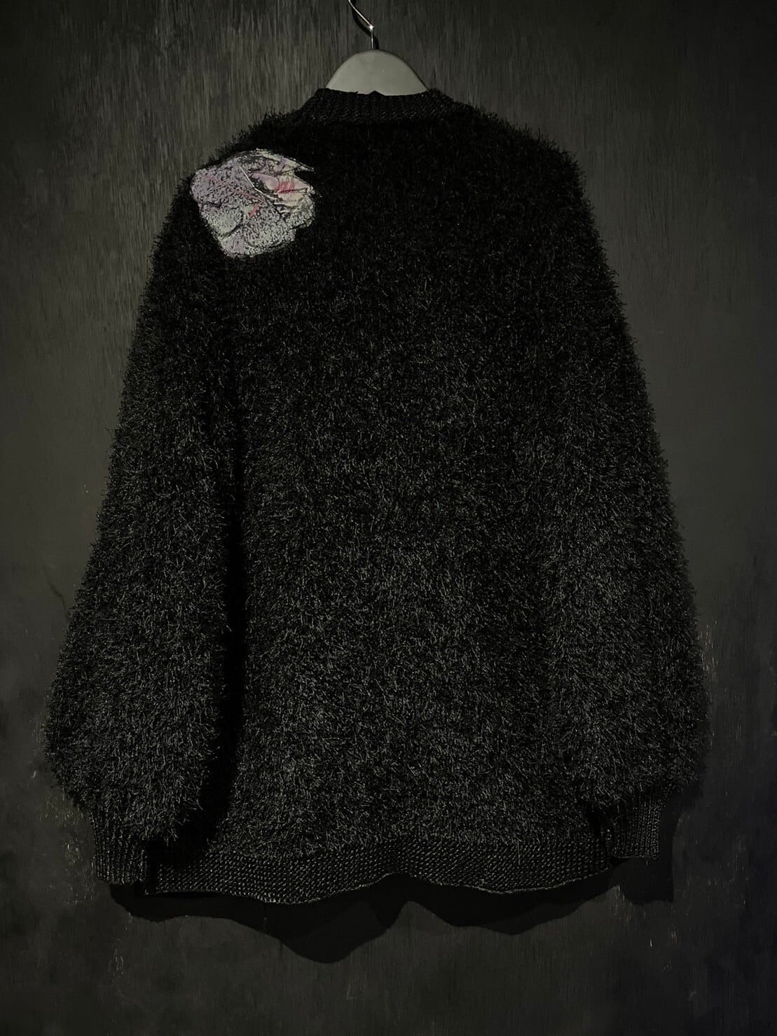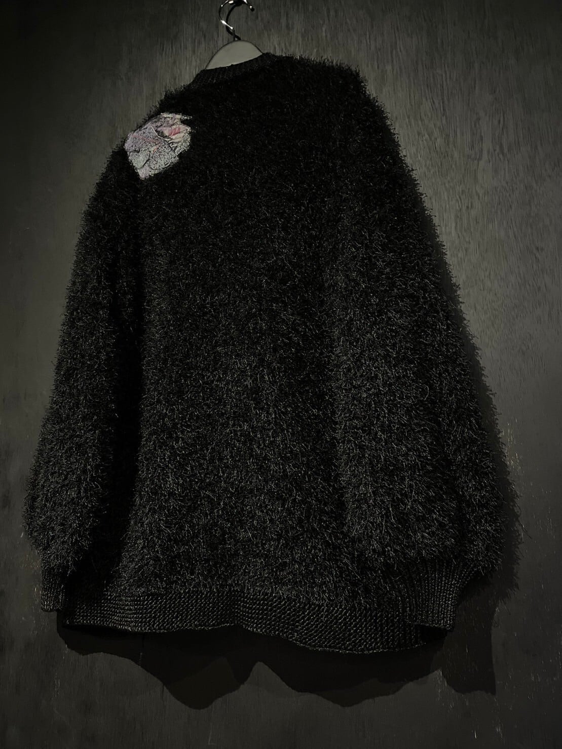 毛足の長いブラックのシャギー素材をボディ使用したカーディガン。シャギー特有の質感、そして光沢感によって妖艶な雰囲気を垂れ流す1着です。
