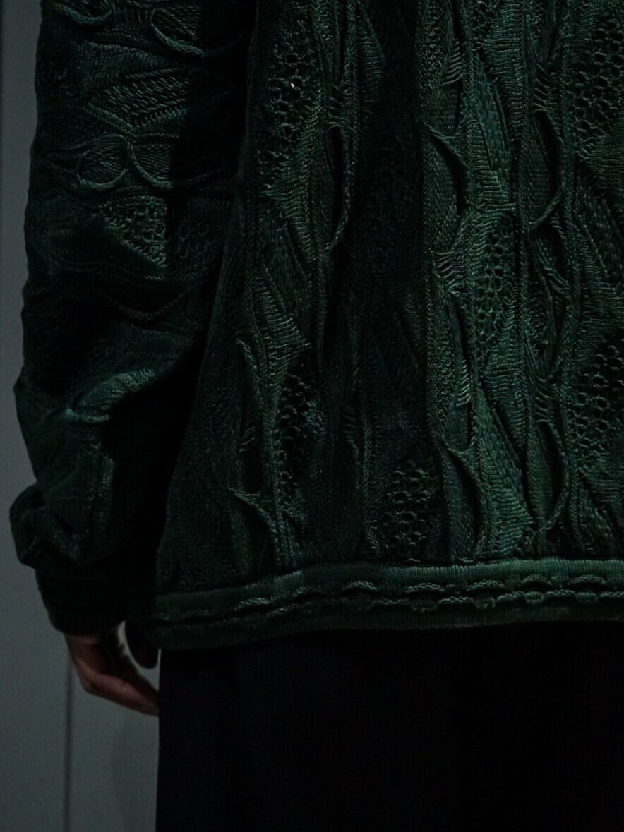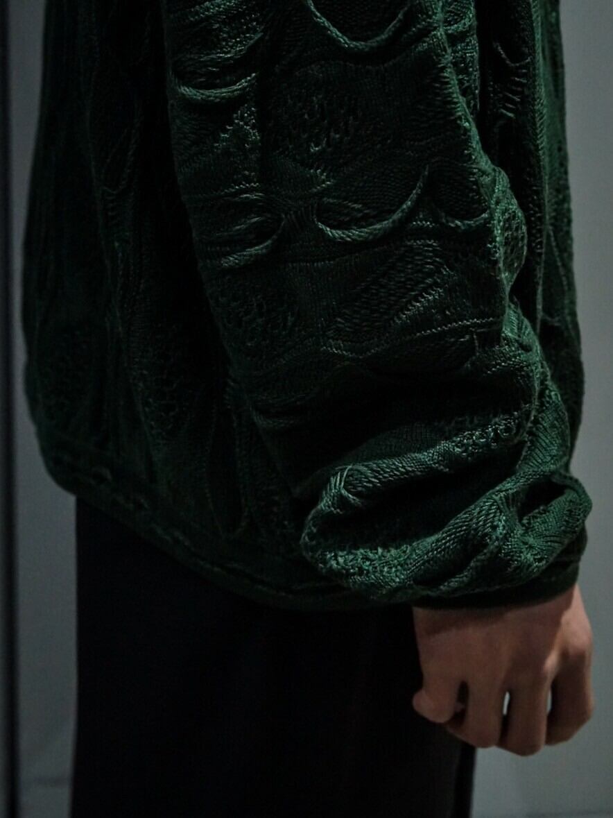 クージーならではのハイクオリティのニッティングによって生み出された、美しい立体感のある3Dニットを使用した超〜スペシャルな1着。多彩な色使いのものが多い中、こちらは美しいグリーンのワントーンで仕上げられた稀有な逸品。