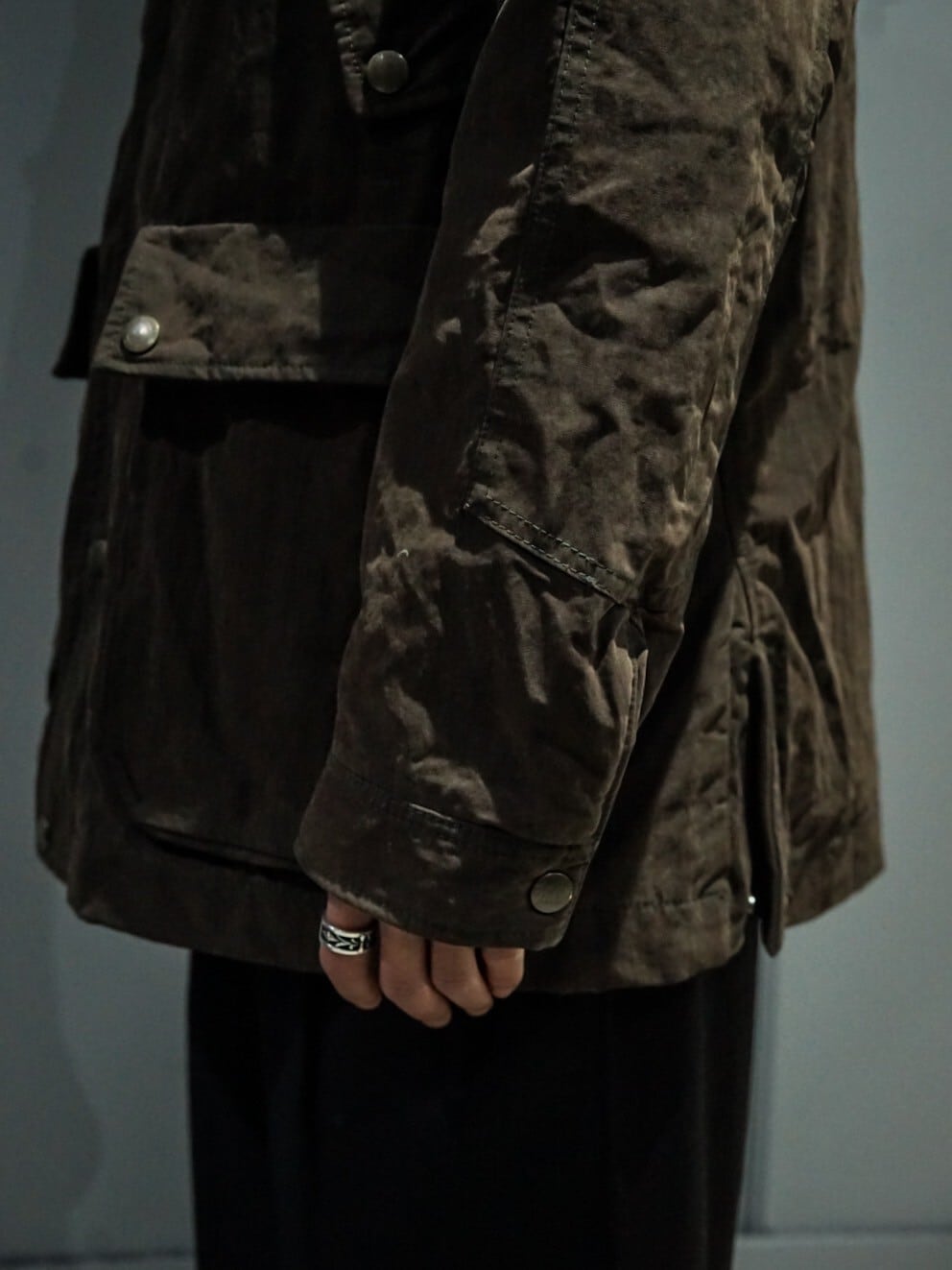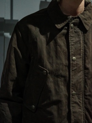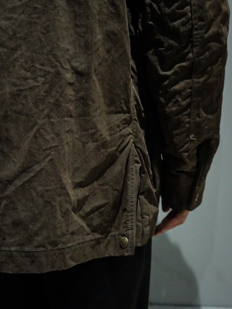 コットン素材のボディにオイルを染み込ませたオイルドコットン使用したジャケット。オイルドジャケットならではの無骨さに加えクラシカルな風合いを漂わせる1着。