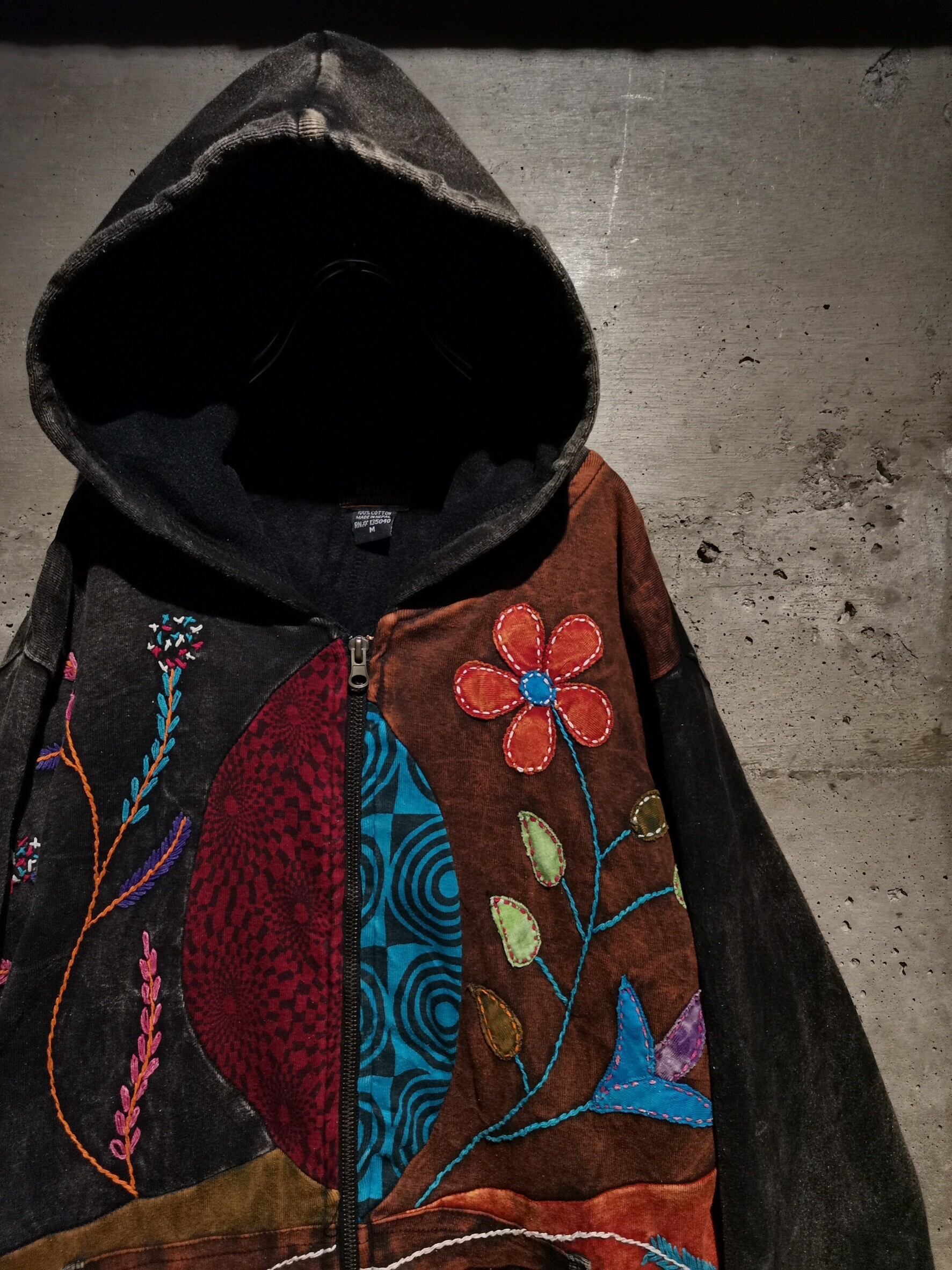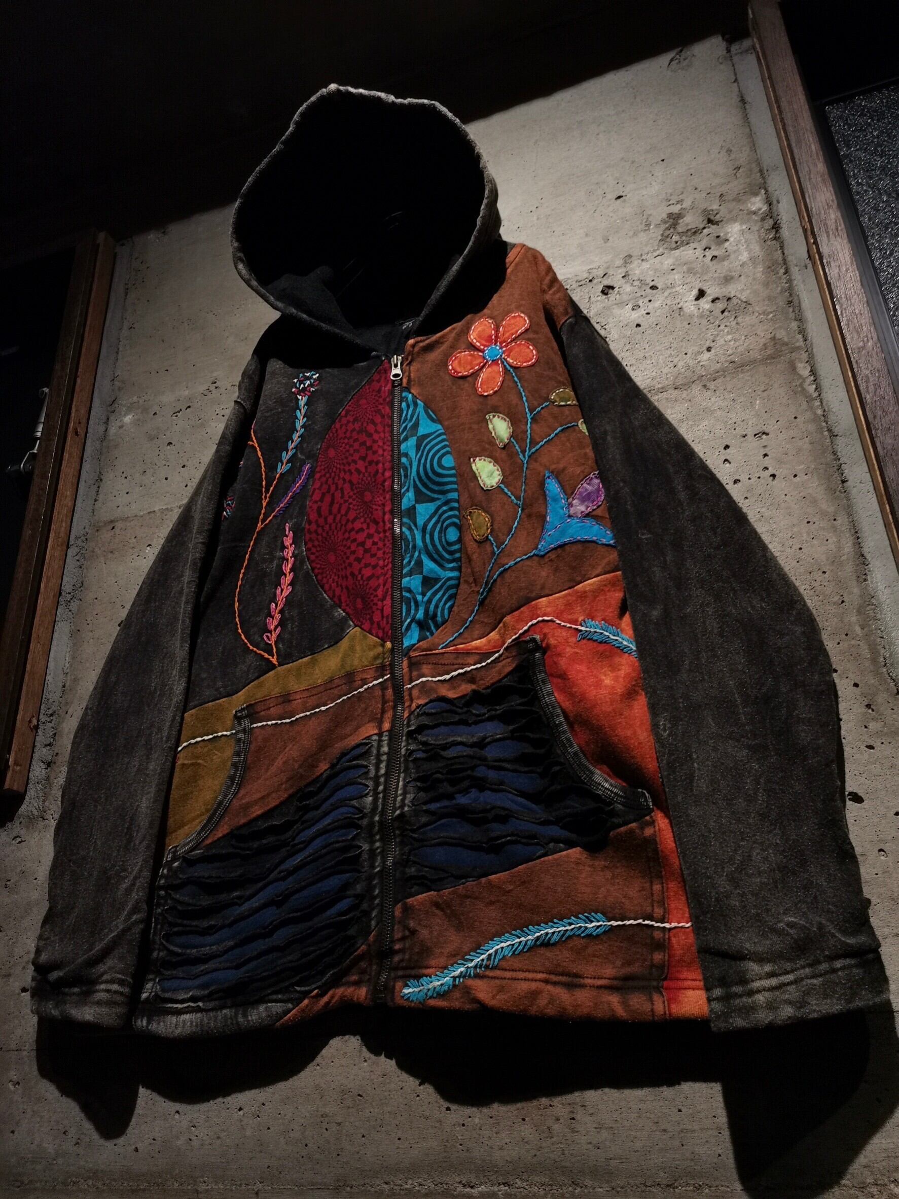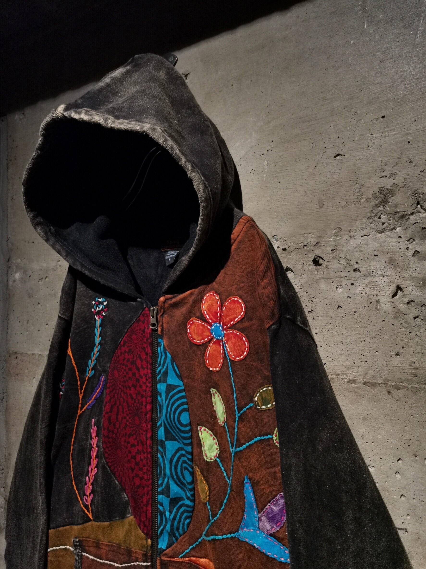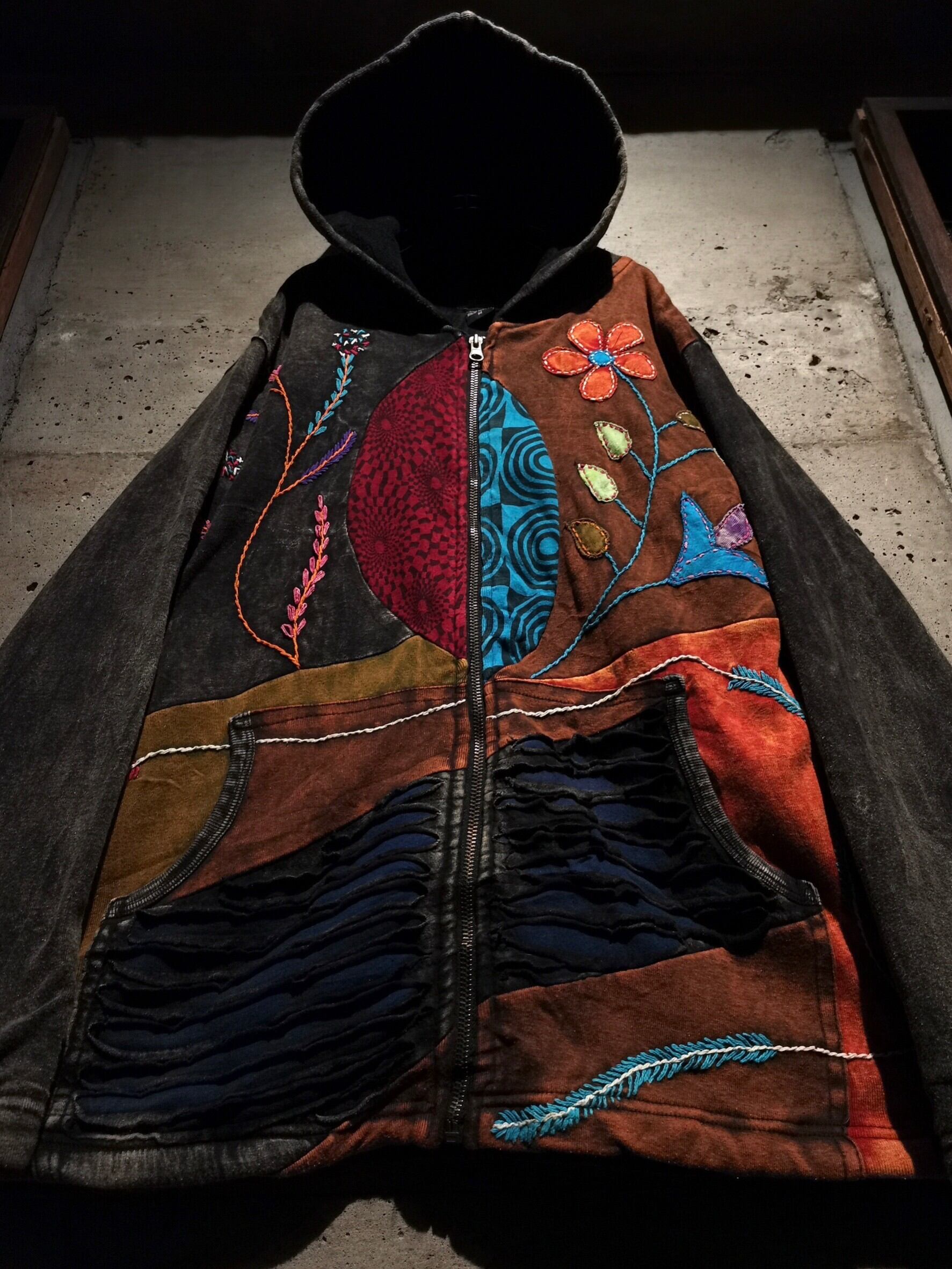 美しいフェードが効いたチャコールグレーのボディをベースに、赤×青×紫×橙といったマルチな配色と、花の刺繍でパッチワークに落とし込んだジップアップパーカー。