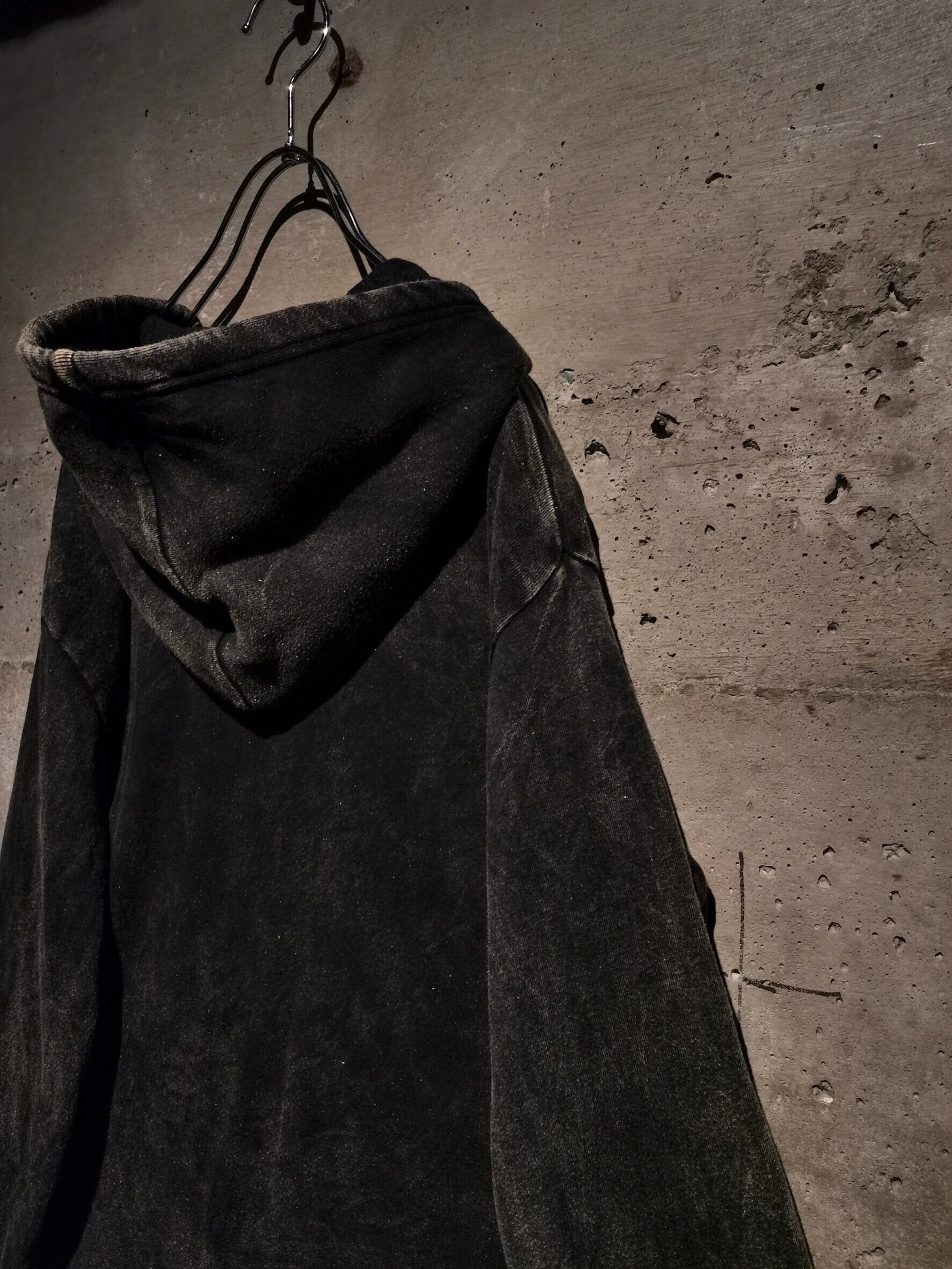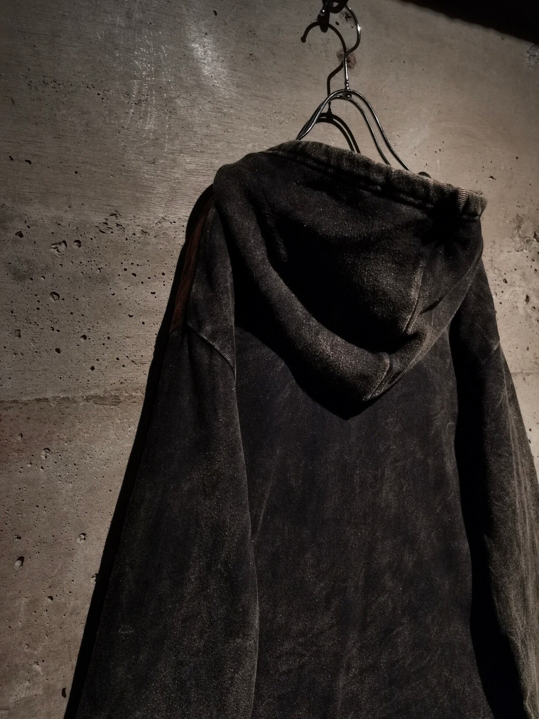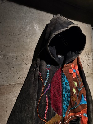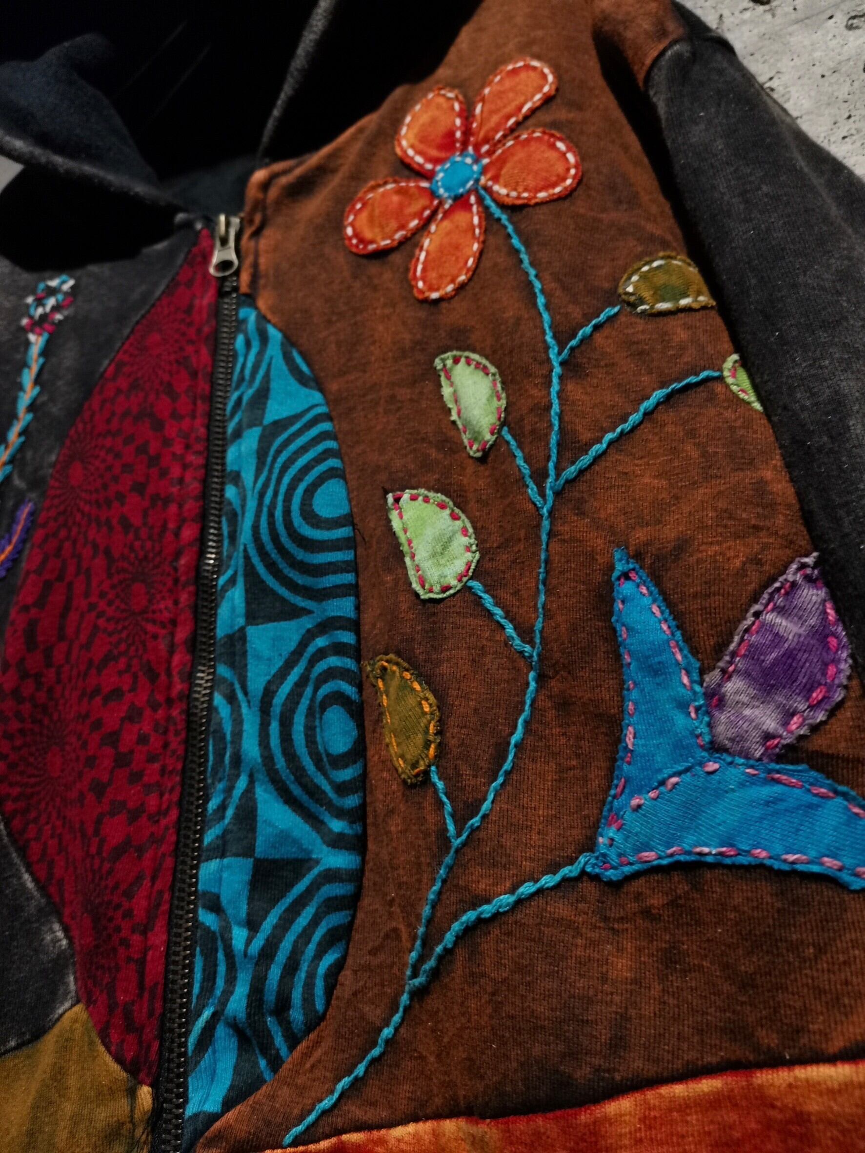 美しいフェードが効いたチャコールグレーのボディをベースに、赤×青×紫×橙といったマルチな配色と、花の刺繍でパッチワークに落とし込んだジップアップパーカー。