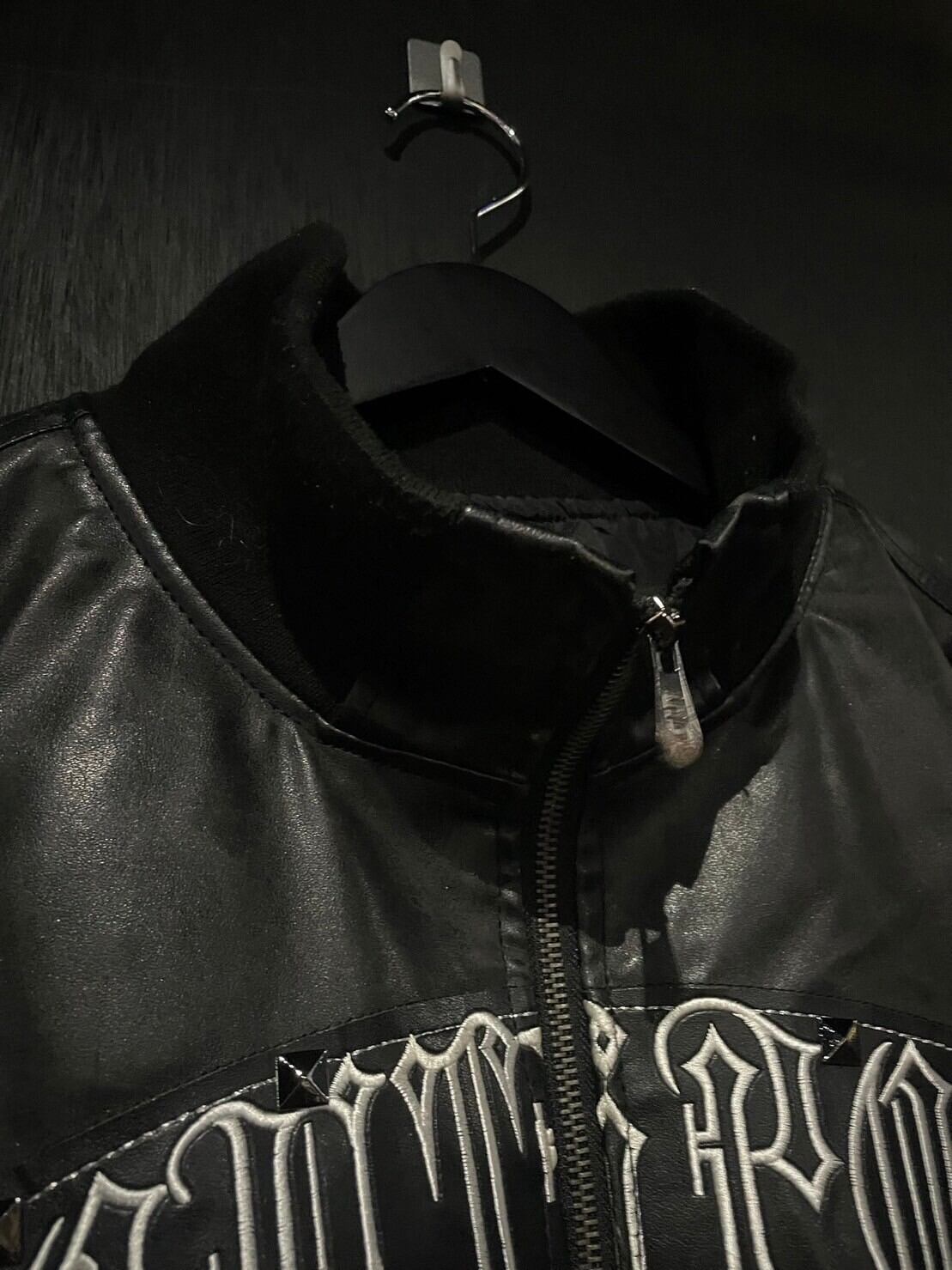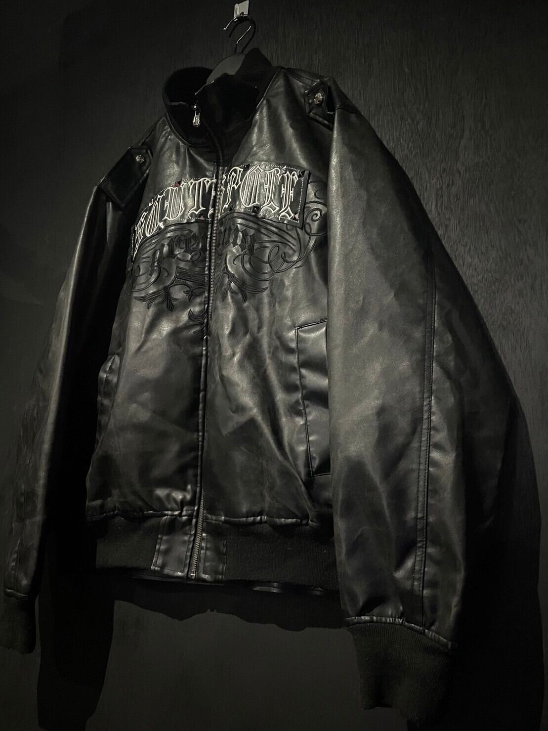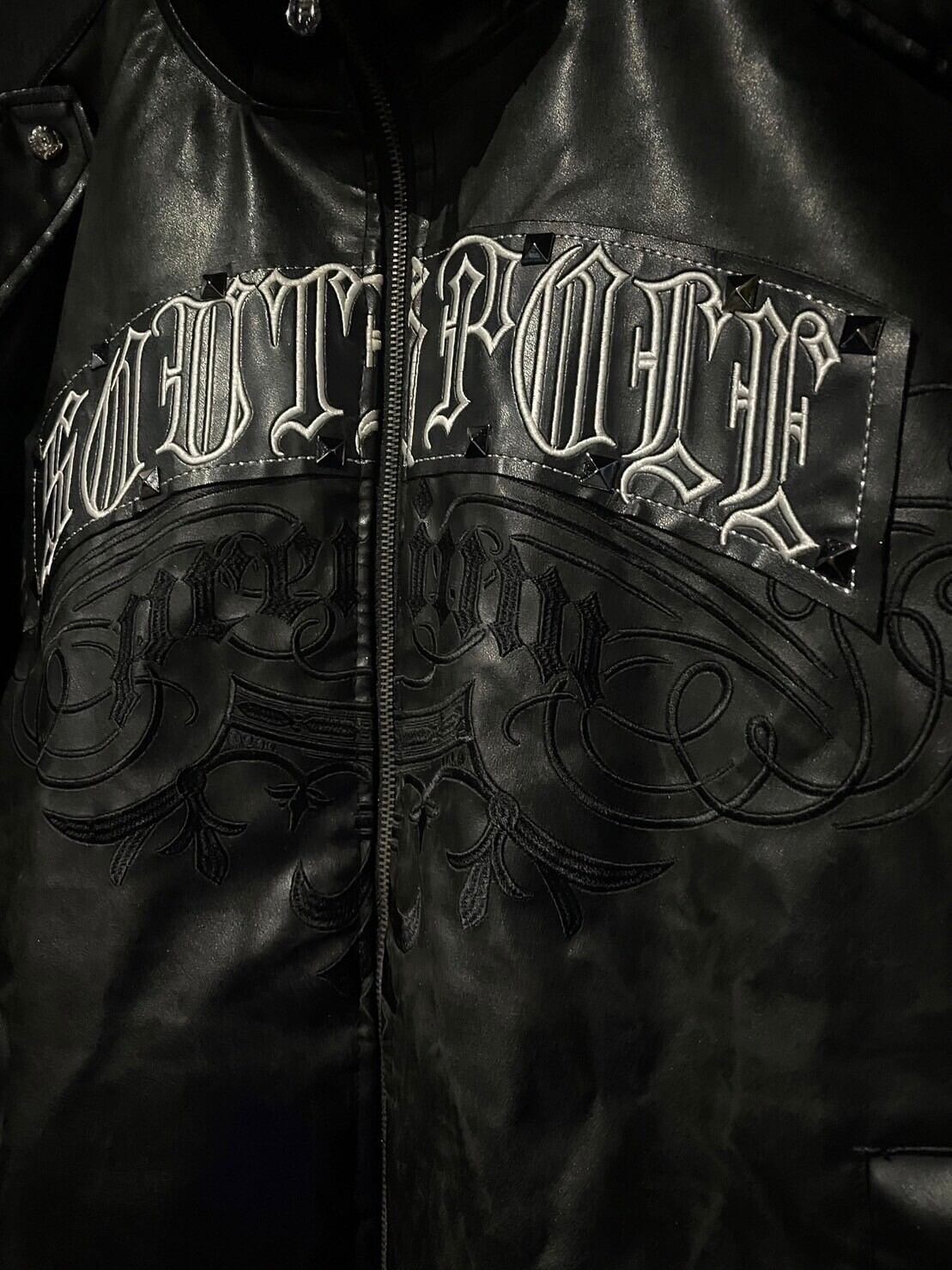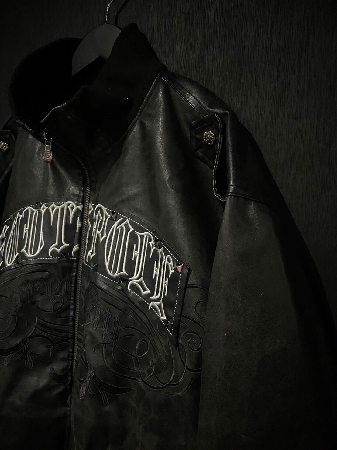 鈍い光沢を放つブラックのラバー素材のボディにこのブランドらしいストリート感溢れる刺繍を刻み込んだジャケット。