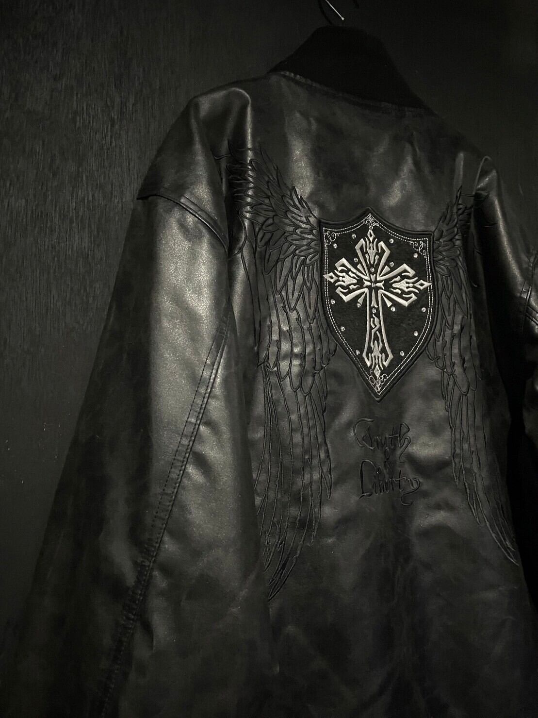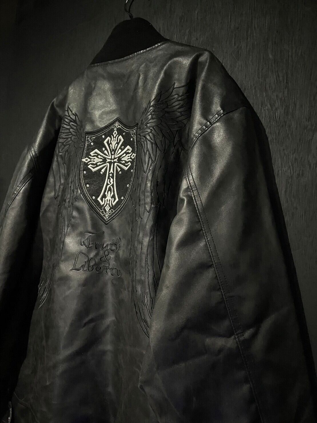 フロントにはブランドのロゴを組み込んだデザイン、バックにはクロスとフェザーを掛け合わせた刺繍に、キラリと光るラインストーンの施しと、前面、背面共にブリンブリンなデザインに仕上げられた、当店でも今超〜気分な1着となっております。