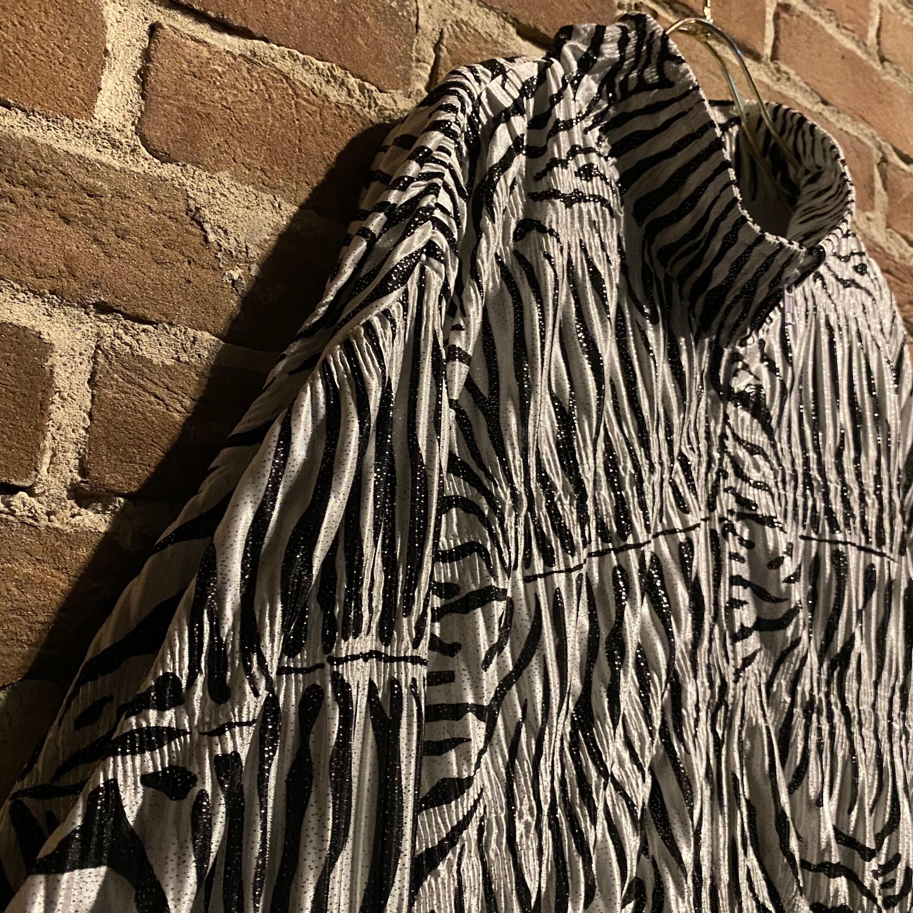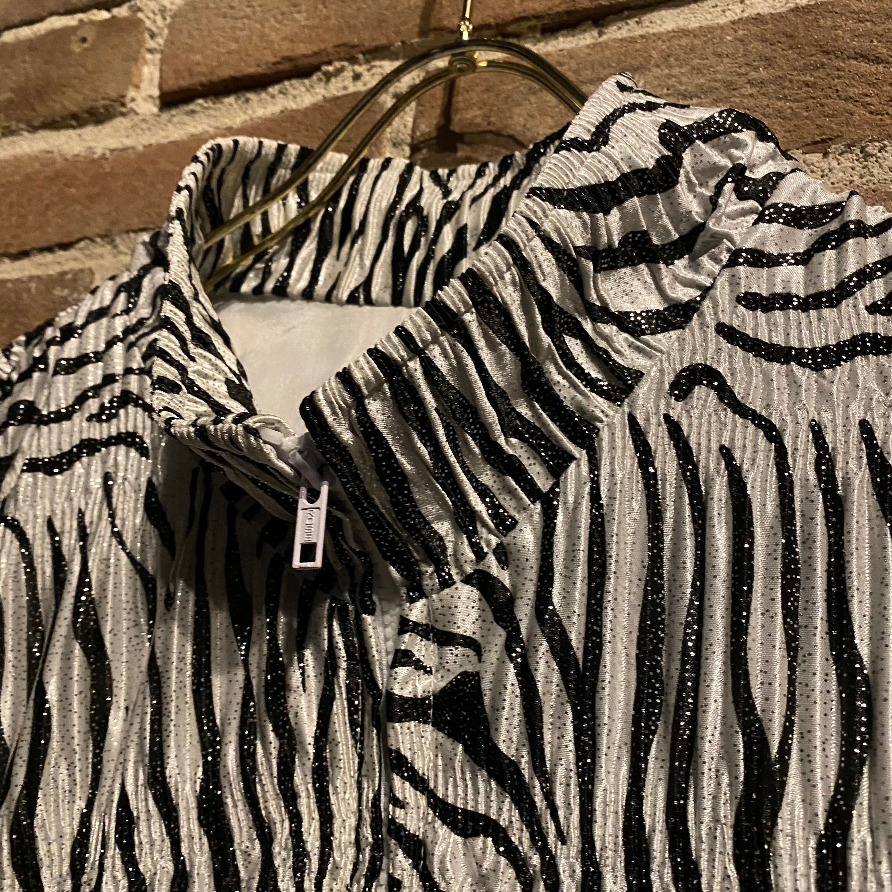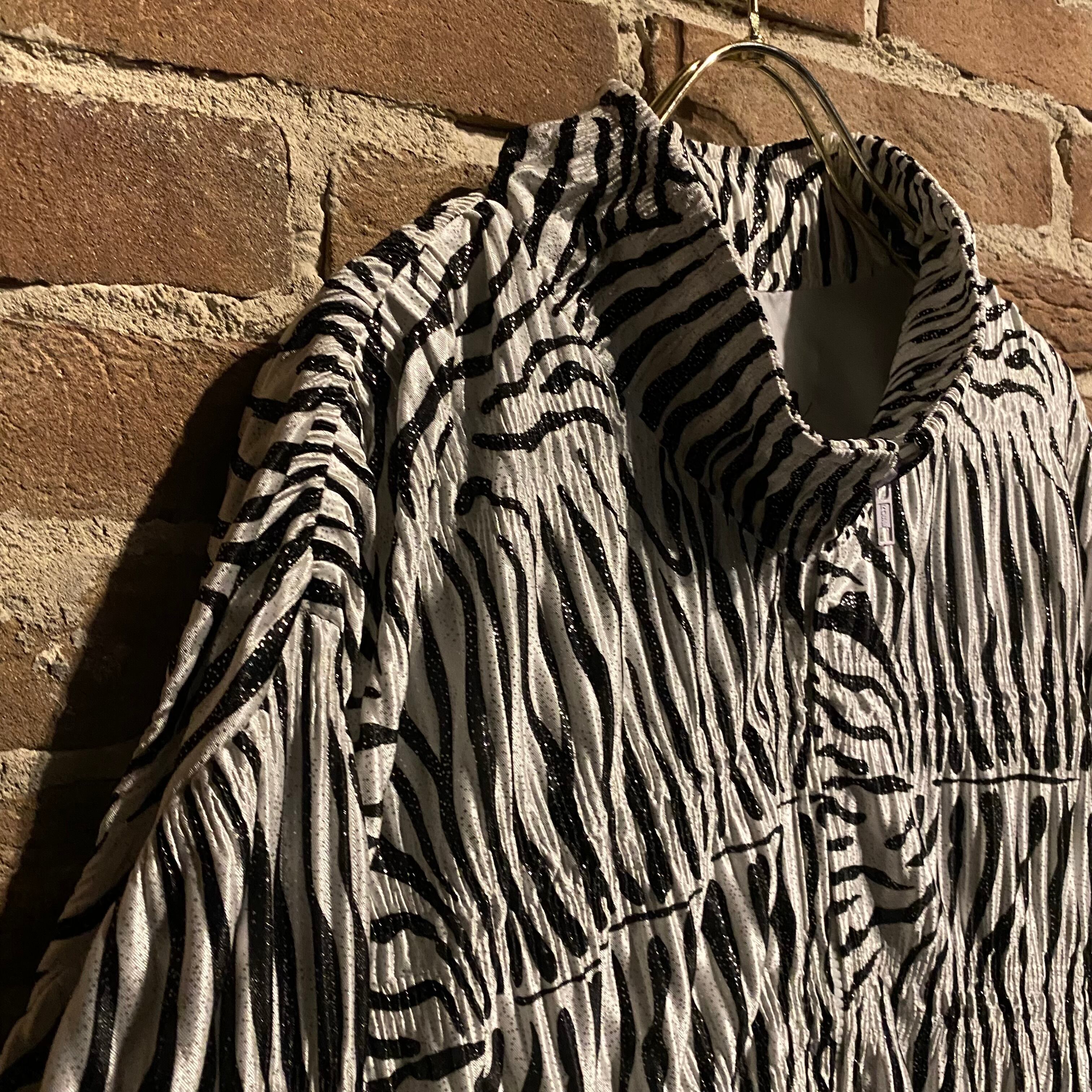 ギャザーでプリーツのような立体感のあるボディに、白×黒でモノトーンのゼブラ柄を載せたジップアップジャケット。