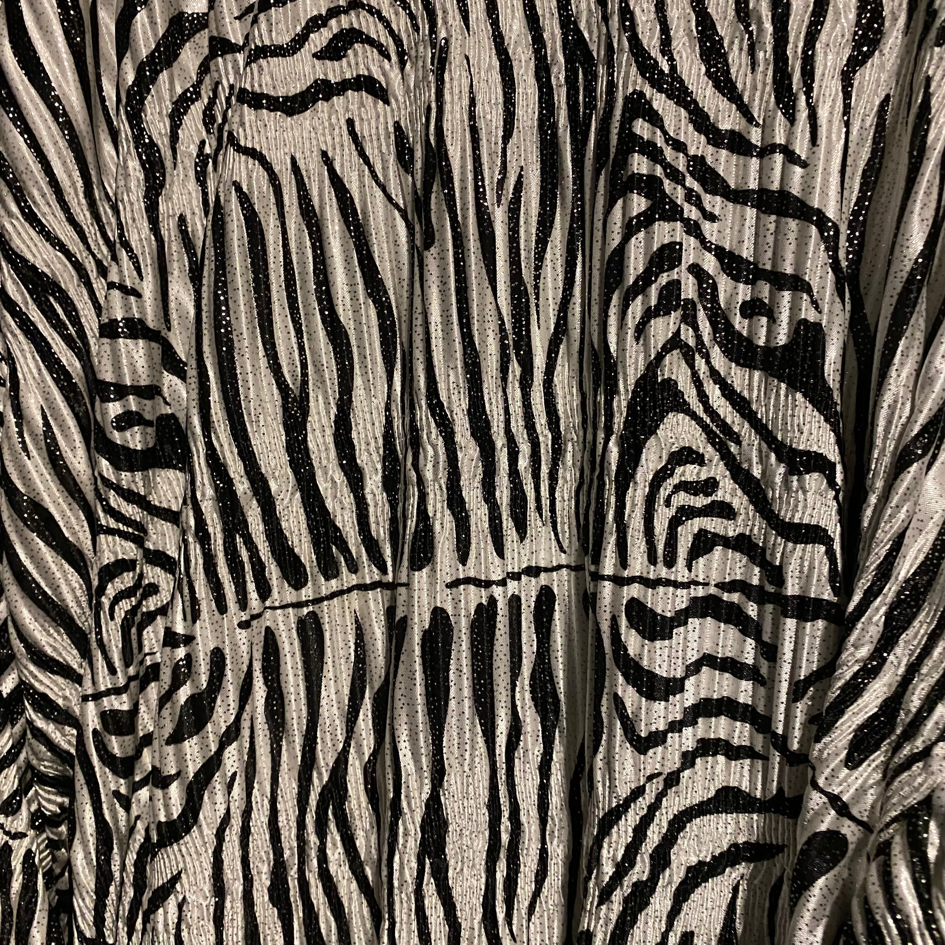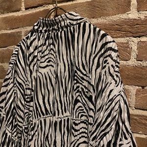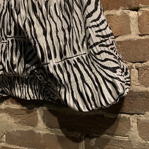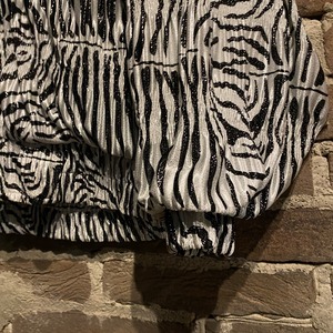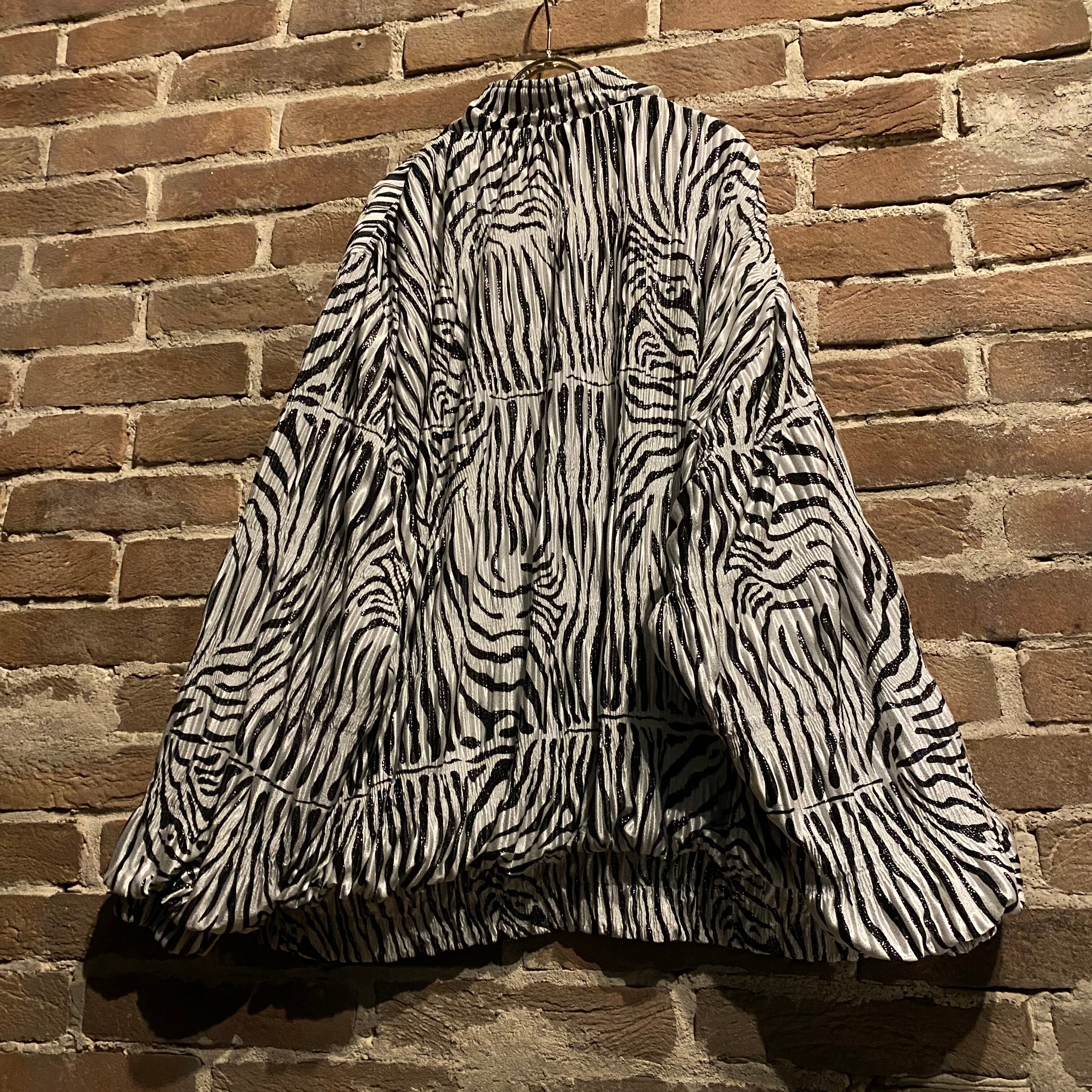 ギャザーでプリーツのような立体感のあるボディに、白×黒でモノトーンのゼブラ柄を載せたジップアップジャケット。