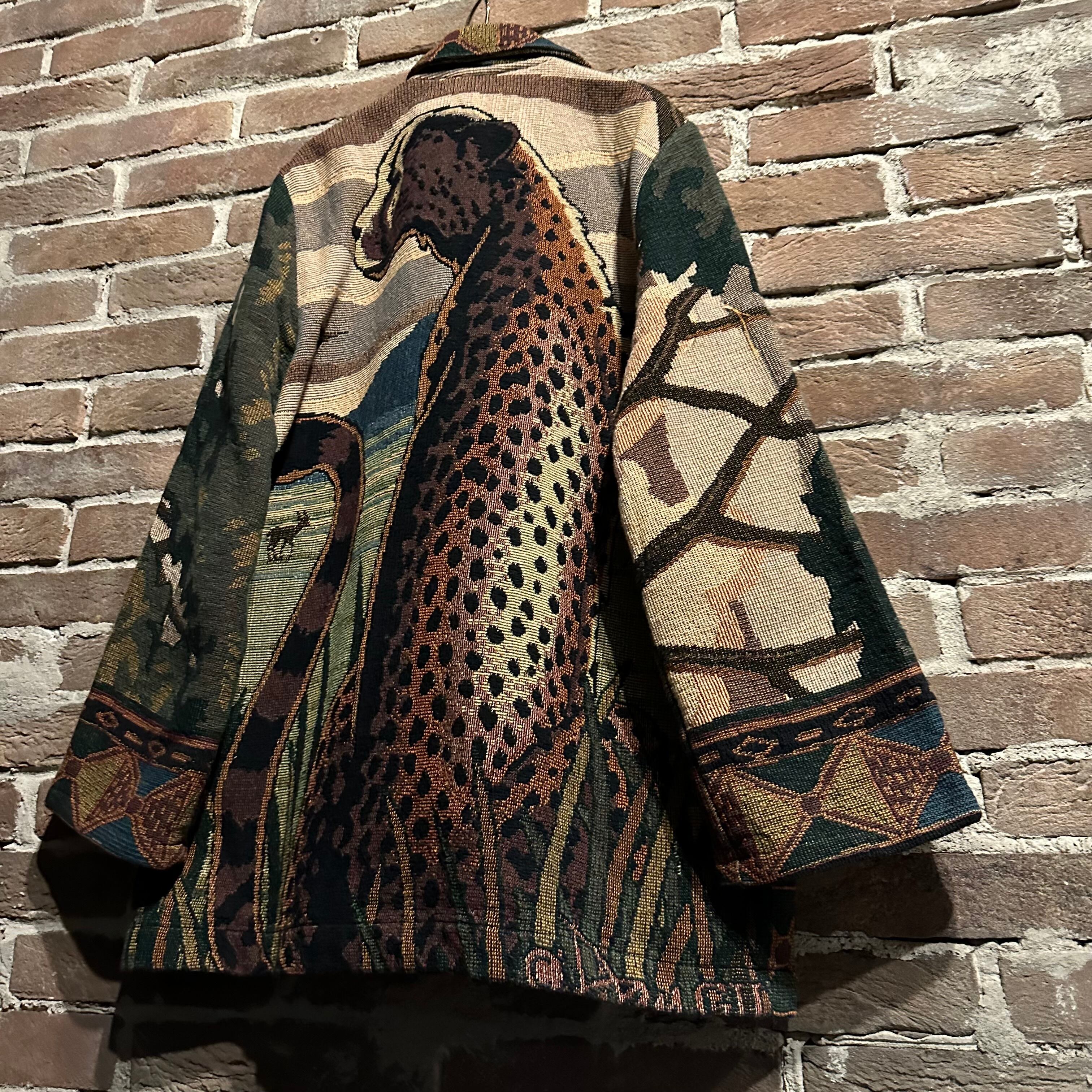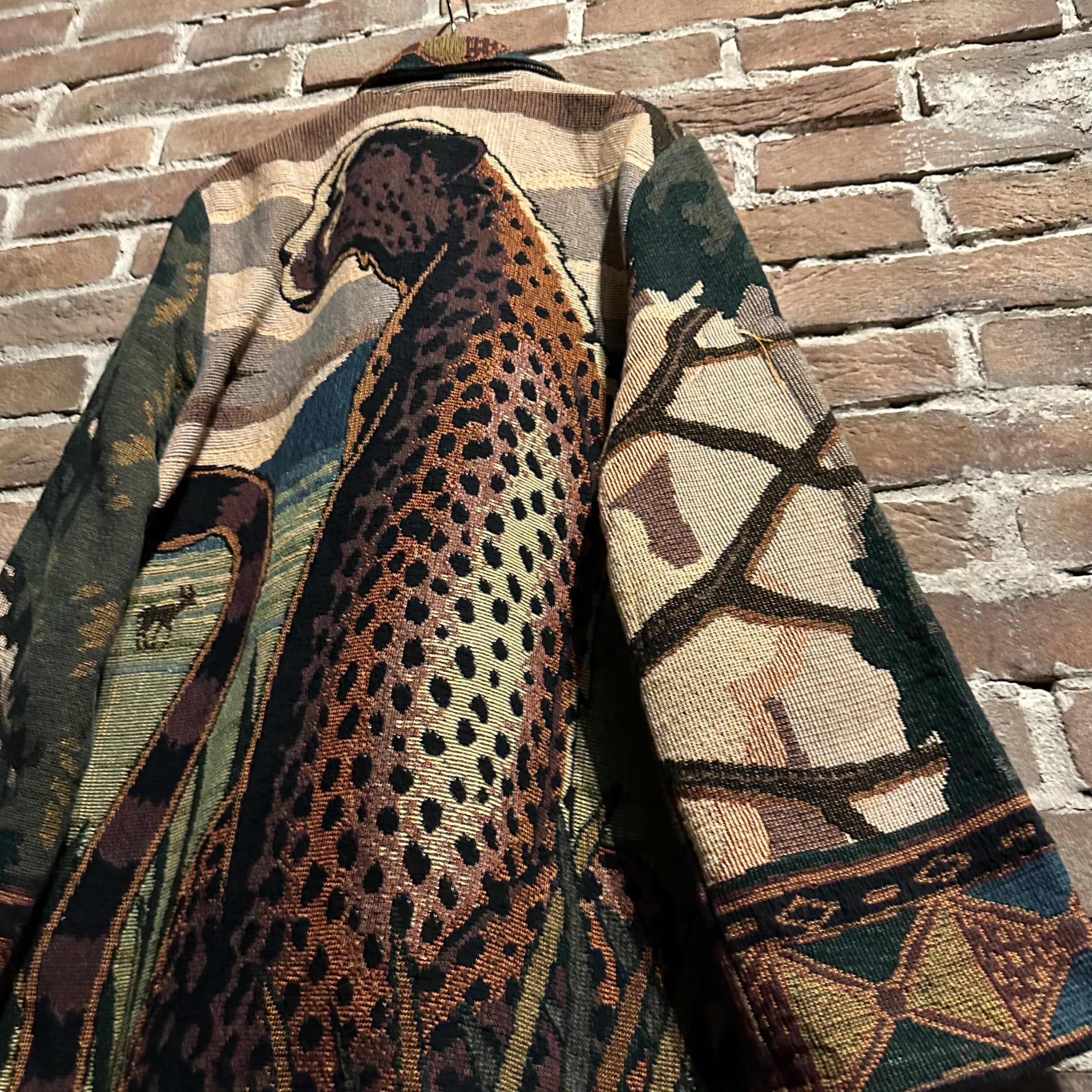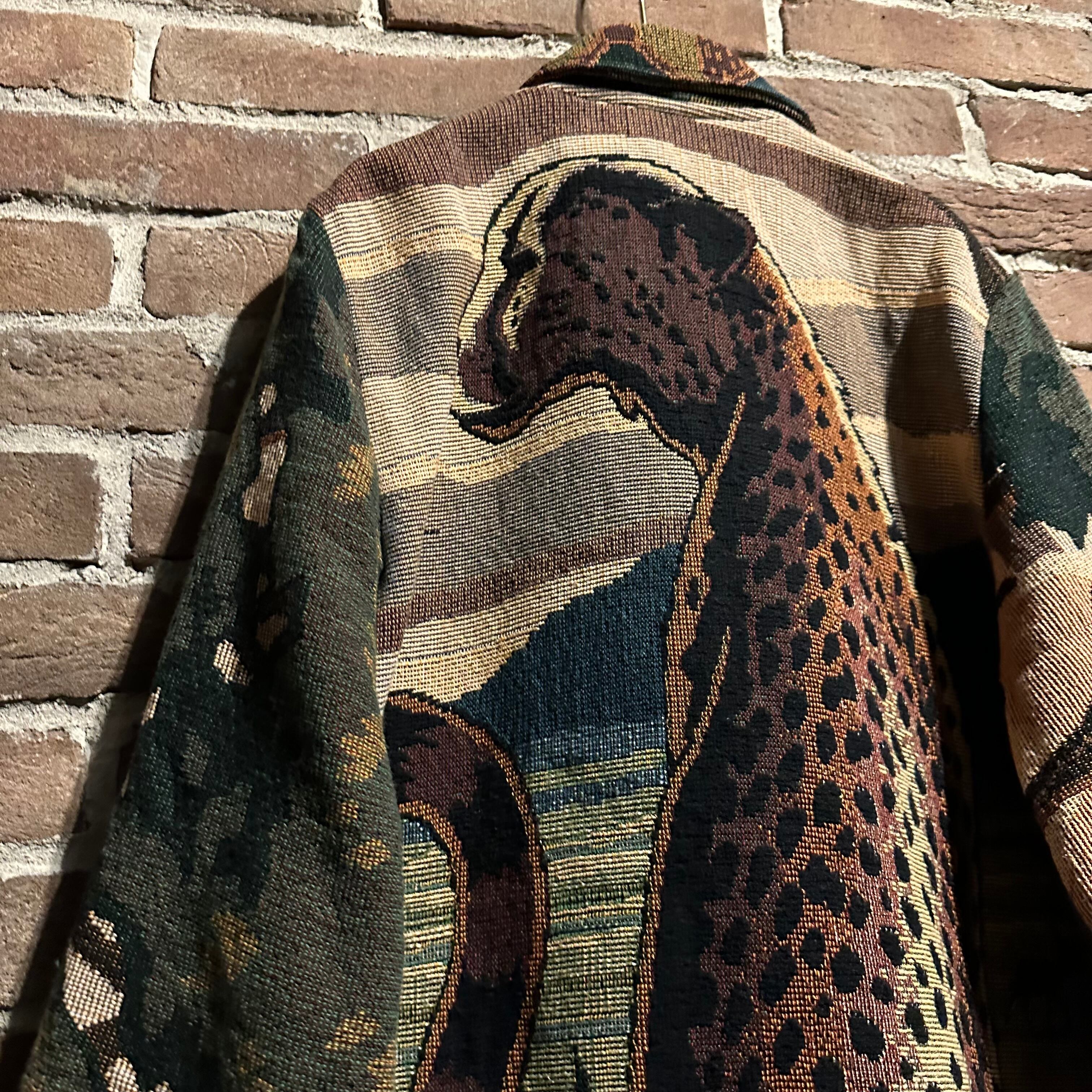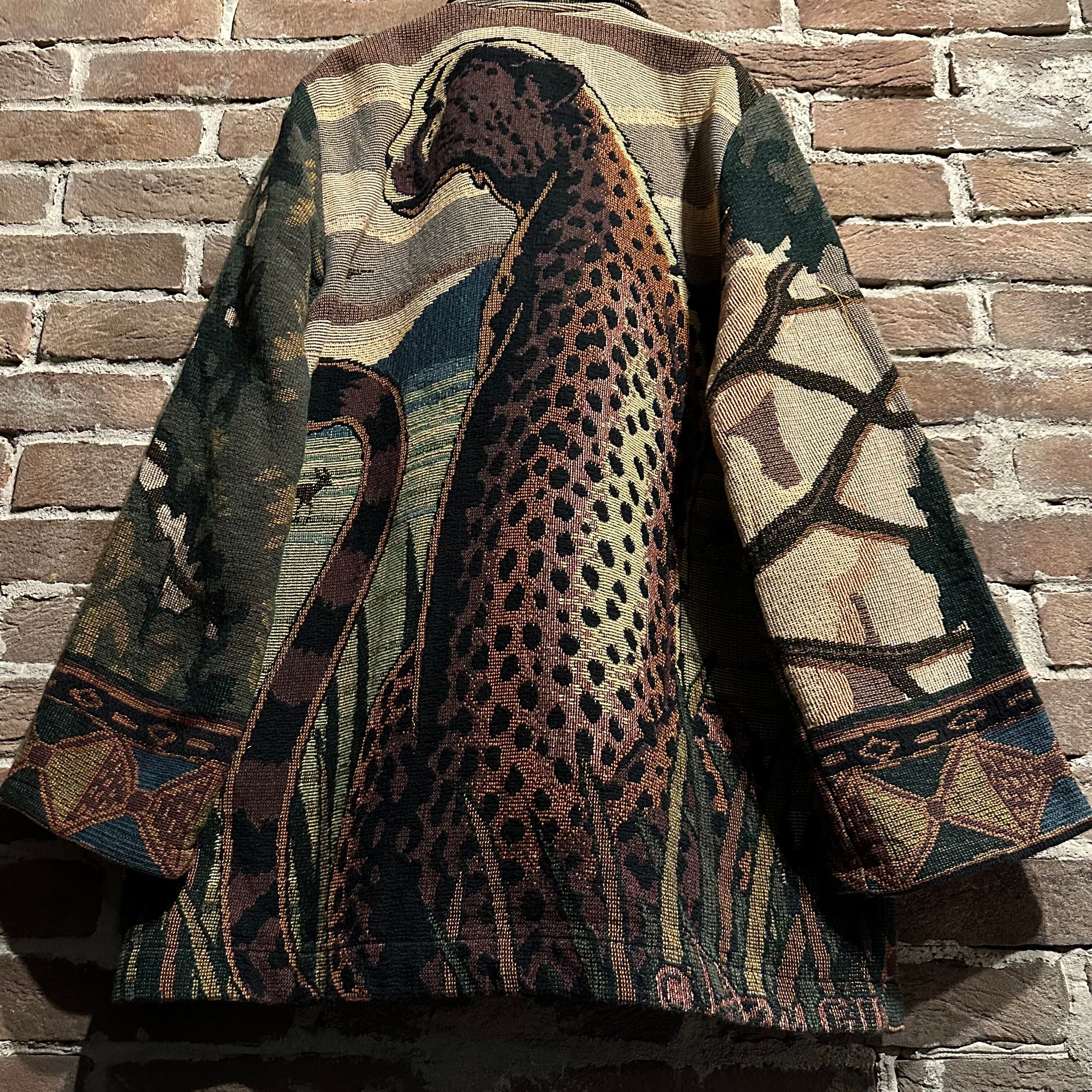 ゴブラン織りを用いたジャケットは古着の中でも定番で見掛ける機会も多いアイテムですが、その中でも稀有なアニマルモノの1着。上質なゴブラン織で、背面に悠々しいチーターをデザインした逸品。
