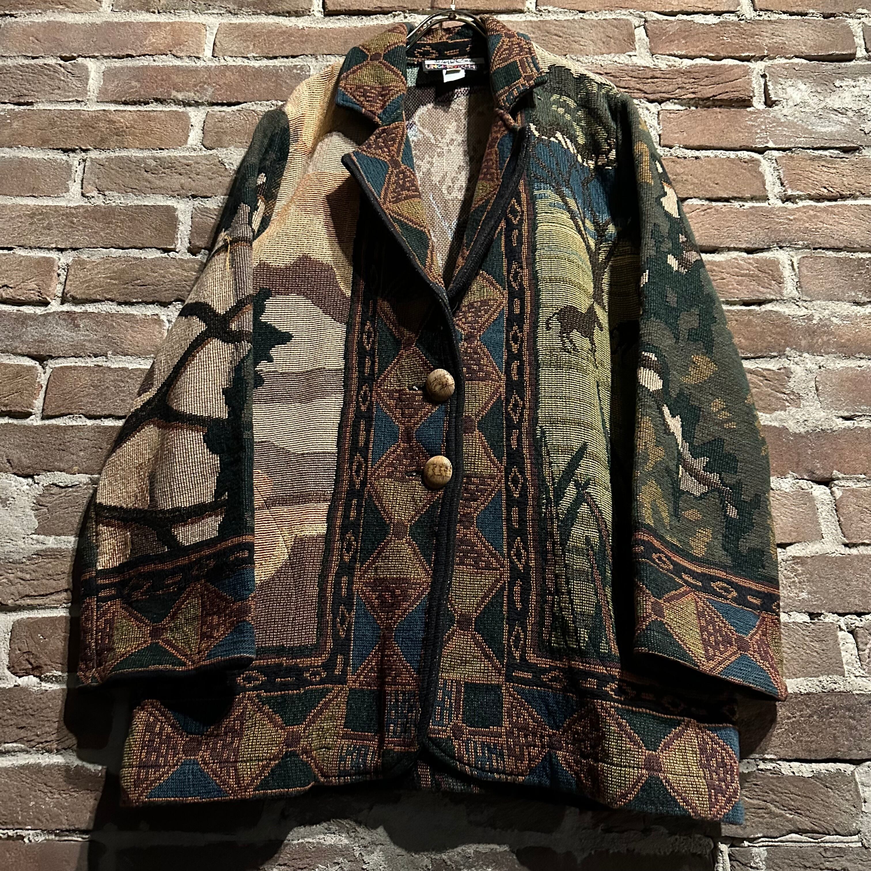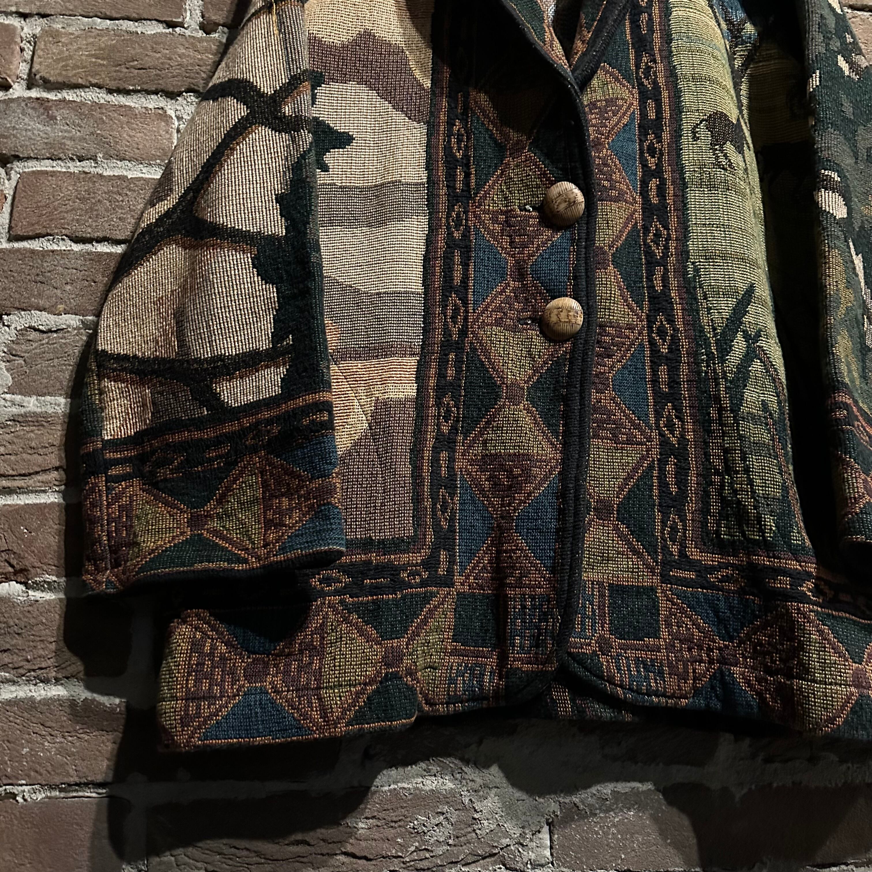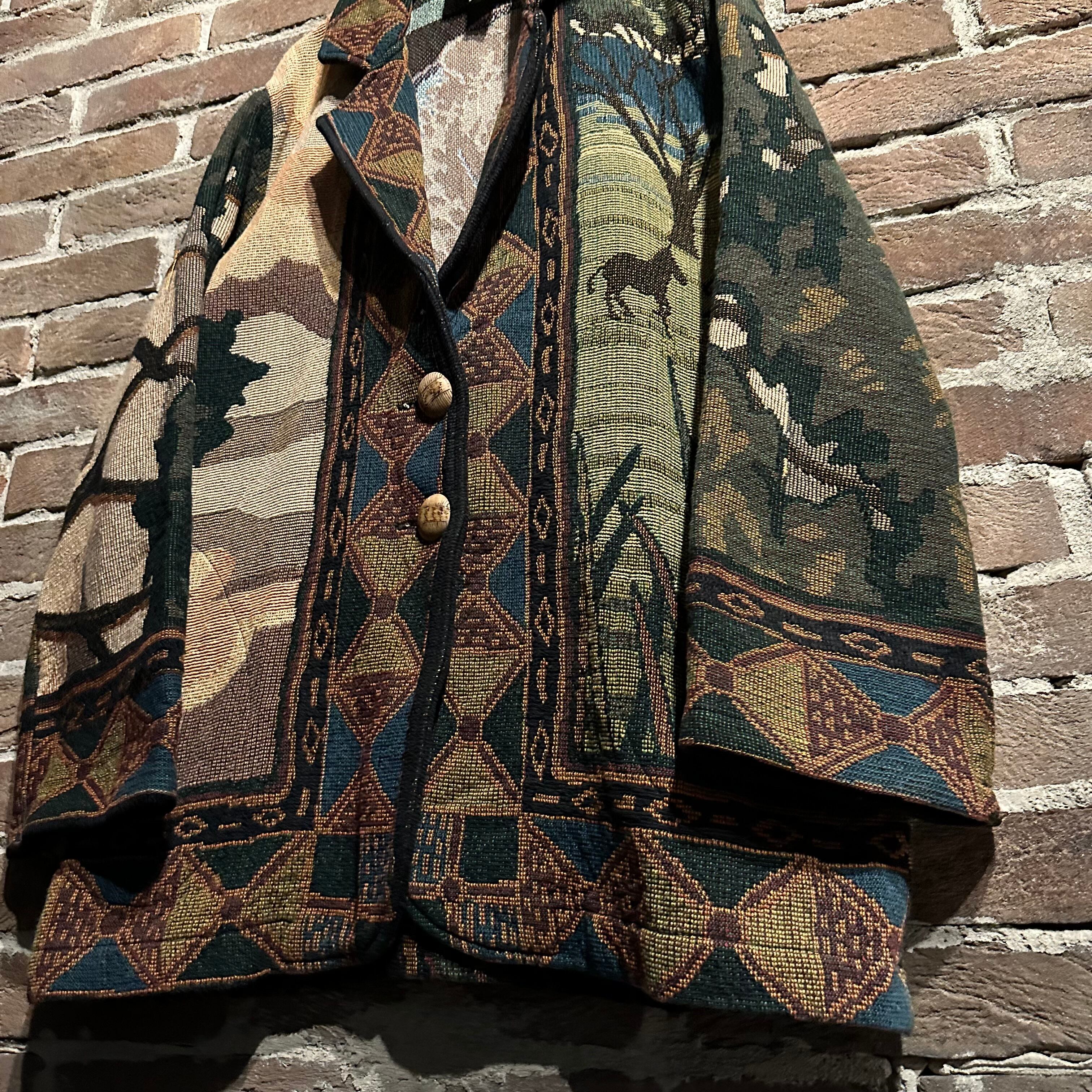 ゴブラン織りを用いたジャケットは古着の中でも定番で見掛ける機会も多いアイテムですが、その中でも稀有なアニマルモノの1着。上質なゴブラン織で、背面に悠々しいチーターをデザインした逸品。