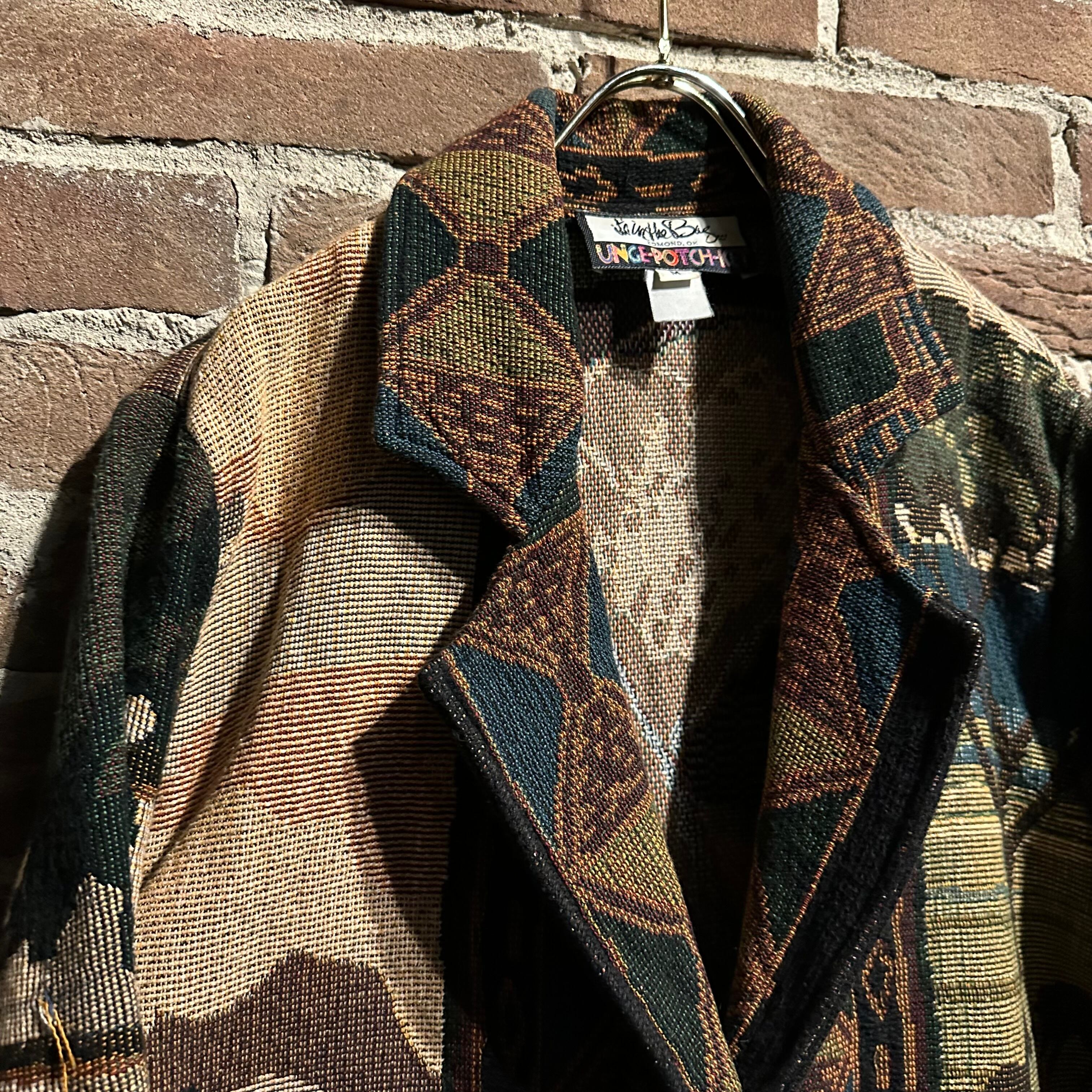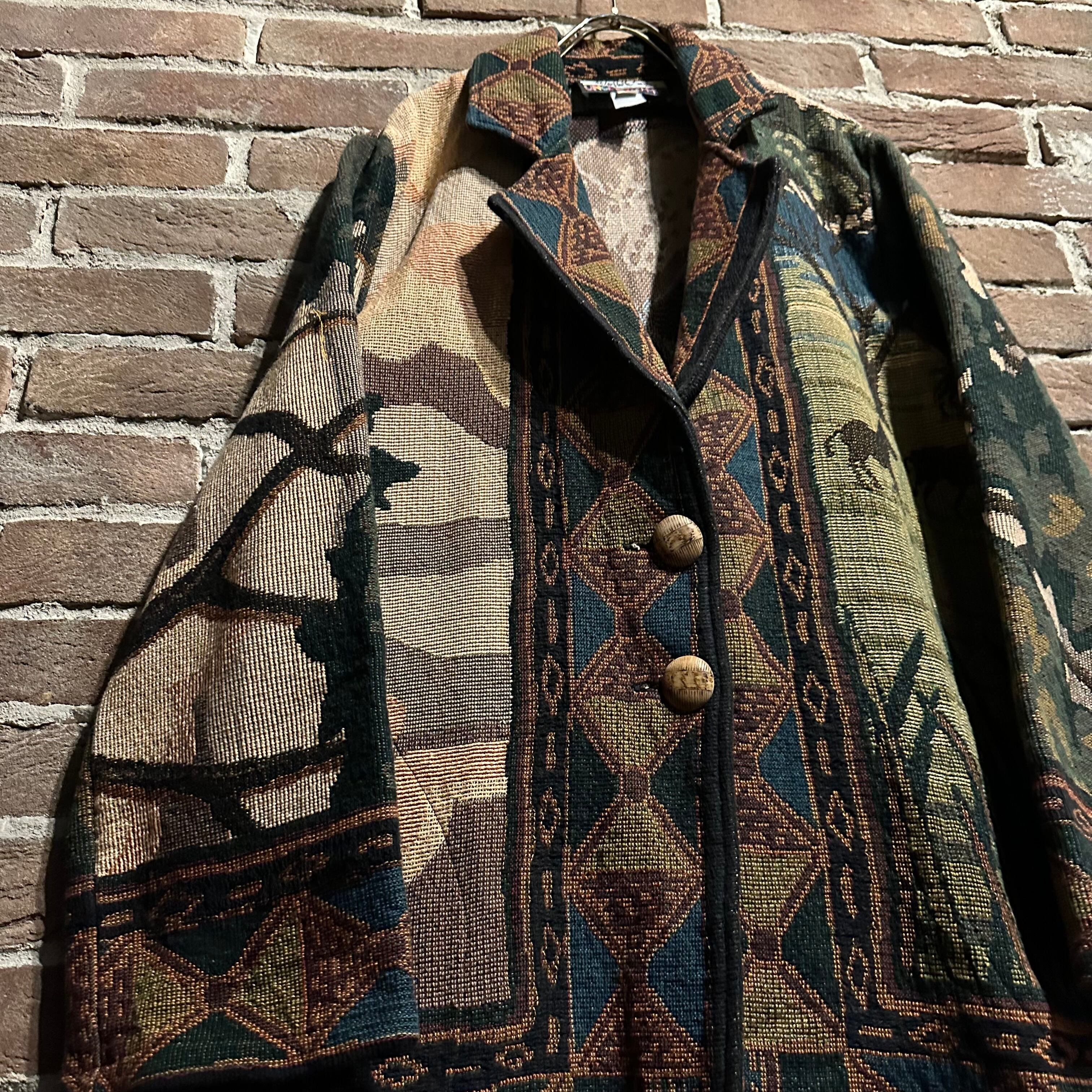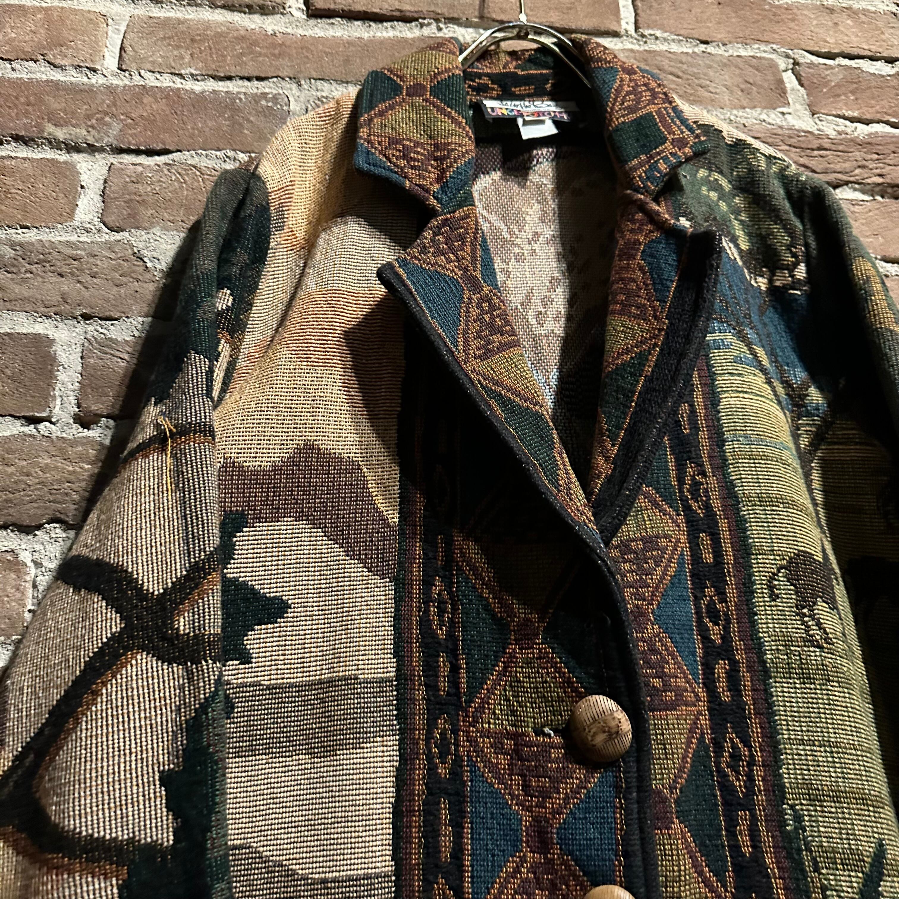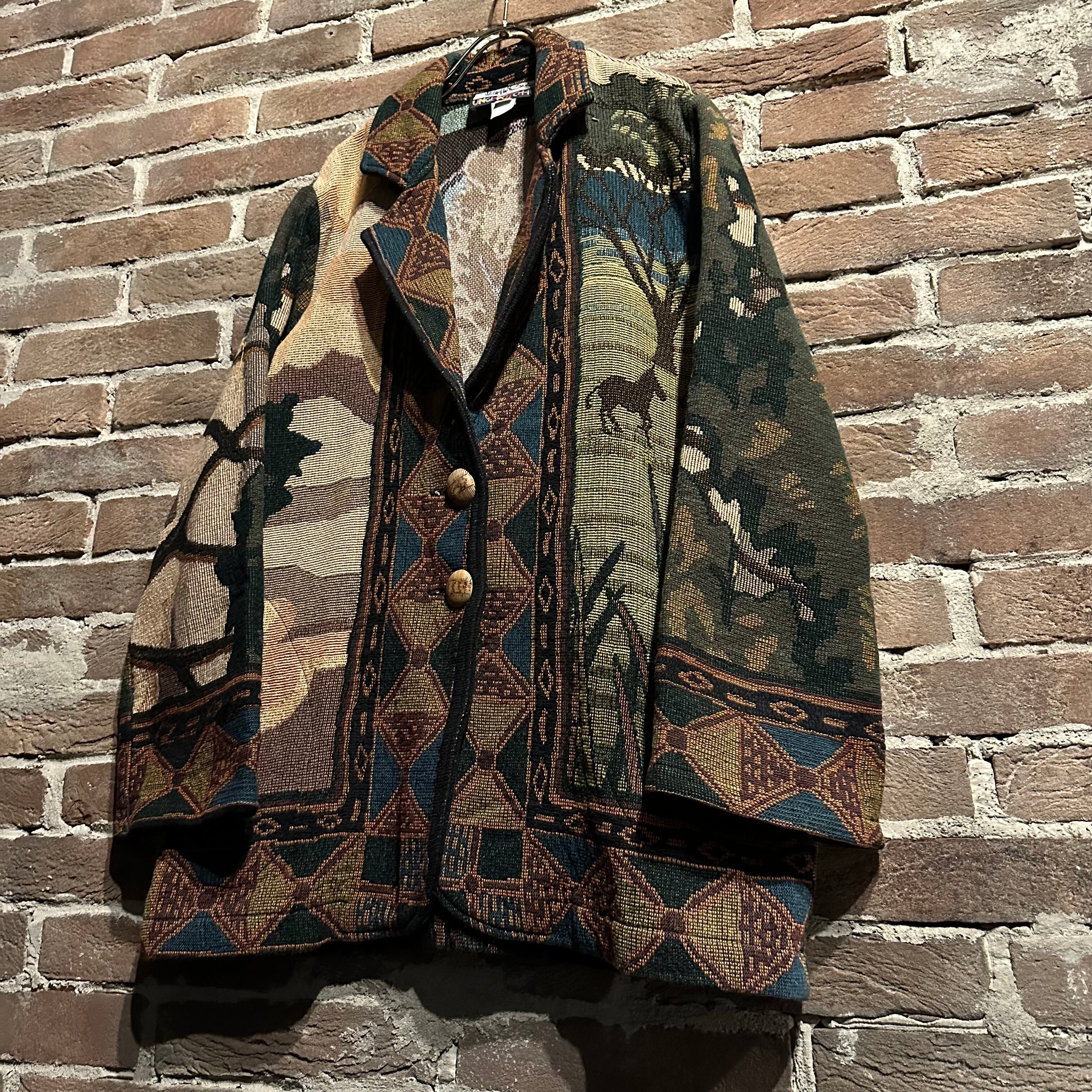 ゴブラン織りを用いたジャケットは古着の中でも定番で見掛ける機会も多いアイテムですが、その中でも稀有なアニマルモノの1着。上質なゴブラン織で、背面に悠々しいチーターをデザインした逸品。