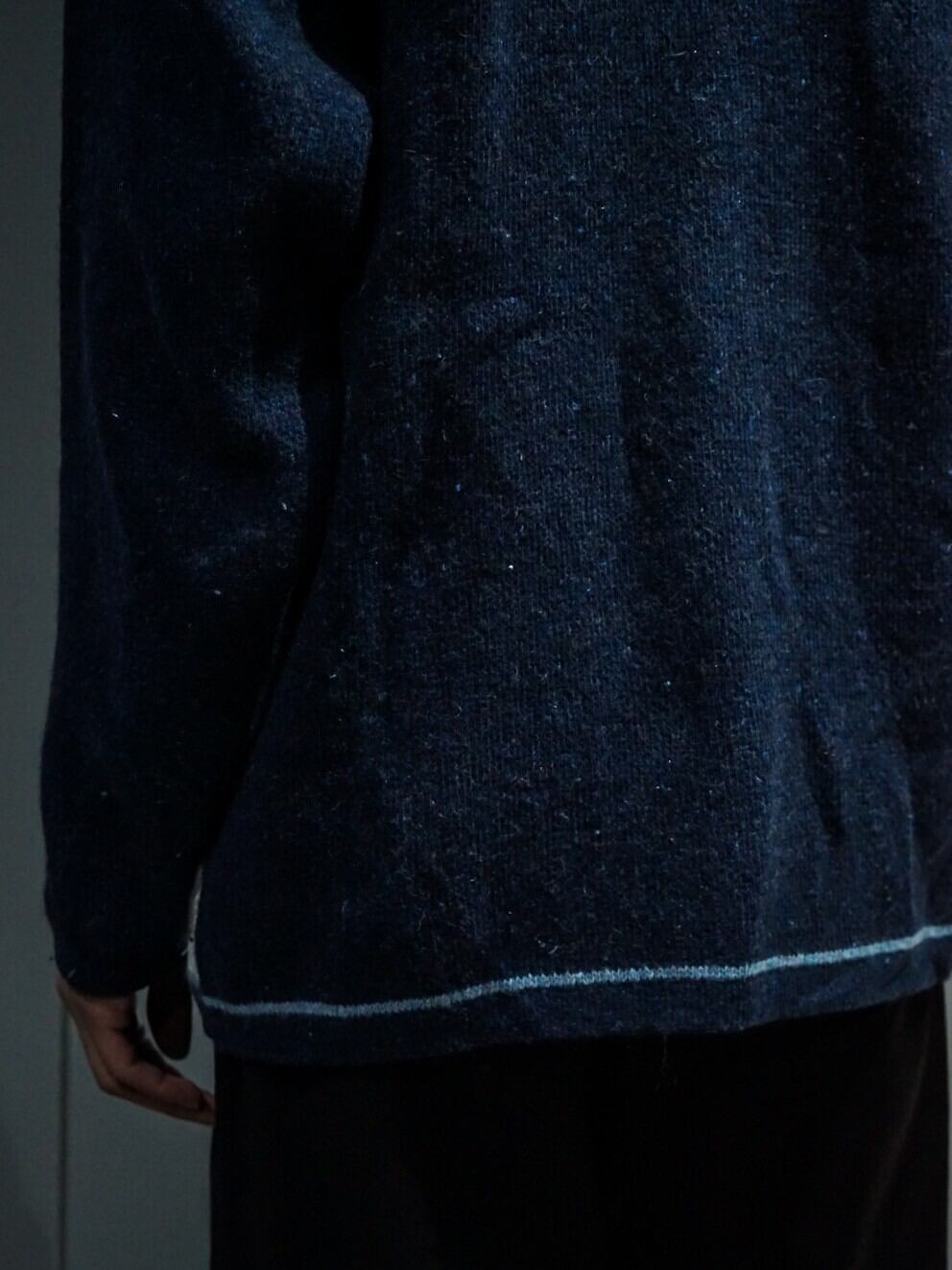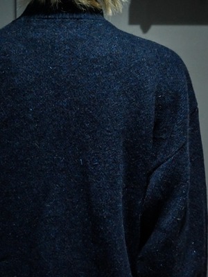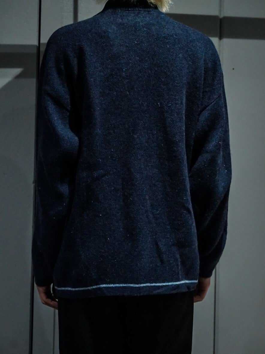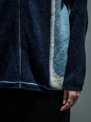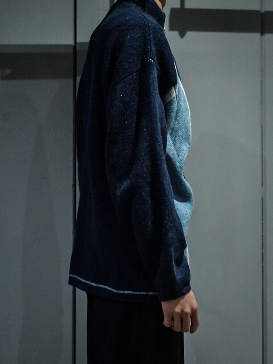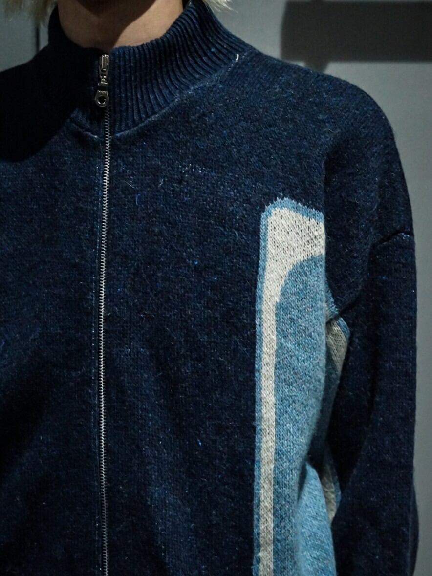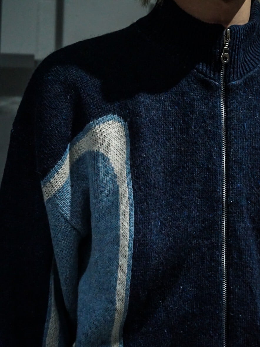 繊細なニッティングによって紺、白、水色のカラーリングで切り替えデザインが施されたニットジャケット。