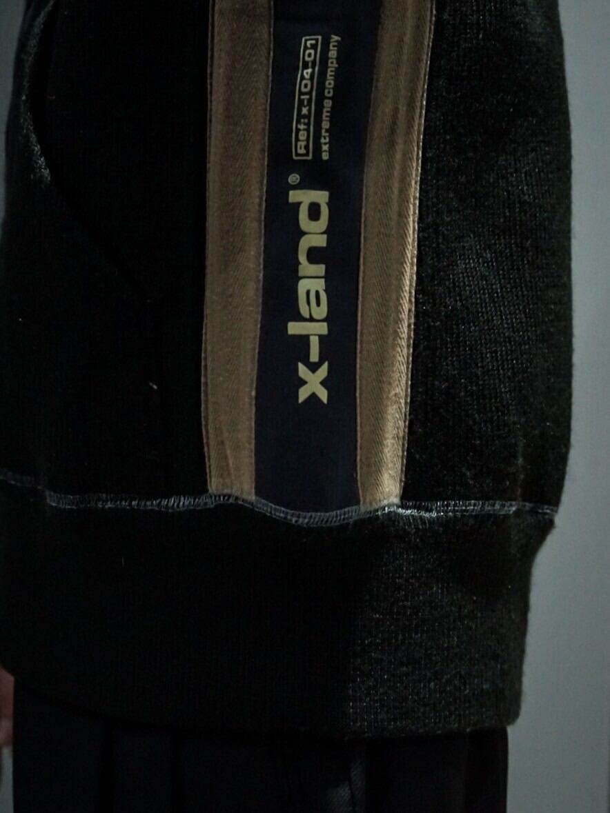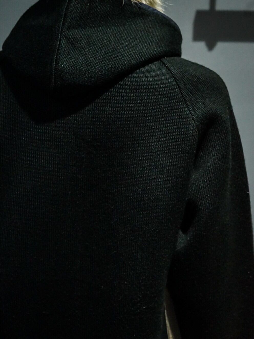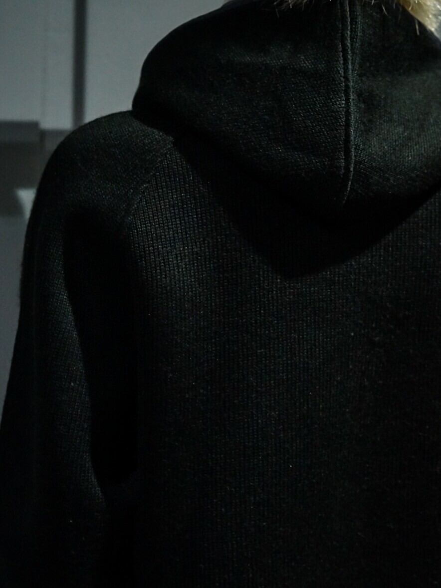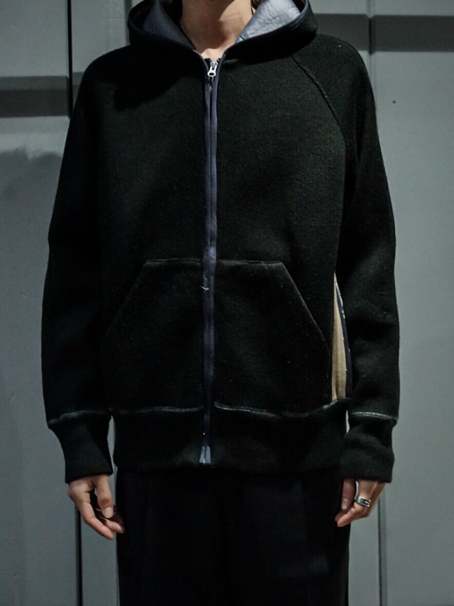 パーカーアイテムでは珍しいブラックのニット素材をベースとし、内側には中綿を仕込んだジップアップパーカーの逸品。