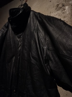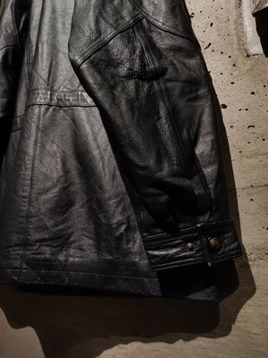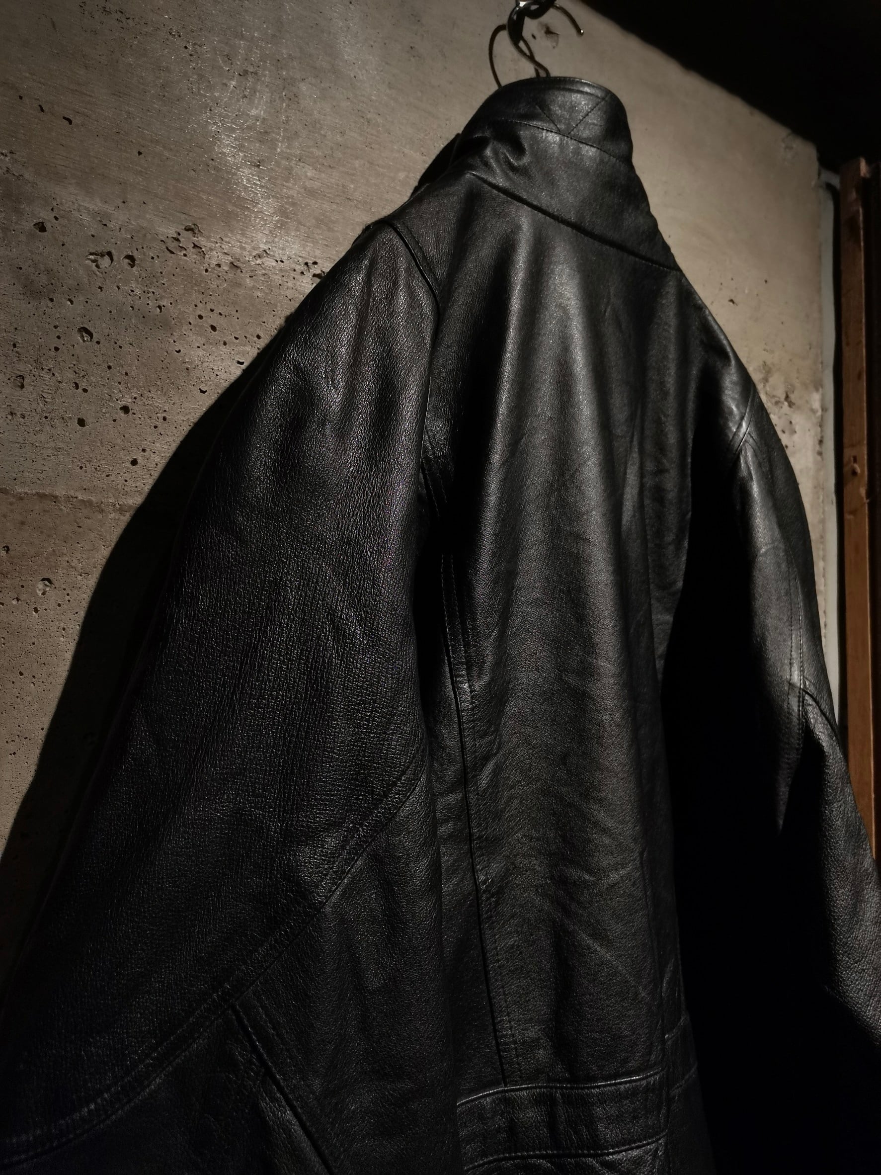 丈はエレガントな雰囲気を放ってくれるミドル丈、ドルマンスリーブ仕様で肩から裾にかけての落ち感も綺麗で美しく、粗々しいレザーという素材と相まって程よいデザインバランスに◎