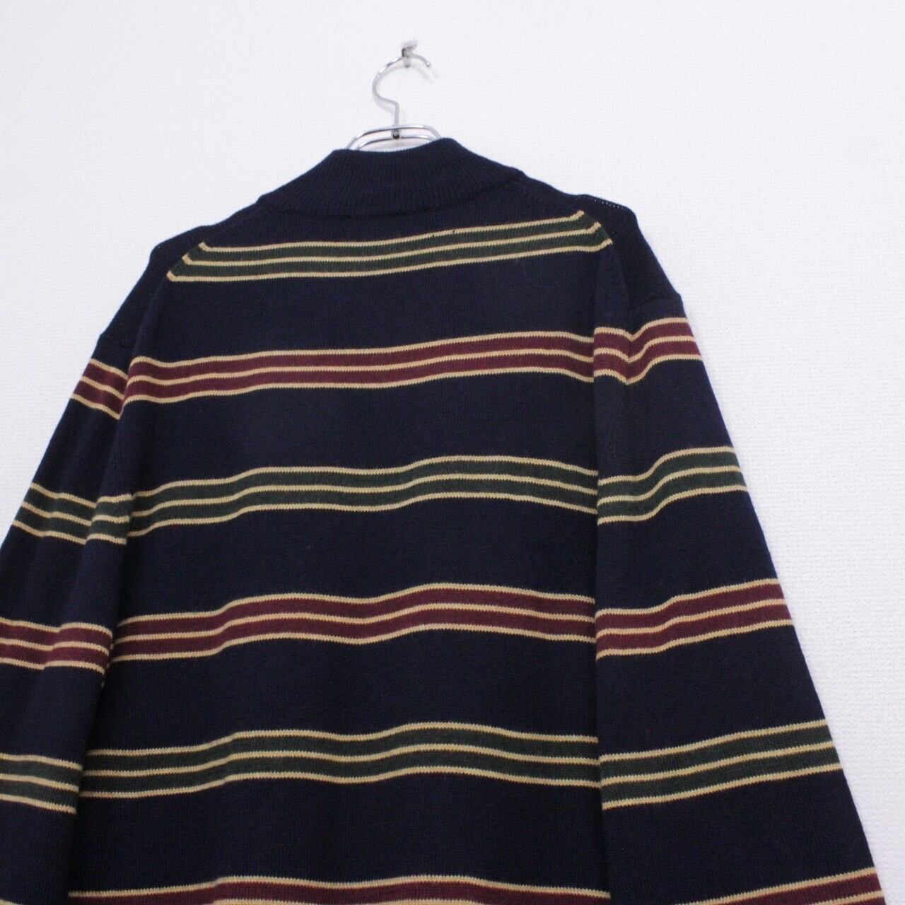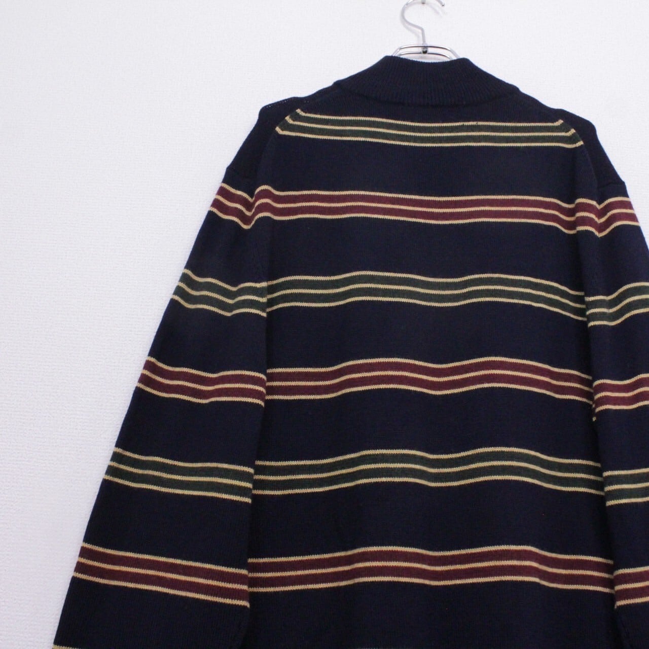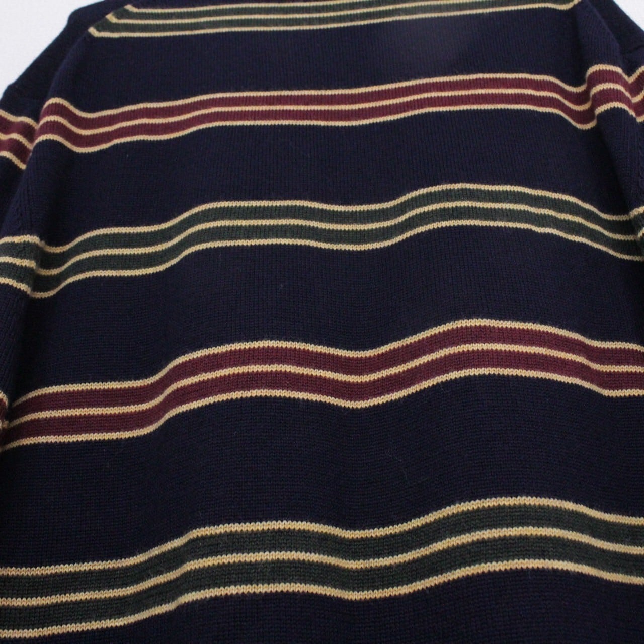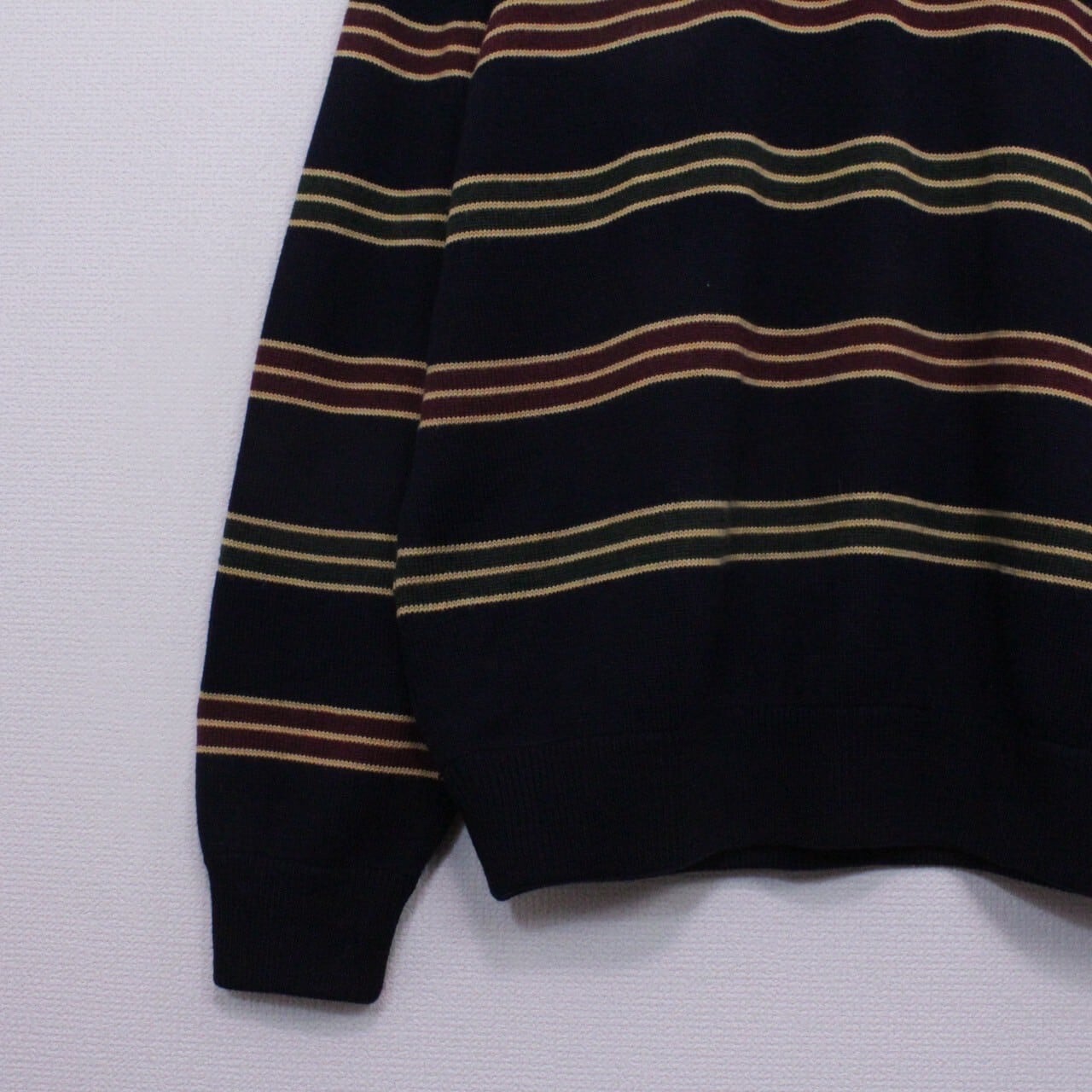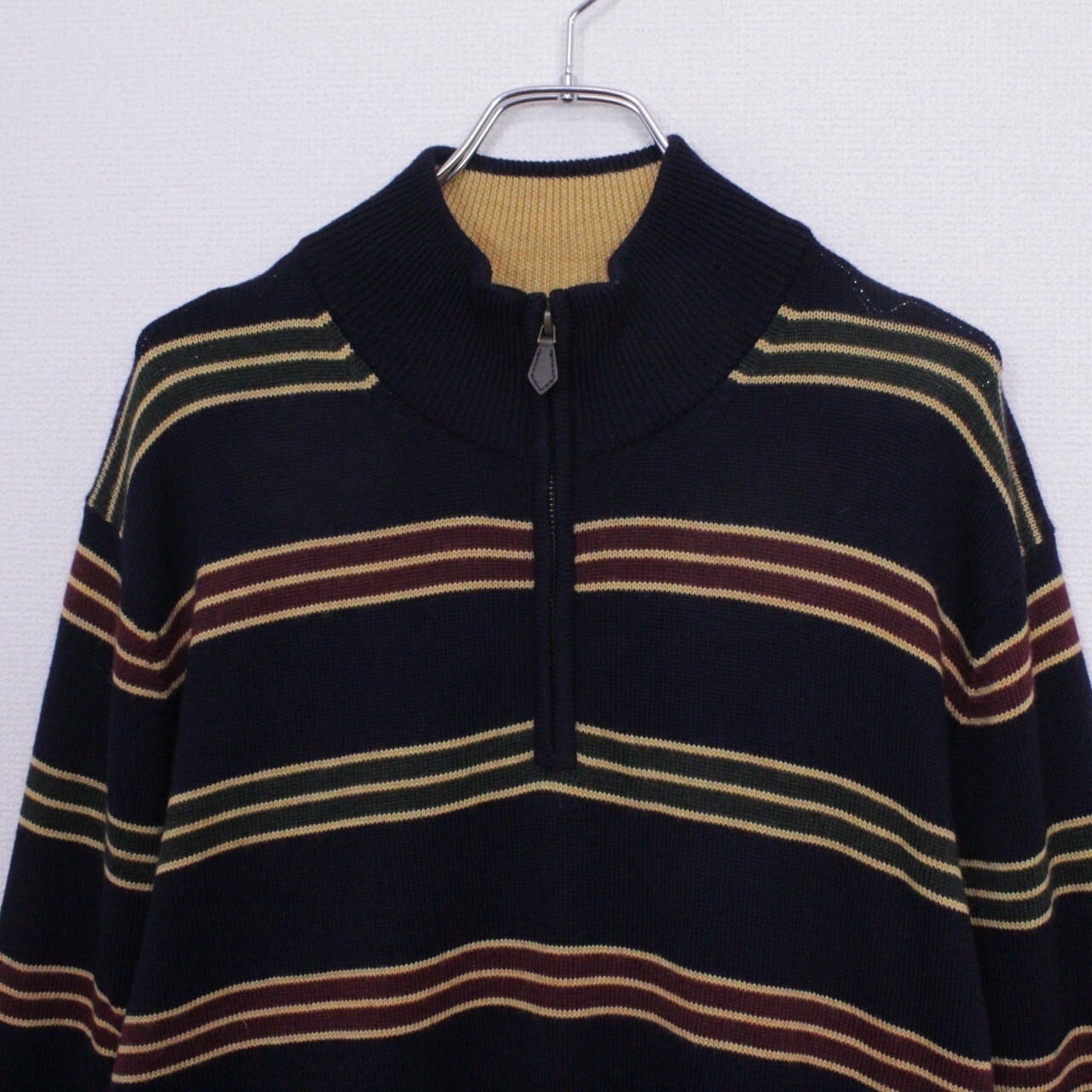 ネイビーをベースに、ダークグリーンやワインレッド、マスタードカラーの配色でボーダー柄を走らせたレトロかつトラッドな同ブランドならではの上品なデザインに仕上げられたハーフジップニット。