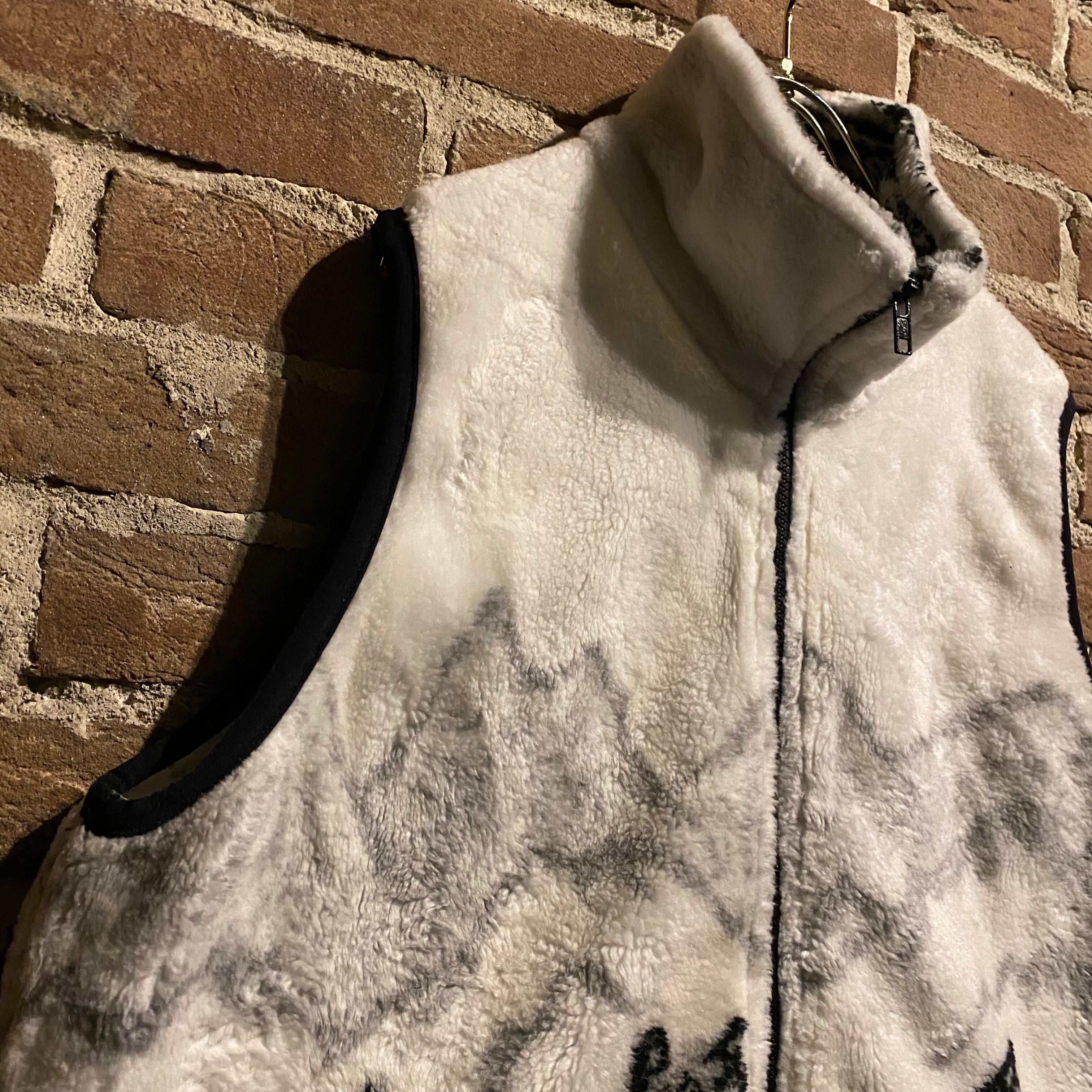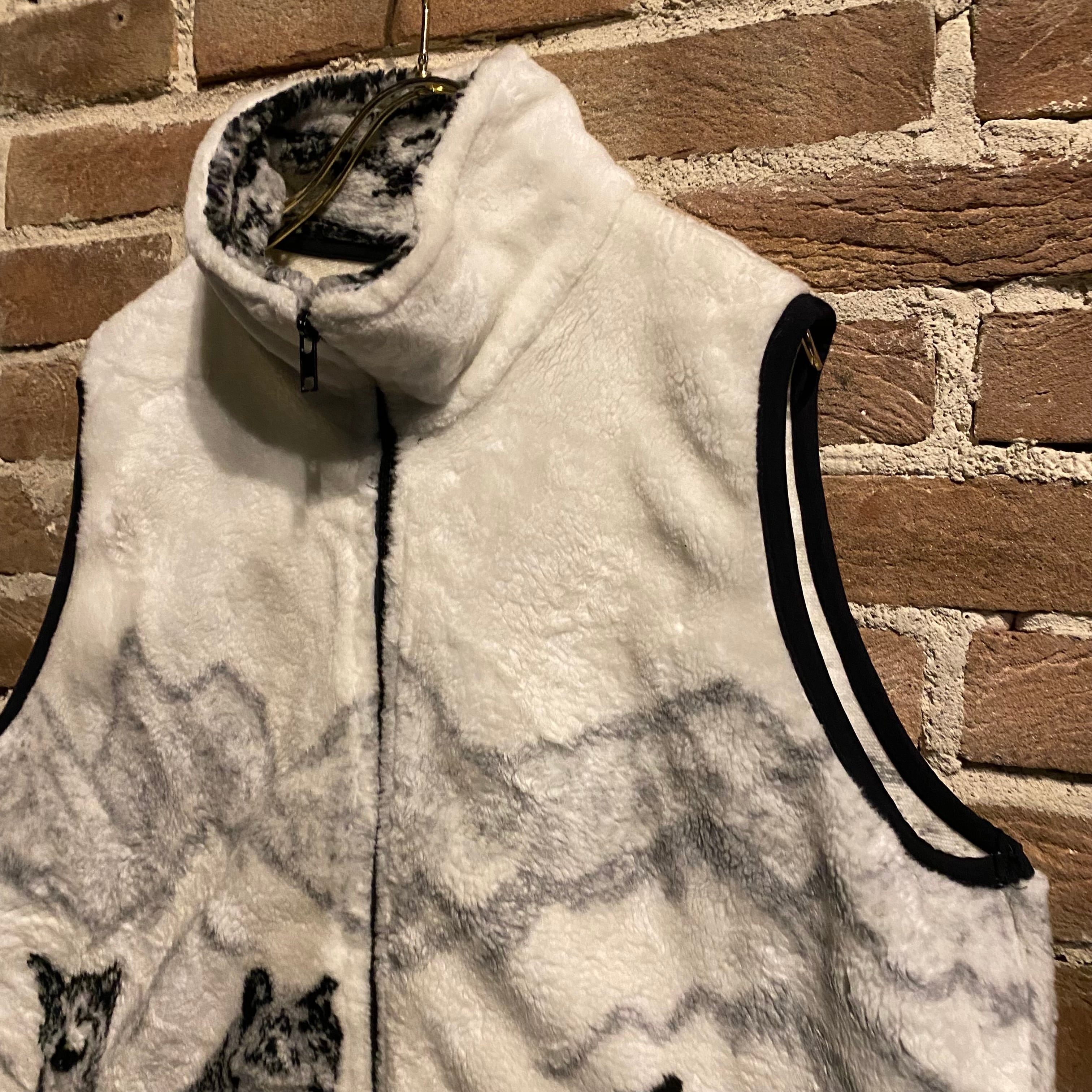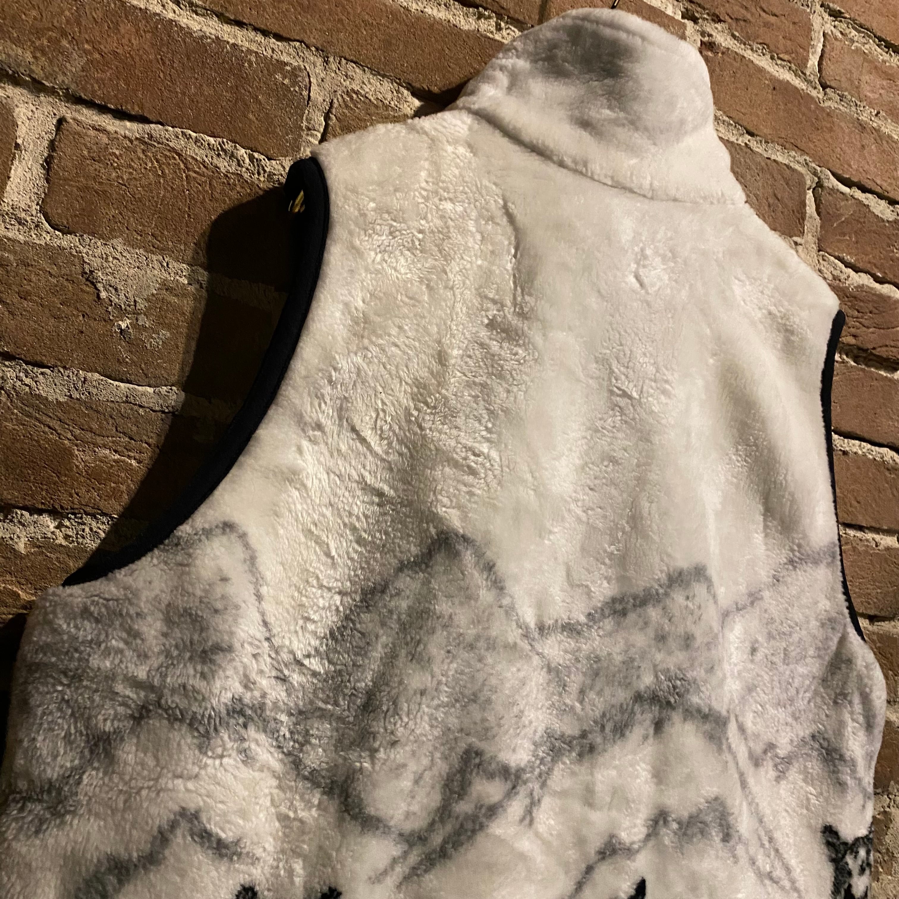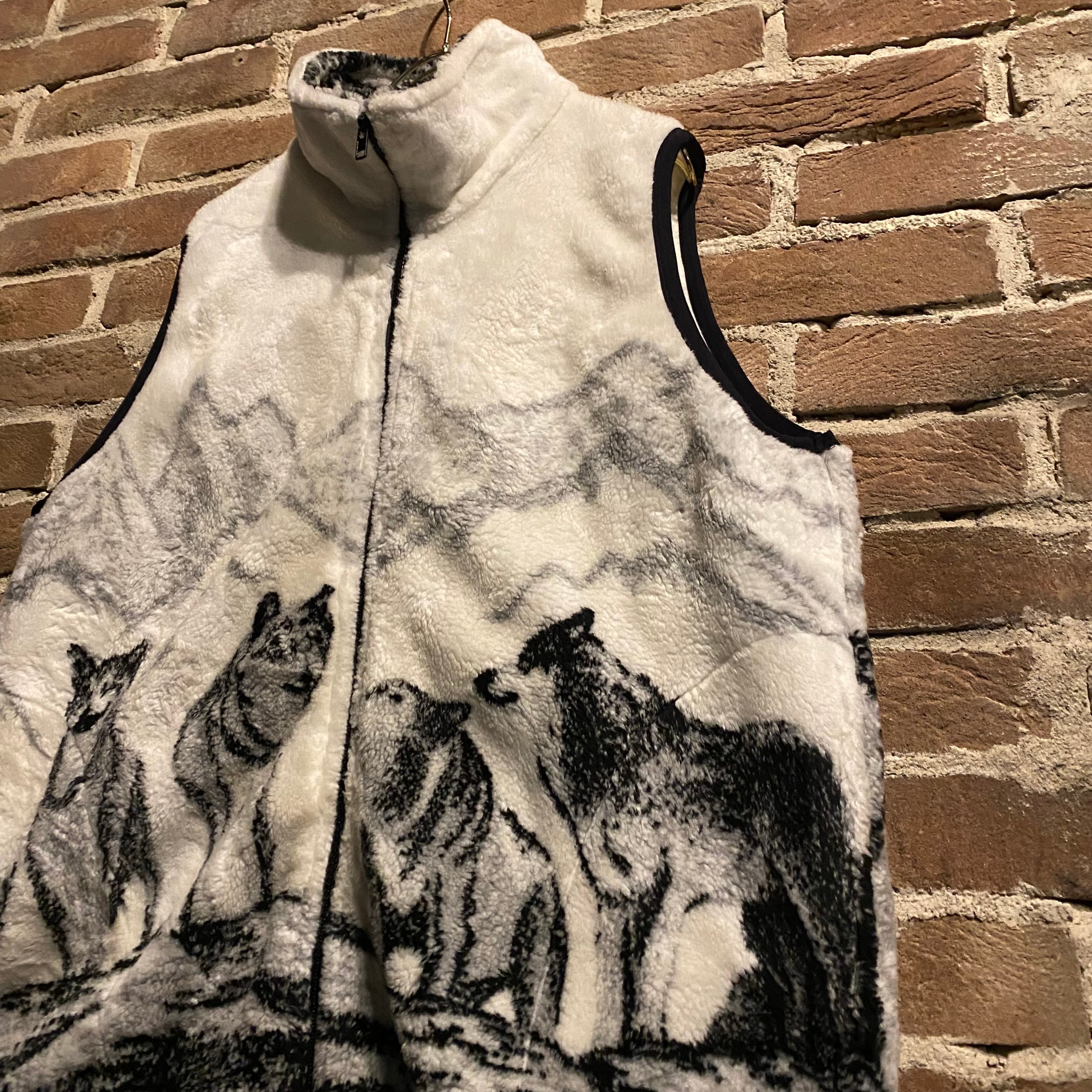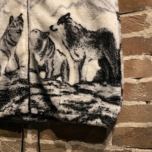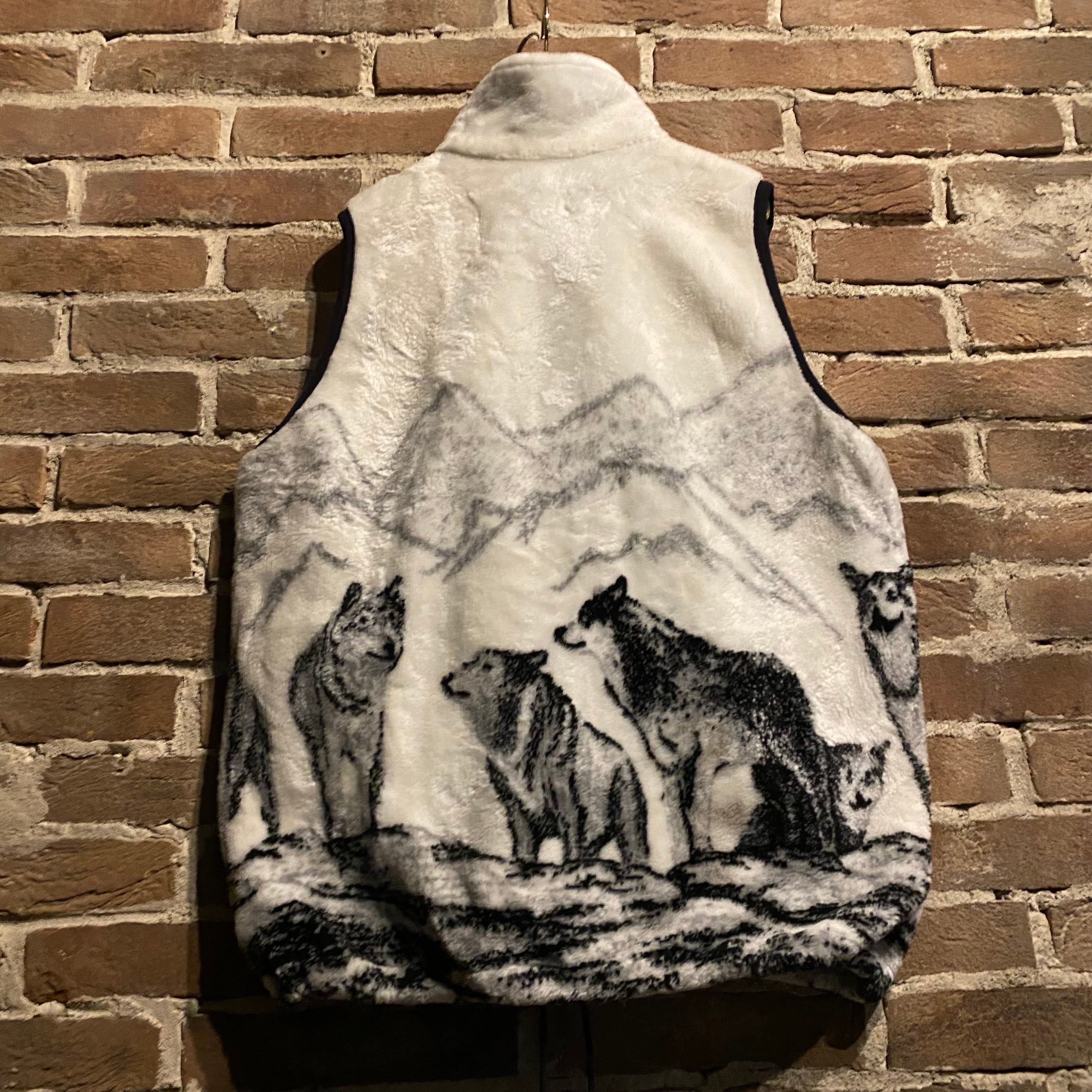 凍える雪山を背景に、オオカミの群れを独特のタッチでボディ全面に描き上げたフリースベスト。