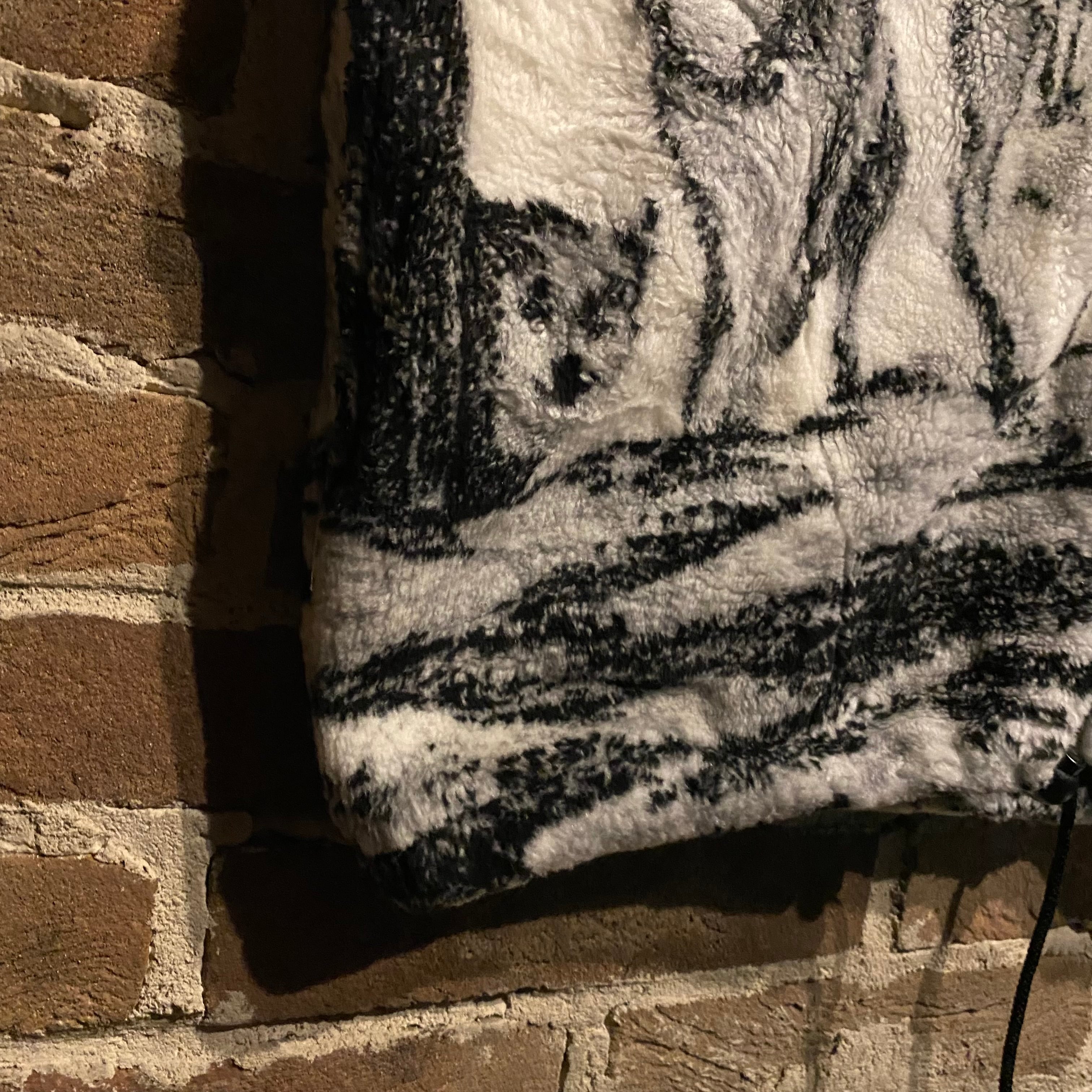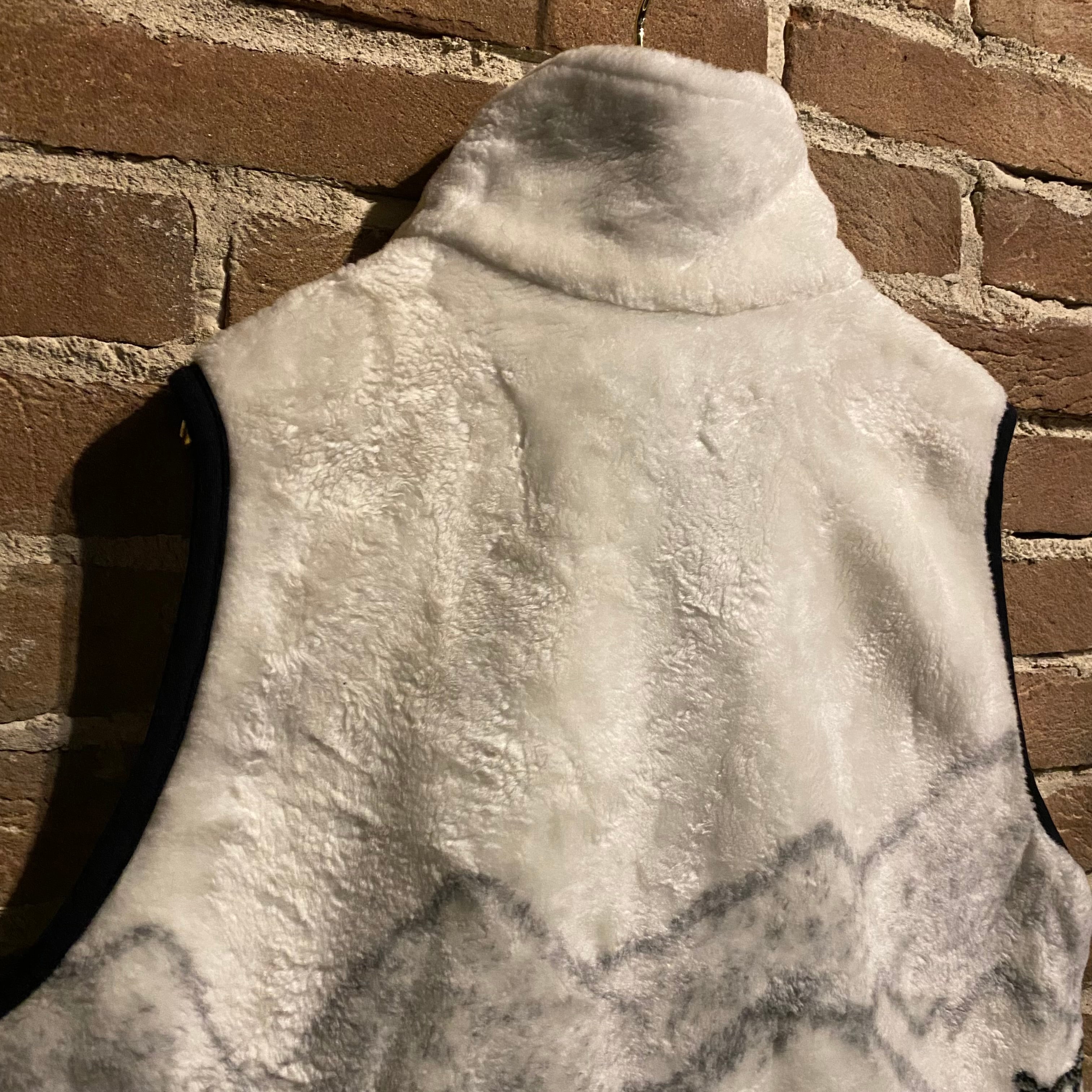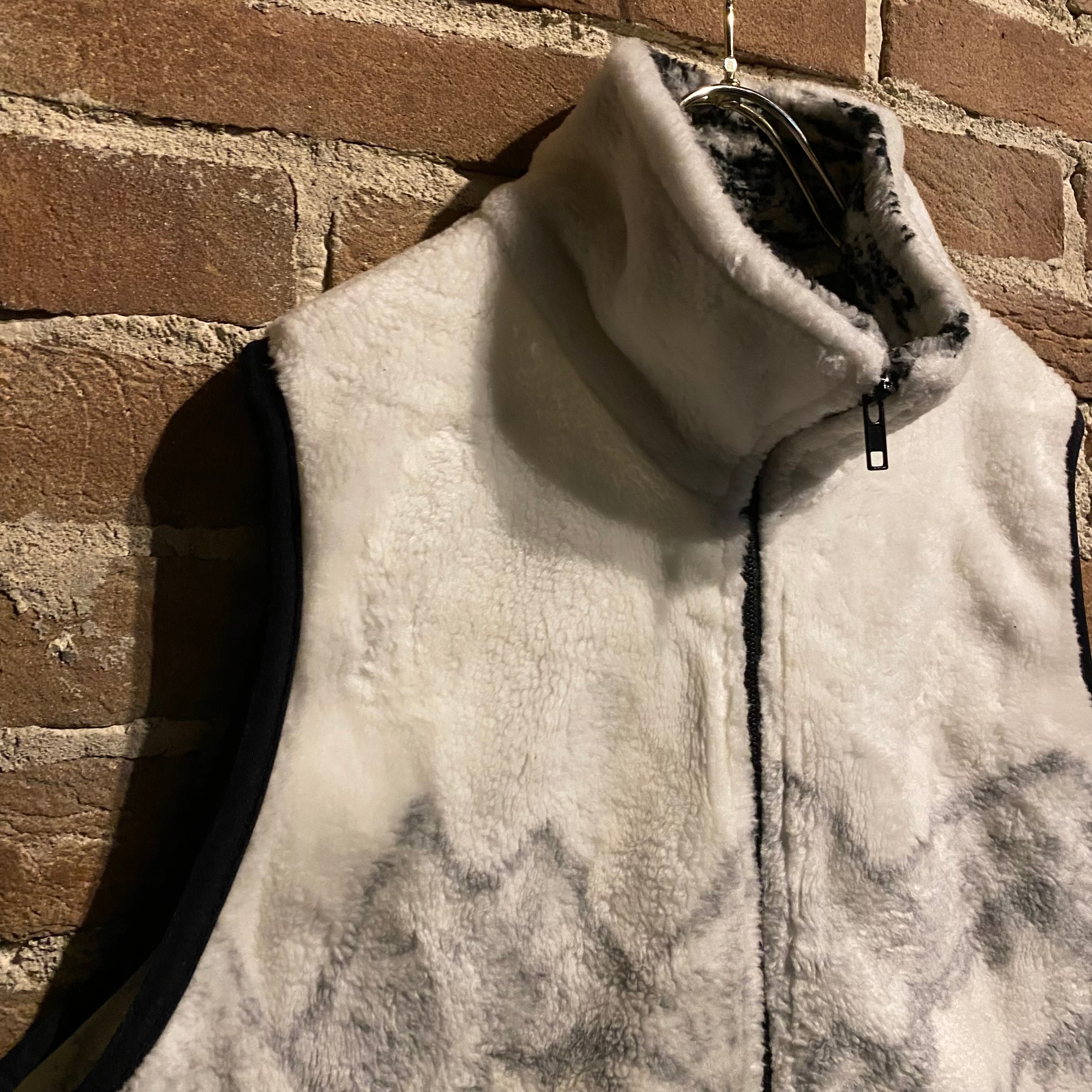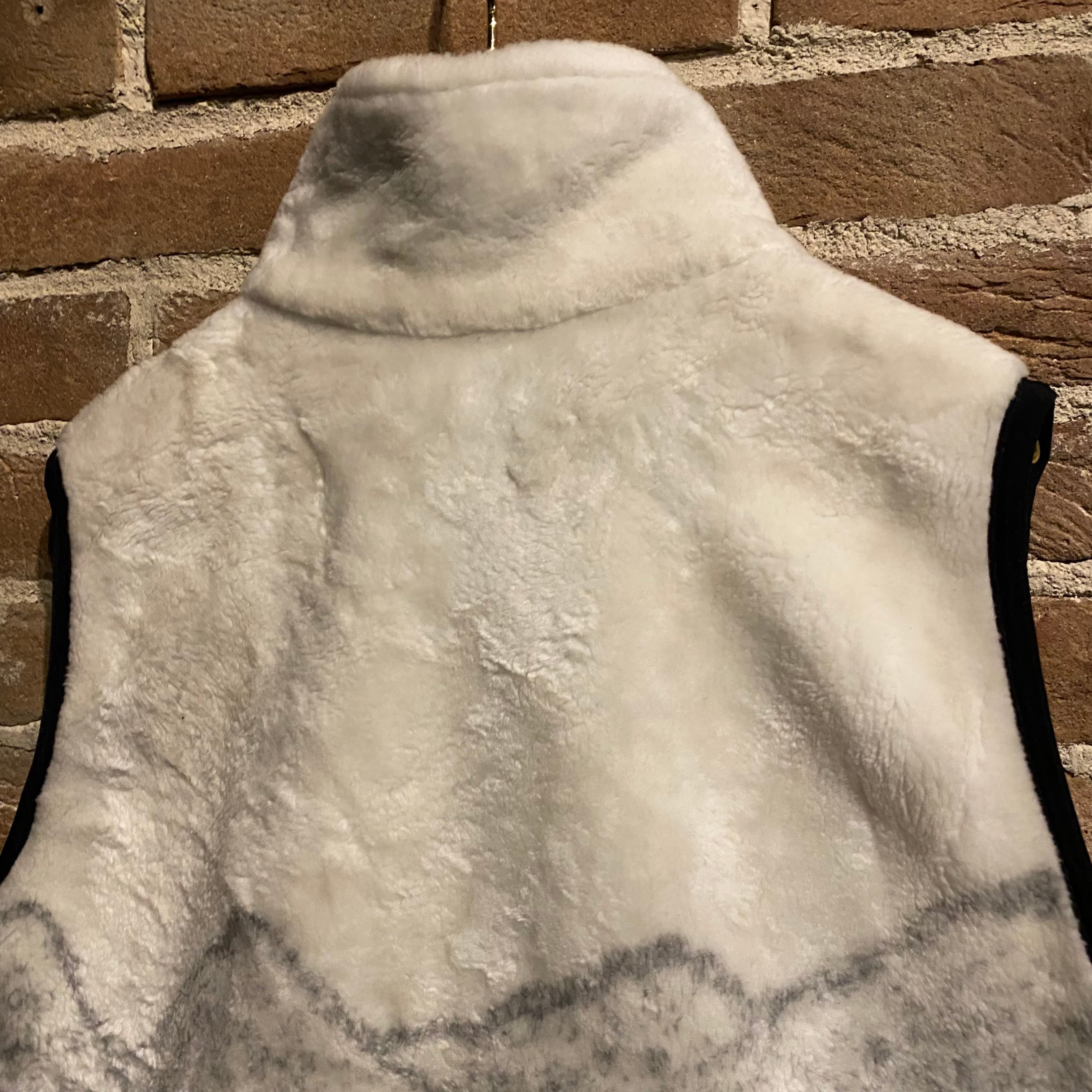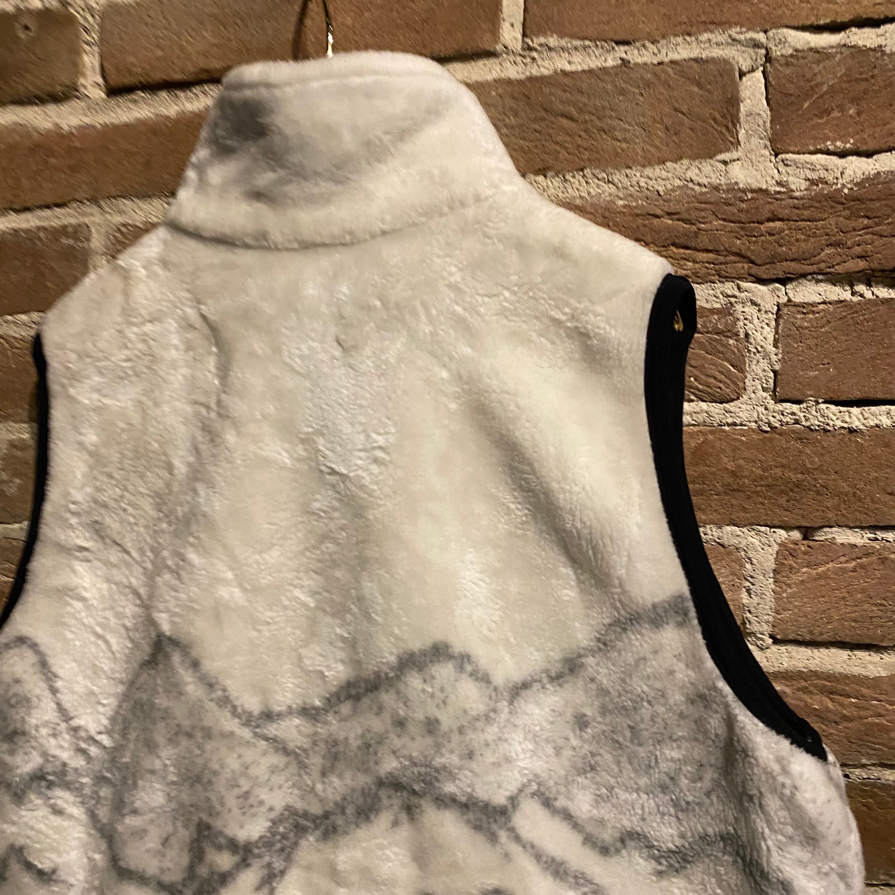 凍える雪山を背景に、オオカミの群れを独特のタッチでボディ全面に描き上げたフリースベスト。