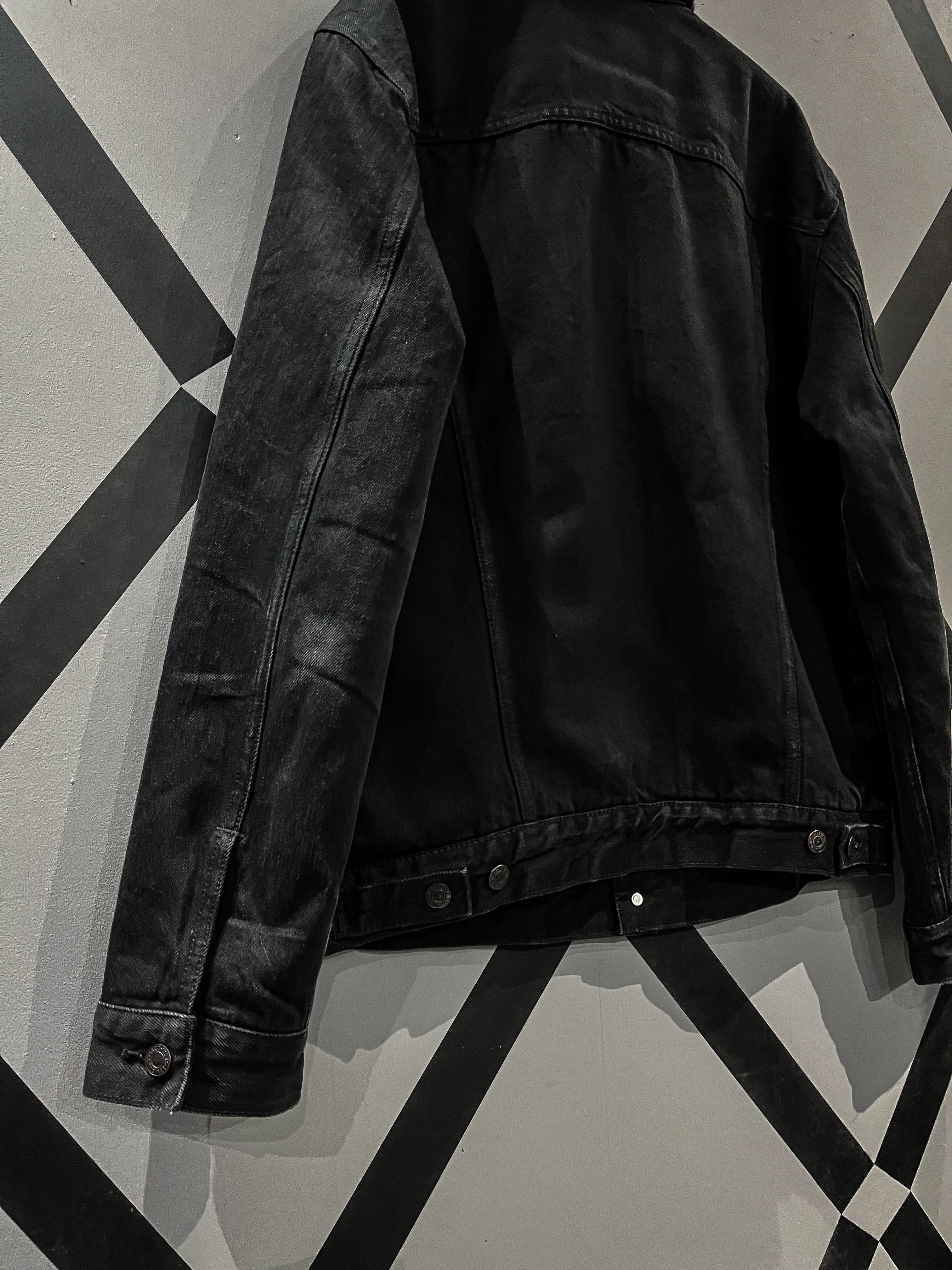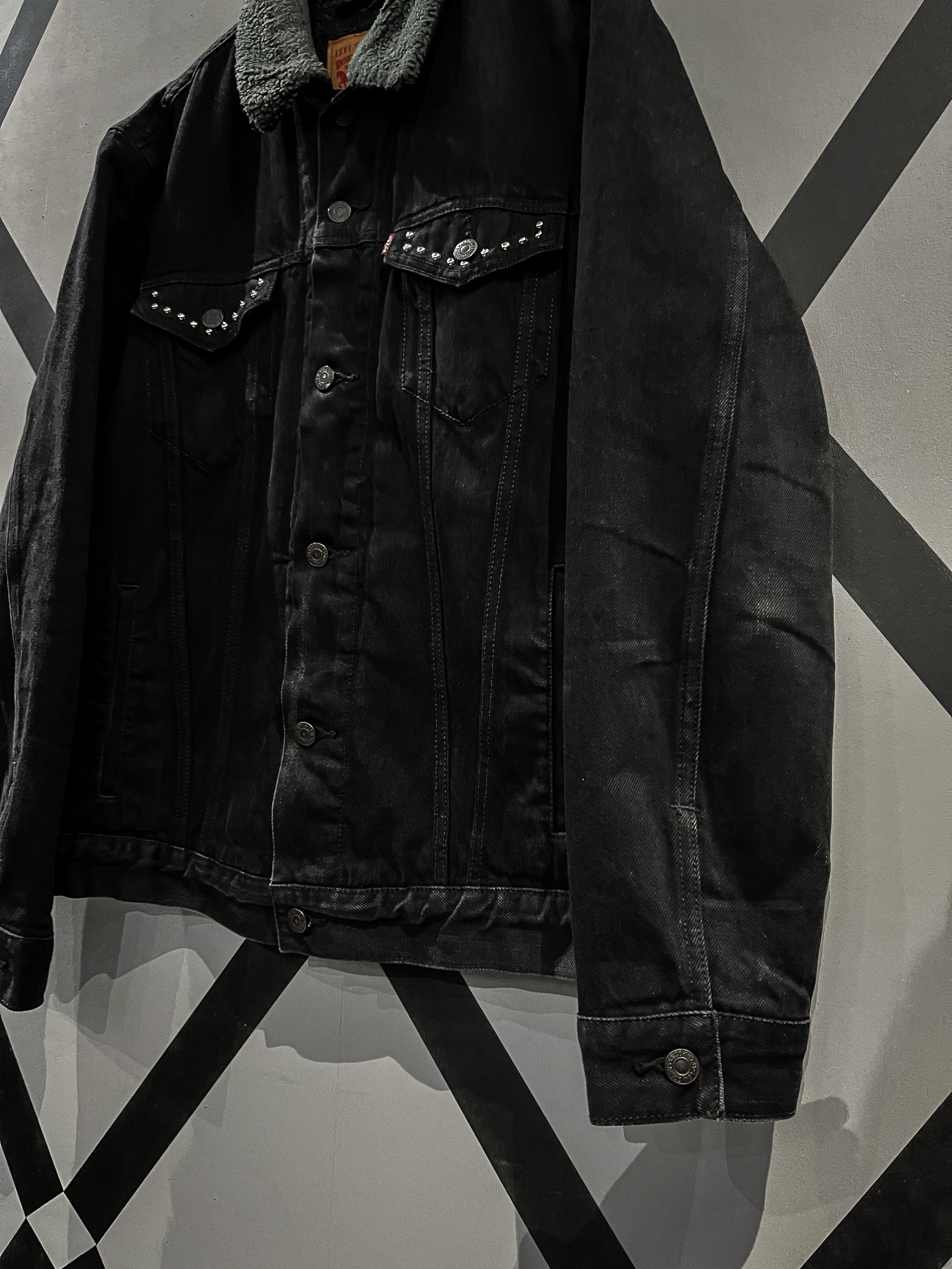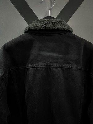 美しい風合いを漂わせる程良いフェードの効いたブラックデニムをボディに使用し、両胸に配されたポケットのフラップに、キラリと光るシルバーのスタッズを配置。襟、裏地全面にもっふもふのボアを敷き詰めた抜群の保温性を誇る1着。