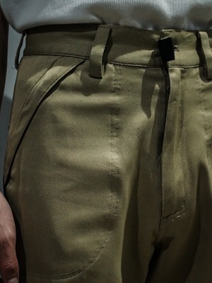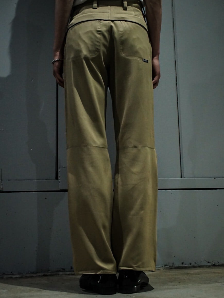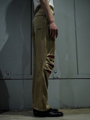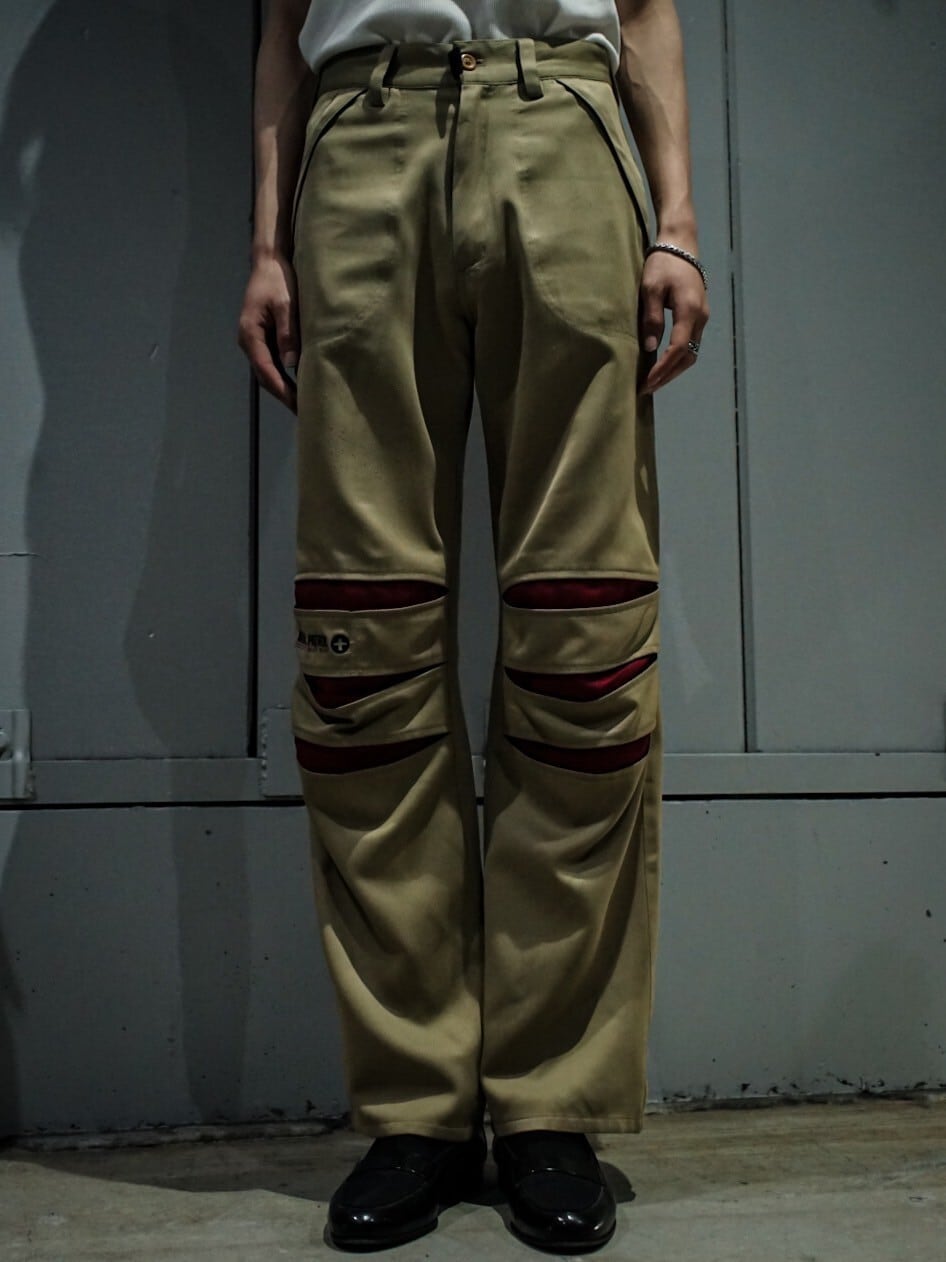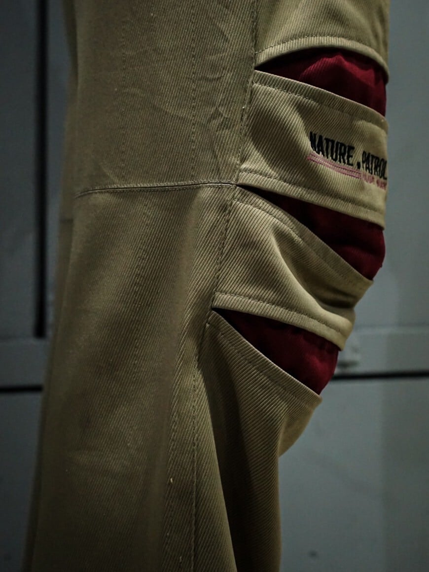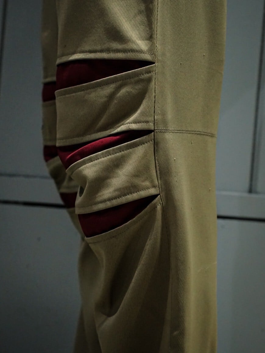 ミリタリーライクなベージュのボディに、膝部分にスラッシュのギミックを施したカーゴパンツ。裏地の赤色がアクセントになり、ボディに立体感与えています。