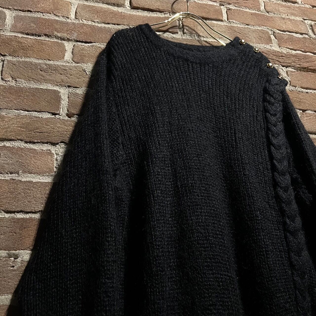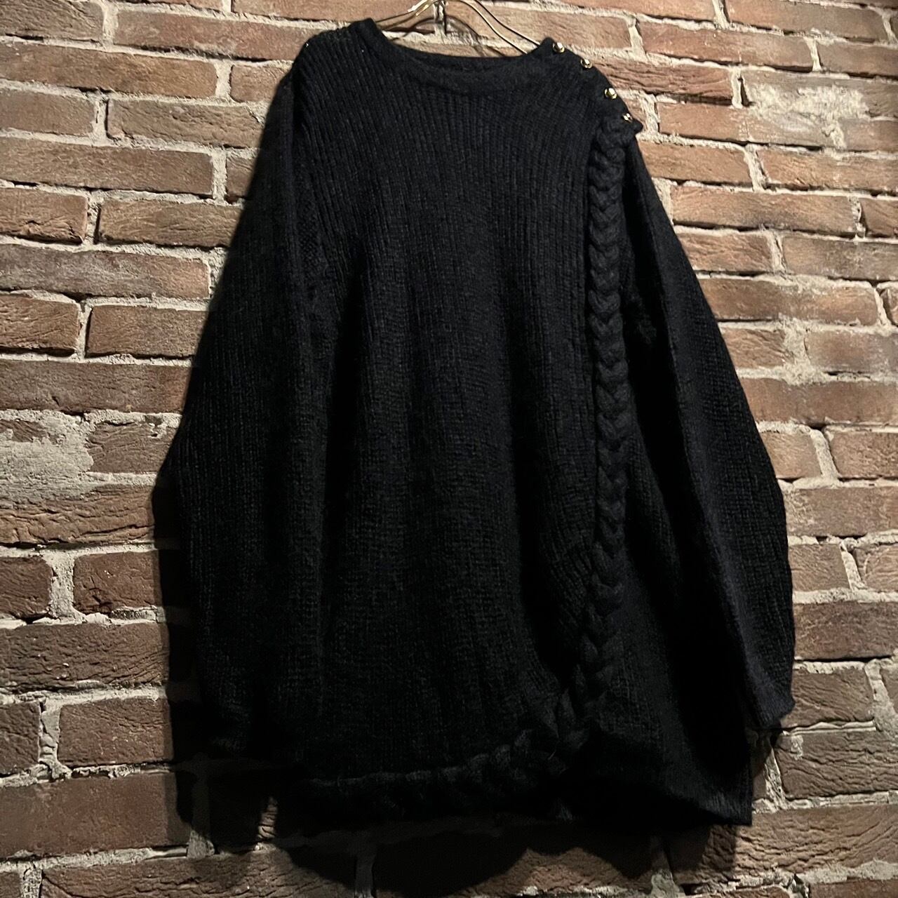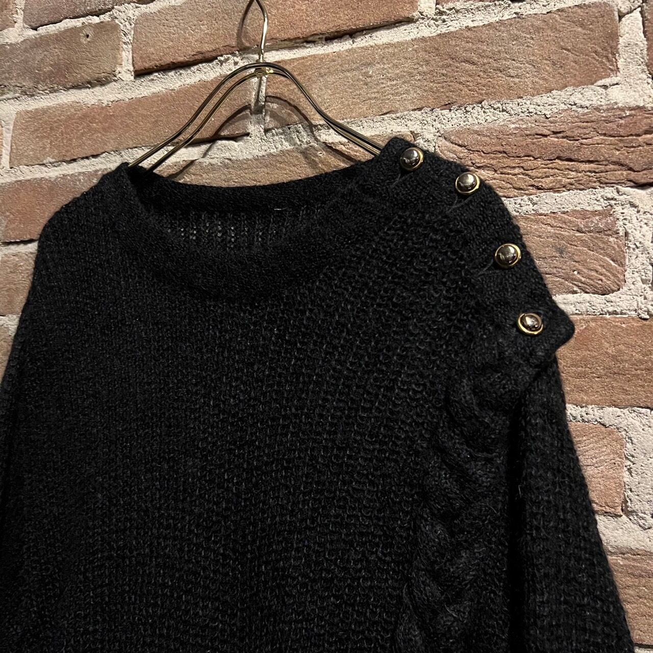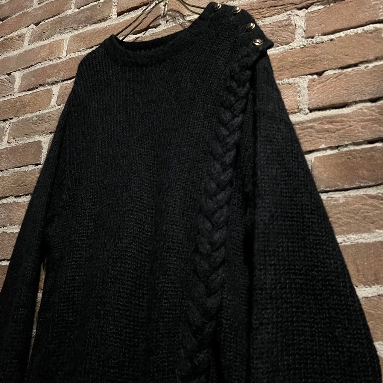 フロントから裾にかけて三つ編みを切り替え、左肩にはゴールドのボタンをアクセントにON。古着ならではのアーティスティックなエッセンスをプラスしながら、ブラックモヘアから放たれる高級感を更に底上げ。