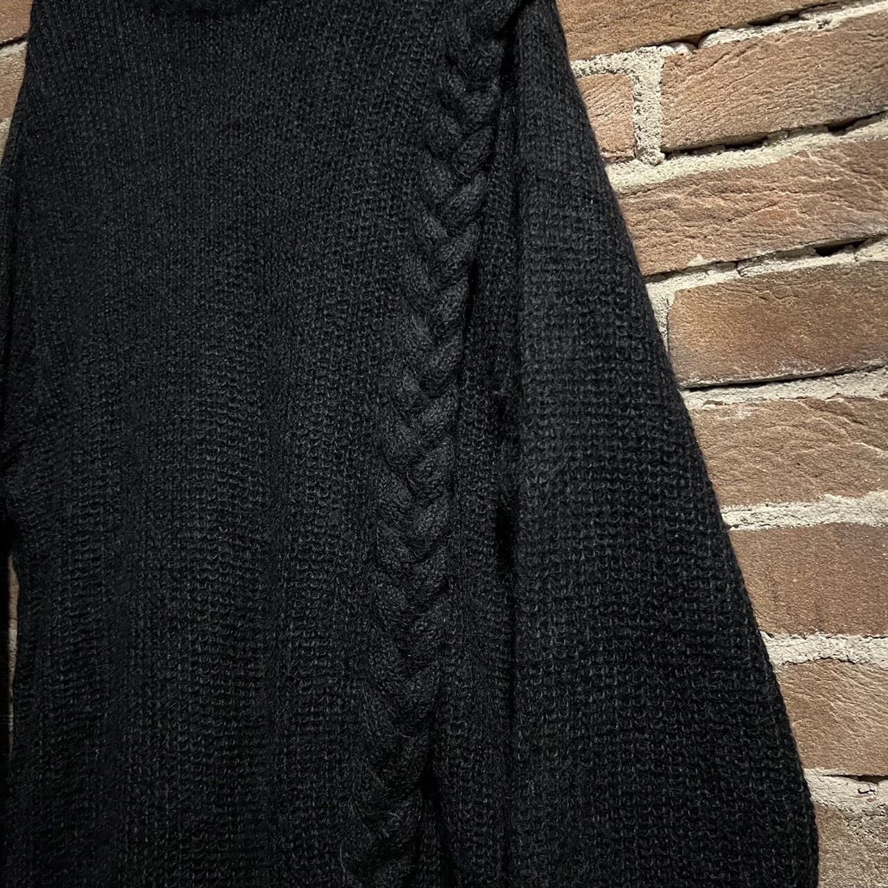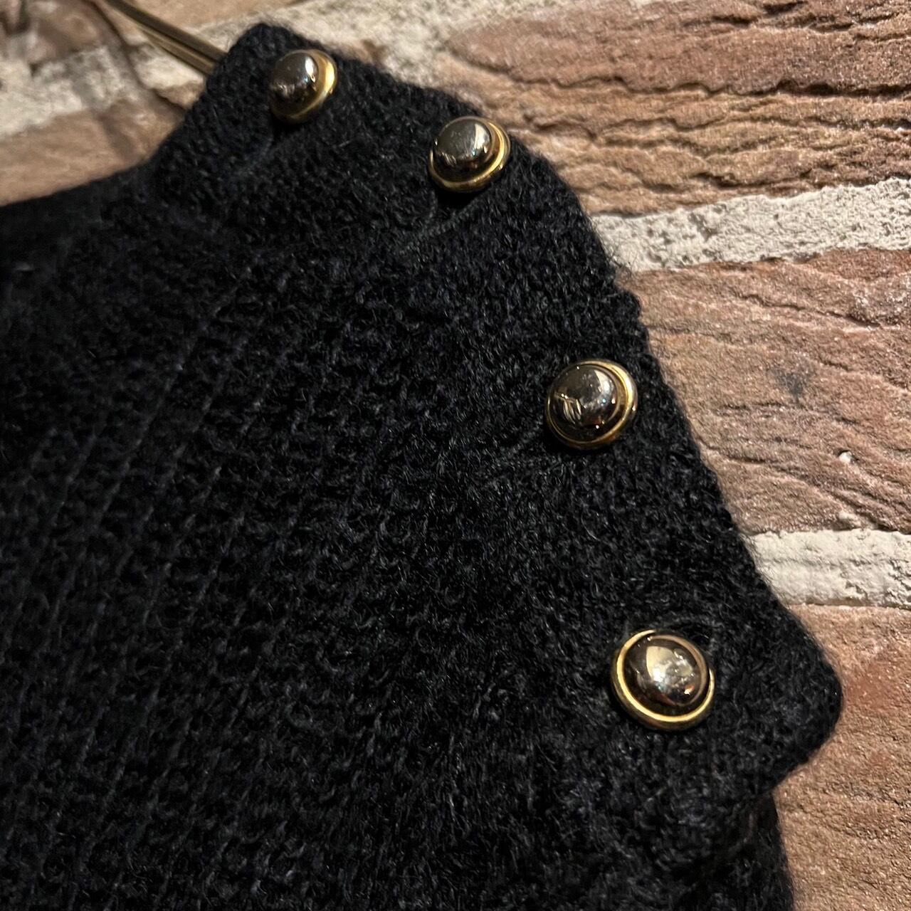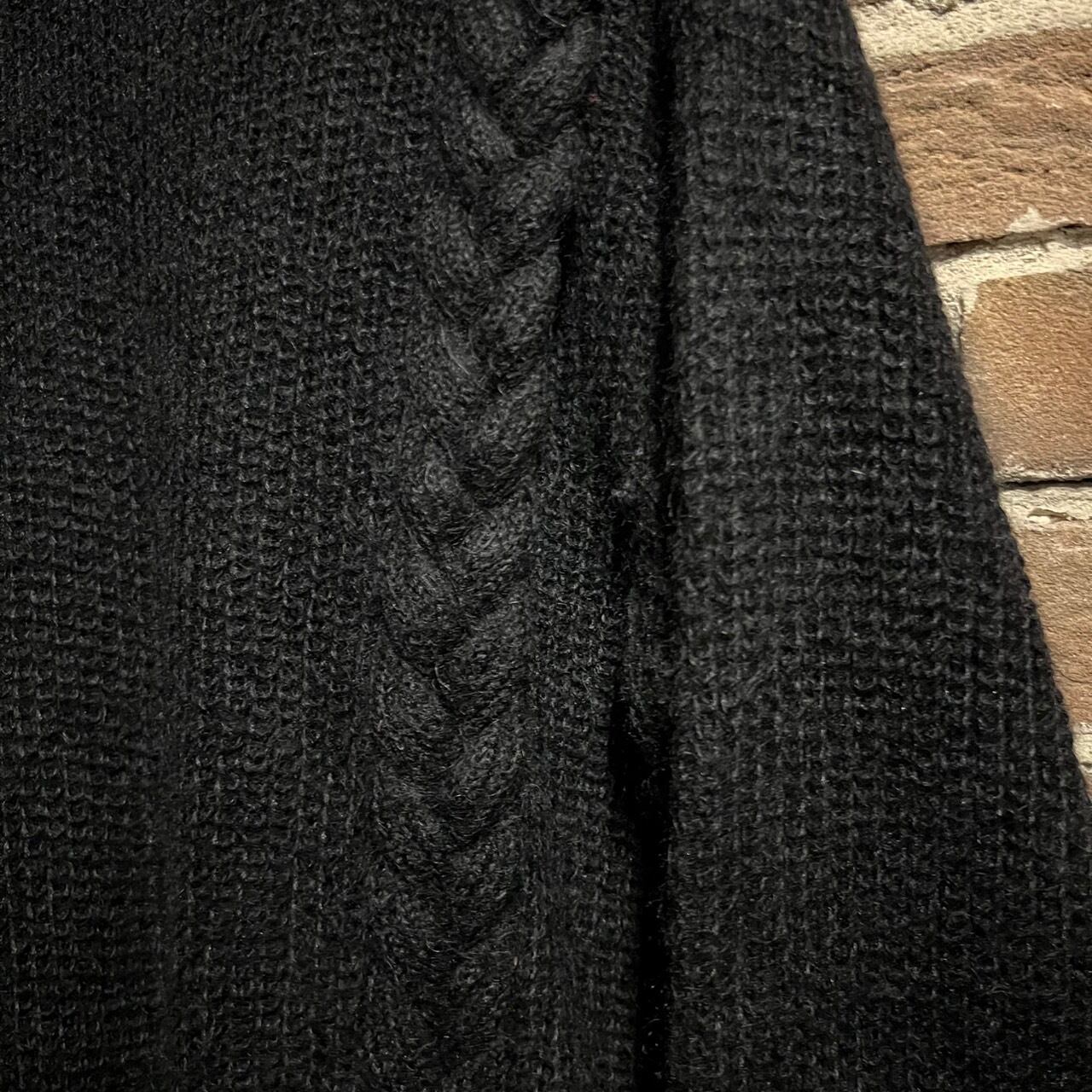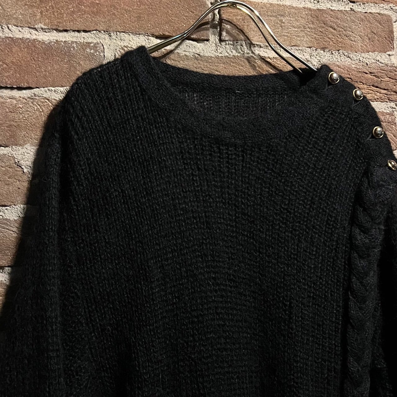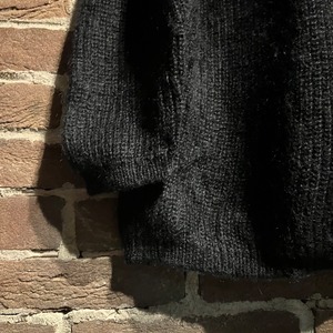 フロントから裾にかけて三つ編みを切り替え、左肩にはゴールドのボタンをアクセントにON。古着ならではのアーティスティックなエッセンスをプラスしながら、ブラックモヘアから放たれる高級感を更に底上げ。