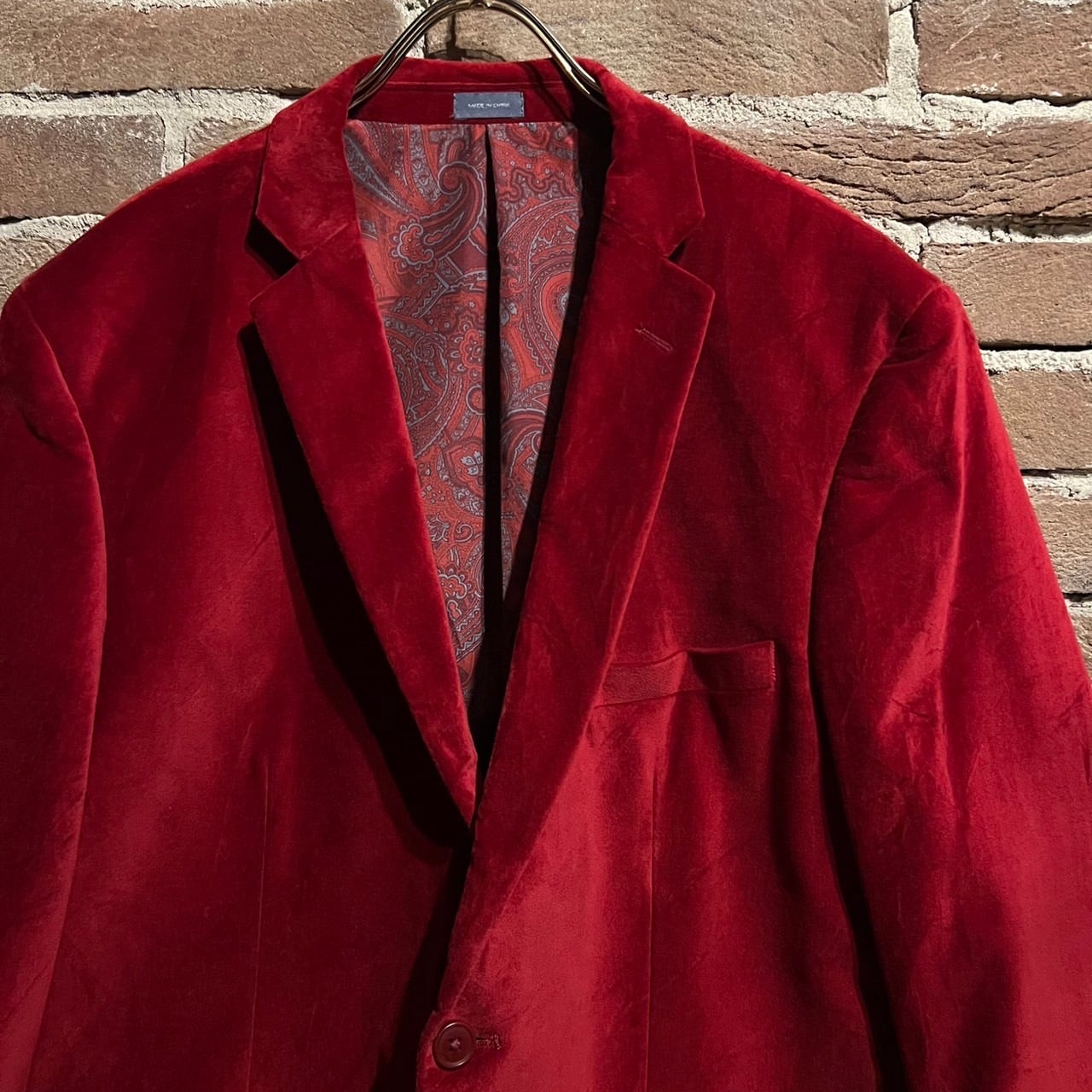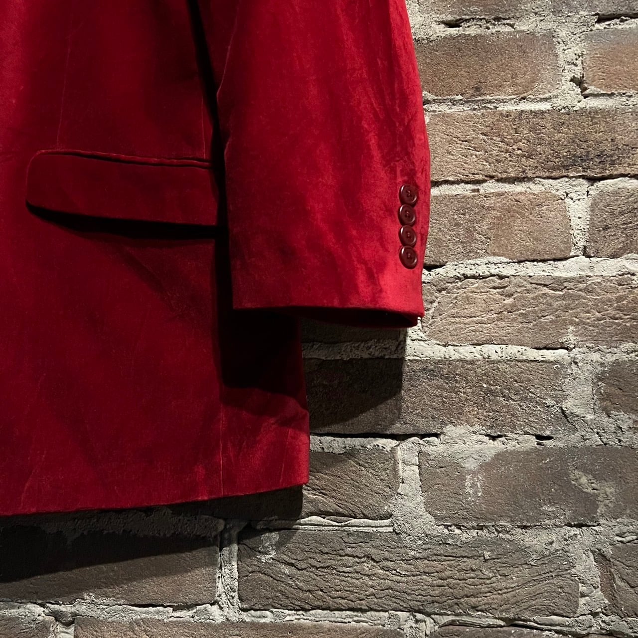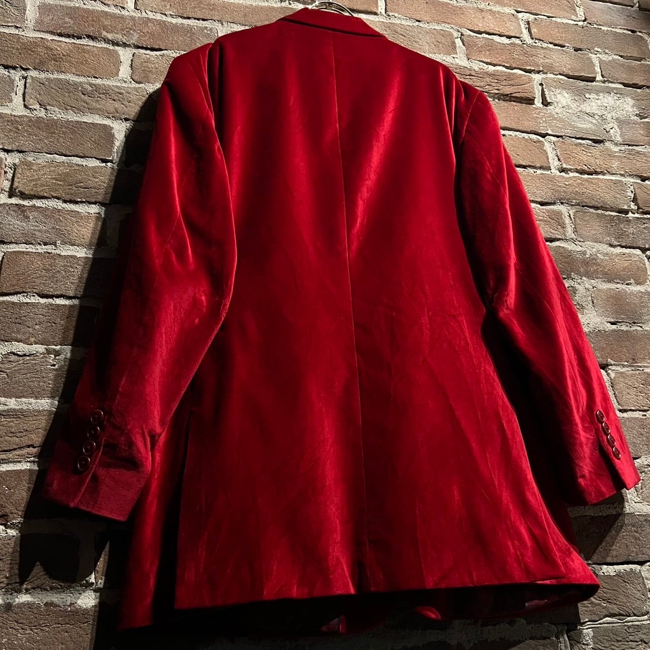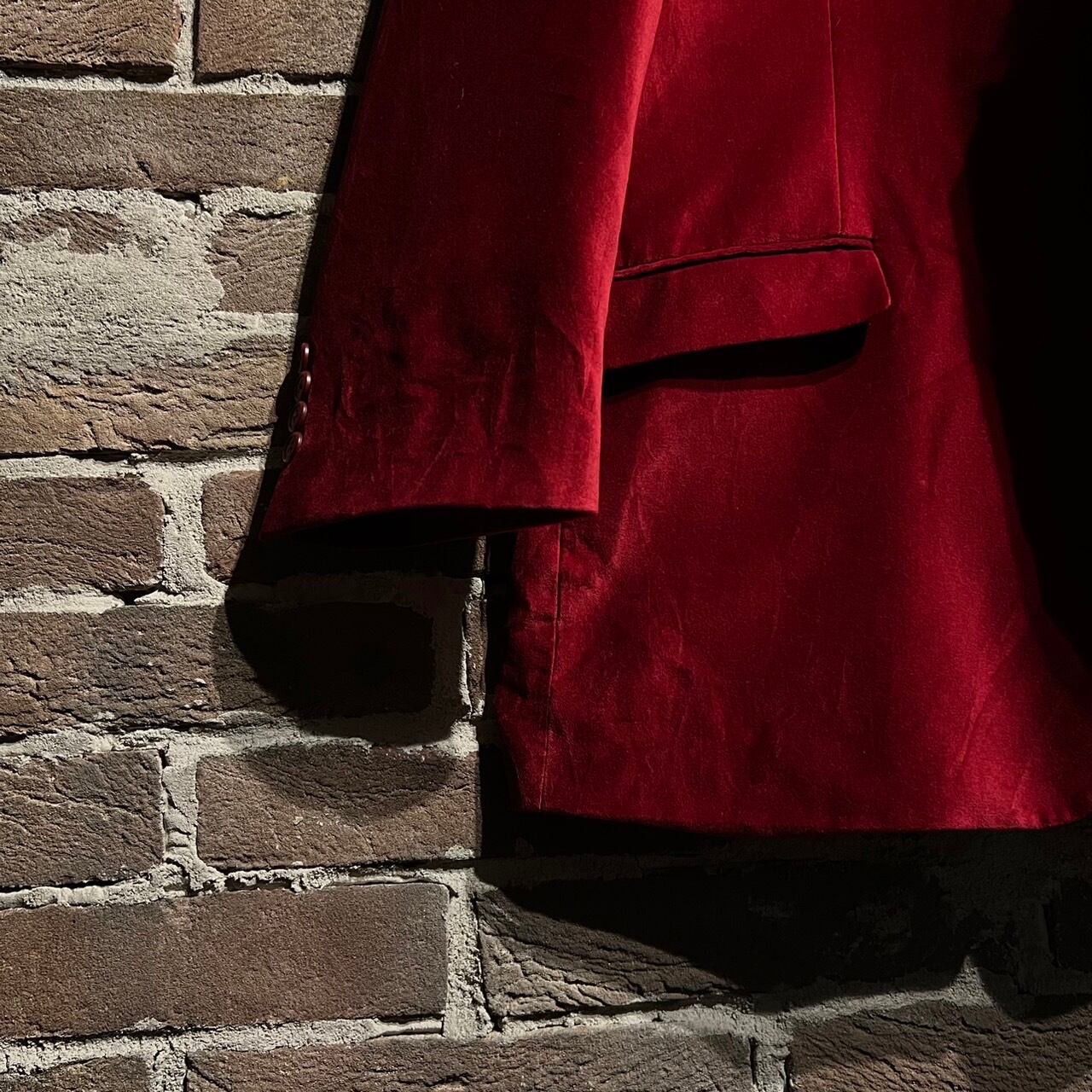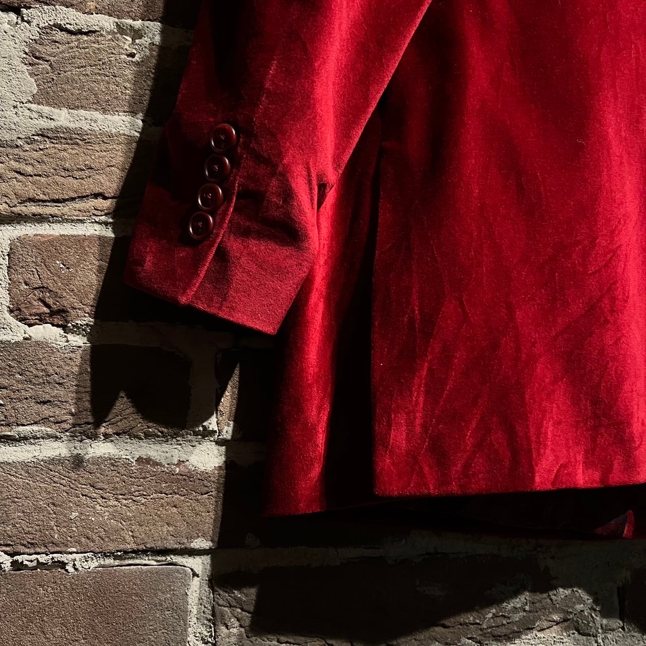 見る角度や光の当たり方によって見え方、輝き方が変わる、美しい赤色のベロア素材を用いたテーラードジャケット。裏地のペイズリー柄も雰囲気をムンムンに漂わせ、クロークに預けた時にも抜かりなしですね。