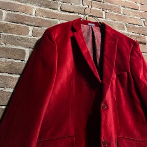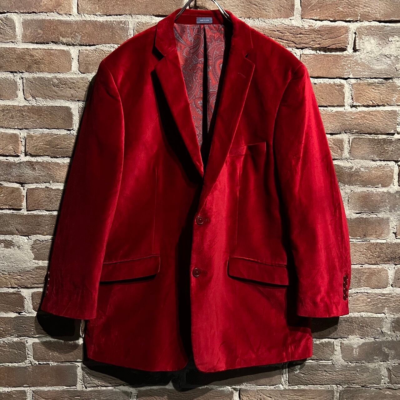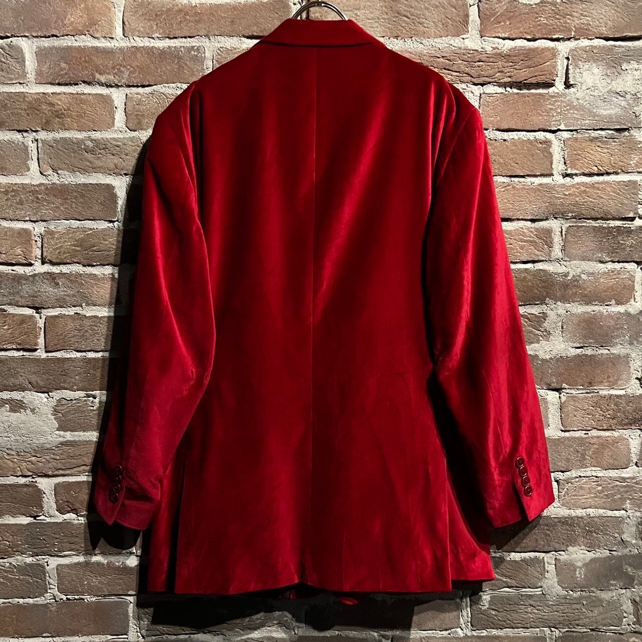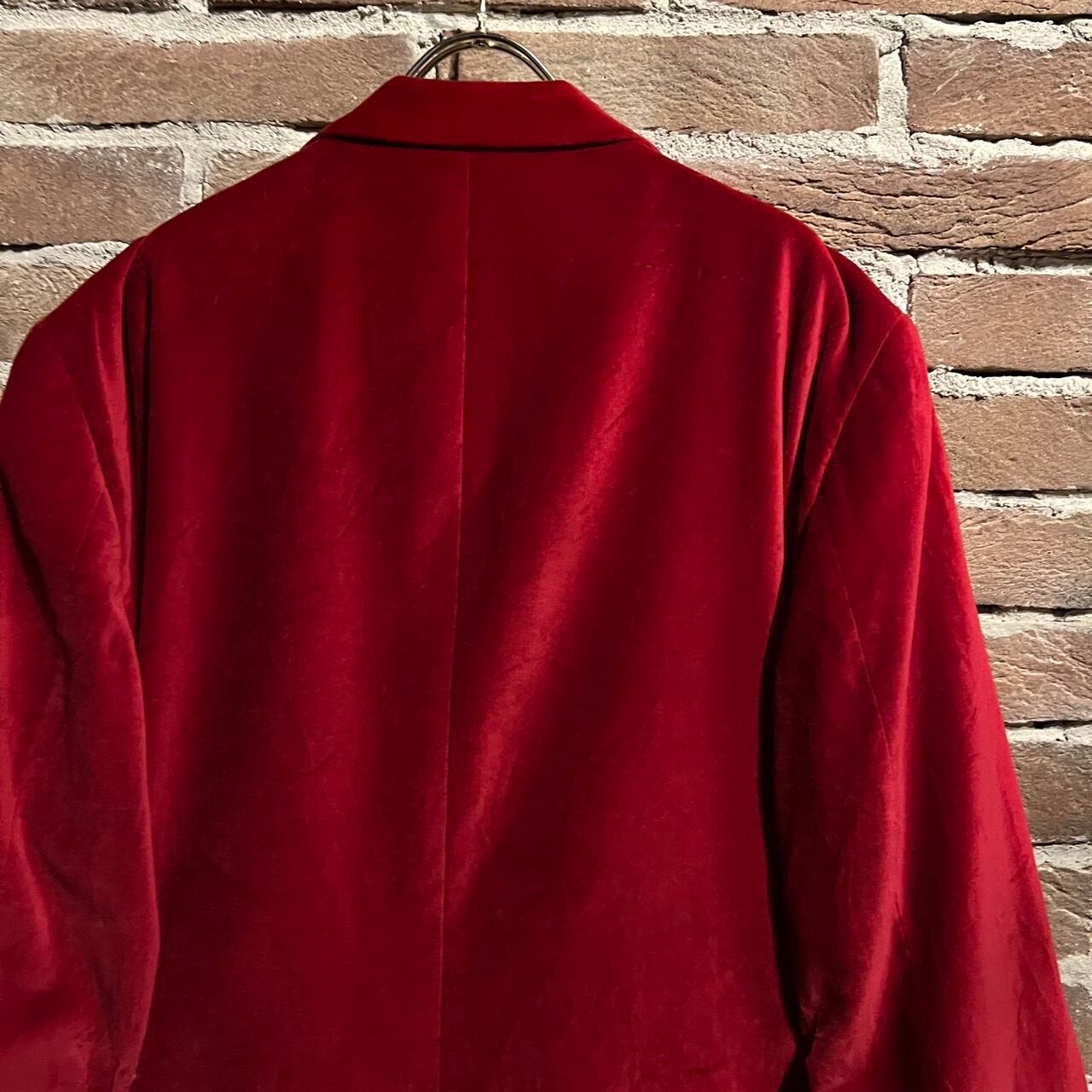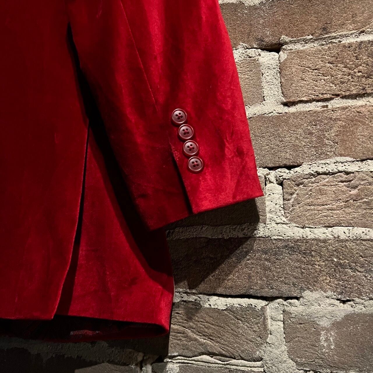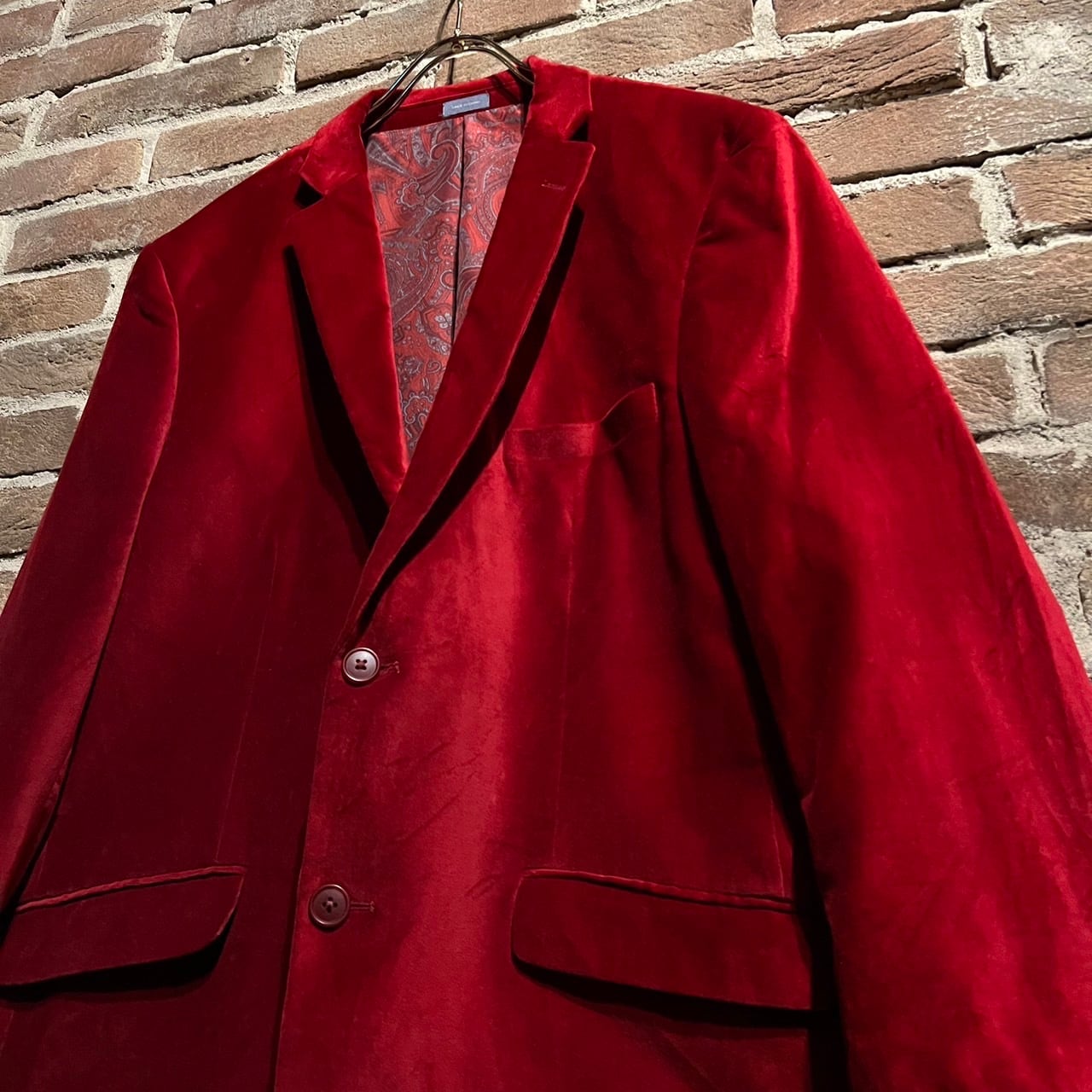 見る角度や光の当たり方によって見え方、輝き方が変わる、美しい赤色のベロア素材を用いたテーラードジャケット。裏地のペイズリー柄も雰囲気をムンムンに漂わせ、クロークに預けた時にも抜かりなしですね。
