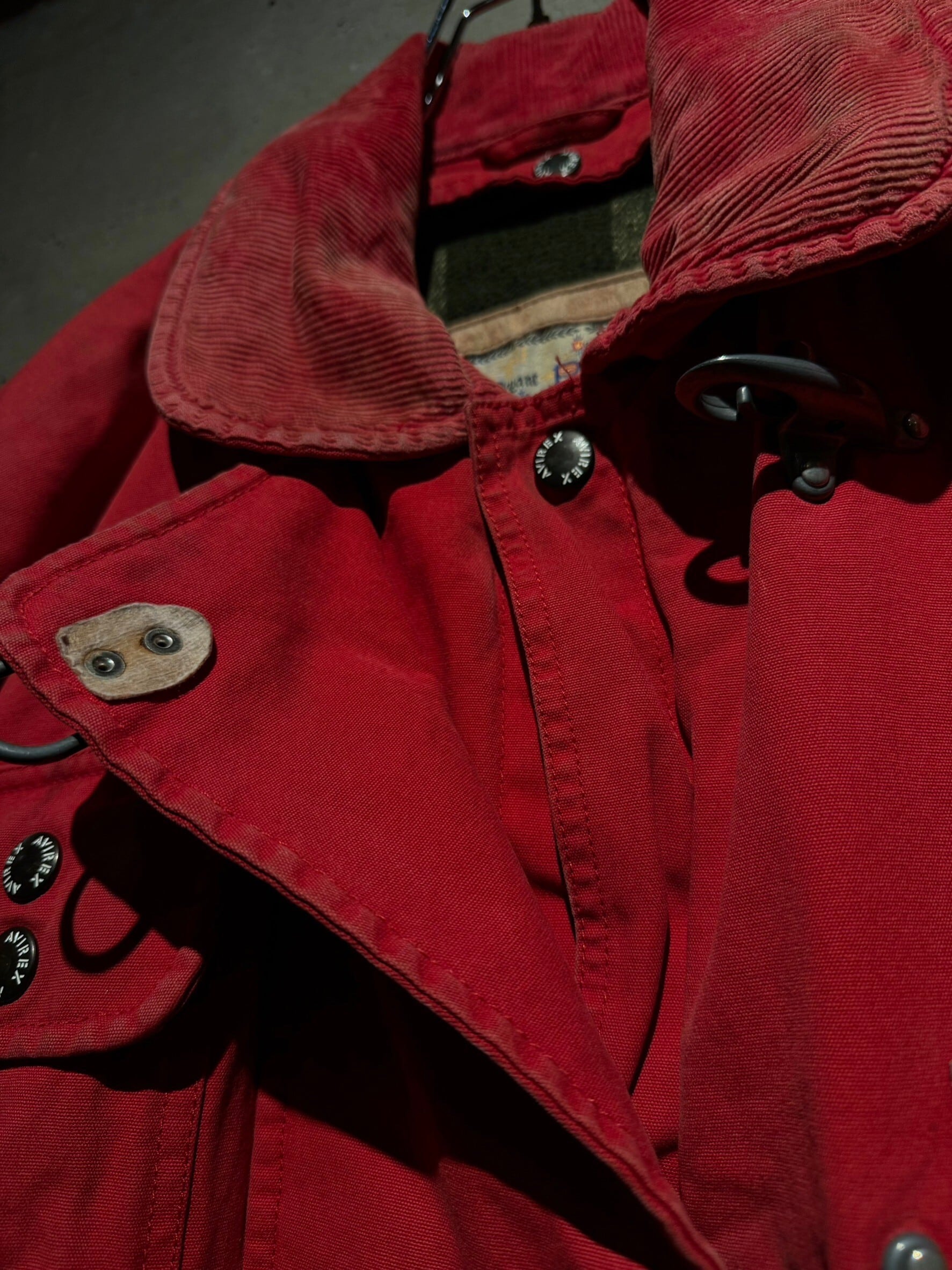 内側にはチェック柄を配した取り外し可能なライナーを装備。首元はコーデュロイ素材での切り替えが成され、チンストラップが付属した立ち襟仕様にもなる変形ギミック。各所に施された機能面のギミックに非常にグッときます…