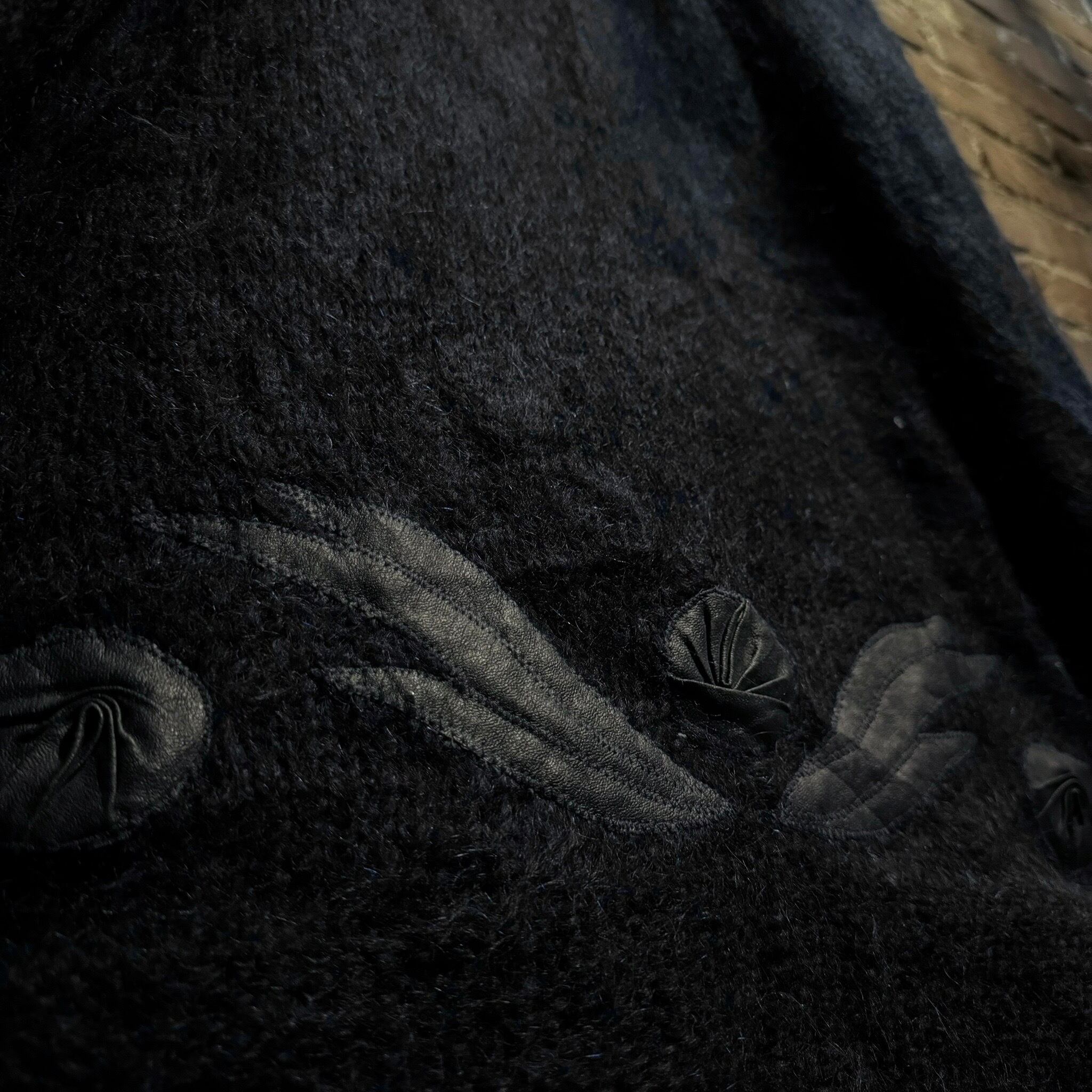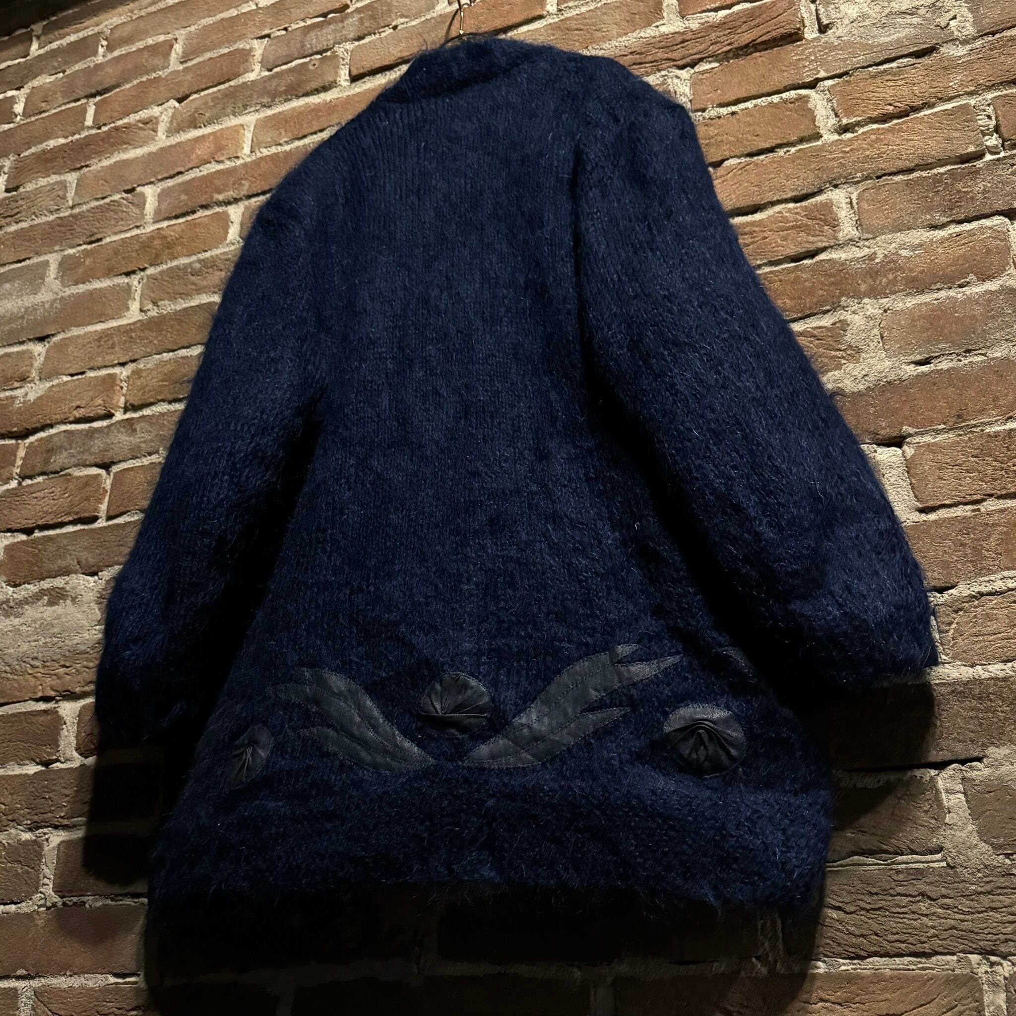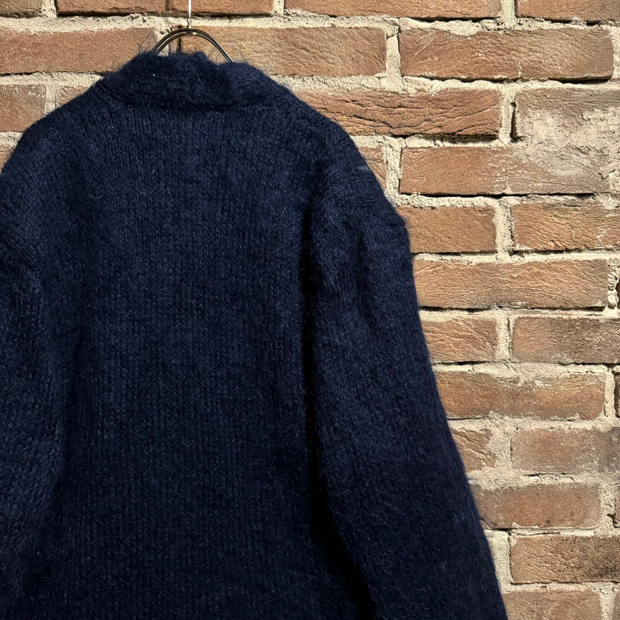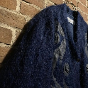 落ち着いたネイビーカラーのボディに毛足のたっぷりと長いモヘアを使用したカーディガン。ここまで長い毛足が残っているのは非常〜に珍しく、モヘア特有のフワッとした質感に惚れ惚れしてしまいますね。