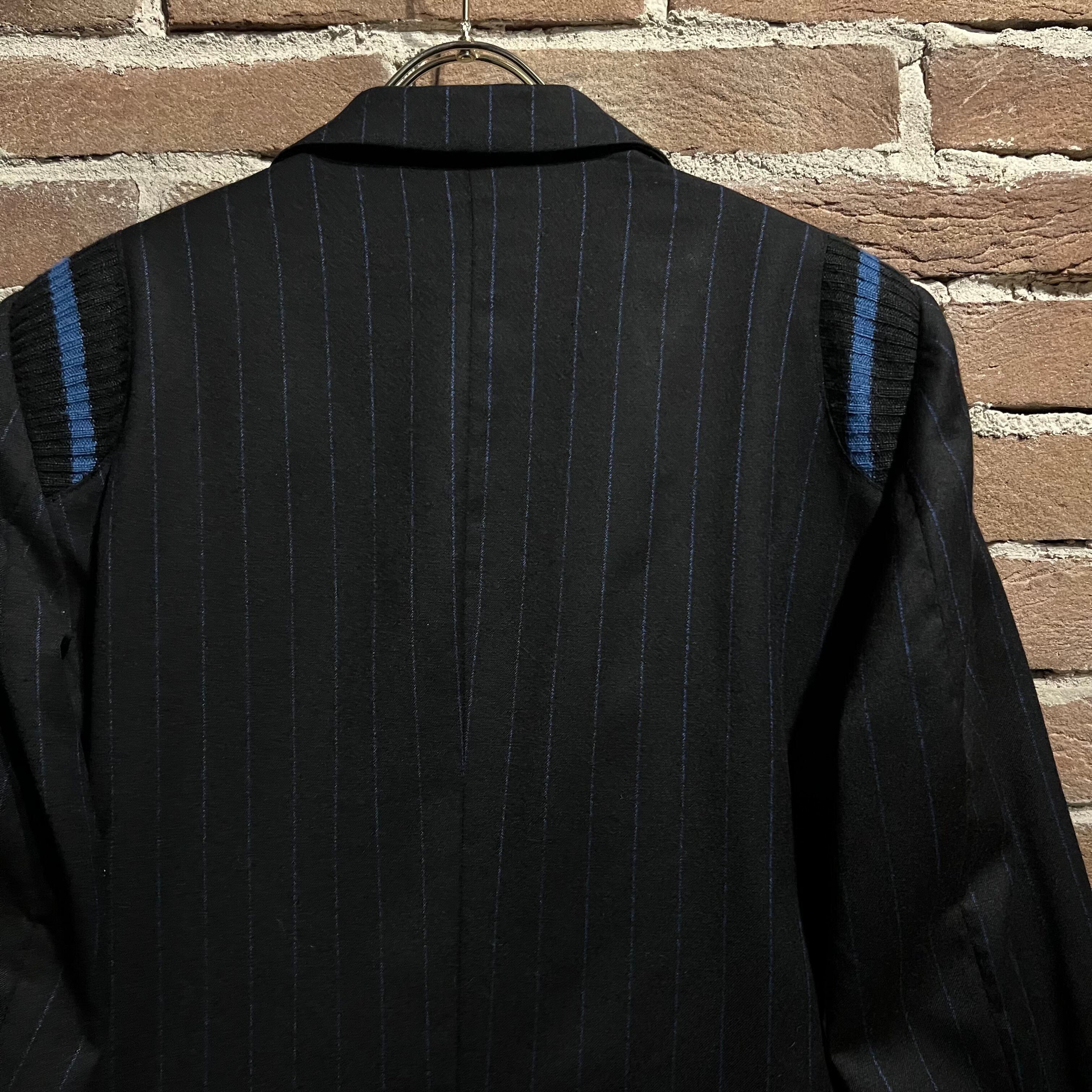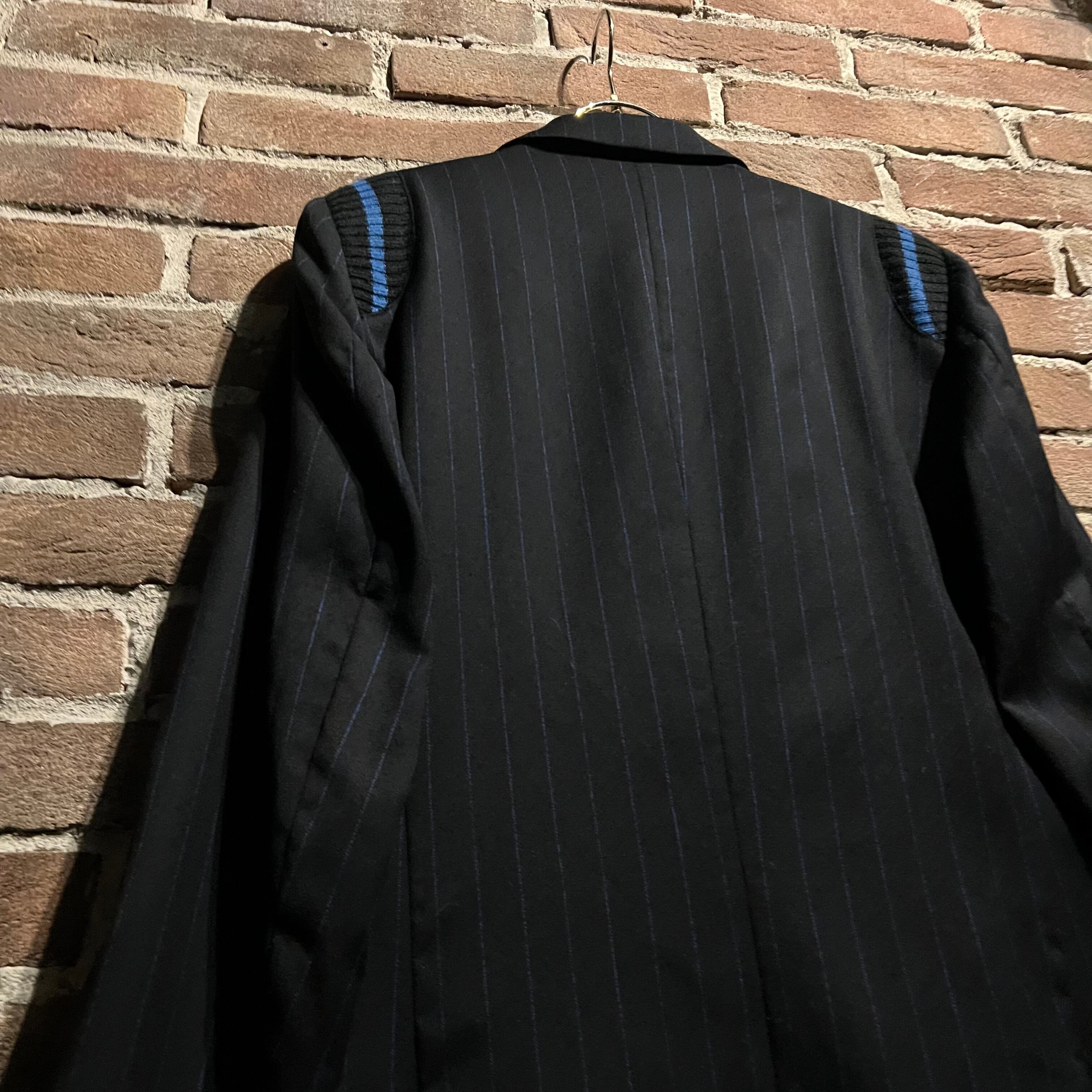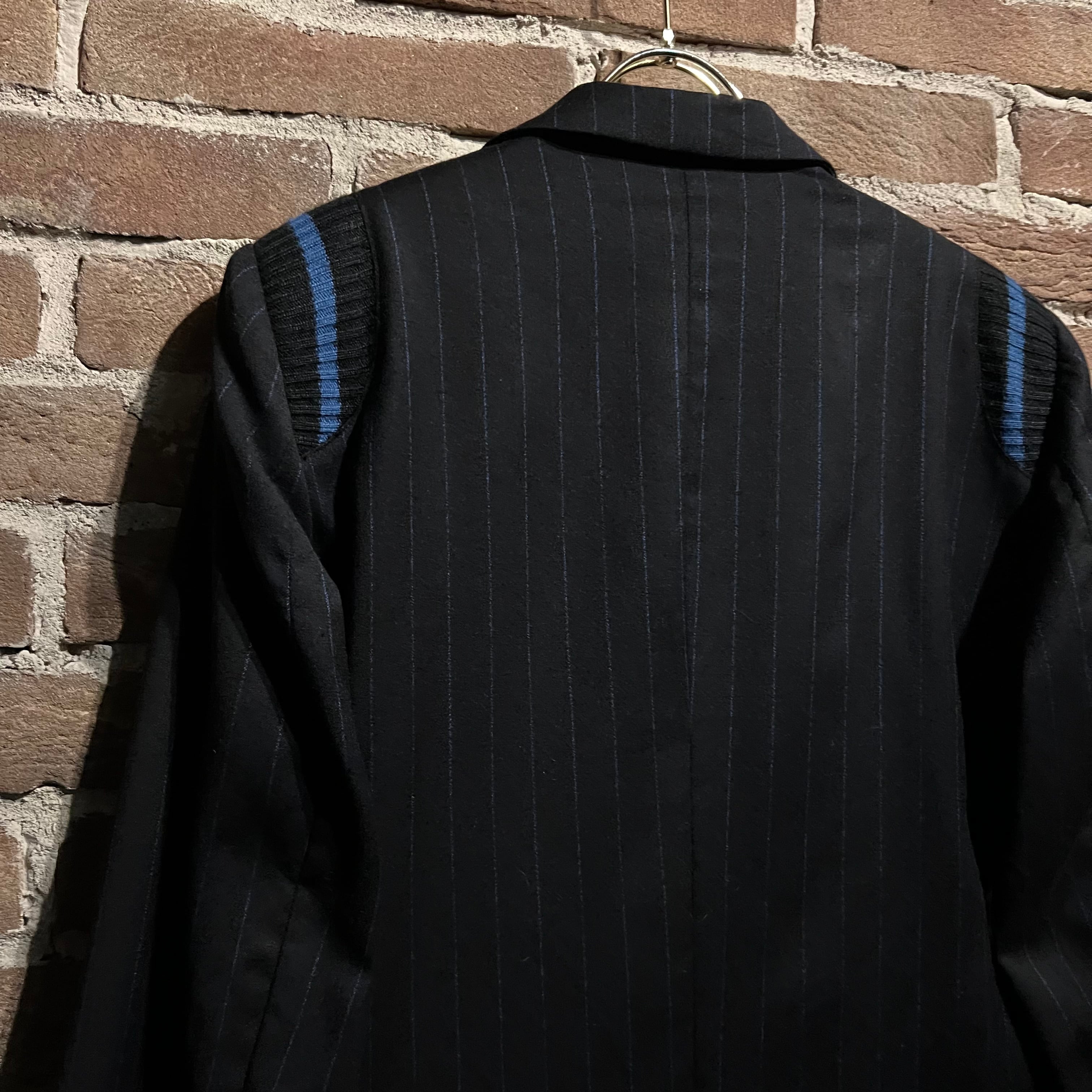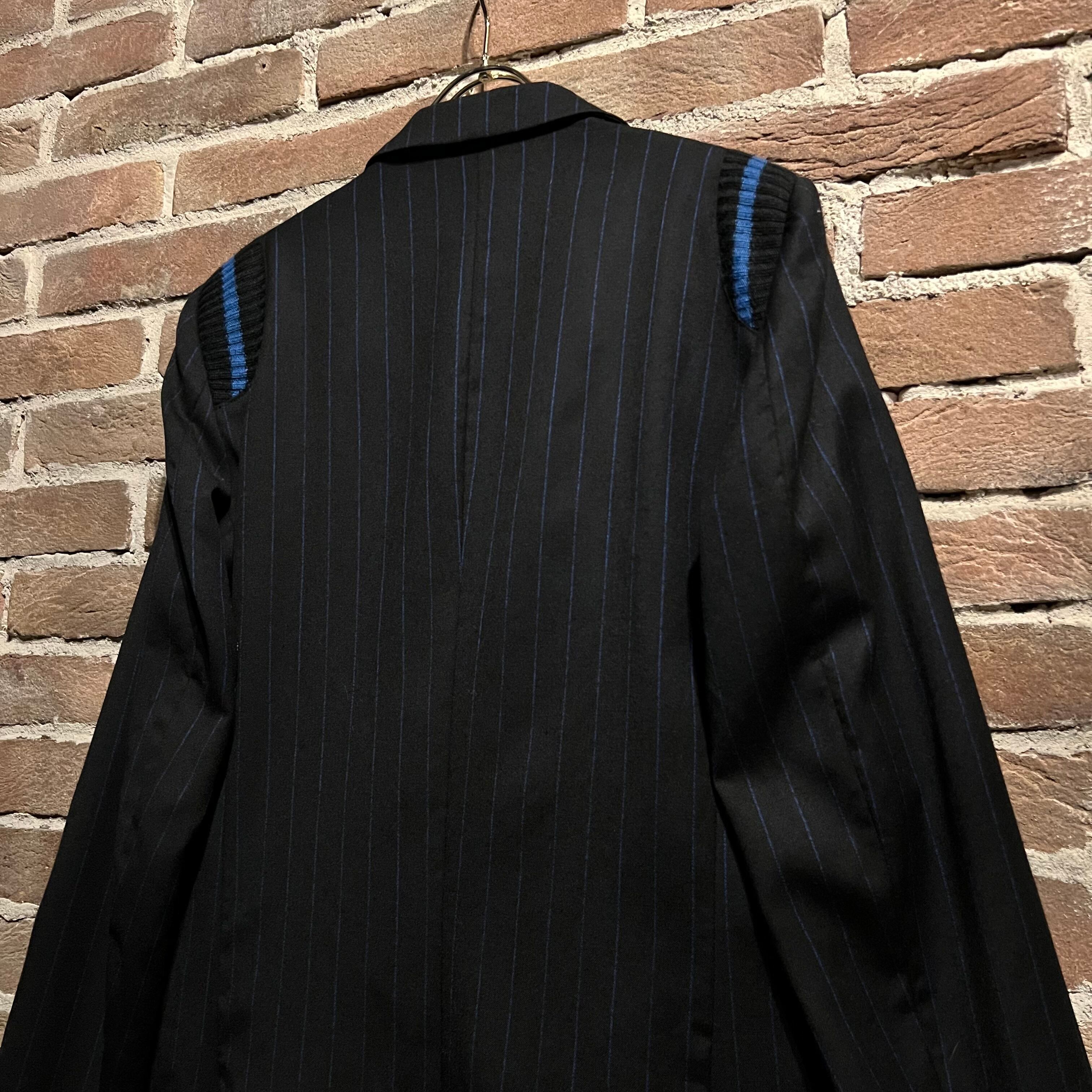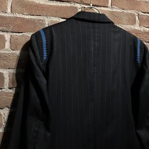 ブラックのボディにブルーのストライプを載せ、ショルダー部分にニット素材を切り替えたテーラードジャケット。カチッとしたアイテムながら異素材で遊びを効かせるデザインセンスに服好きの心掴まれす。