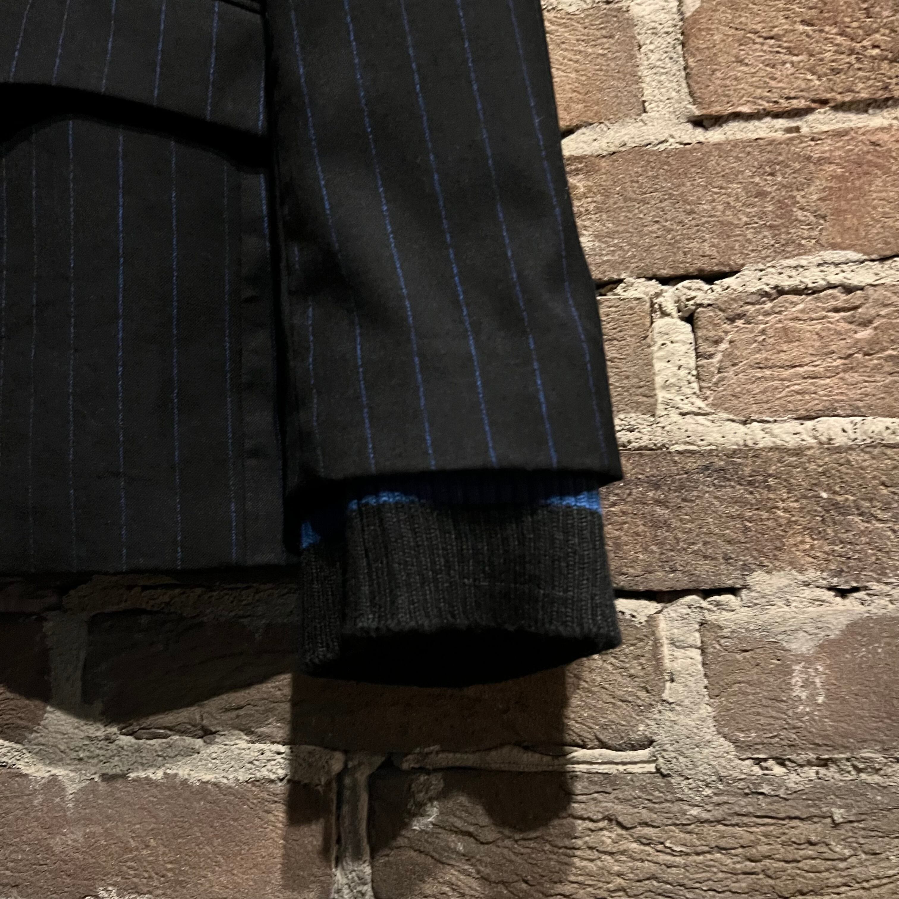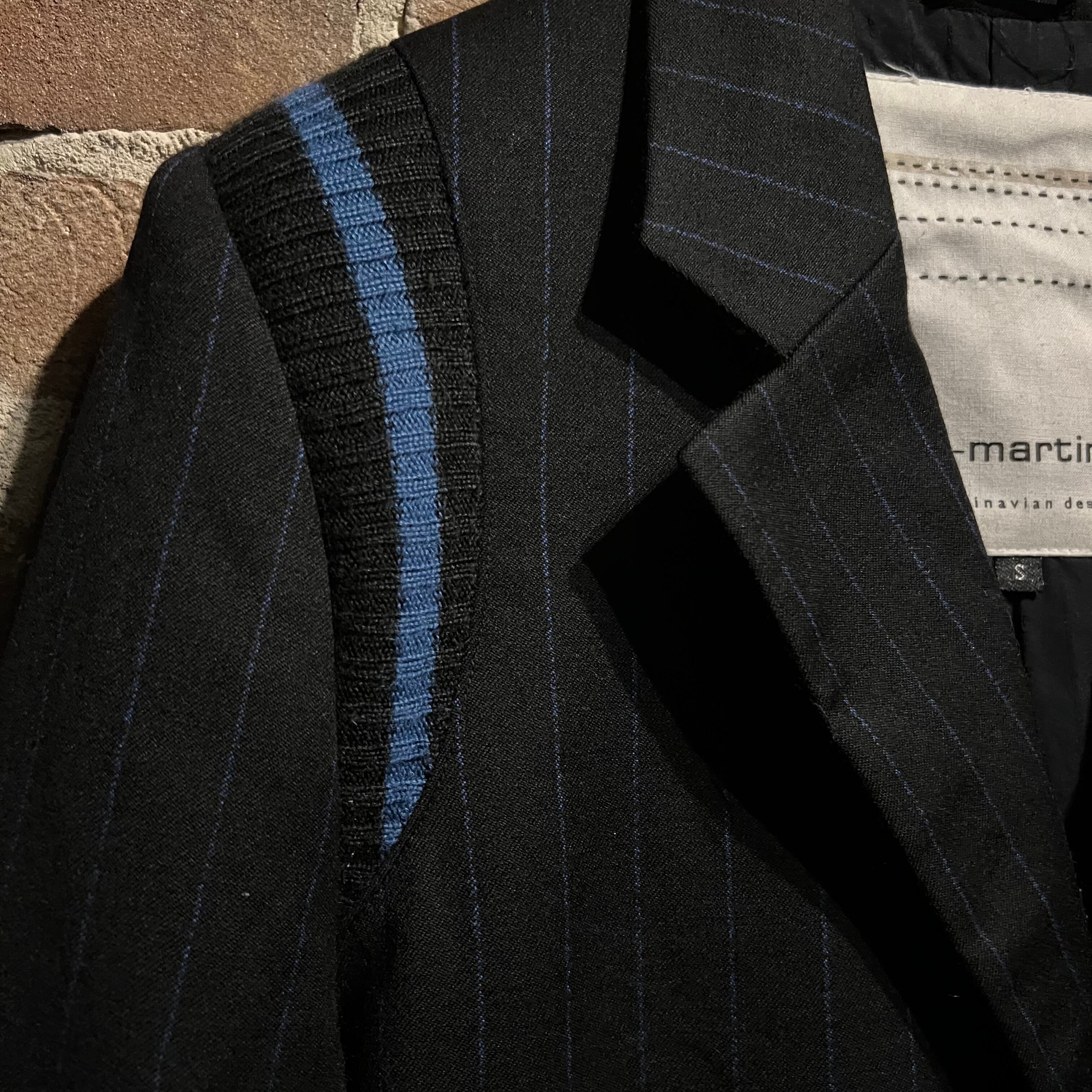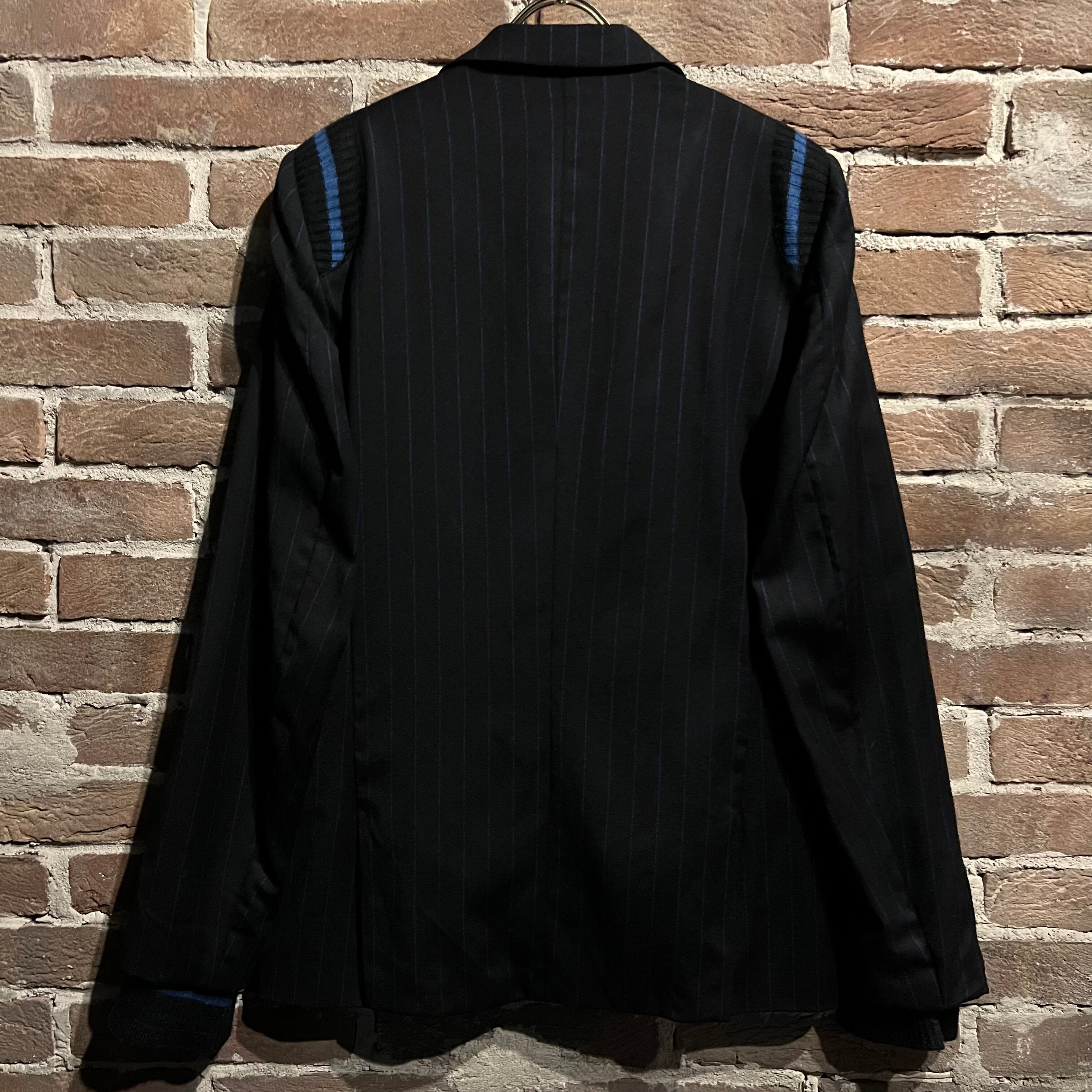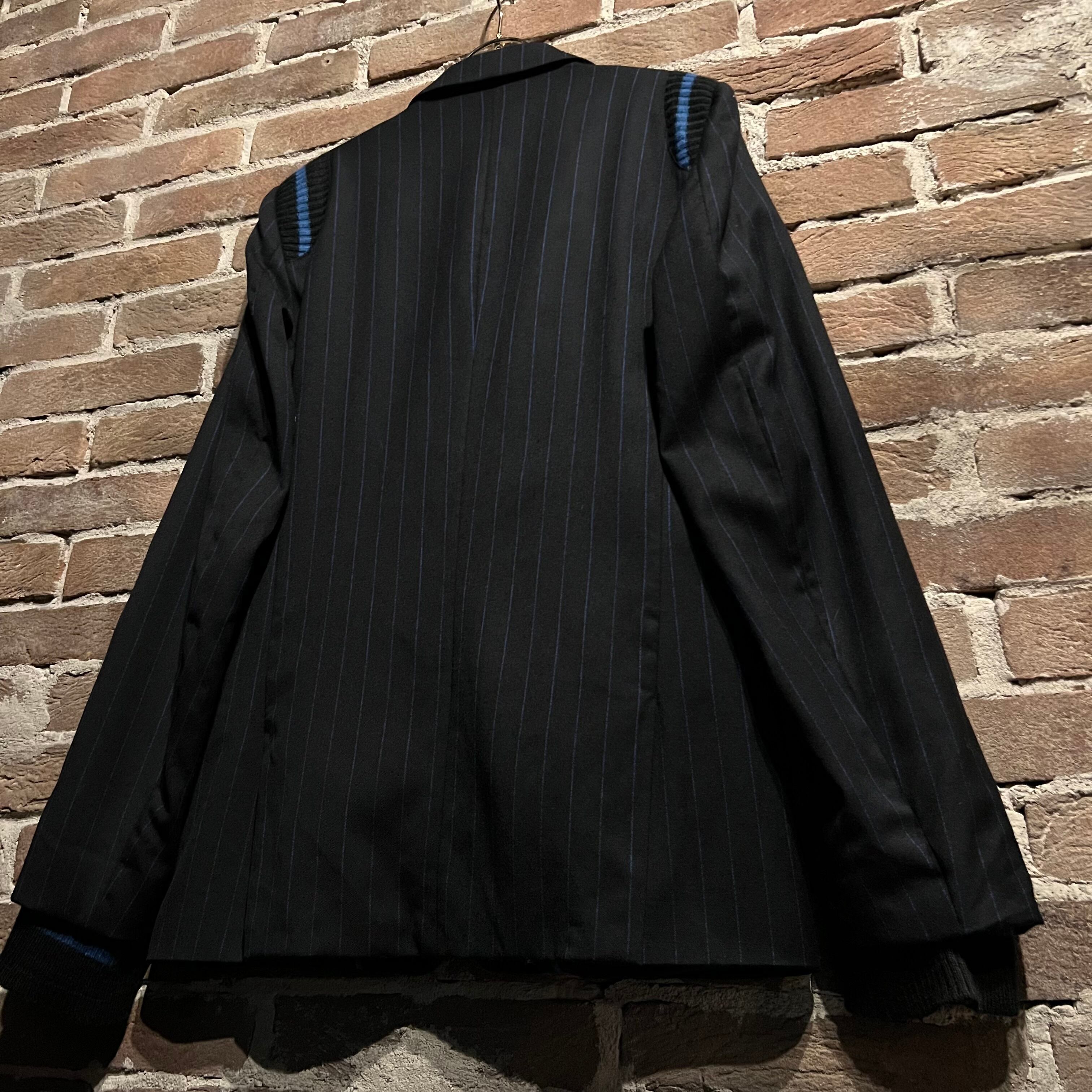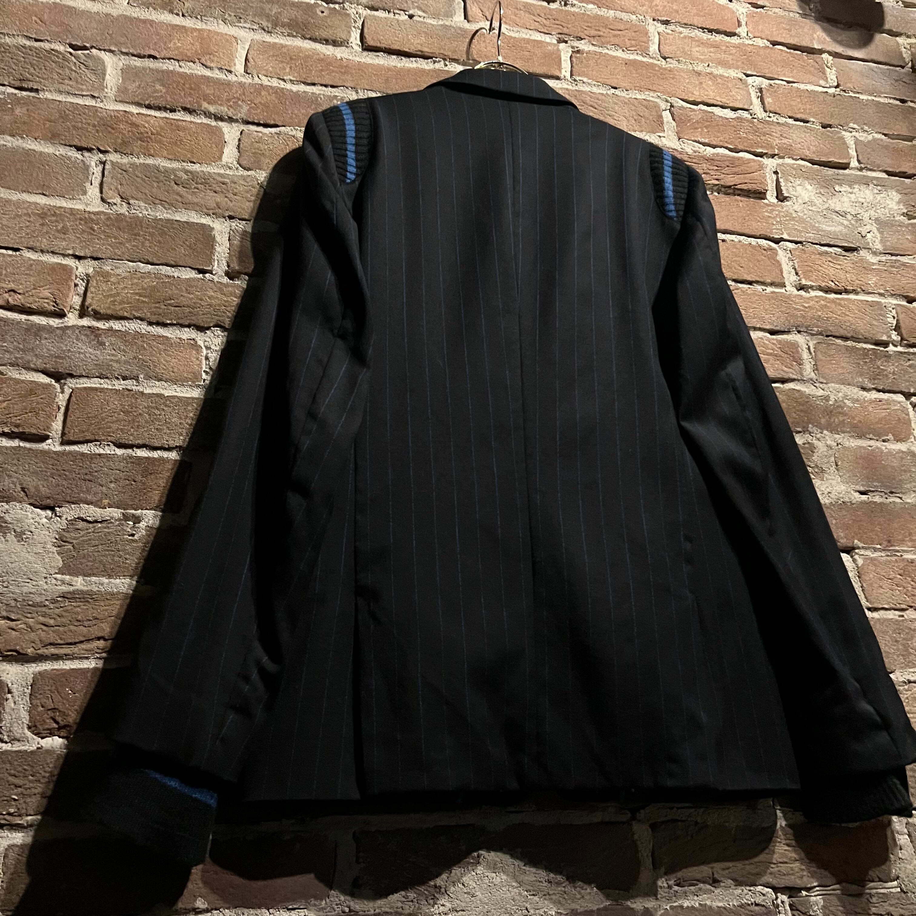 ブラックのボディにブルーのストライプを載せ、ショルダー部分にニット素材を切り替えたテーラードジャケット。カチッとしたアイテムながら異素材で遊びを効かせるデザインセンスに服好きの心掴まれす。