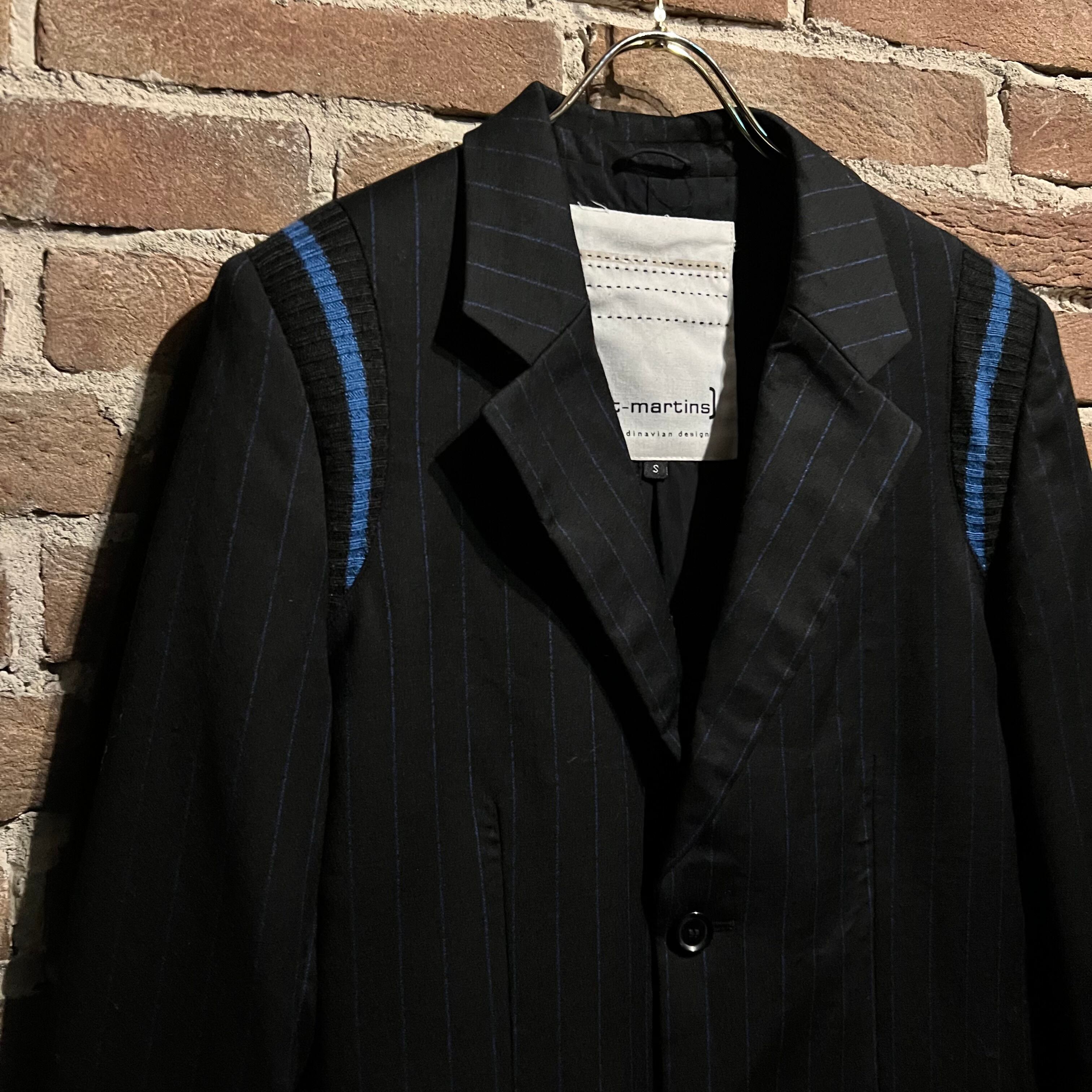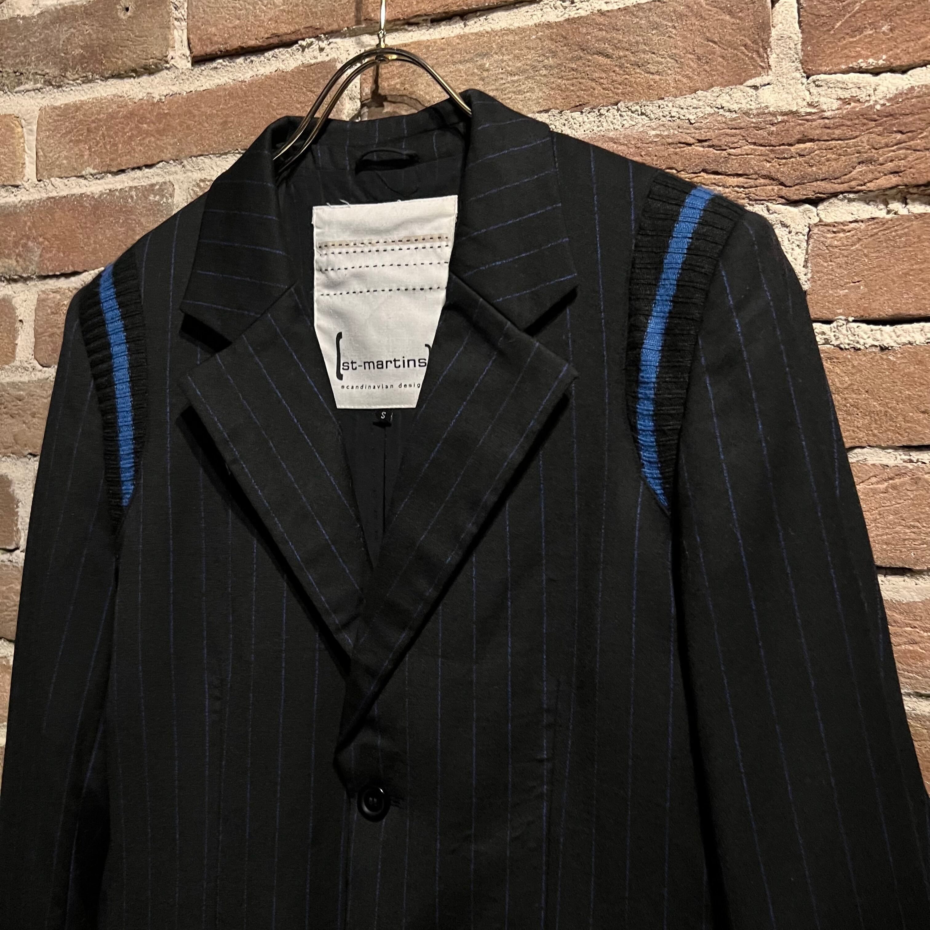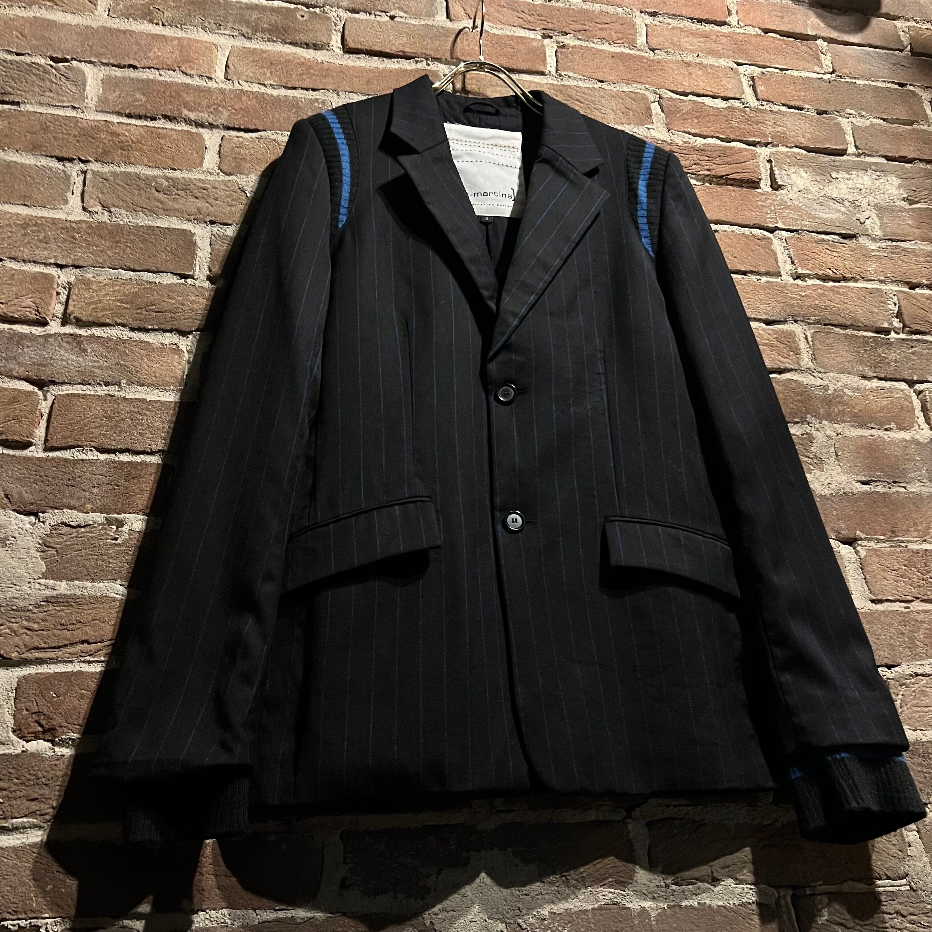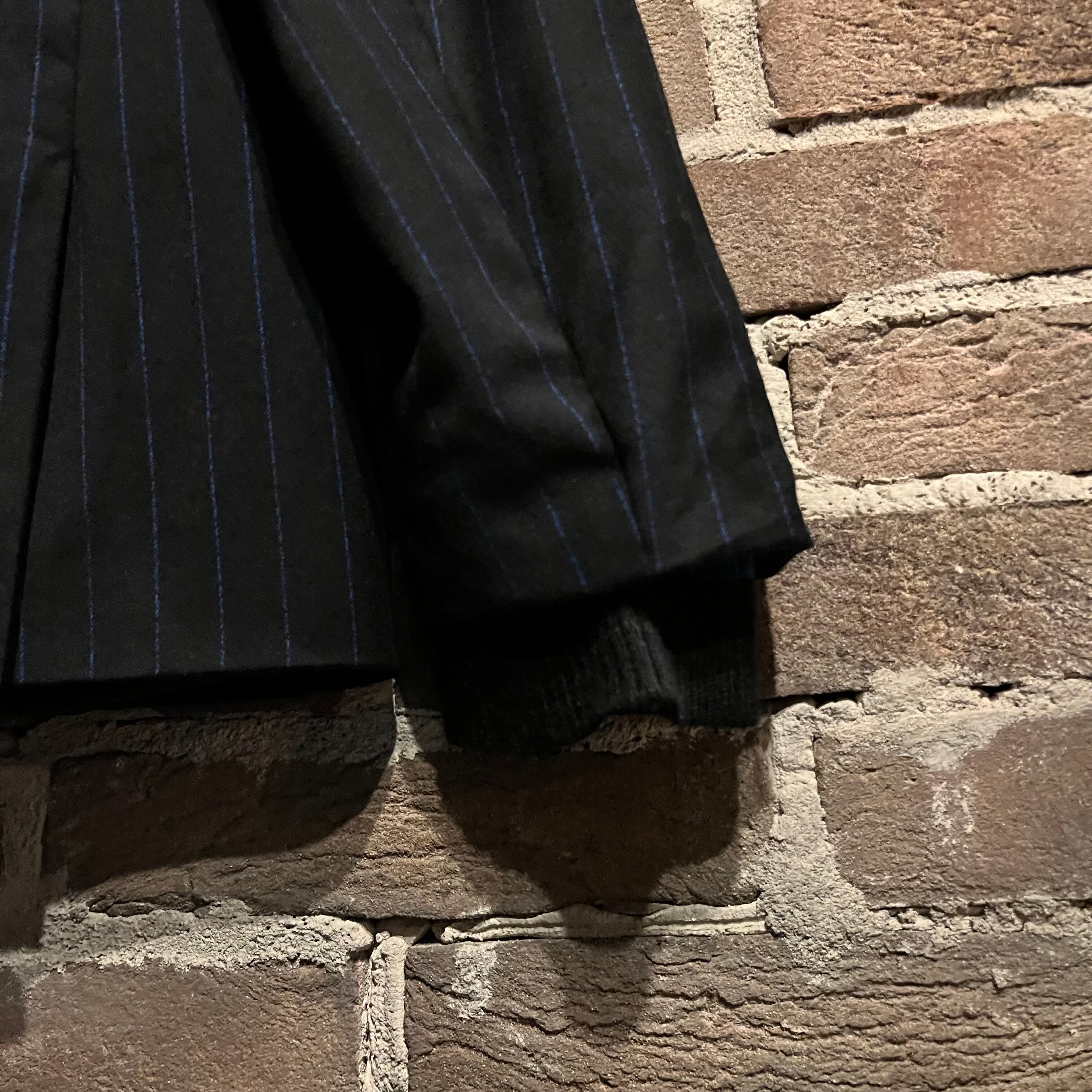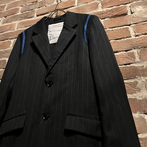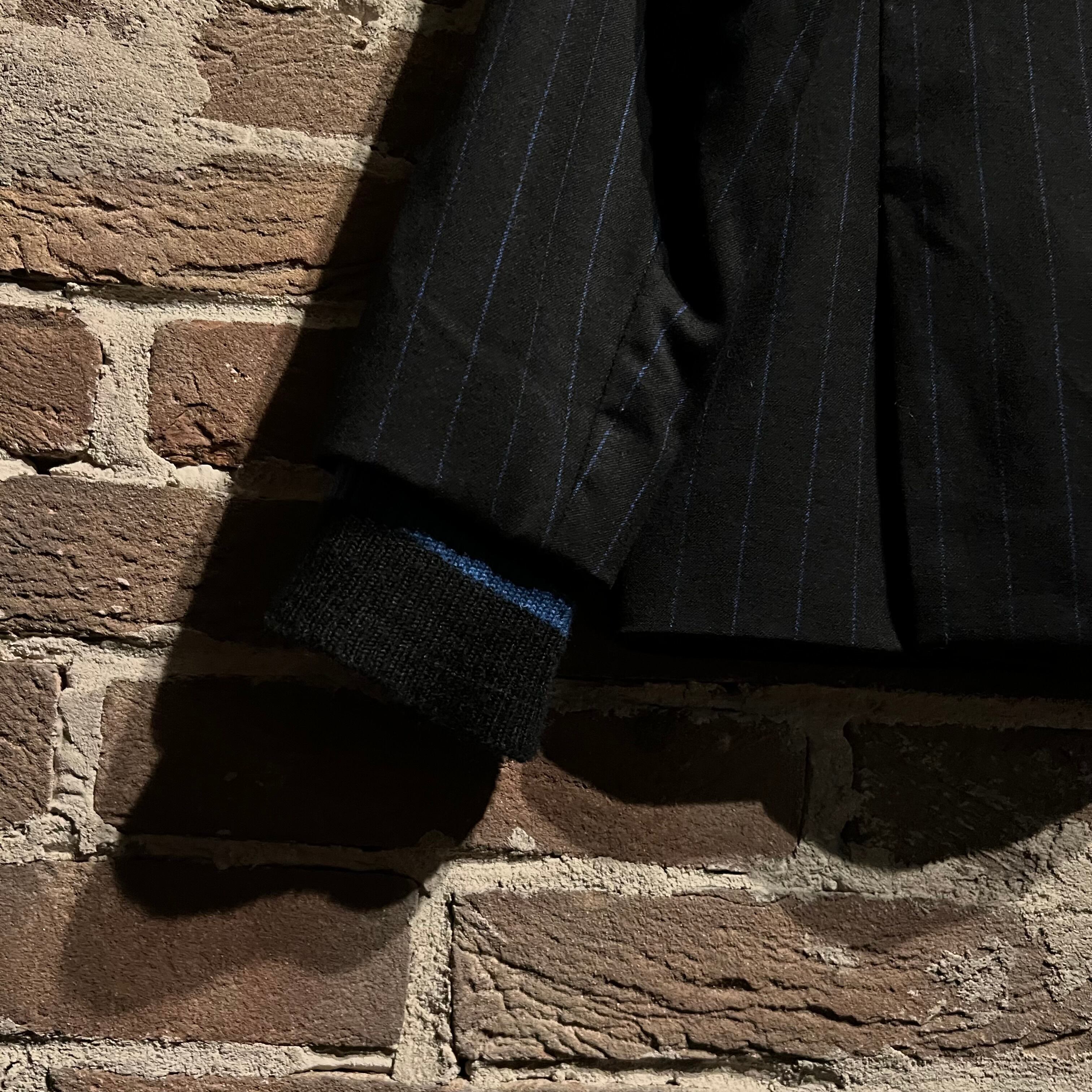 ブラックのボディにブルーのストライプを載せ、ショルダー部分にニット素材を切り替えたテーラードジャケット。カチッとしたアイテムながら異素材で遊びを効かせるデザインセンスに服好きの心掴まれす。