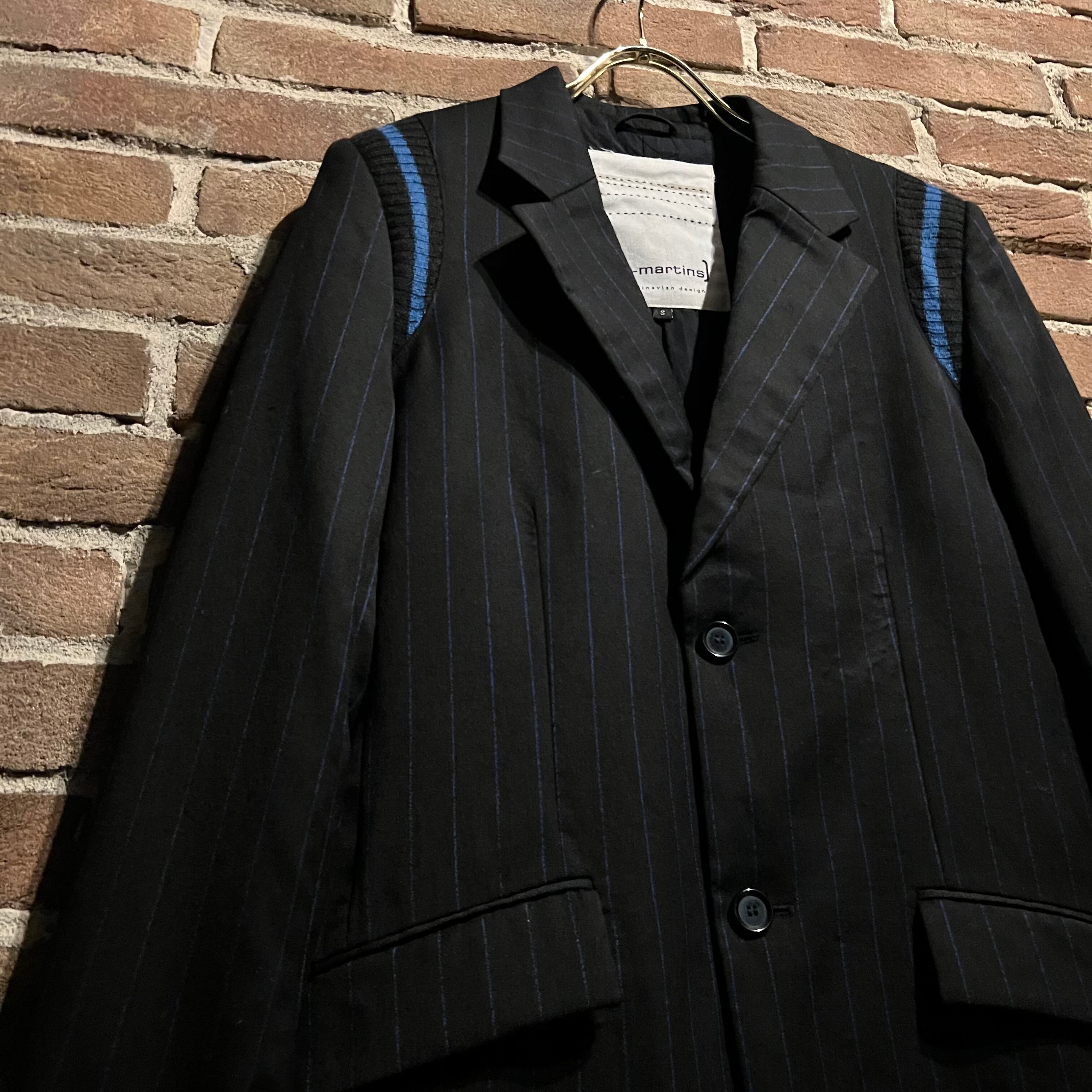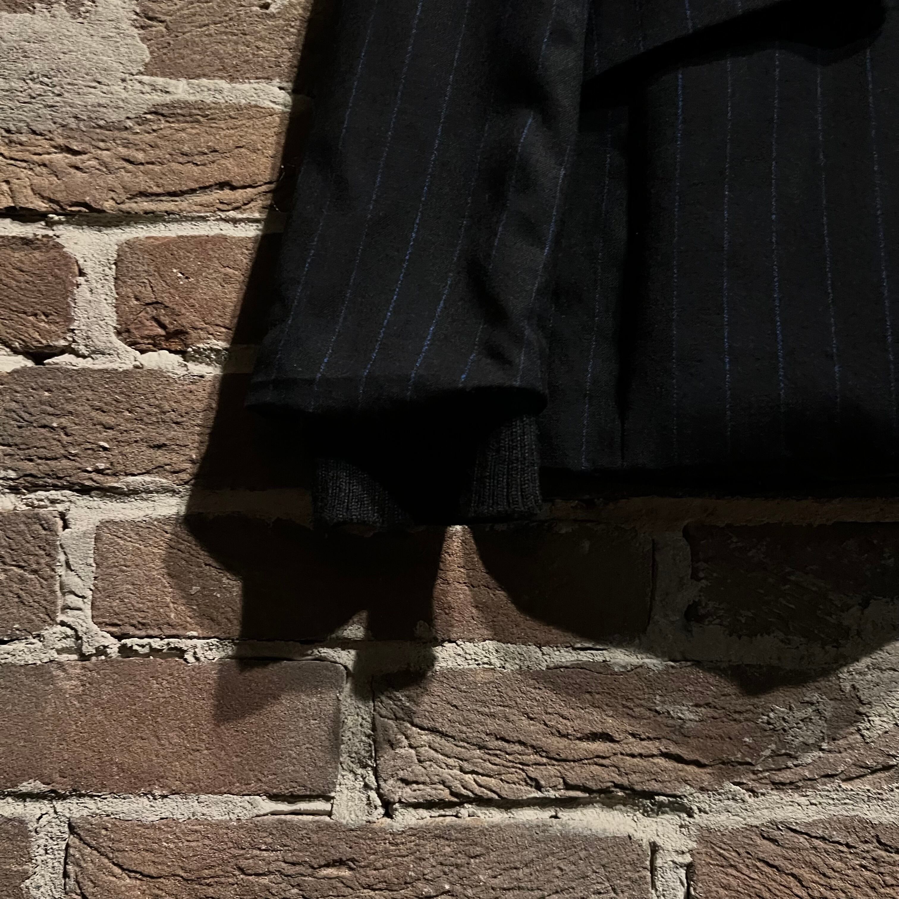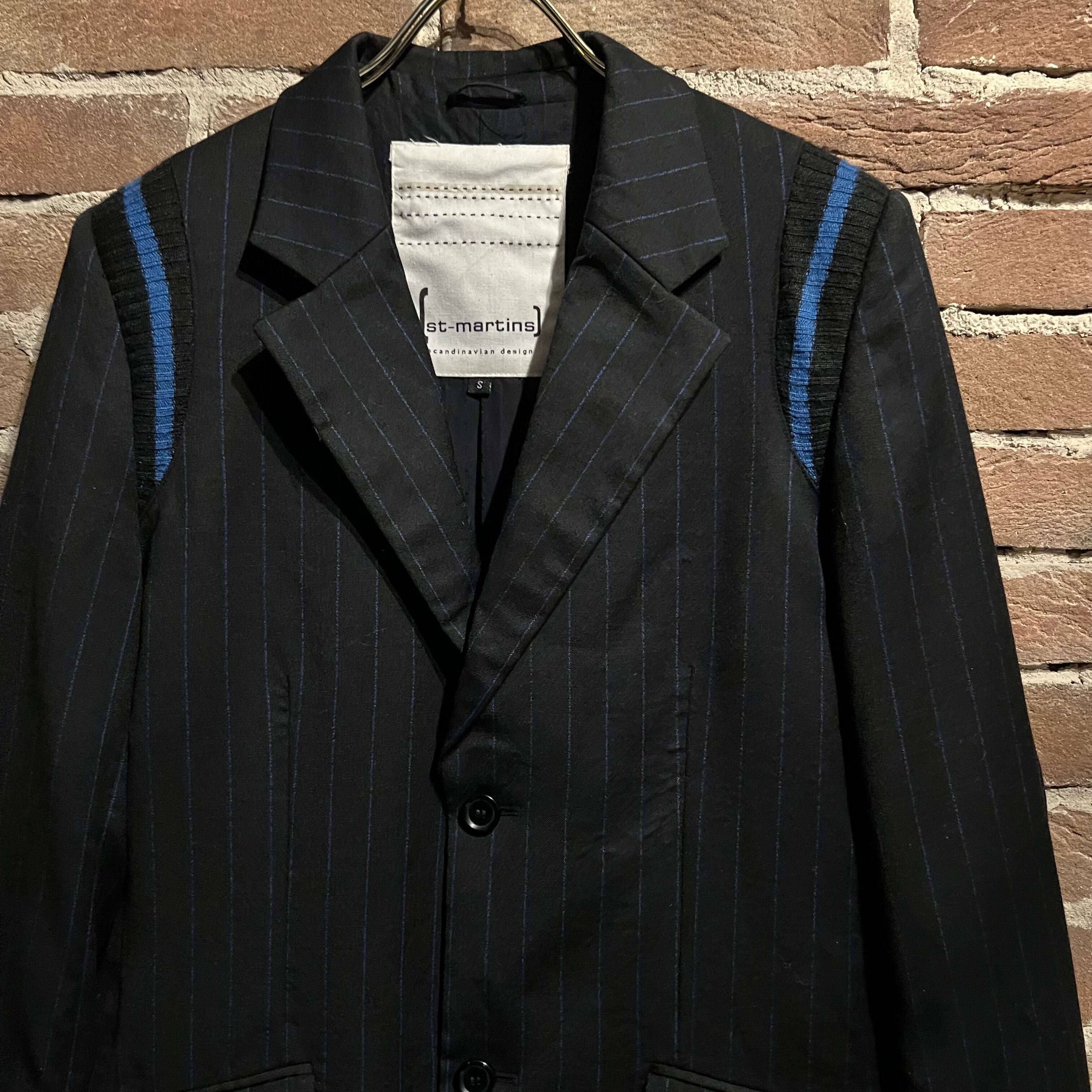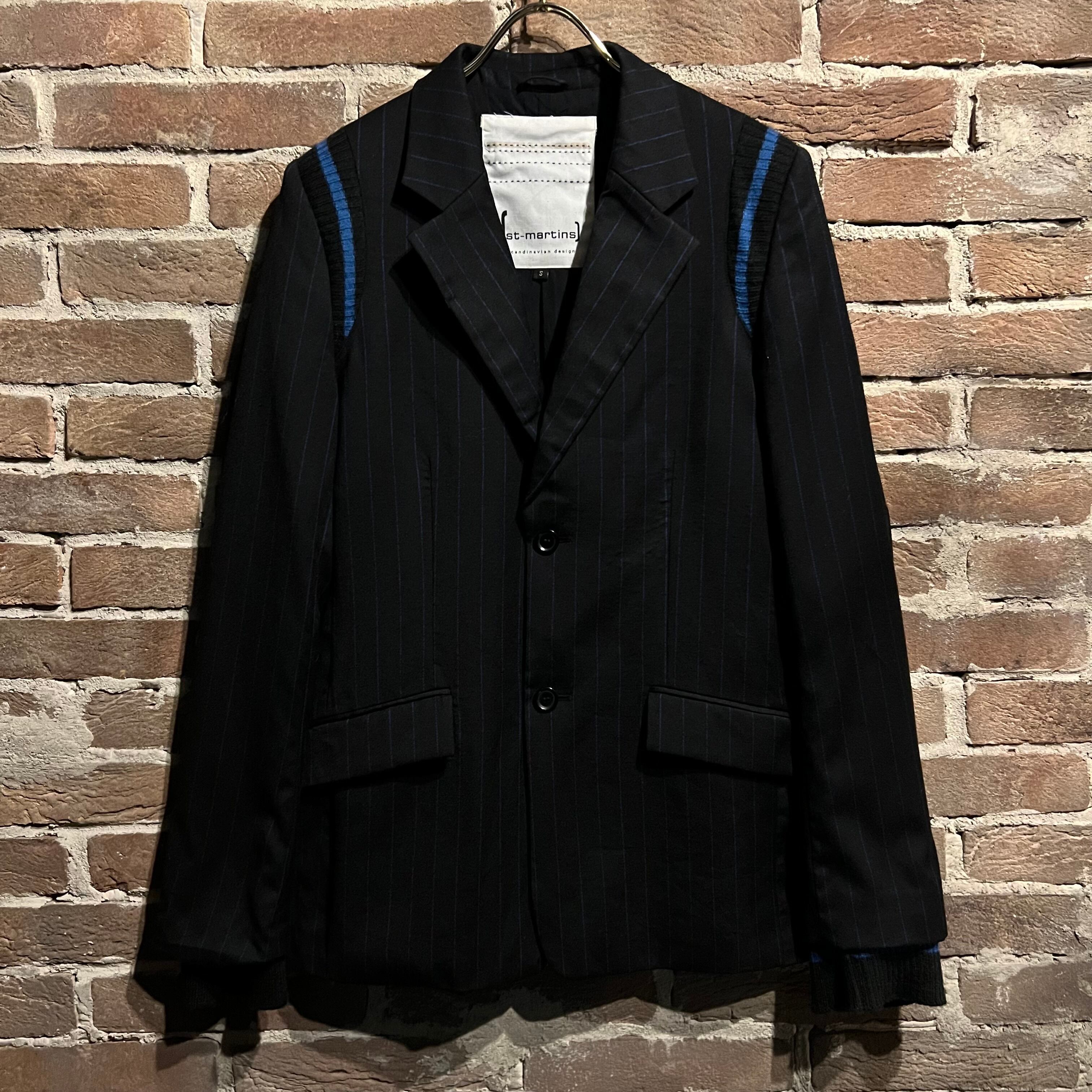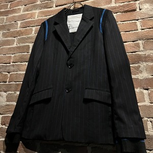 ブラックのボディにブルーのストライプを載せ、ショルダー部分にニット素材を切り替えたテーラードジャケット。カチッとしたアイテムながら異素材で遊びを効かせるデザインセンスに服好きの心掴まれす。