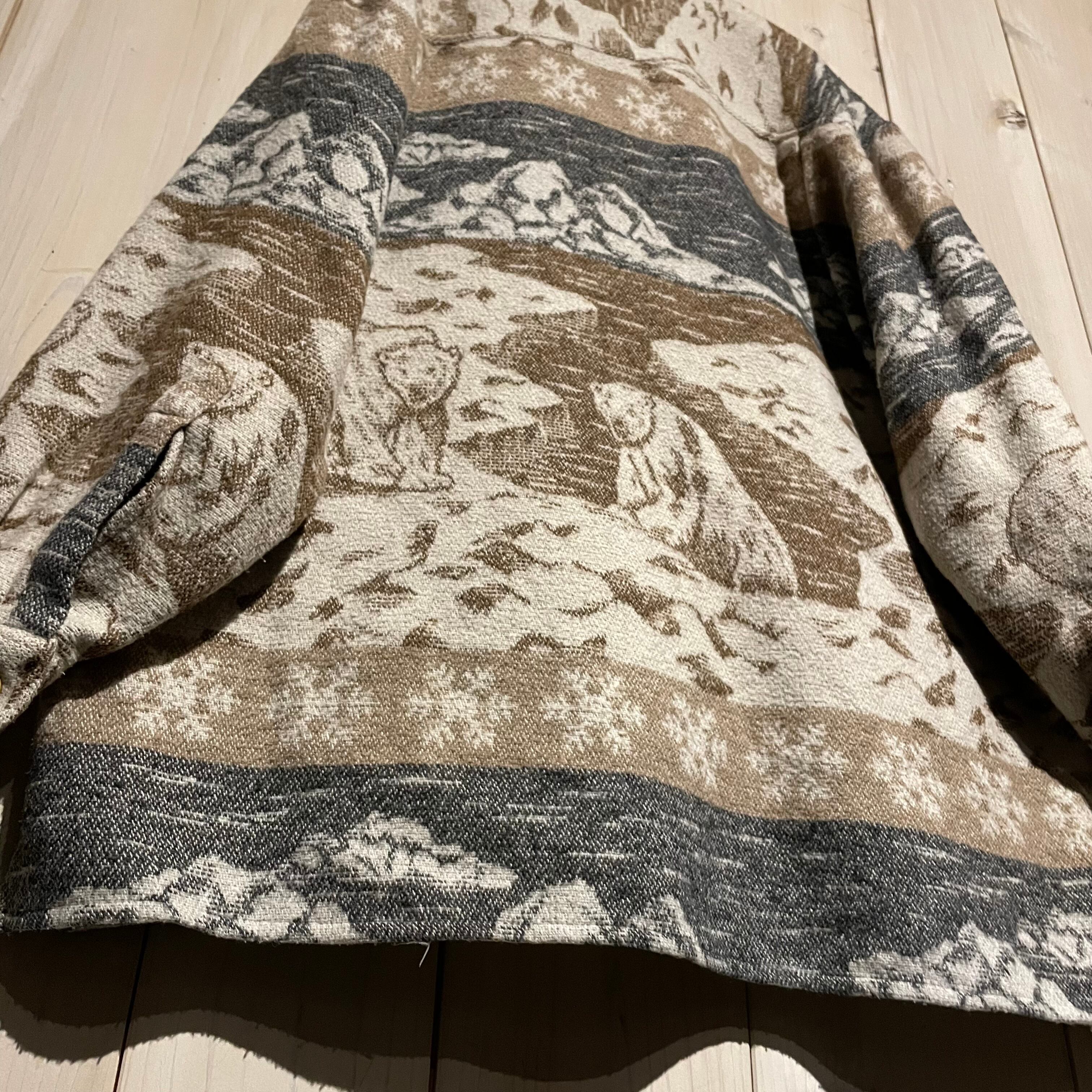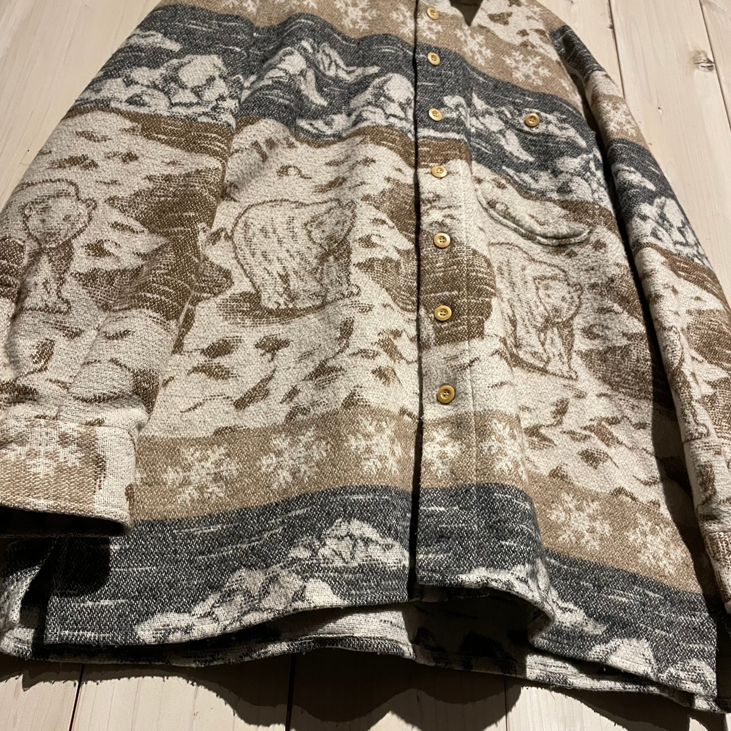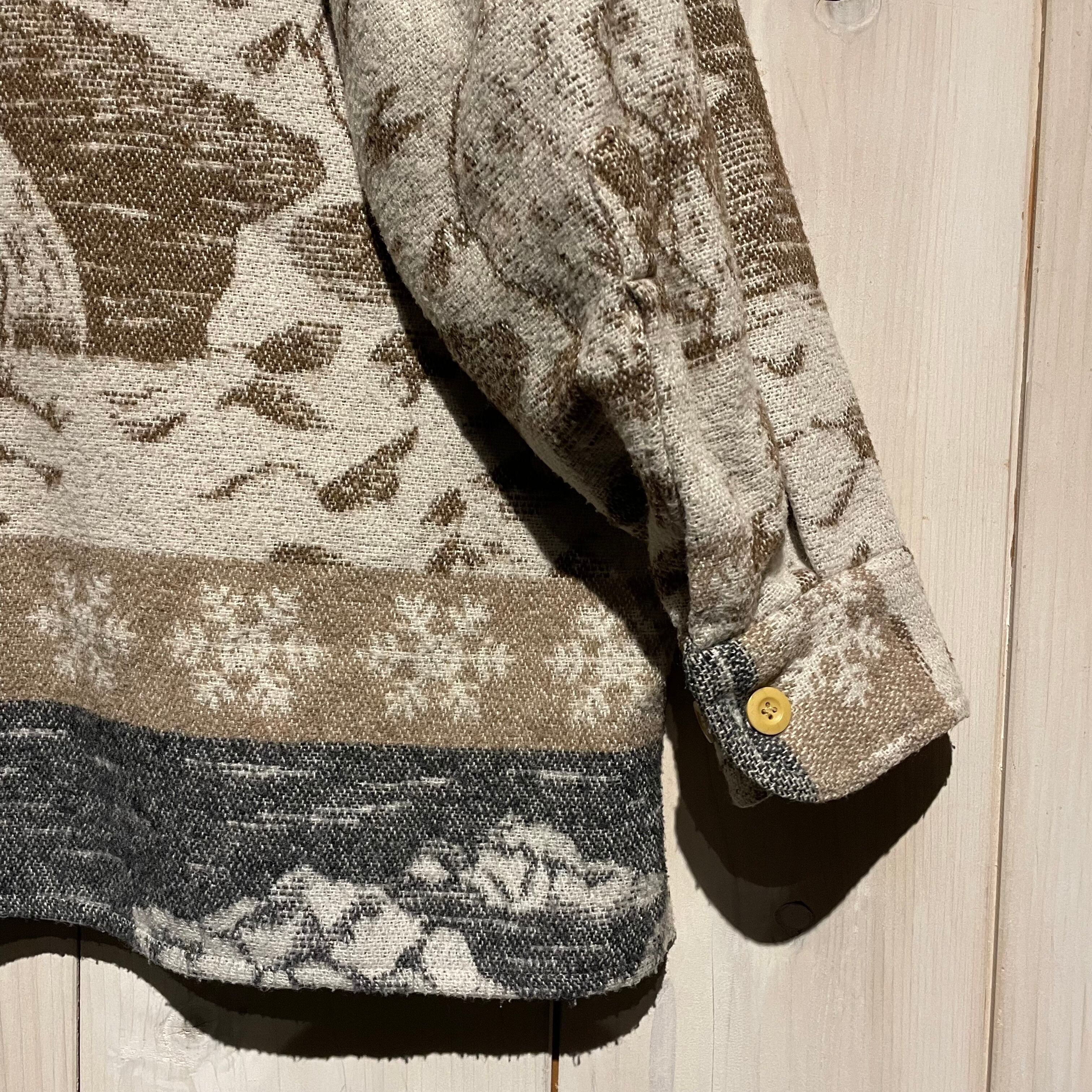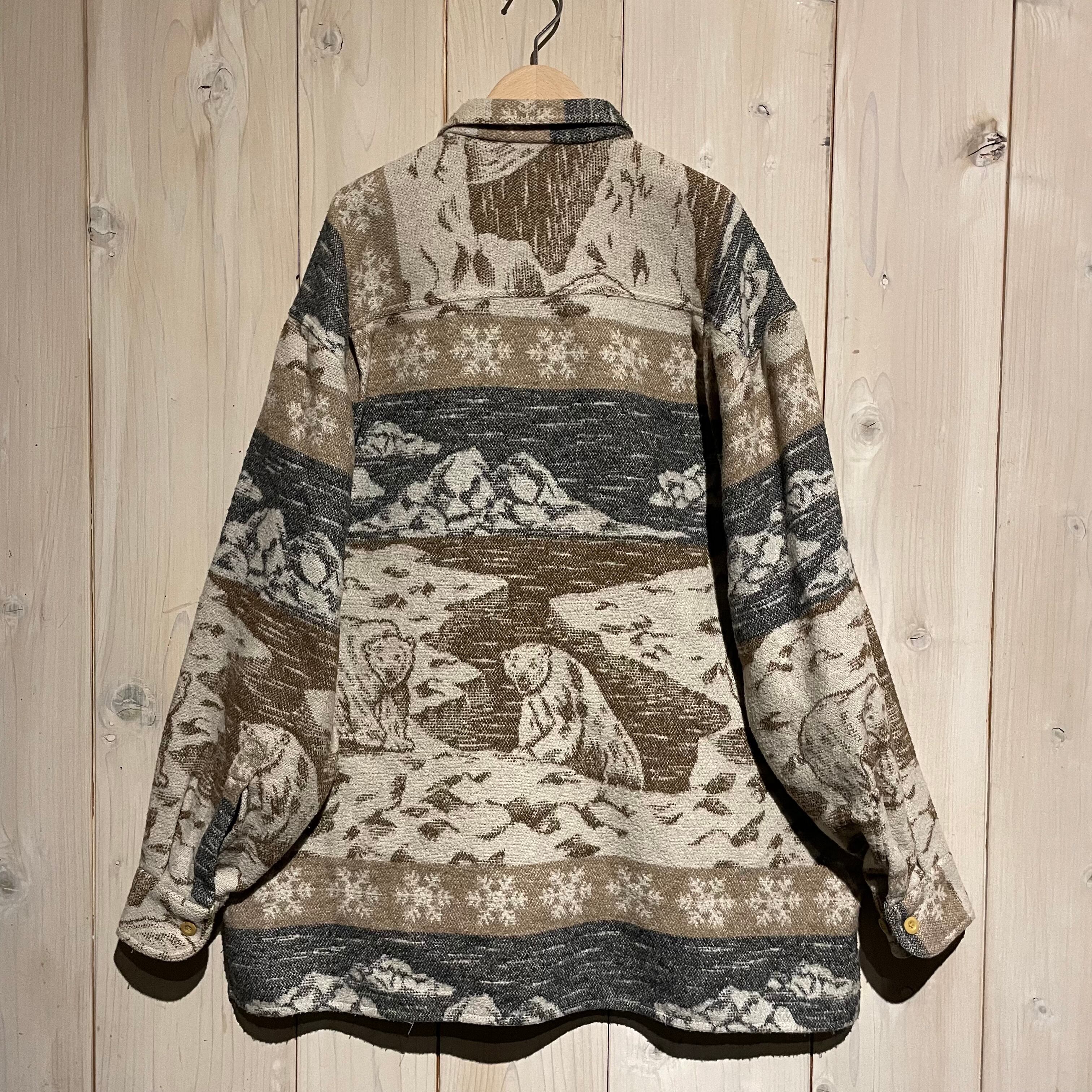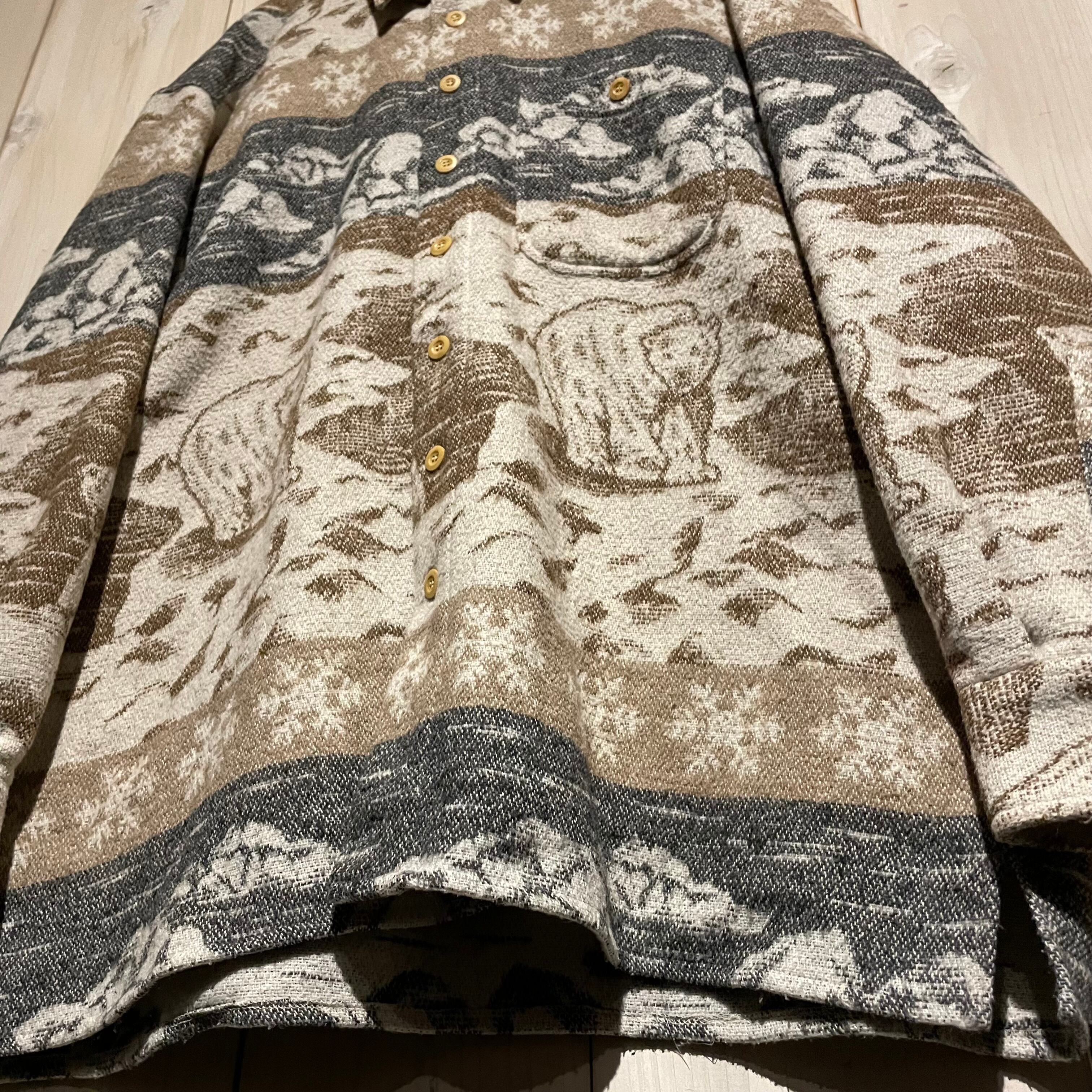 フワッと柔らかく肌触りの良いニット素材に、北極熊や雪の結晶を繊細な織りで載せたニットシャツジャケット。
