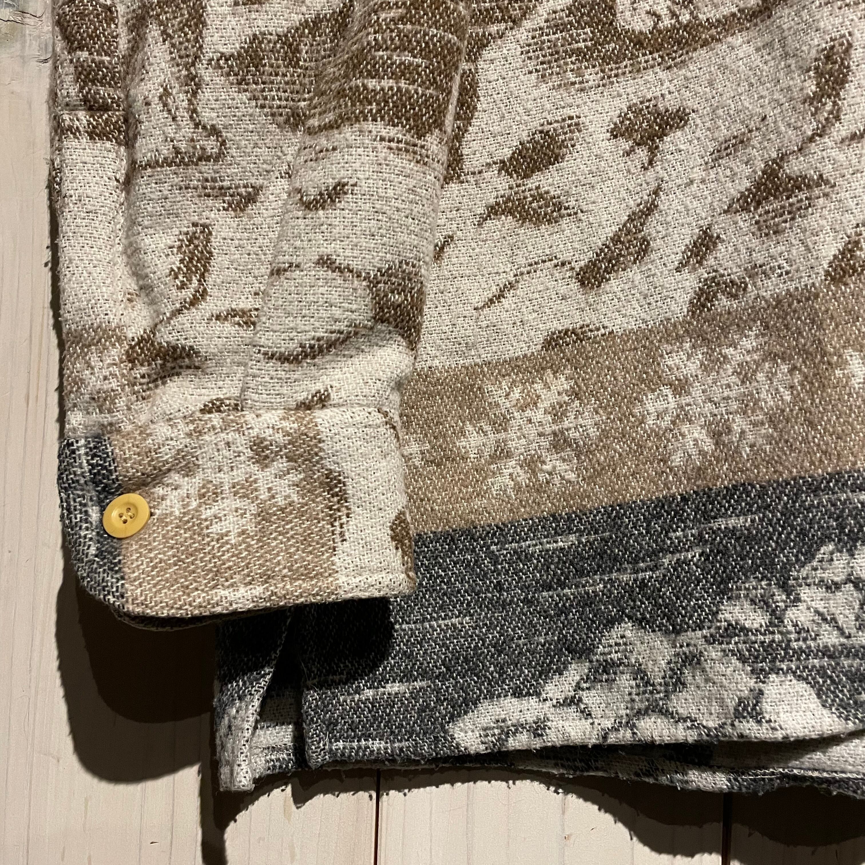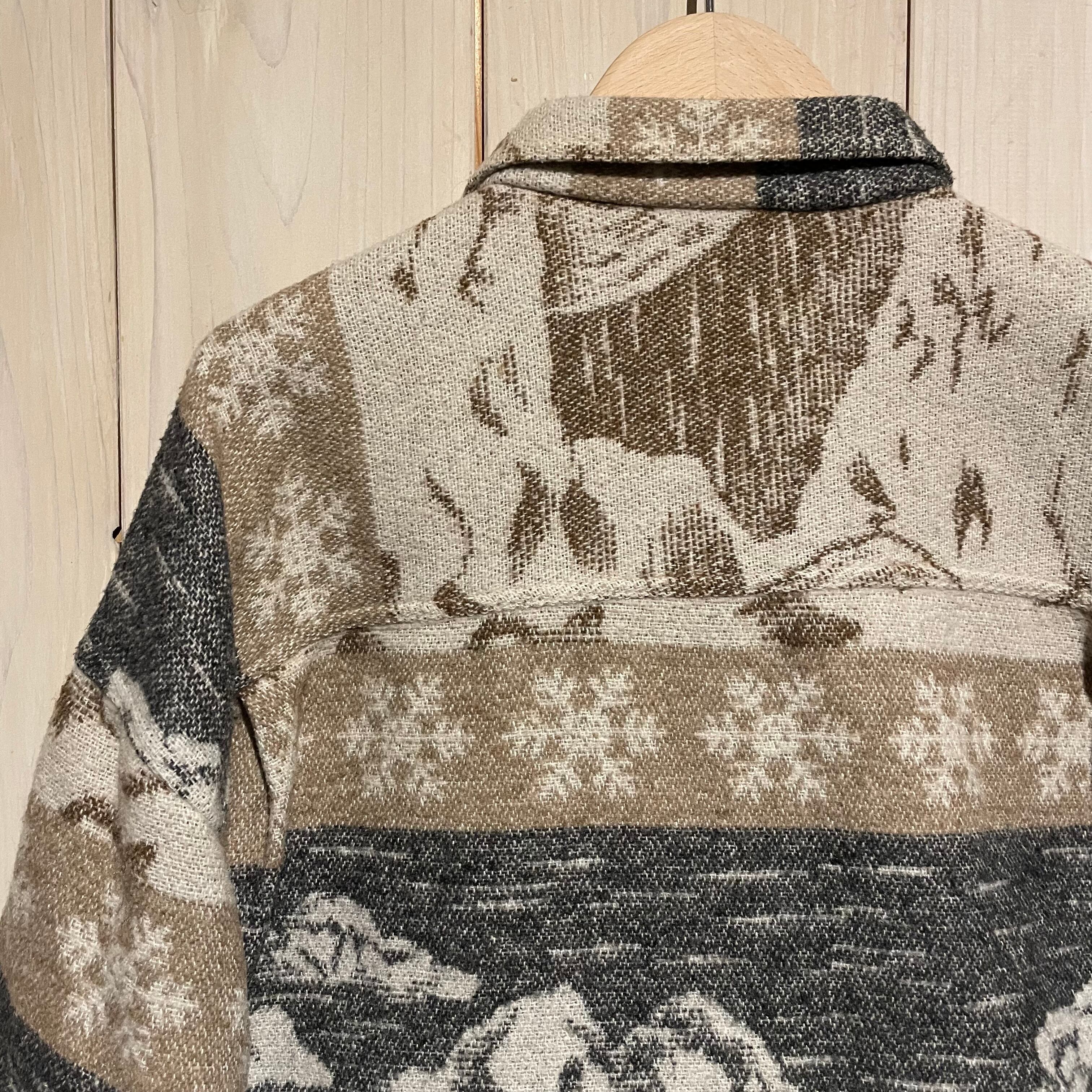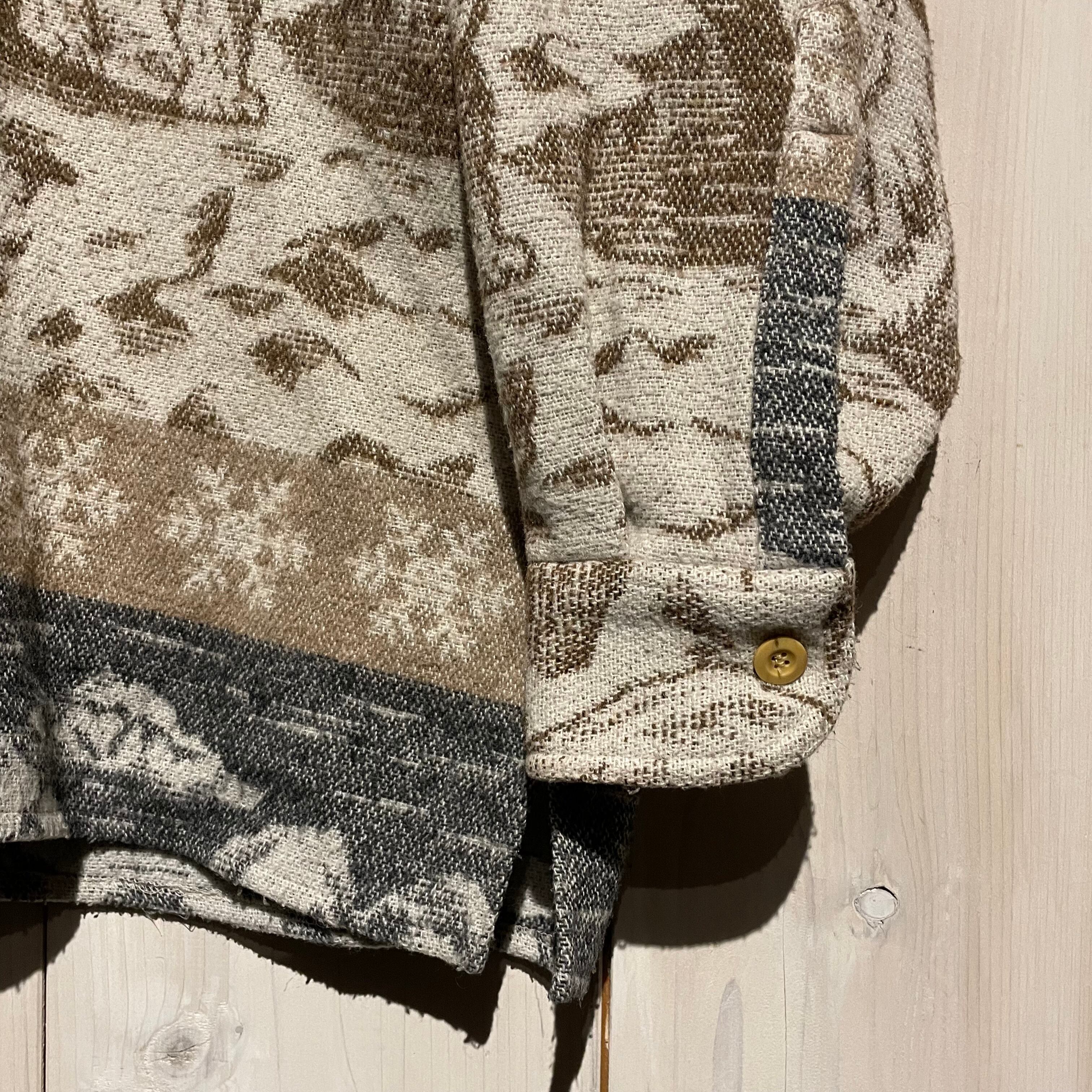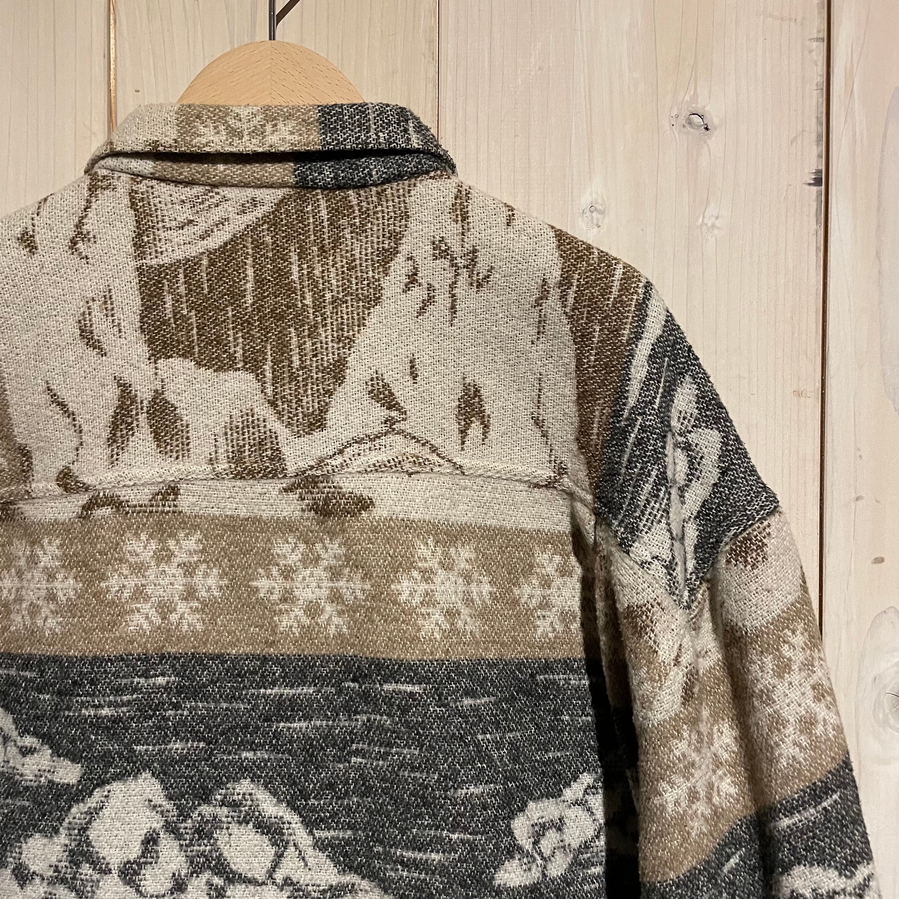 フワッと柔らかく肌触りの良いニット素材に、北極熊や雪の結晶を繊細な織りで載せたニットシャツジャケット。