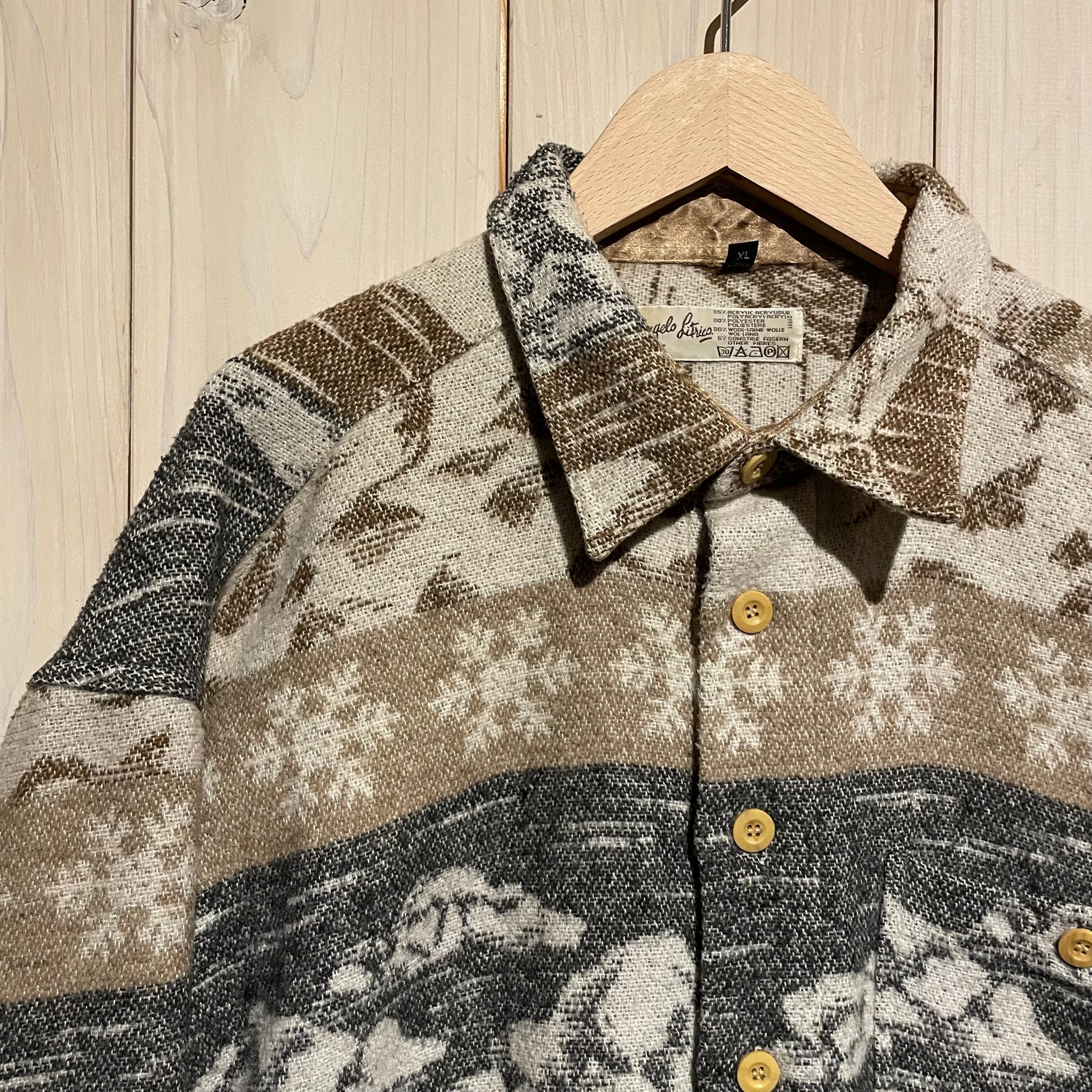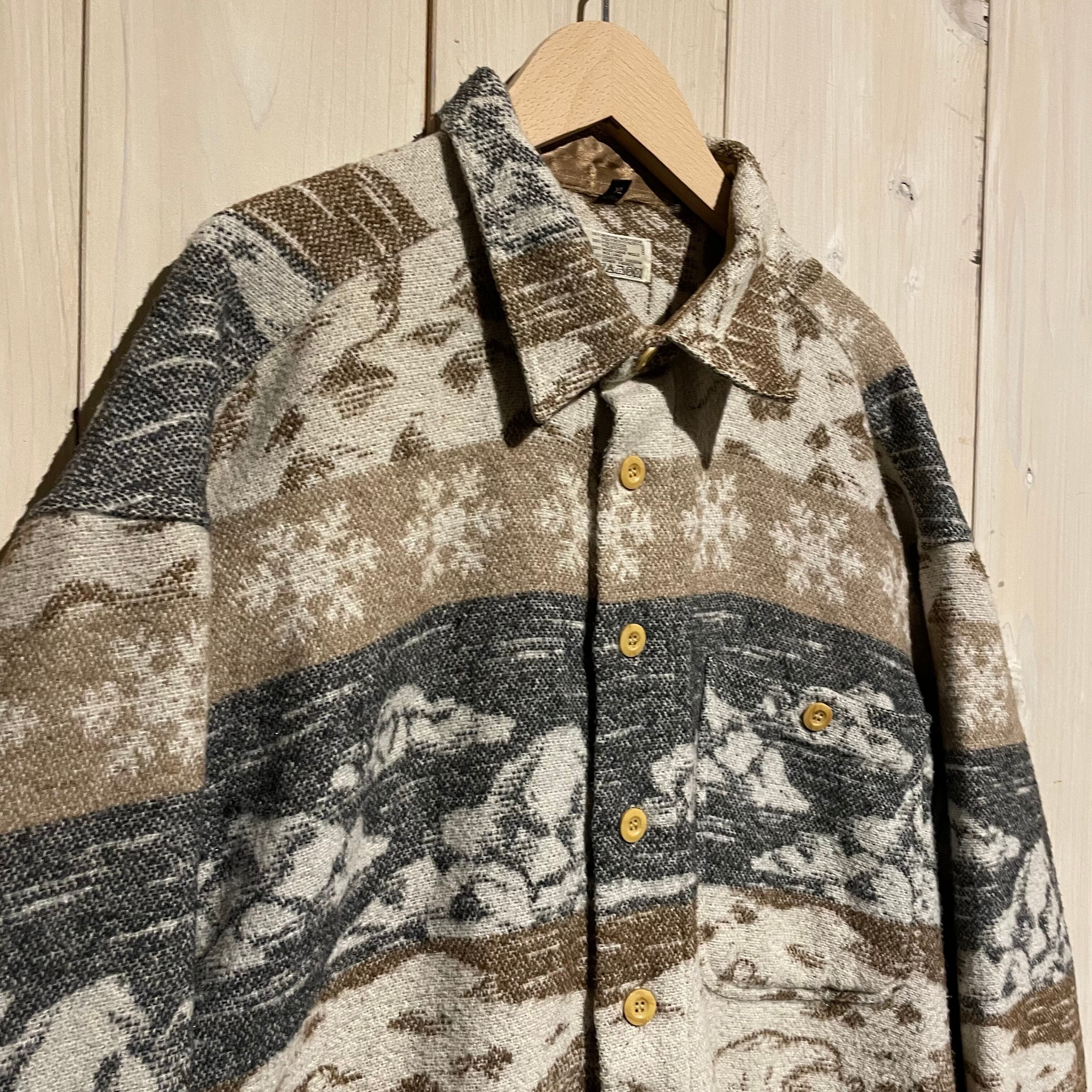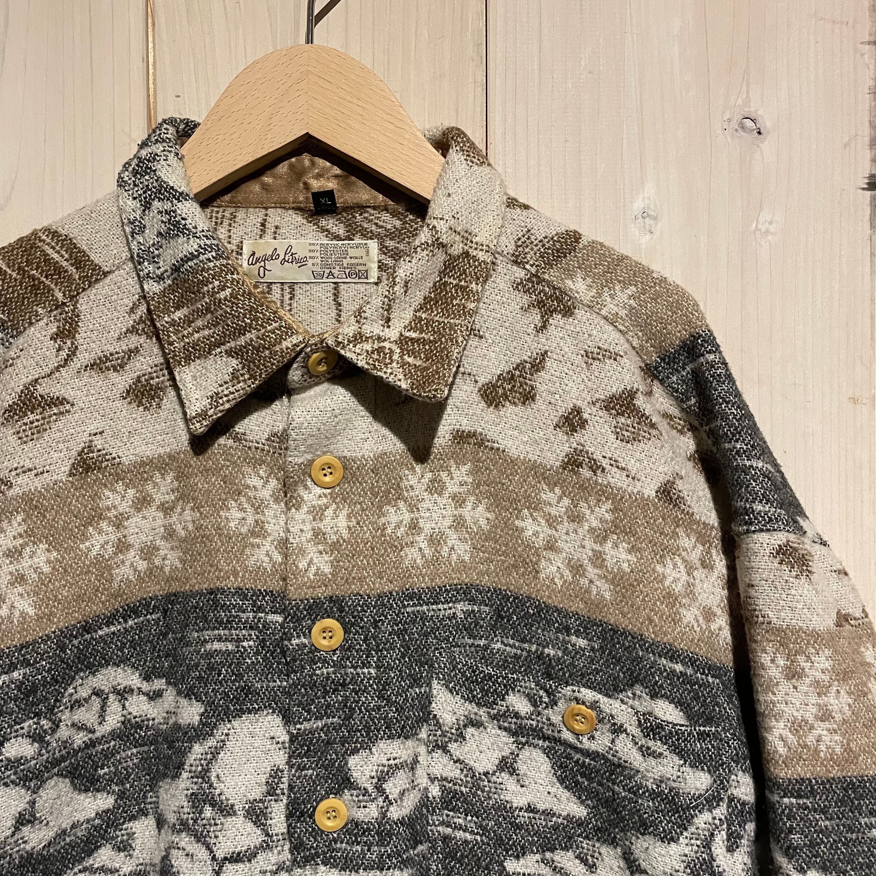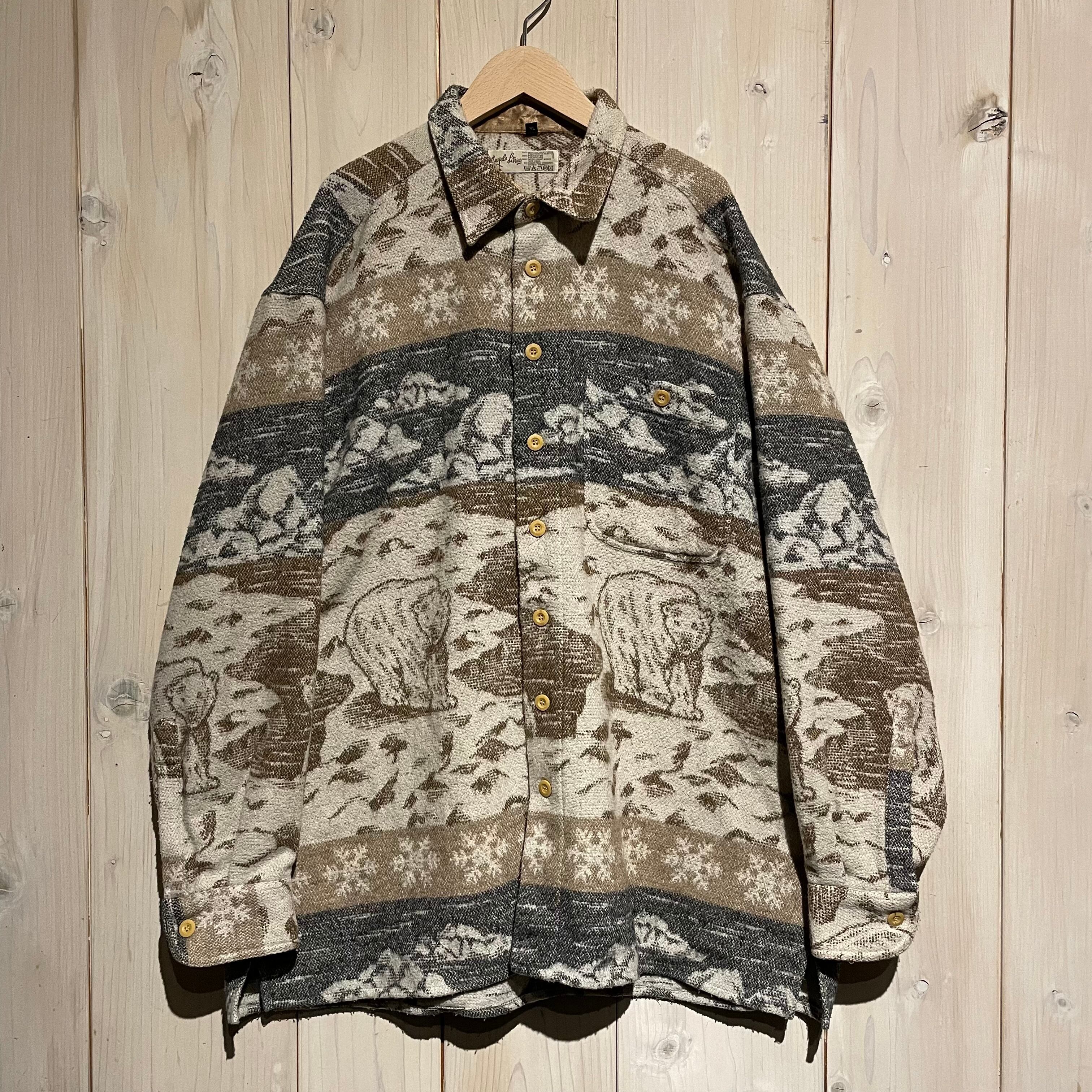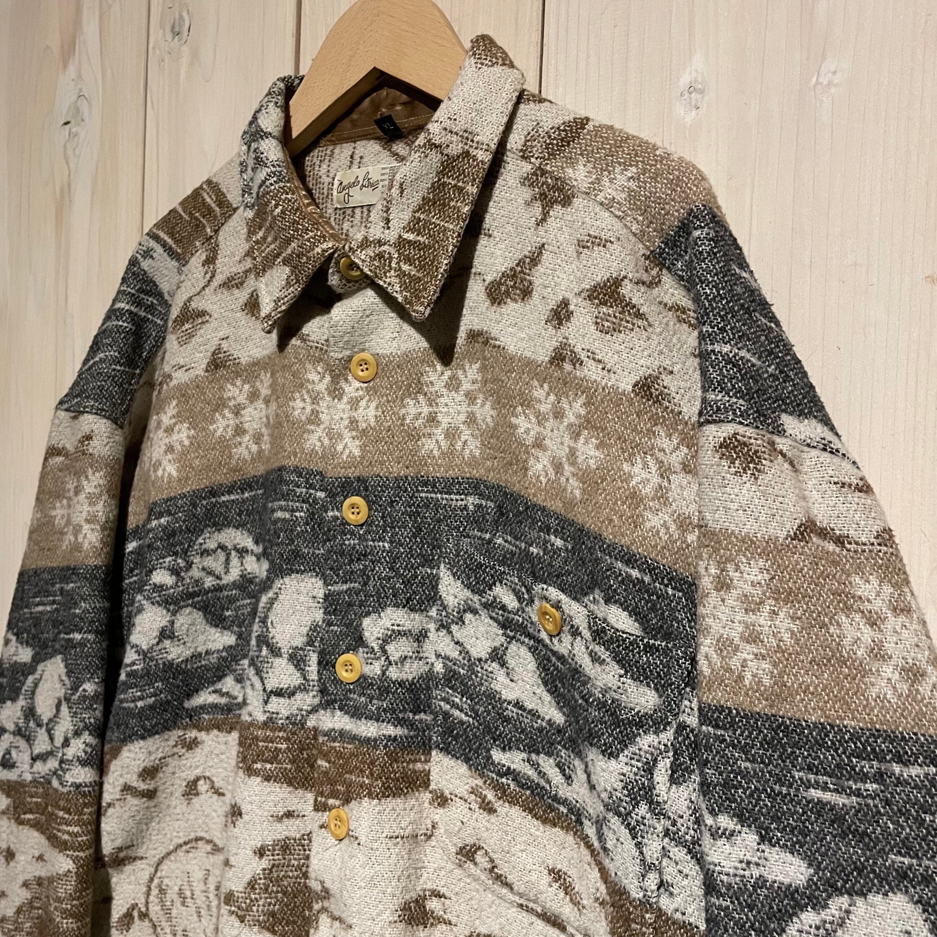 フワッと柔らかく肌触りの良いニット素材に、北極熊や雪の結晶を繊細な織りで載せたニットシャツジャケット。