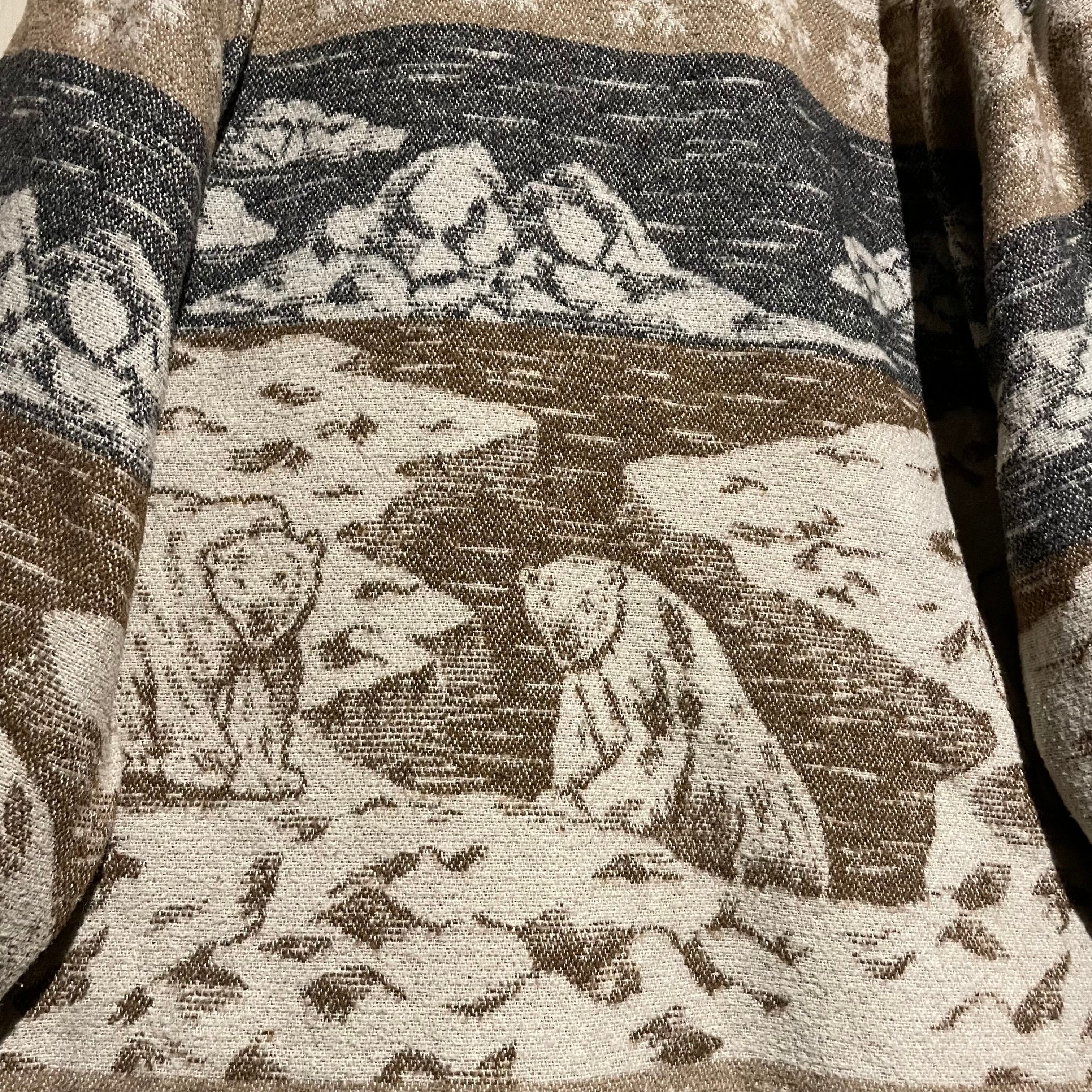 流氷の上に佇む北極熊など寒い北極を肌で感じられるようなデザインですが、温かみのあるニッティングによって表現された事でデイリーユースにお使い頂けます。