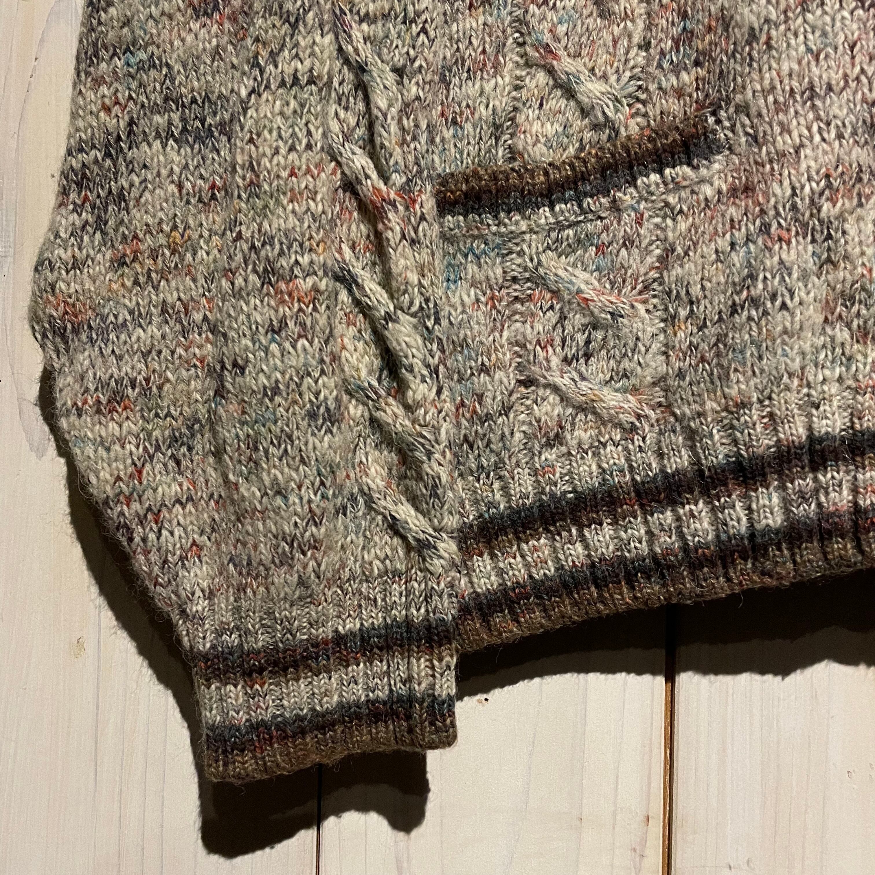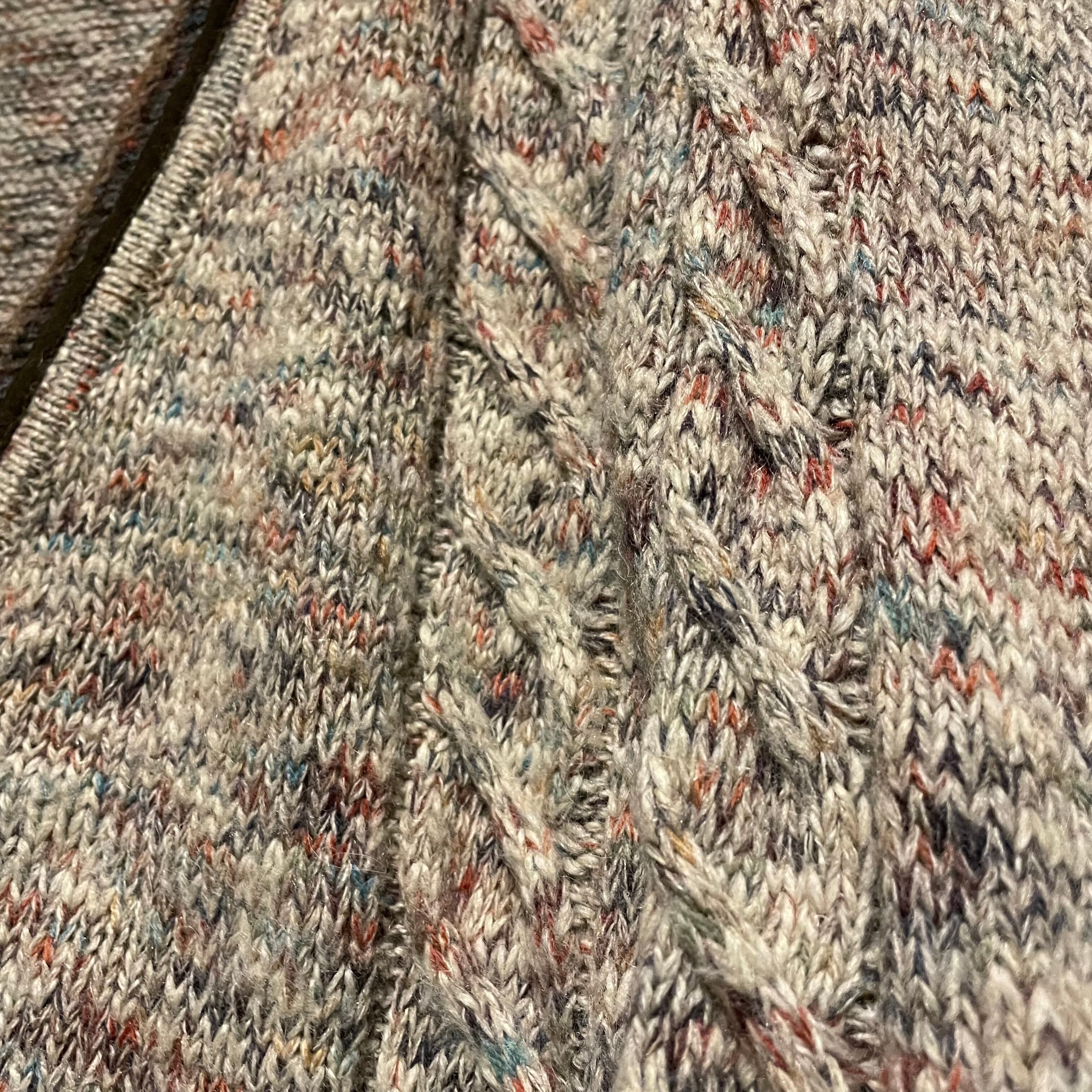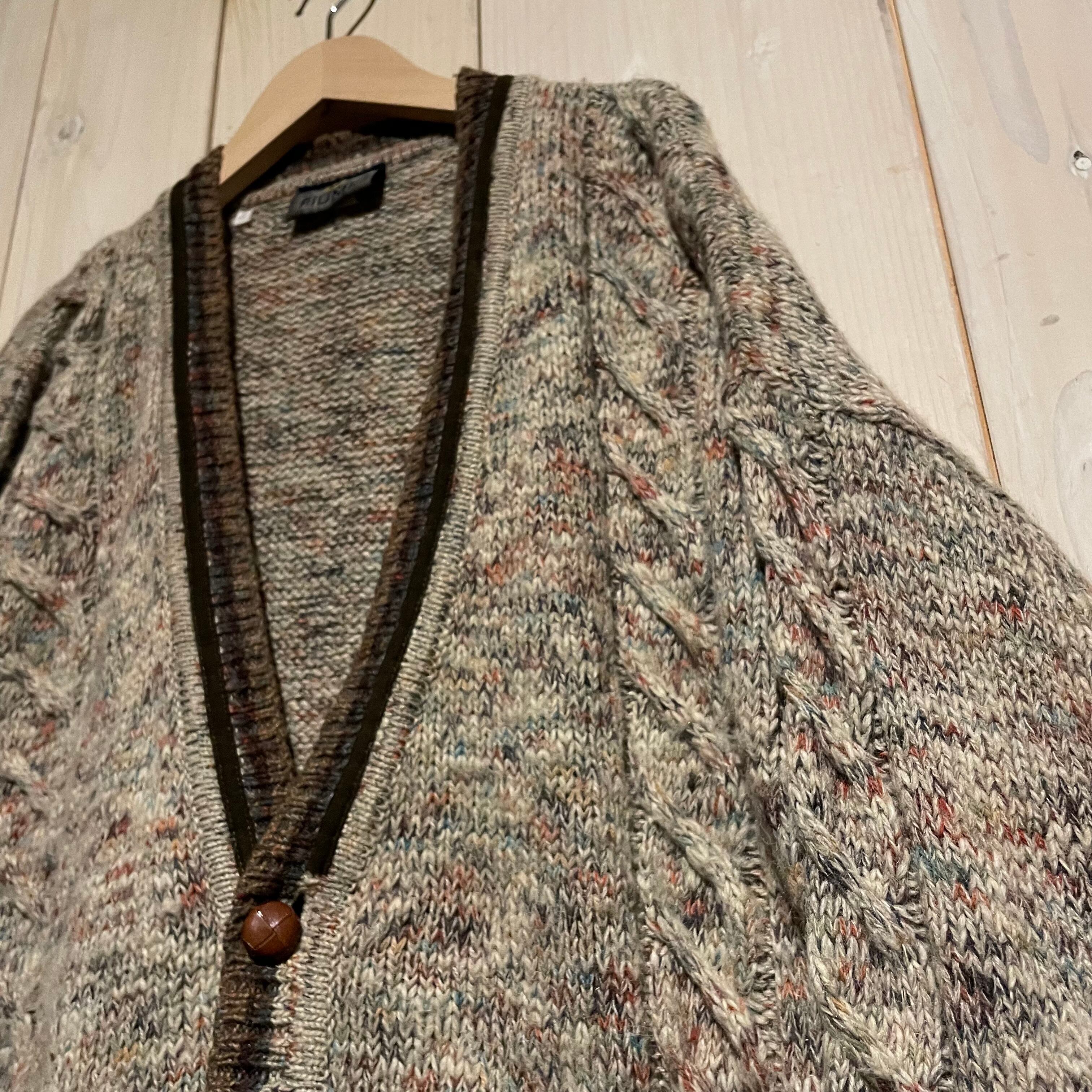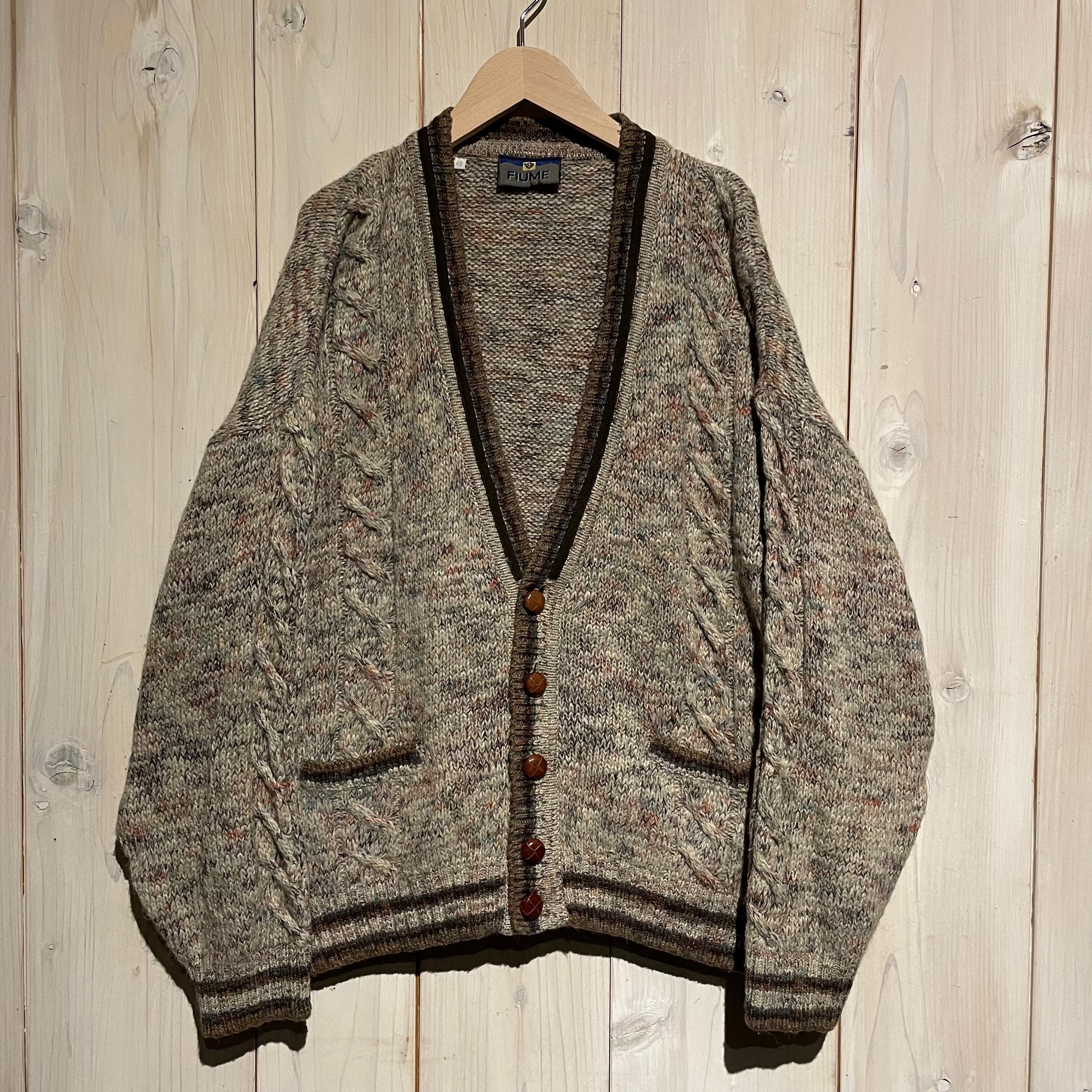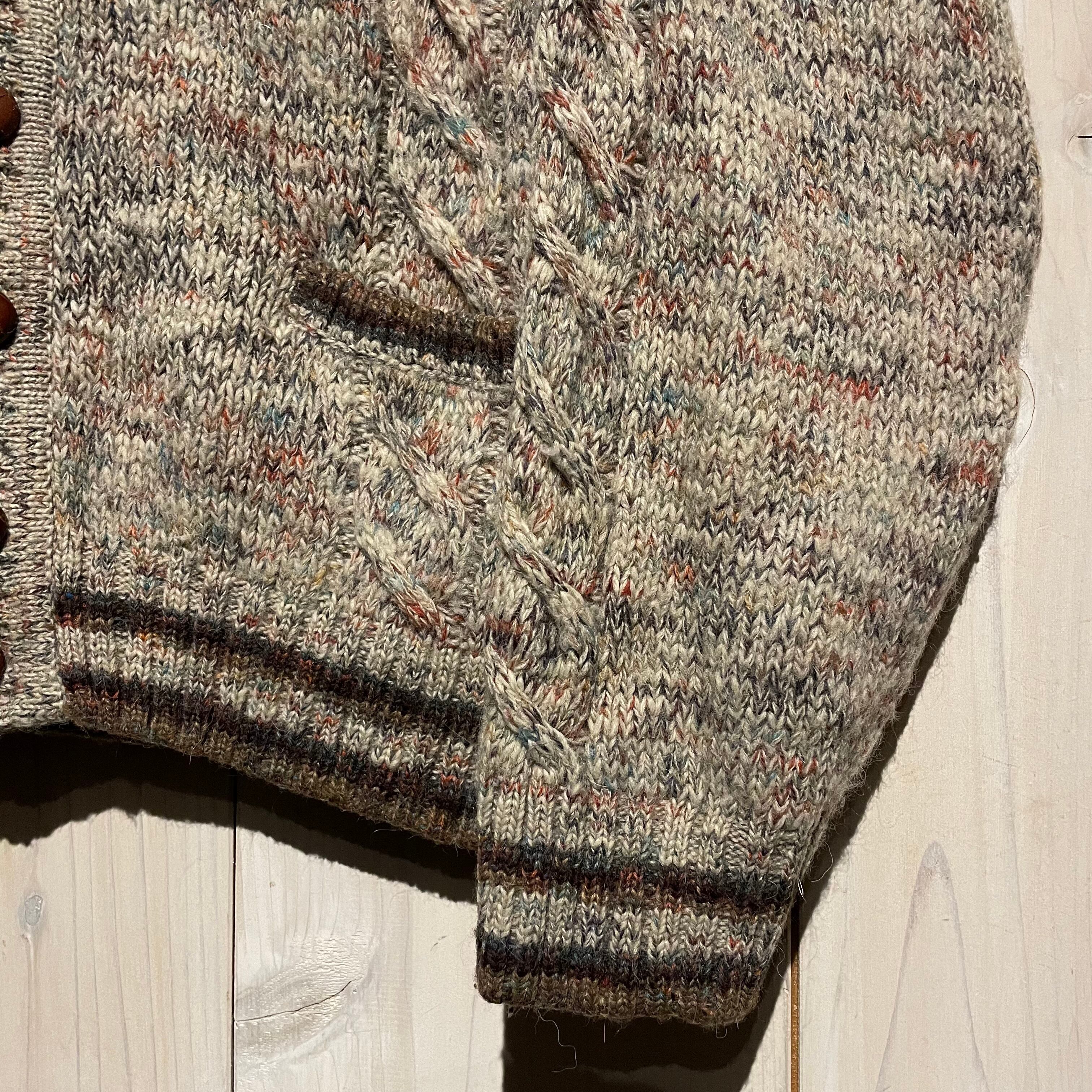 縄のように立体的に編み込んだケーブル編みや、2色以上の霜降り糸を使用したメランジを組み合わせ、デザインバランスに長けたイタリアメイドのニットカーディガン。