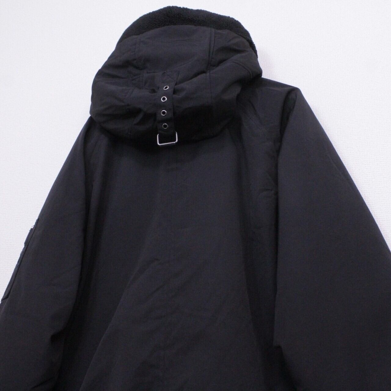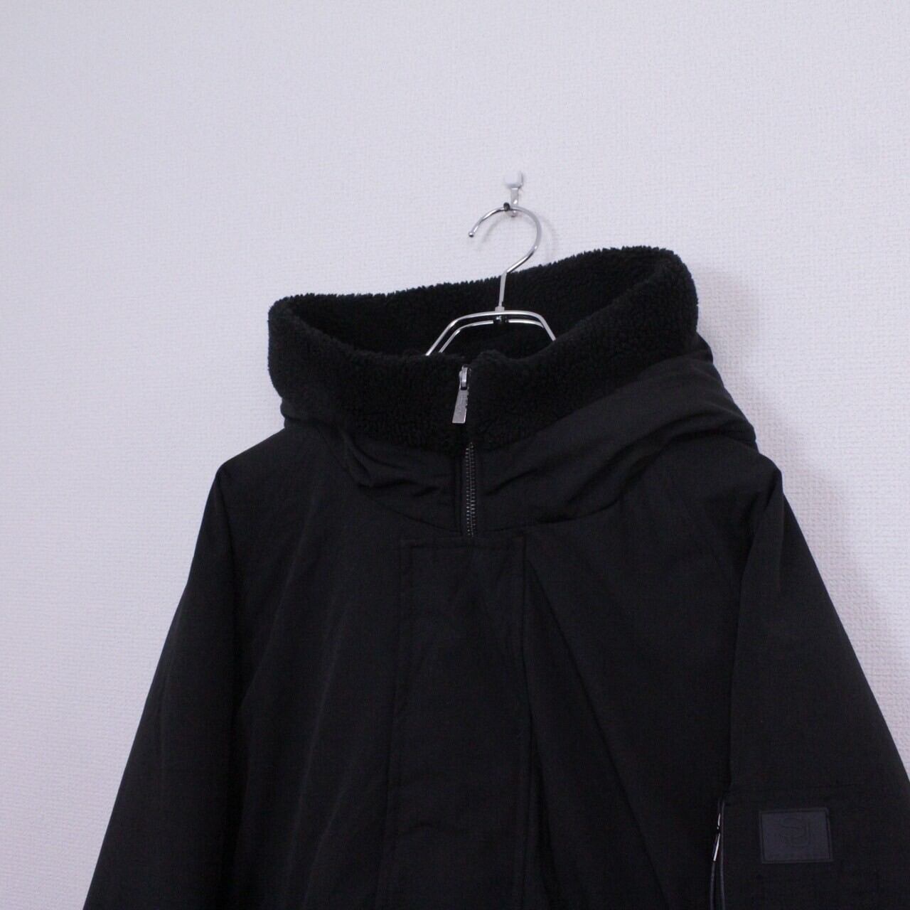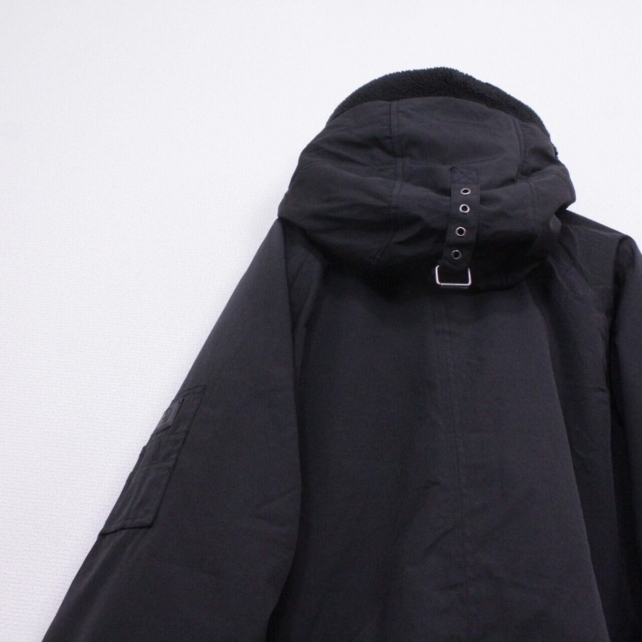 オールブラックのボディに、ミリタリーモチーフのギミックを載せたパデットジャケット。左アームにはシガーポケットにフードにはベルトを装備。