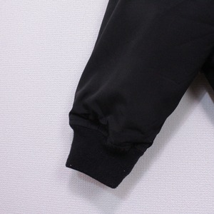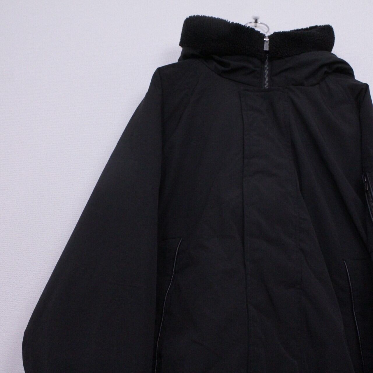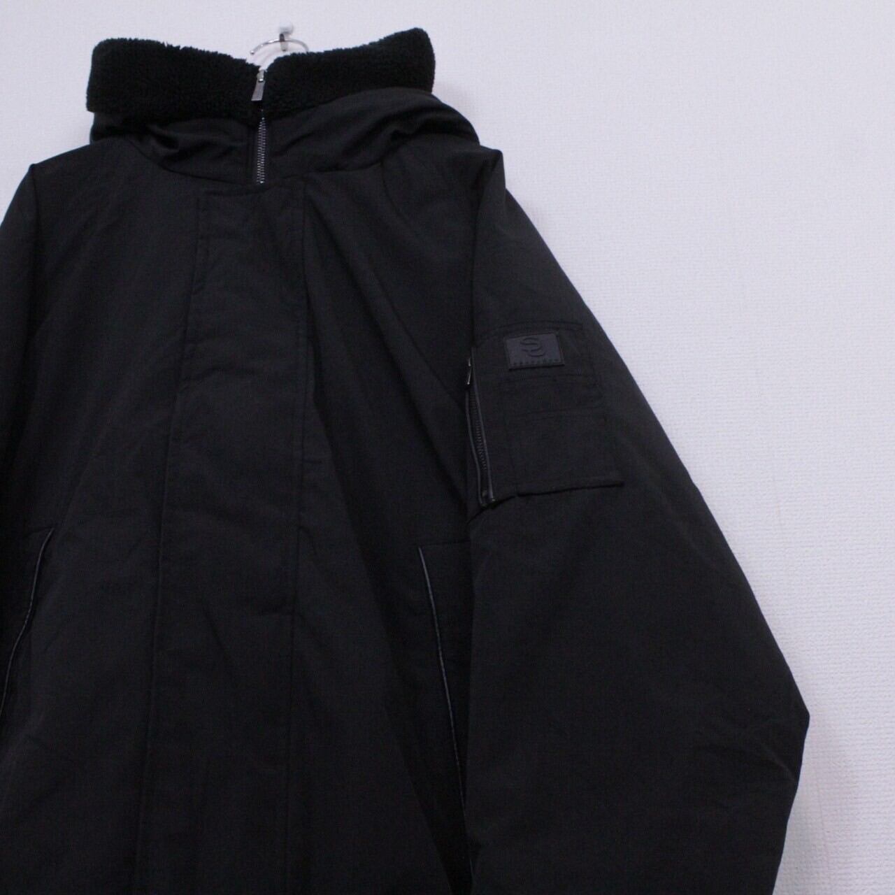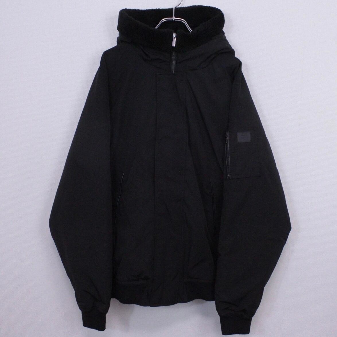 オールブラックのボディに、ミリタリーモチーフのギミックを載せたパデットジャケット。左アームにはシガーポケットにフードにはベルトを装備。