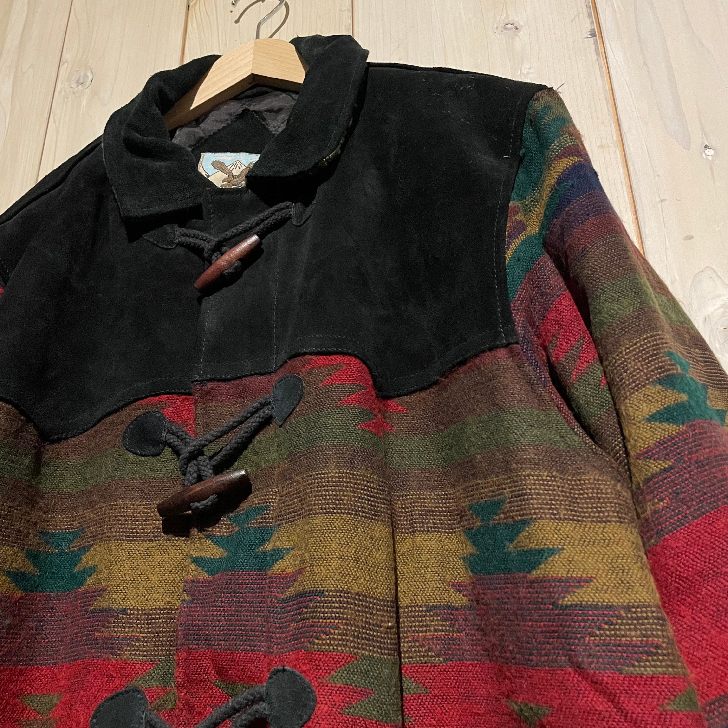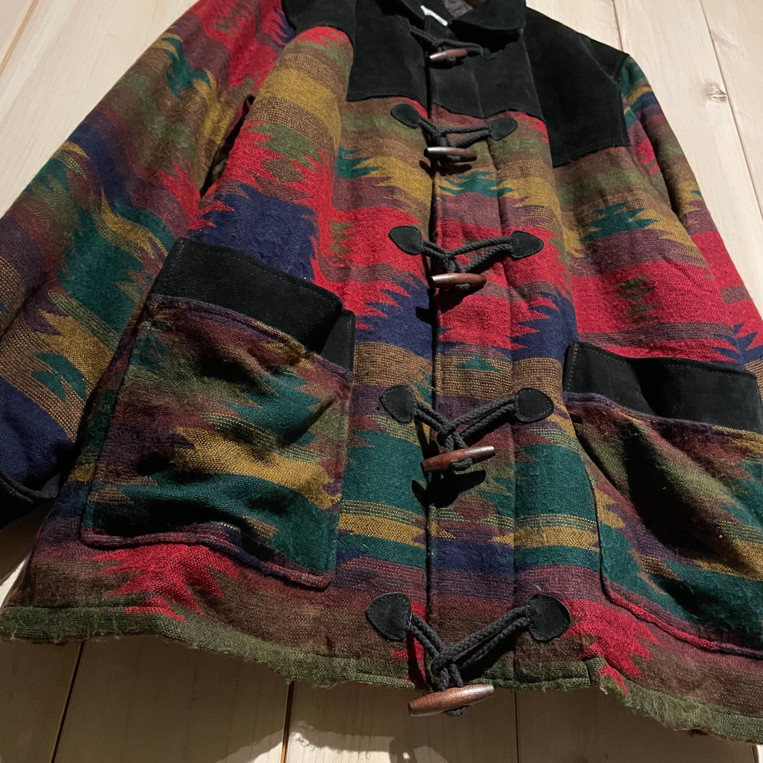 マルチカラーのネイティブ柄を載せた、フワッと柔らかな質感のボディに、ヨーク部をブラックのスエードレザーで切り替えたジャケット。
