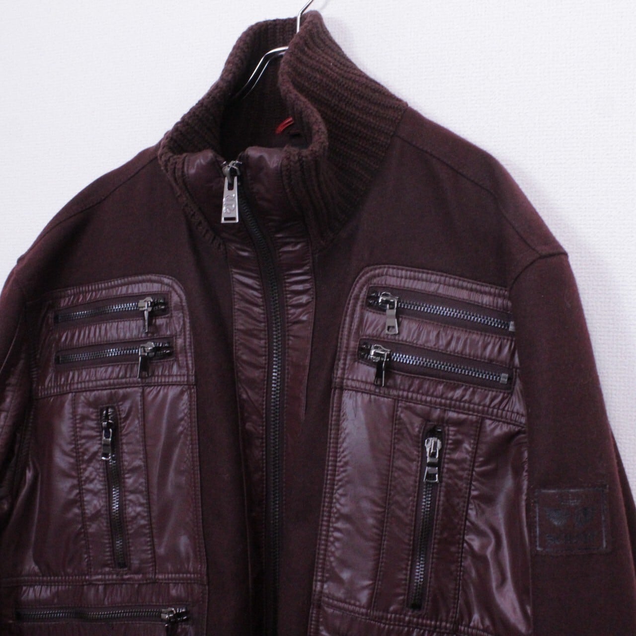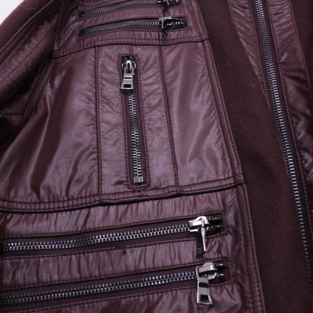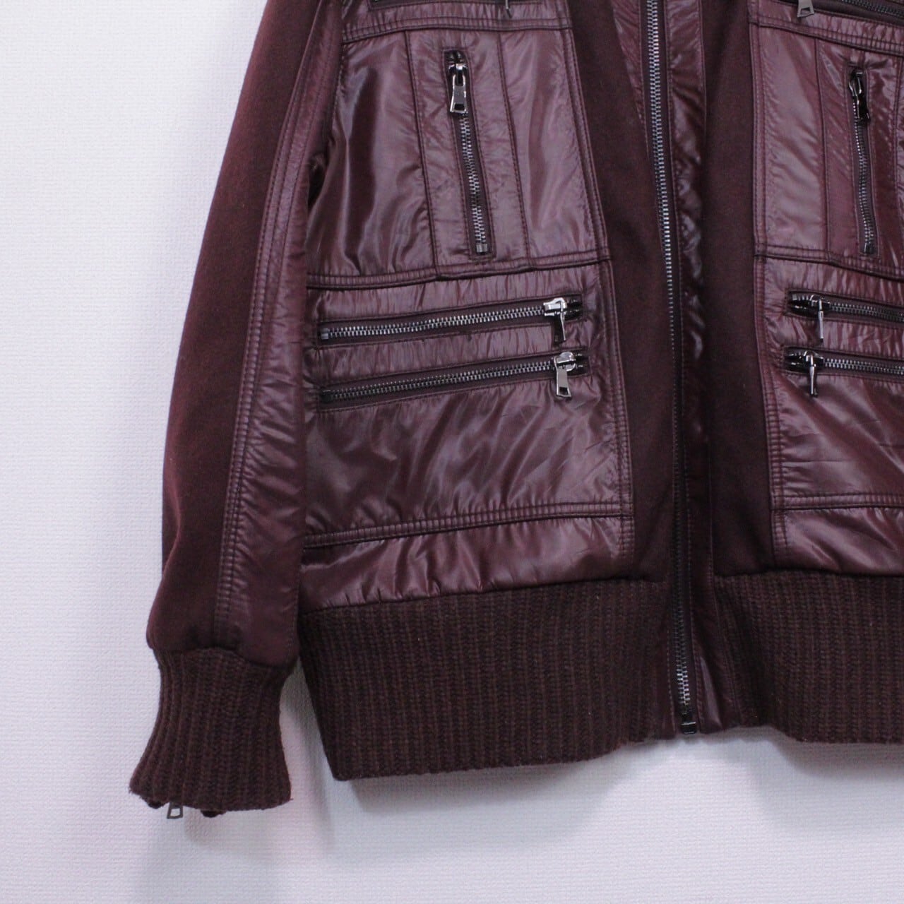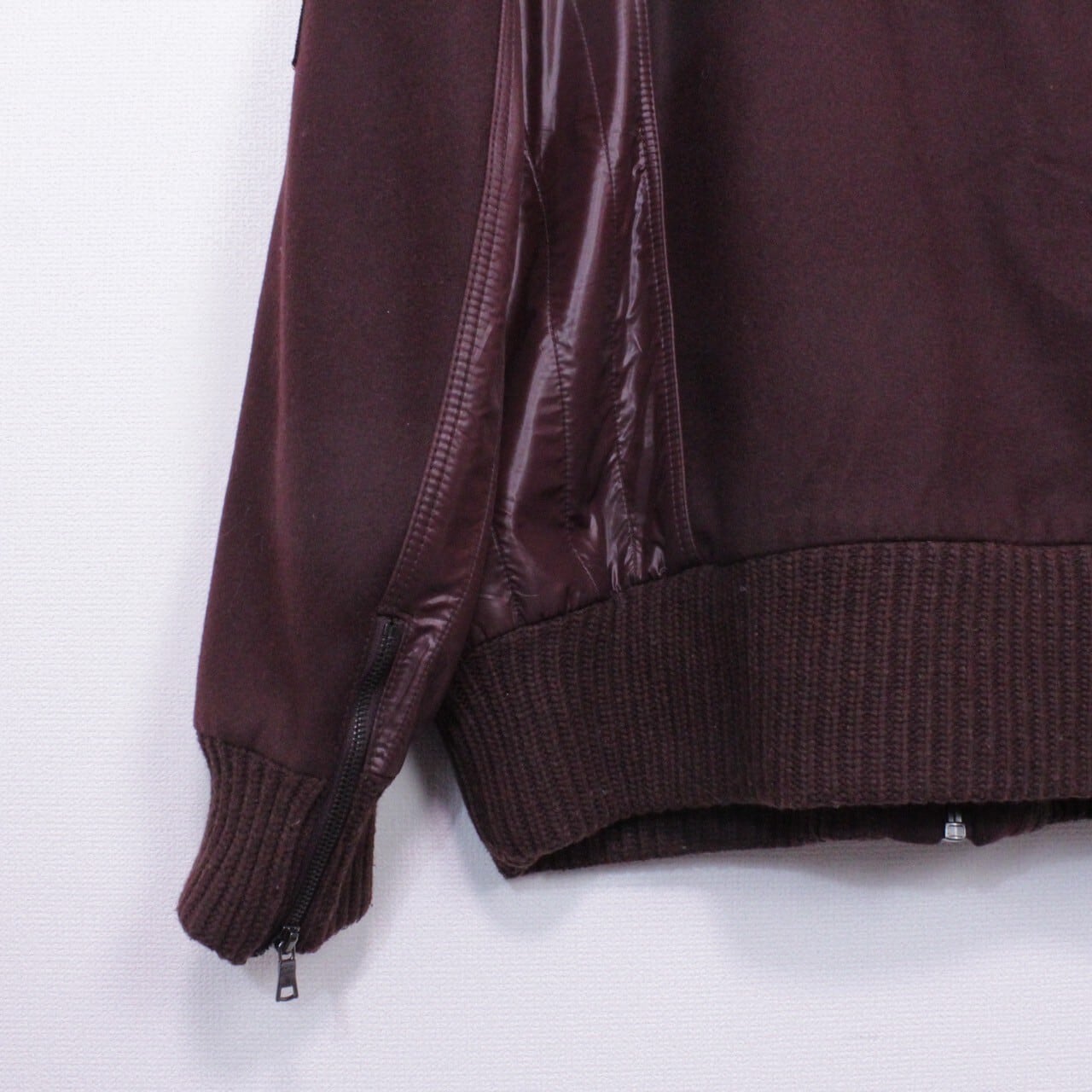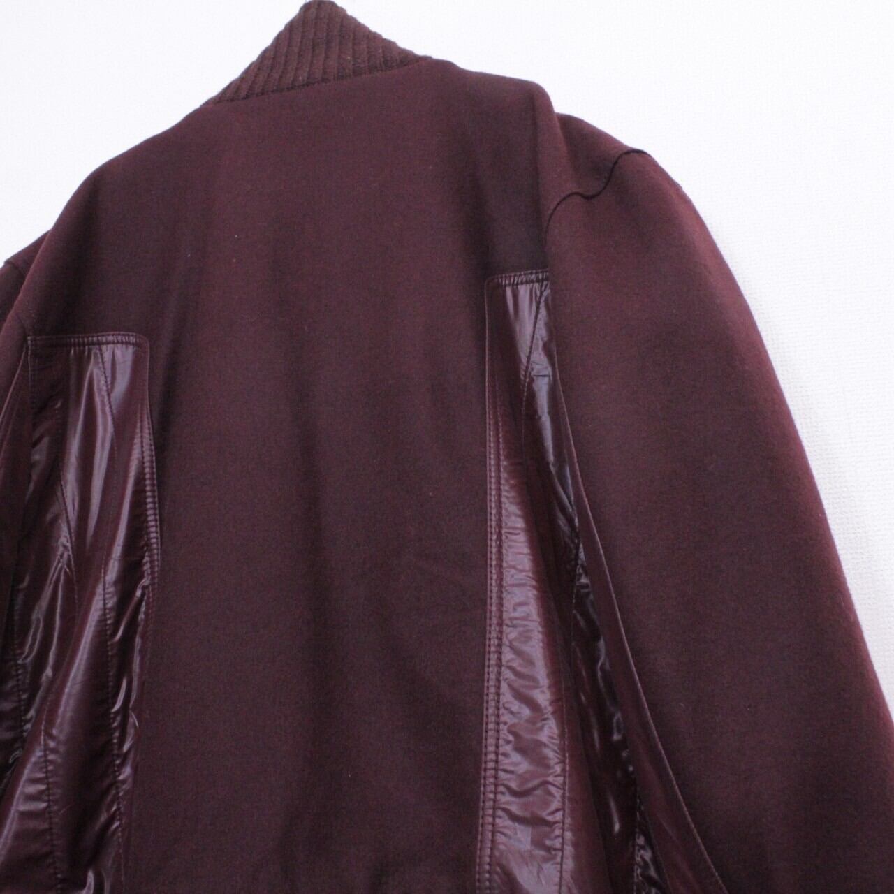 上品さと色気を併せ持ったボルドーカラーのメルトン地をボディに使用。ツルッと滑らかな光沢を帯びた生地で切り替えを施し、重厚感のあるジップデザインを施したスペシャルなジャケット。