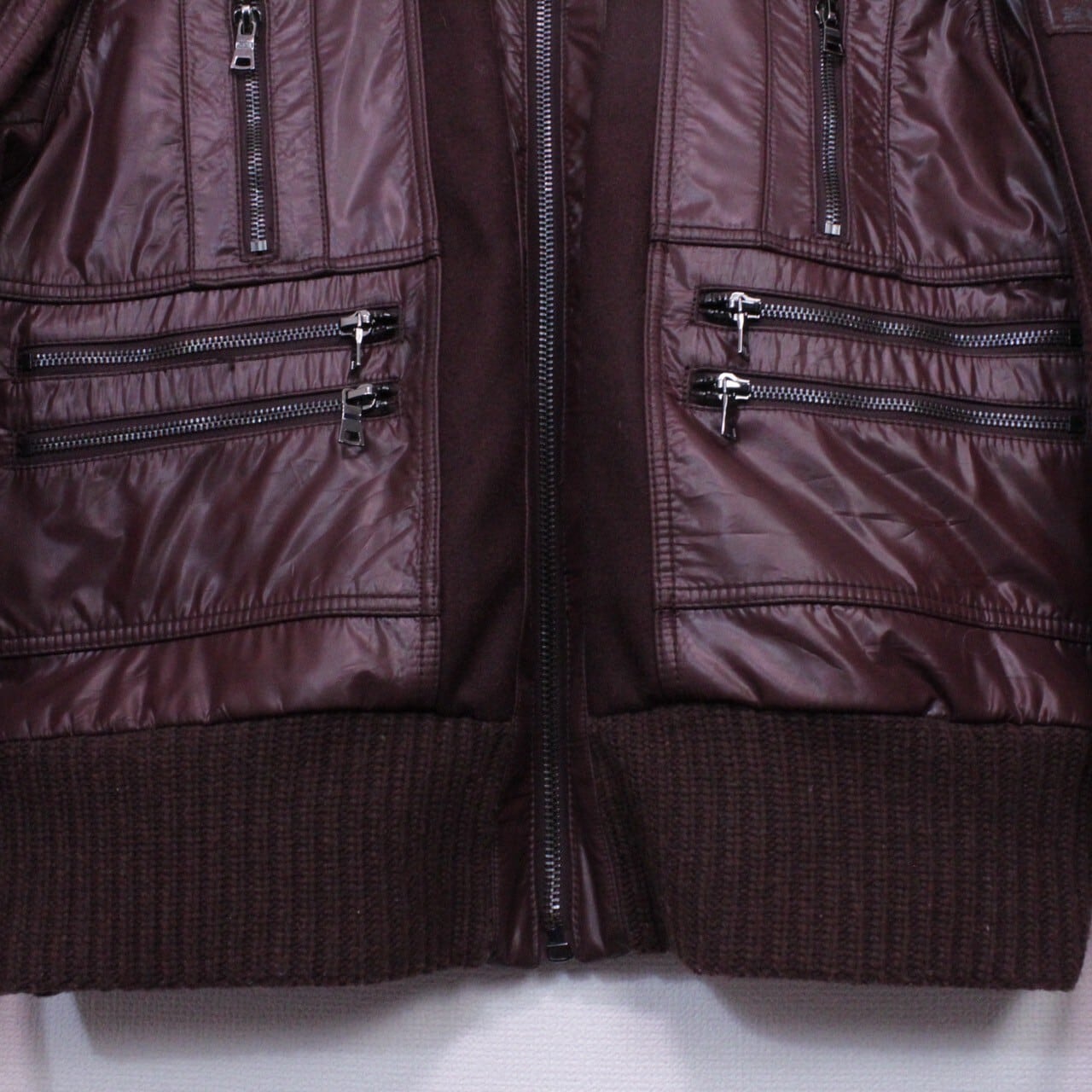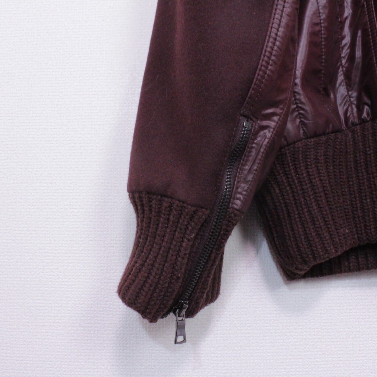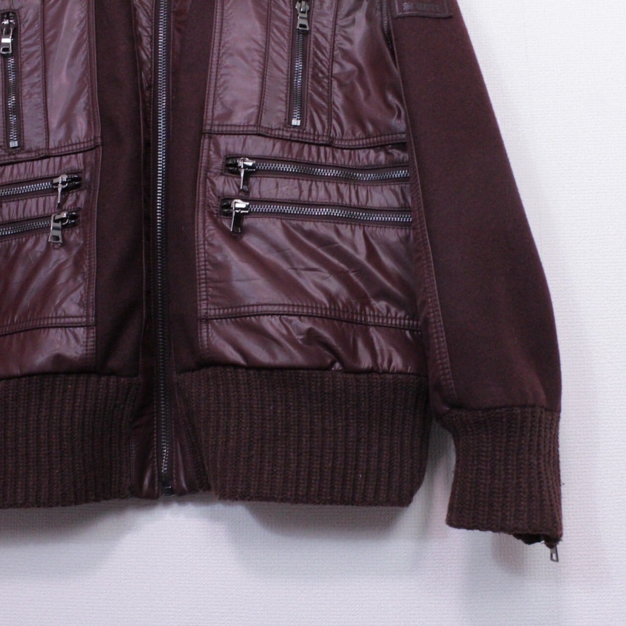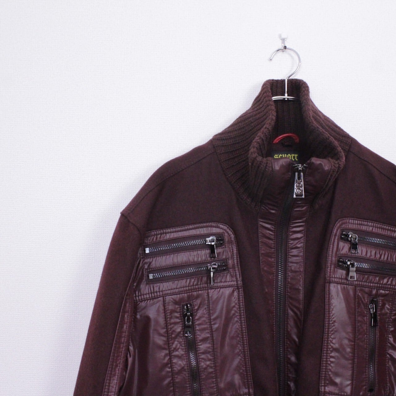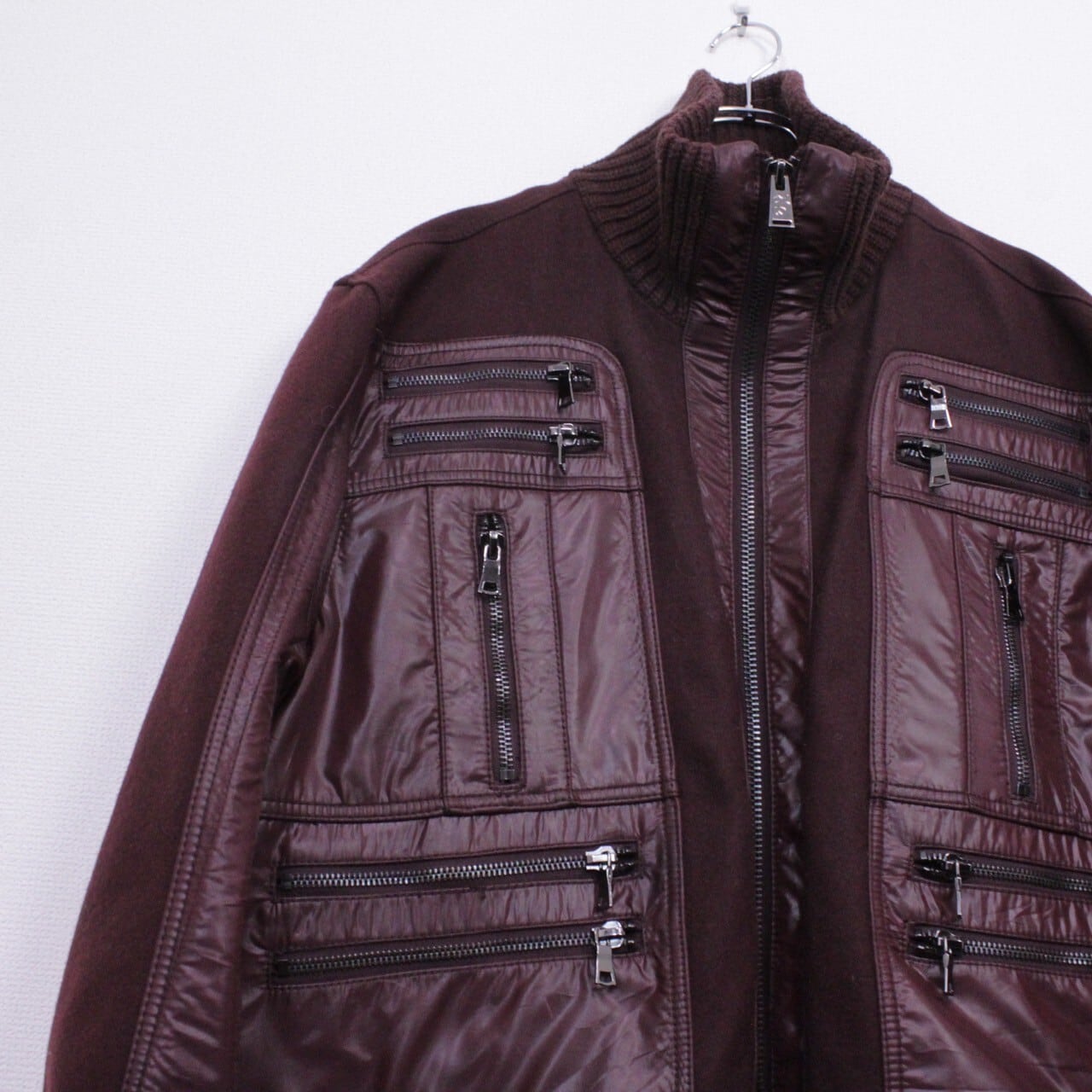 上品さと色気を併せ持ったボルドーカラーのメルトン地をボディに使用。ツルッと滑らかな光沢を帯びた生地で切り替えを施し、重厚感のあるジップデザインを施したスペシャルなジャケット。
