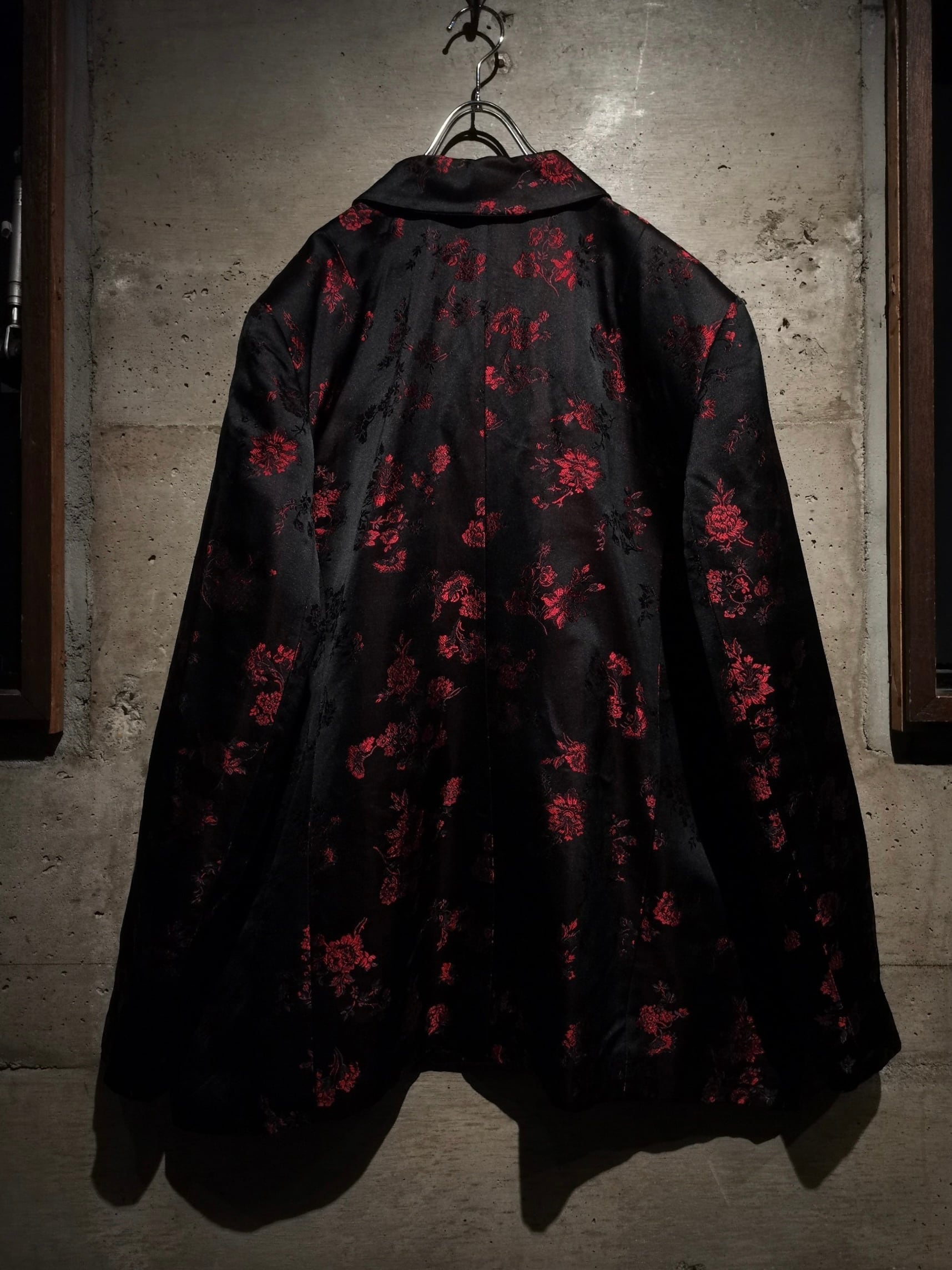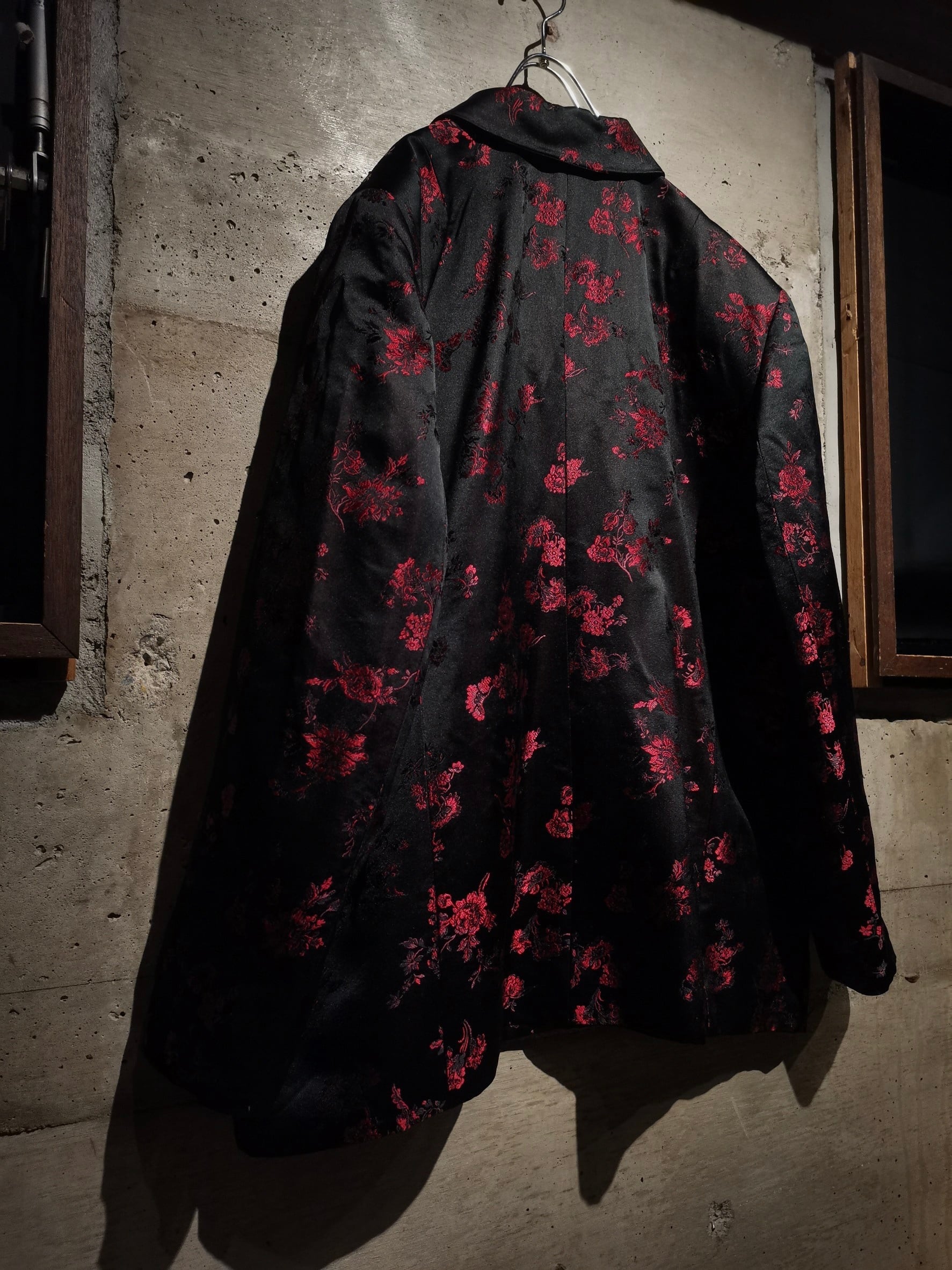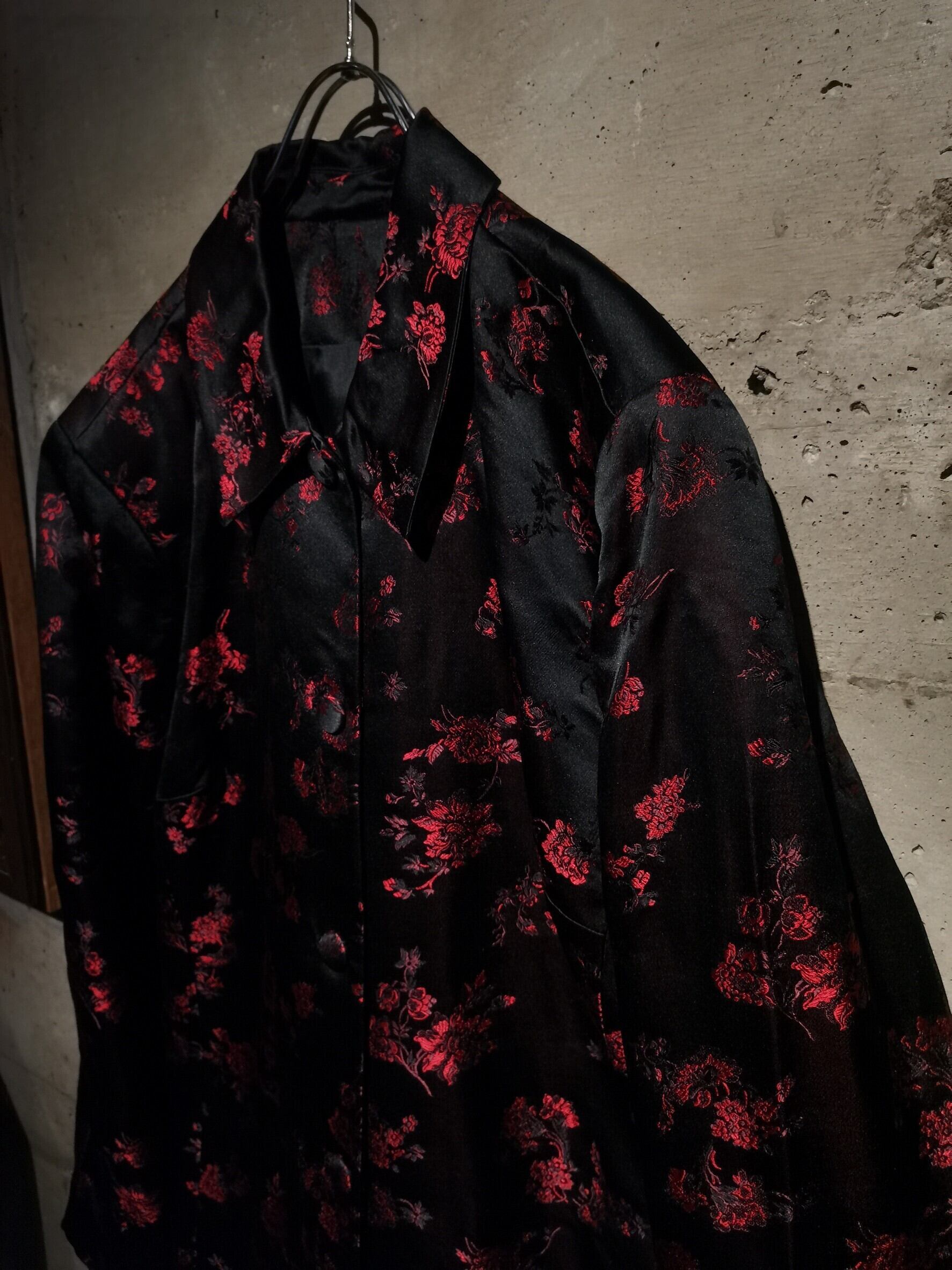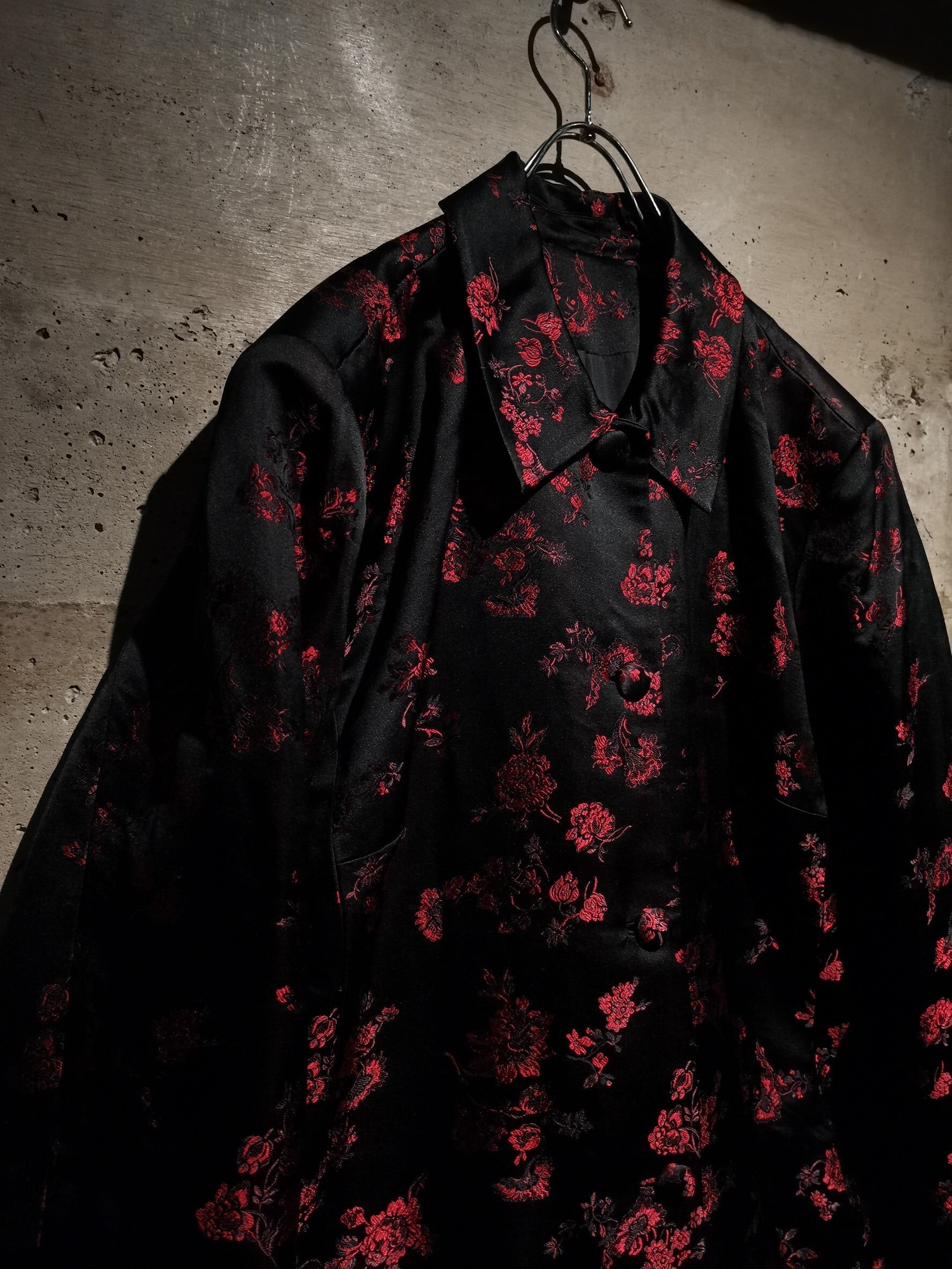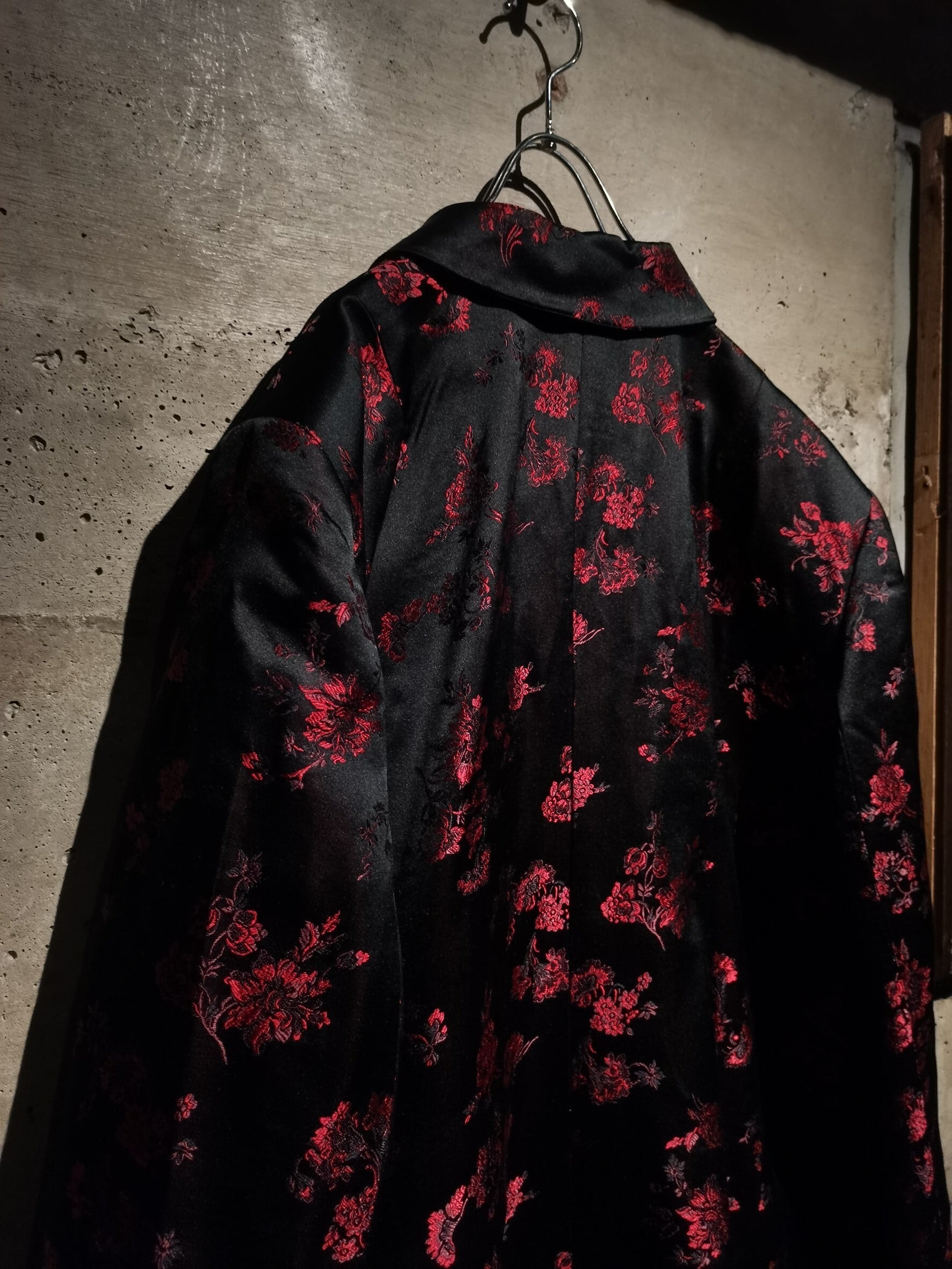 角度によって見え方の変わるハリのある光沢を放つ上質な素材をボディに使用し、ブラックをベースに繊細な織りによって、赤色の美しい花柄を刻み込んだ、上品かつモードな色気をムンムンに漂わせる1着。