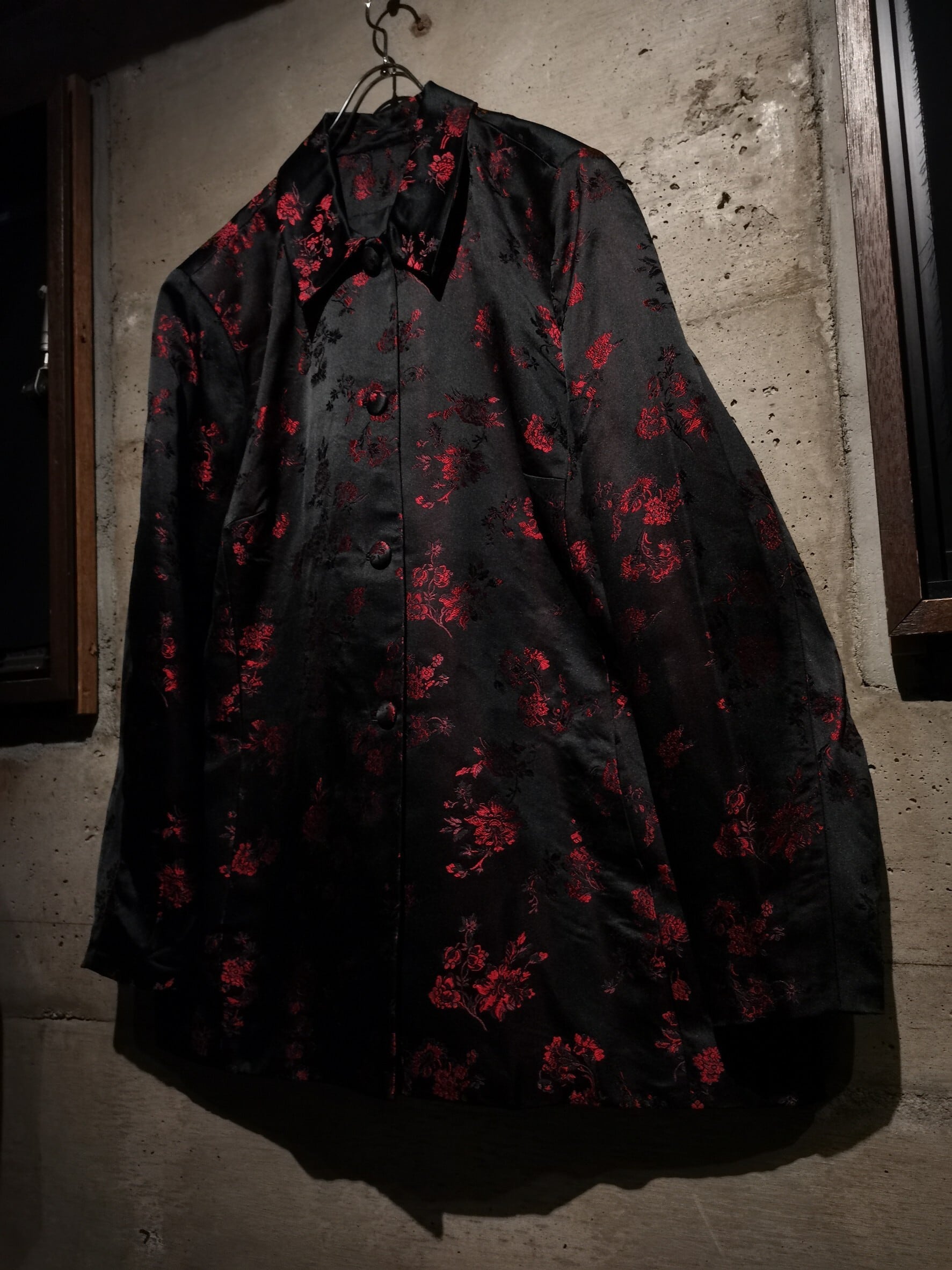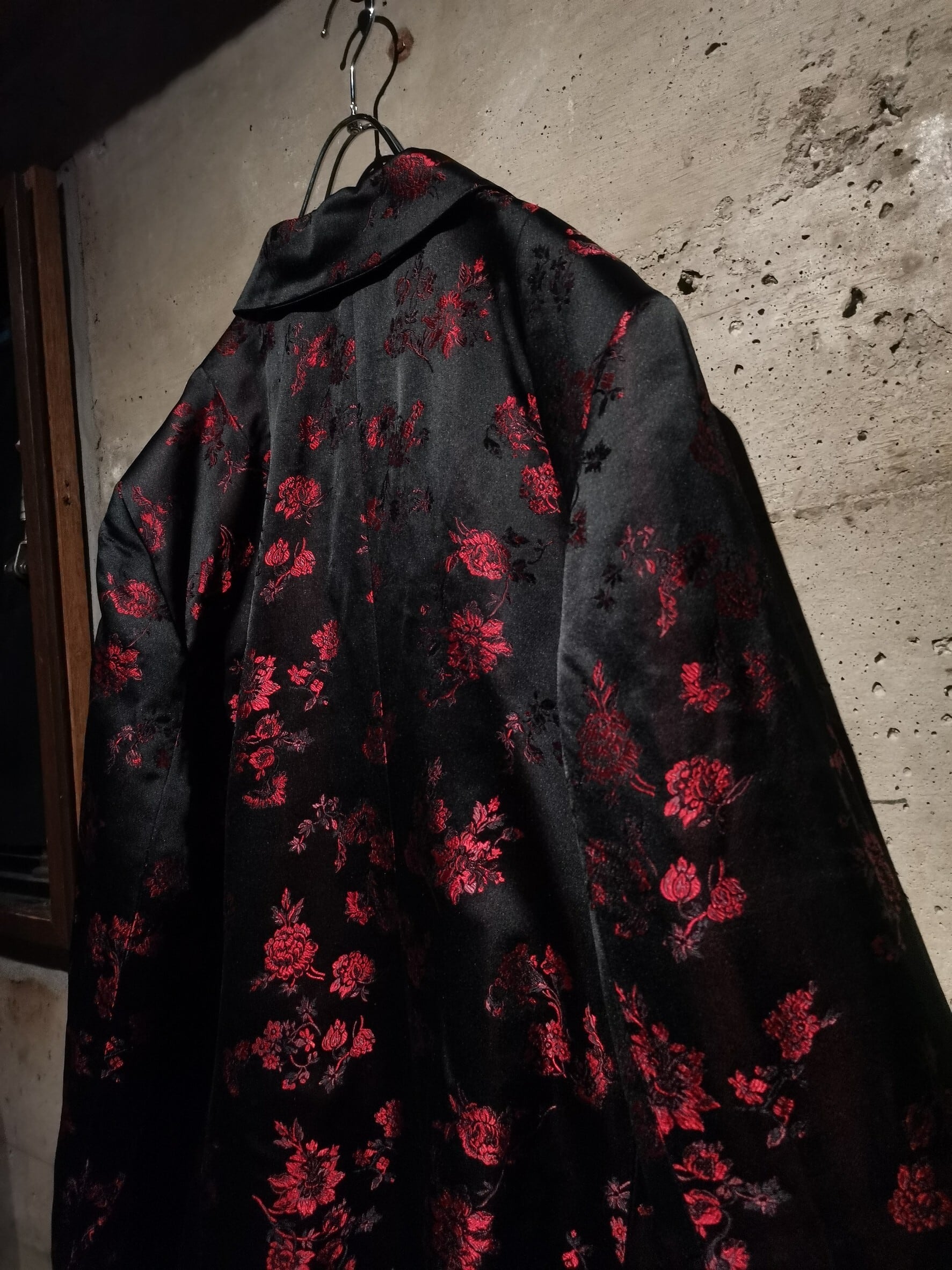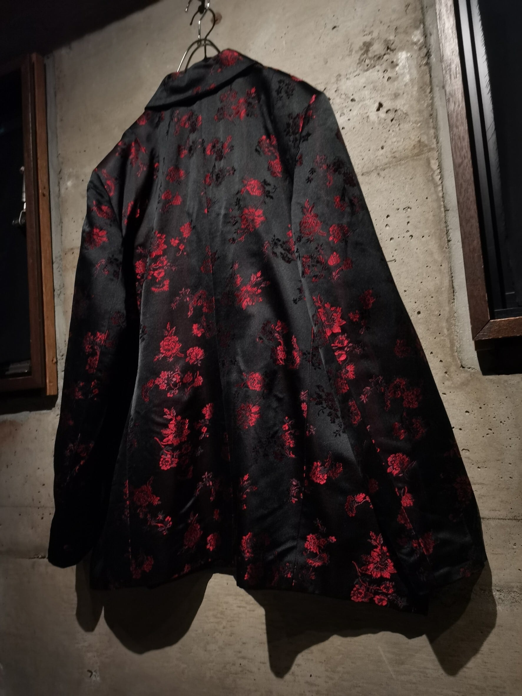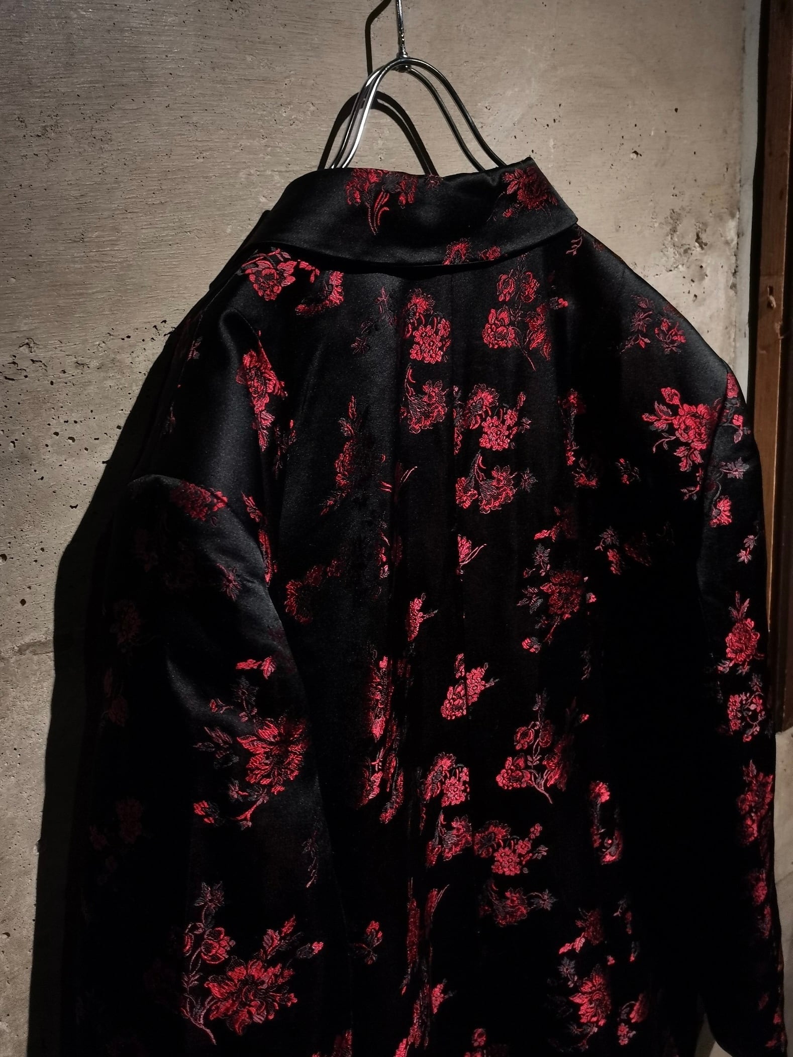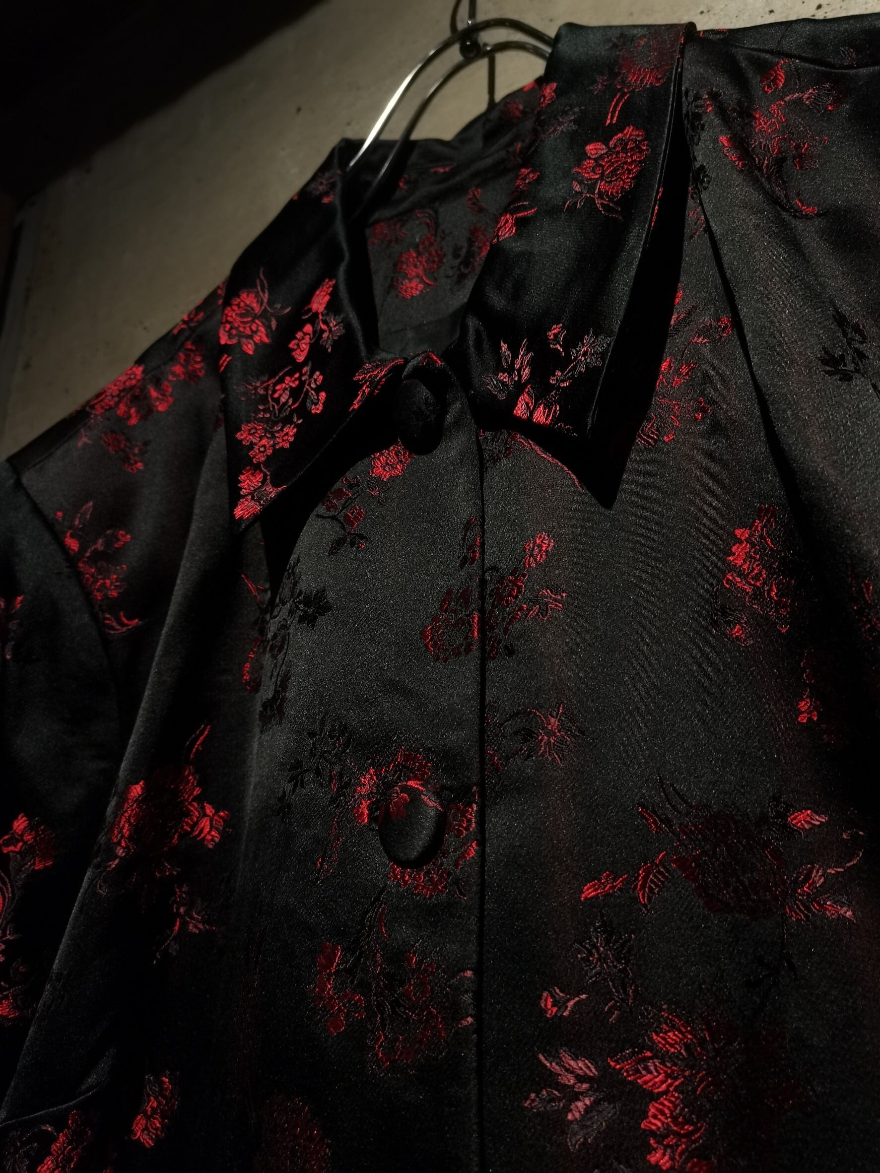角度によって見え方の変わるハリのある光沢を放つ上質な素材をボディに使用し、ブラックをベースに繊細な織りによって、赤色の美しい花柄を刻み込んだ、上品かつモードな色気をムンムンに漂わせる1着。