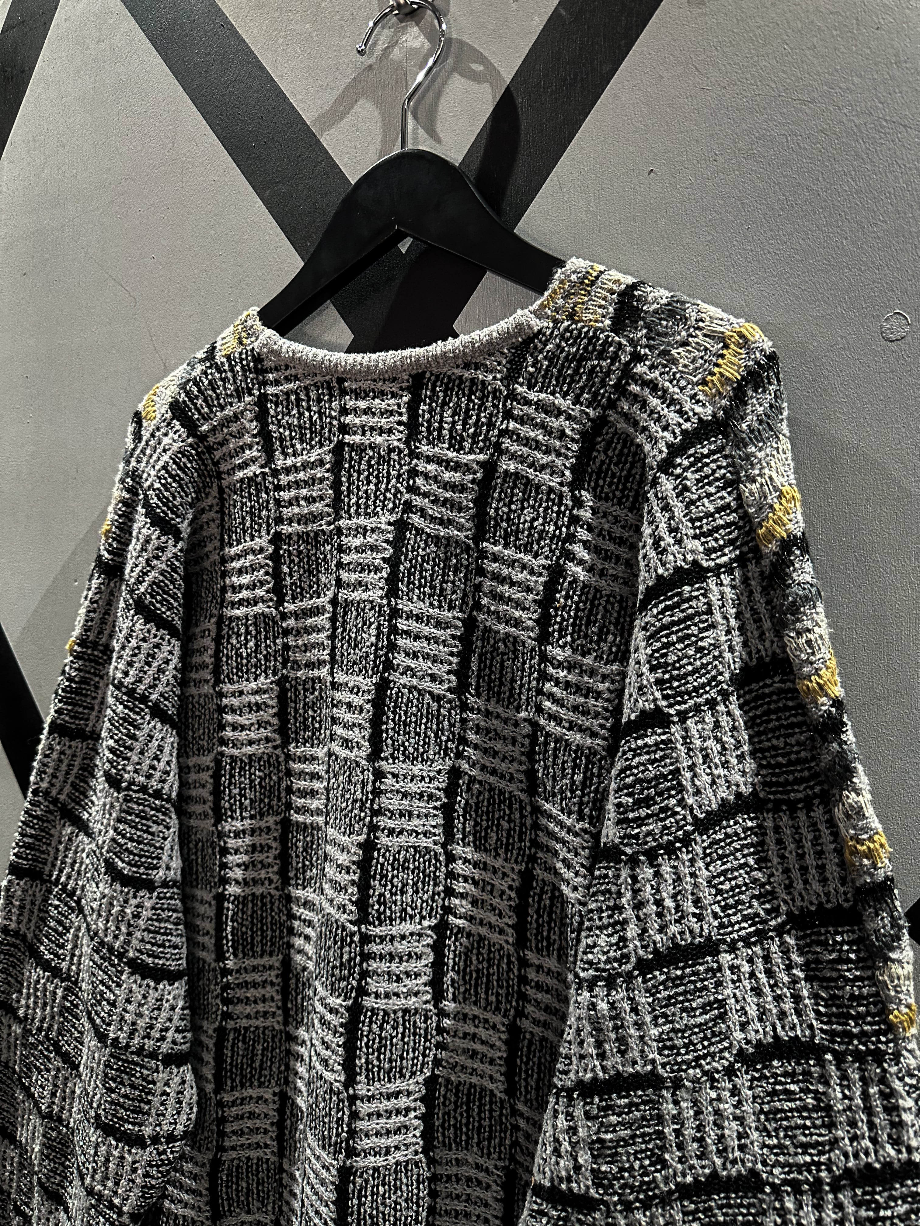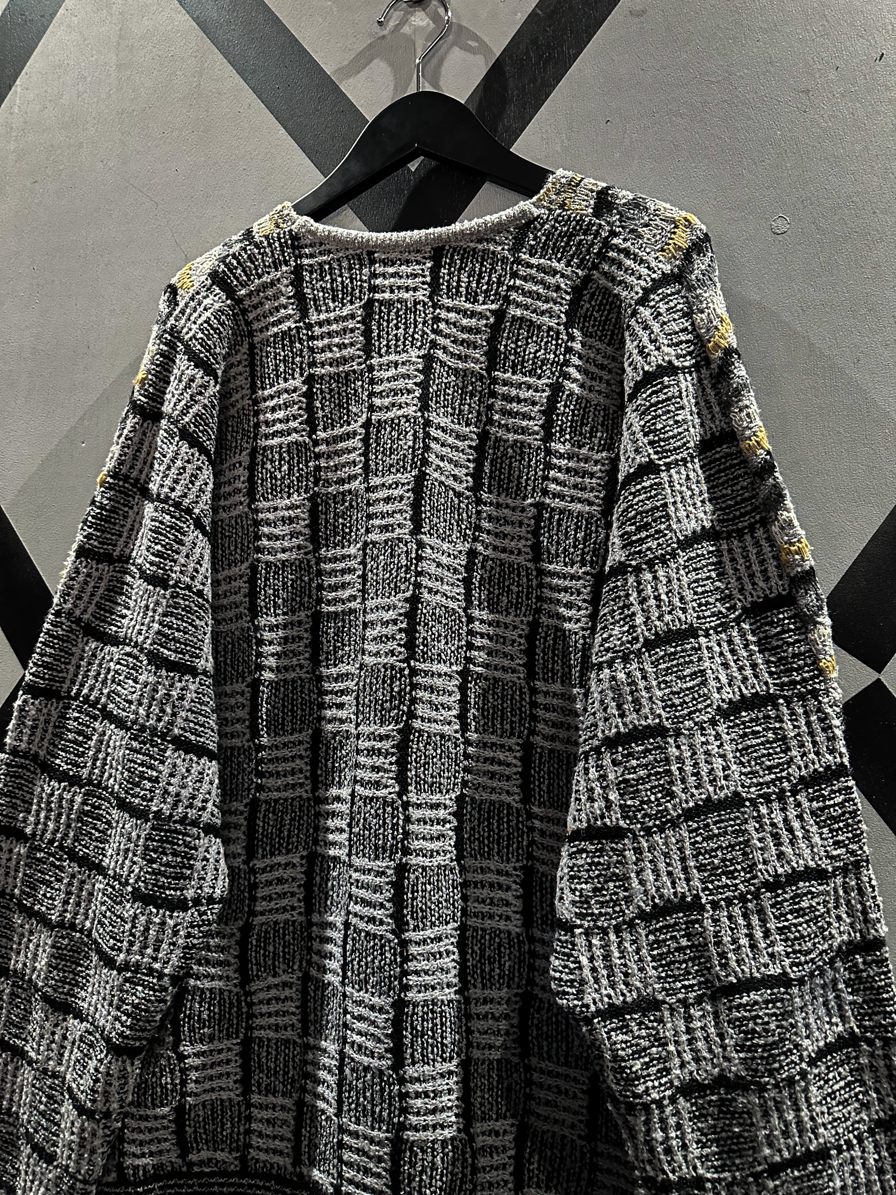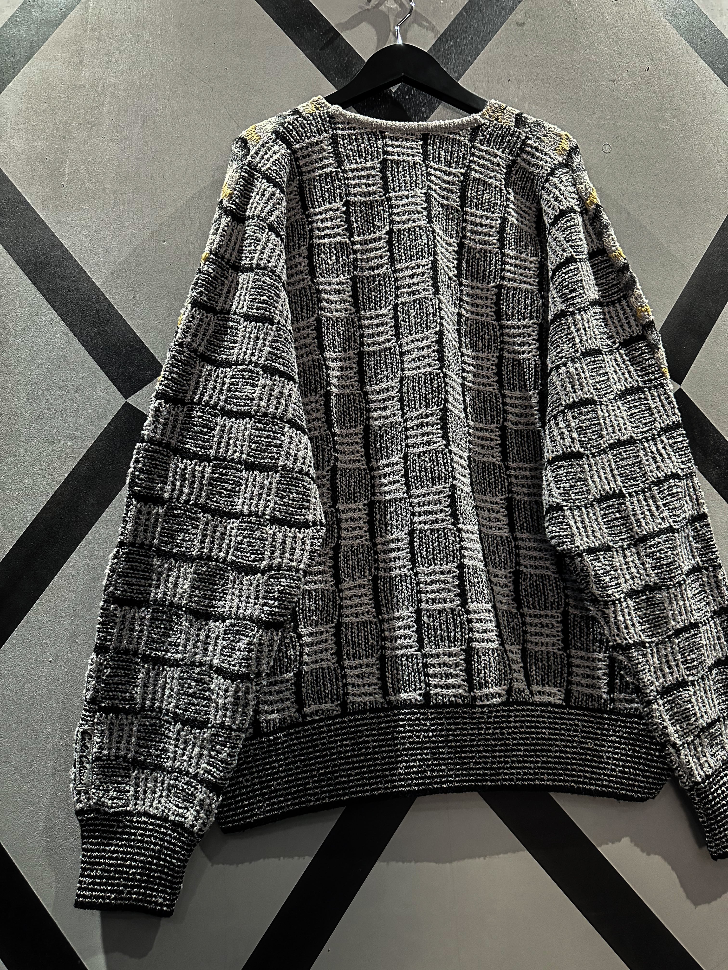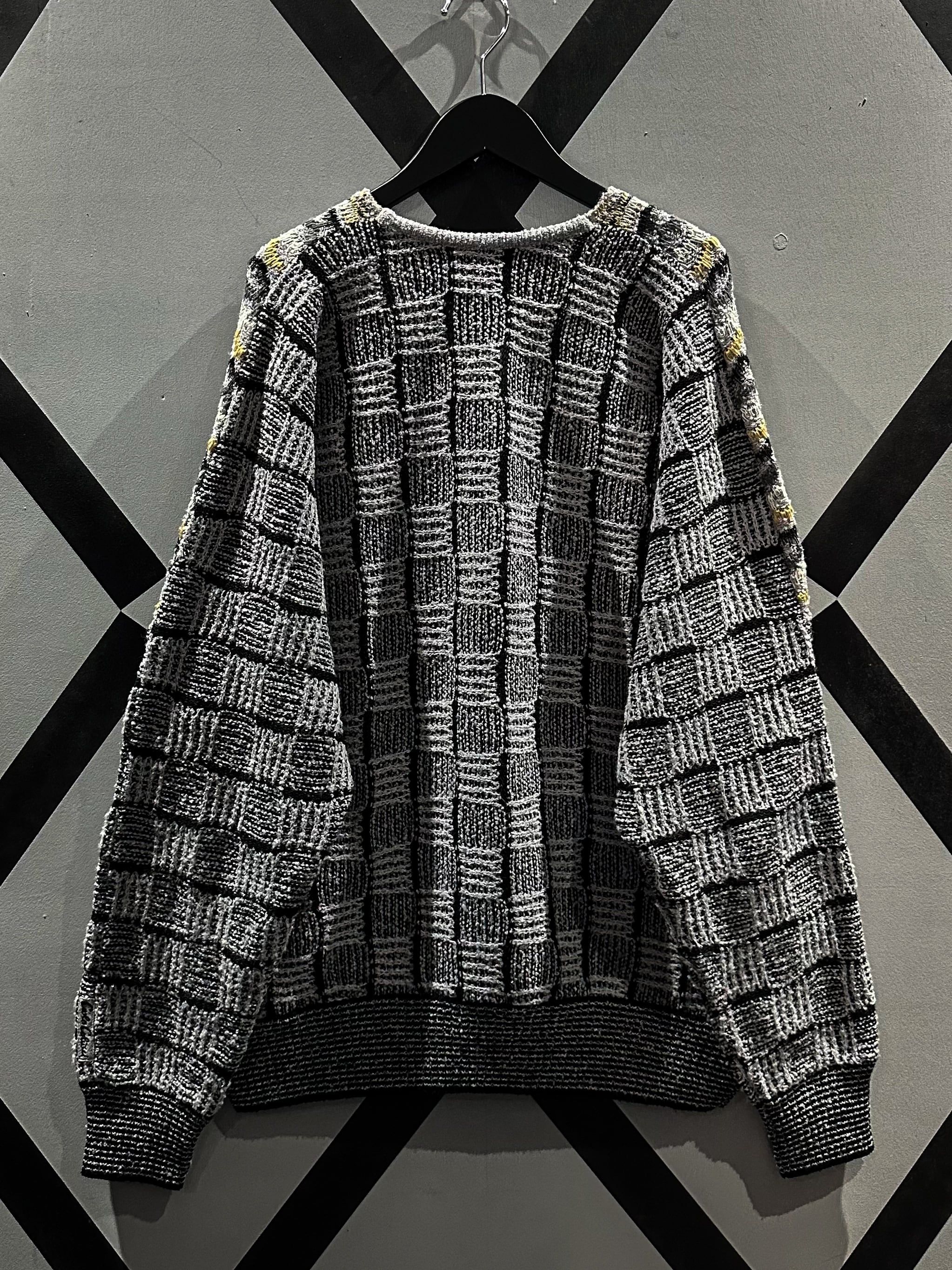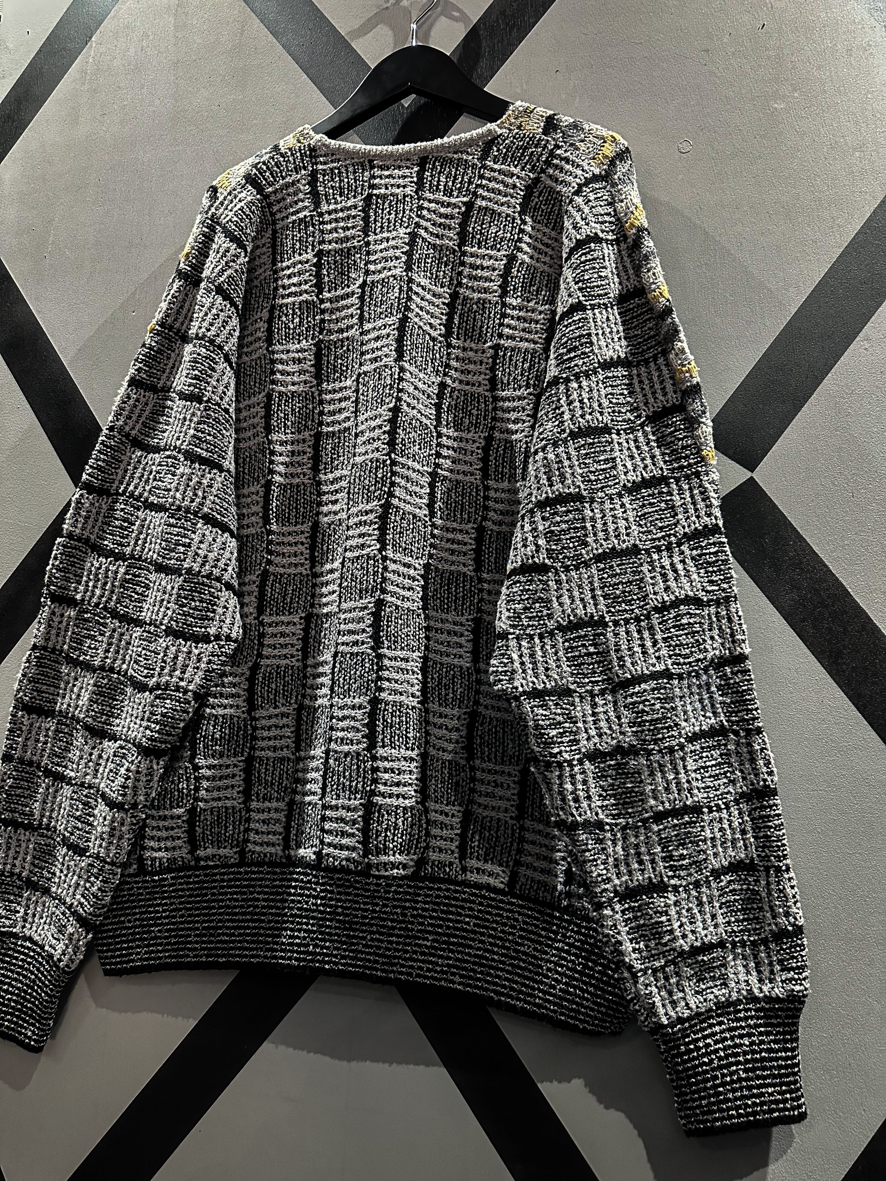 フロントはバイアス状に、アームやバックはブロック状に編み込んだニット。立体的な織りも相待って深い奥行きを生み出した1着です。