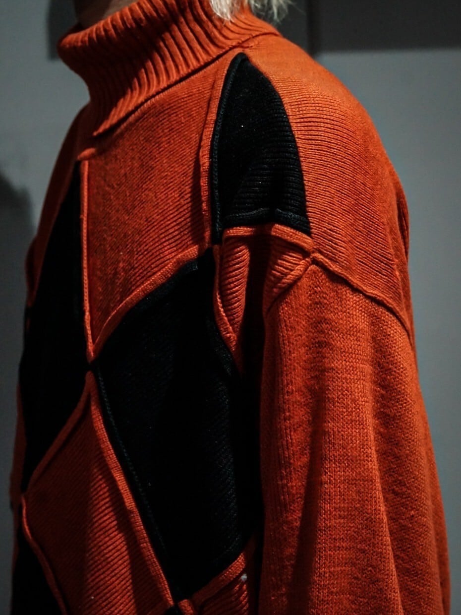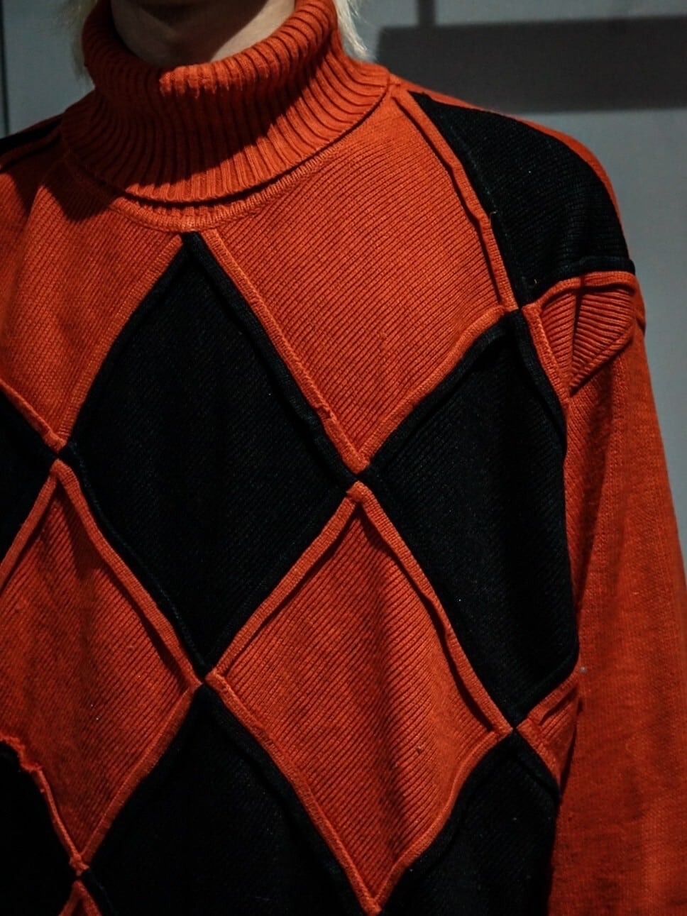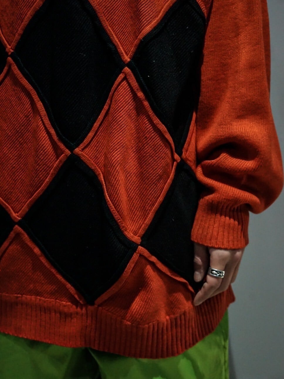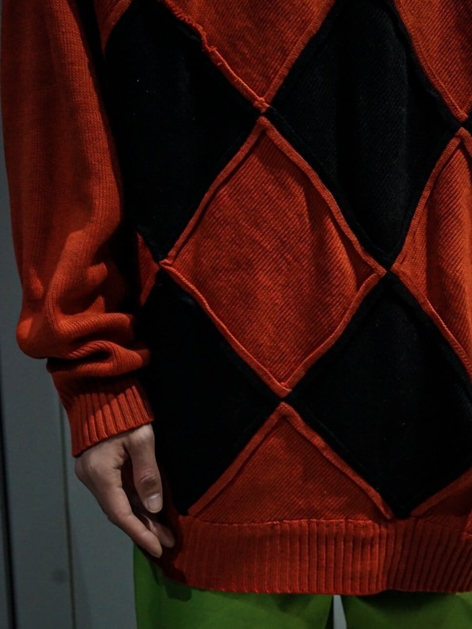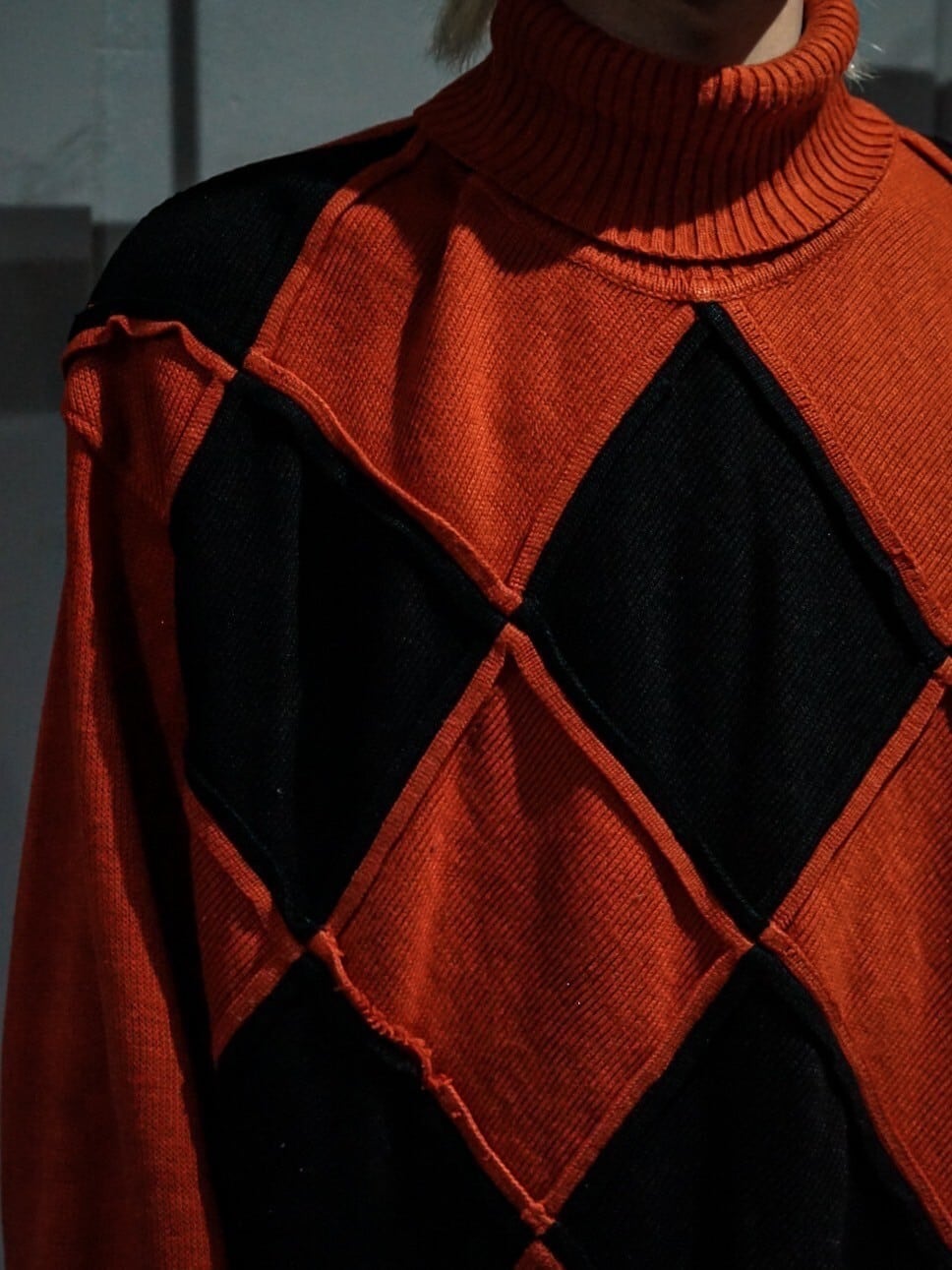 エッジの効いた黒×オレンジの配色を用いてアーガイル柄をフロントに載せたハイネックのニット。アーガイル部分は縫い代が表面に出された作りで立体的な仕上がりに。