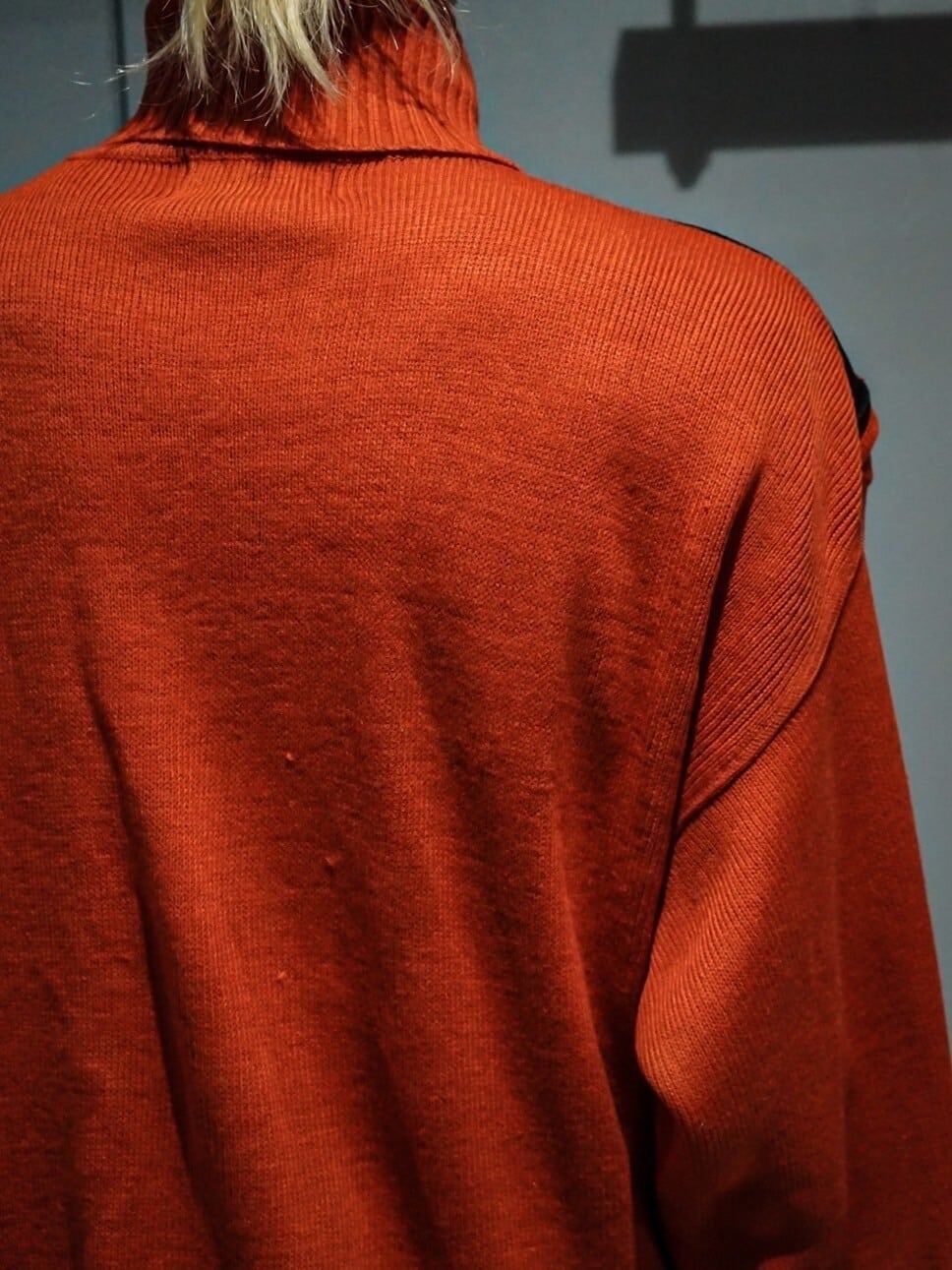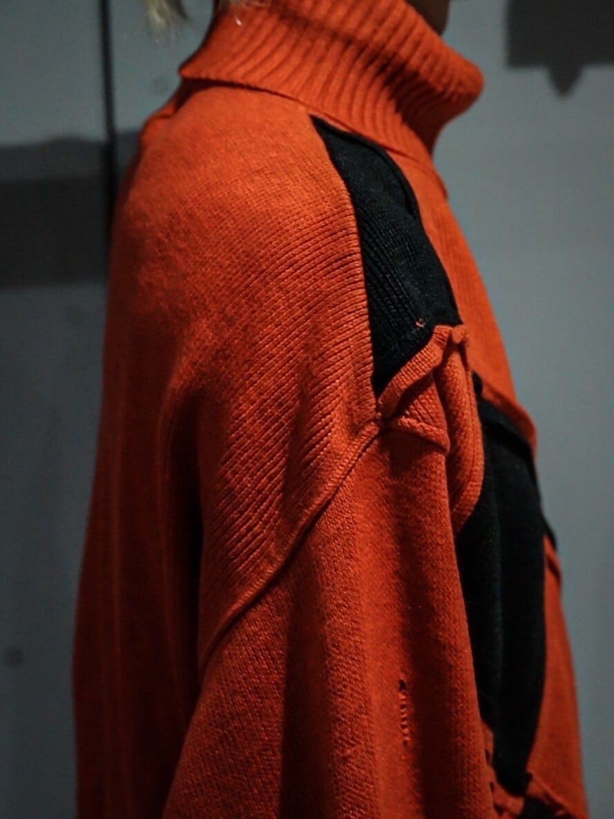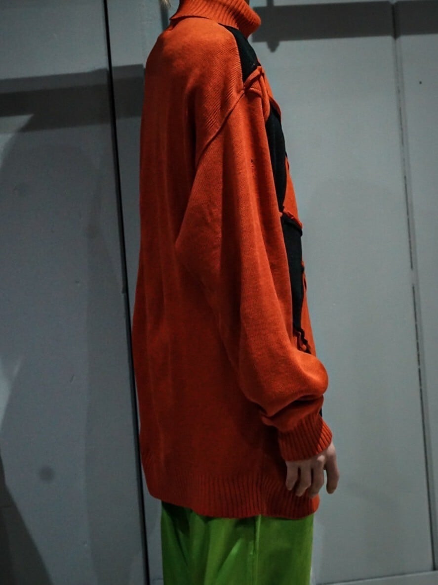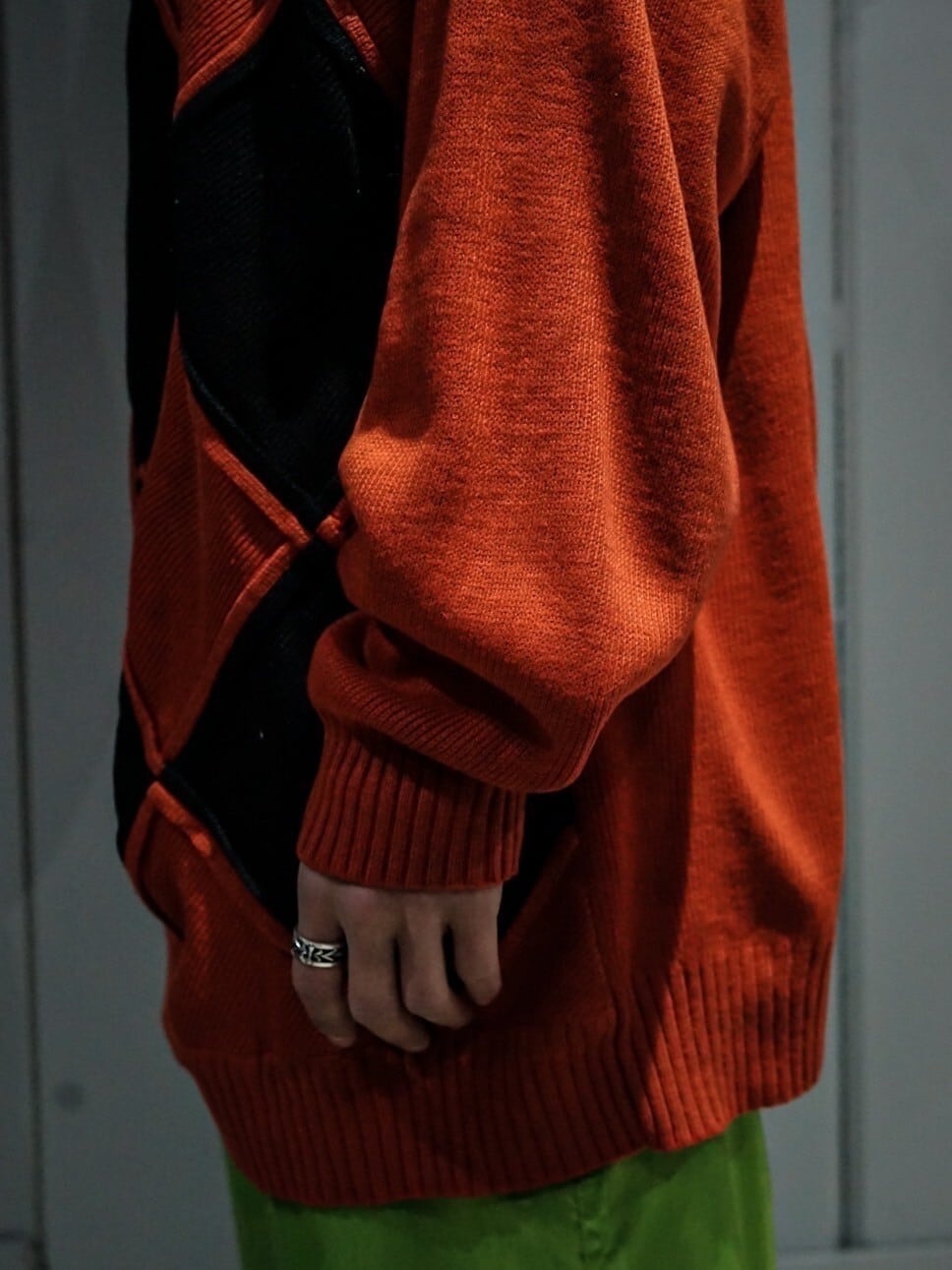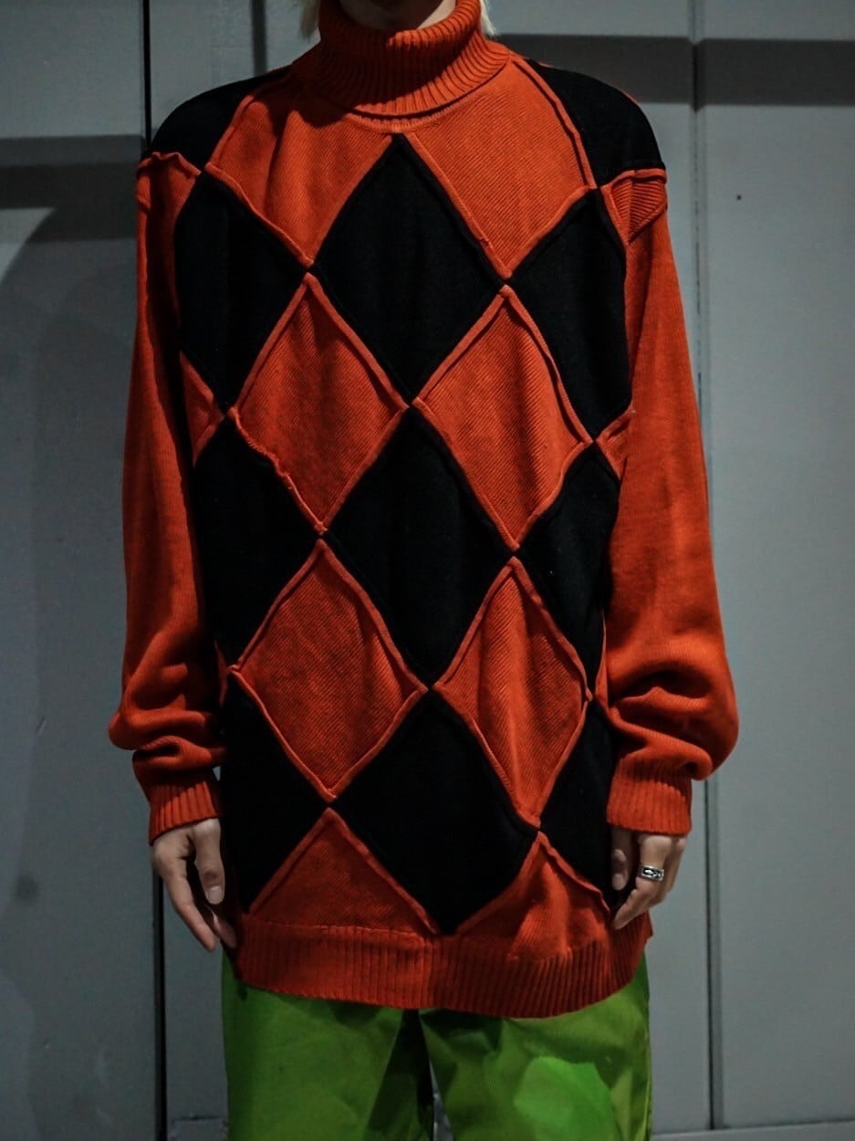 エッジの効いた黒×オレンジの配色を用いてアーガイル柄をフロントに載せたハイネックのニット。アーガイル部分は縫い代が表面に出された作りで立体的な仕上がりに。