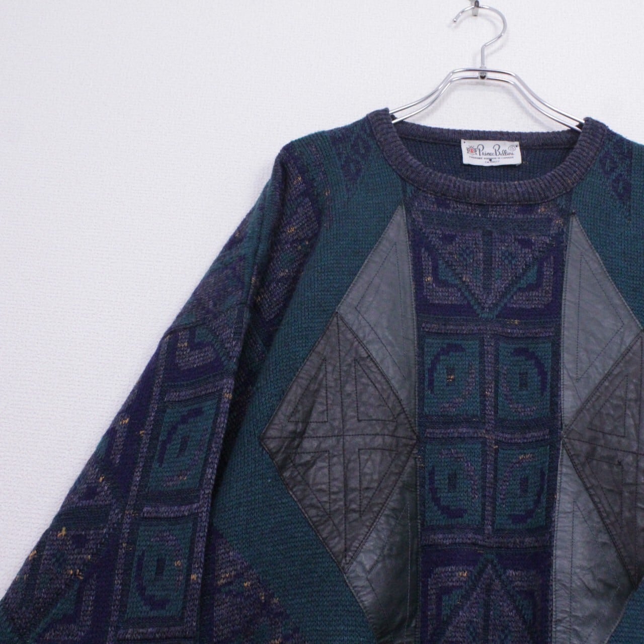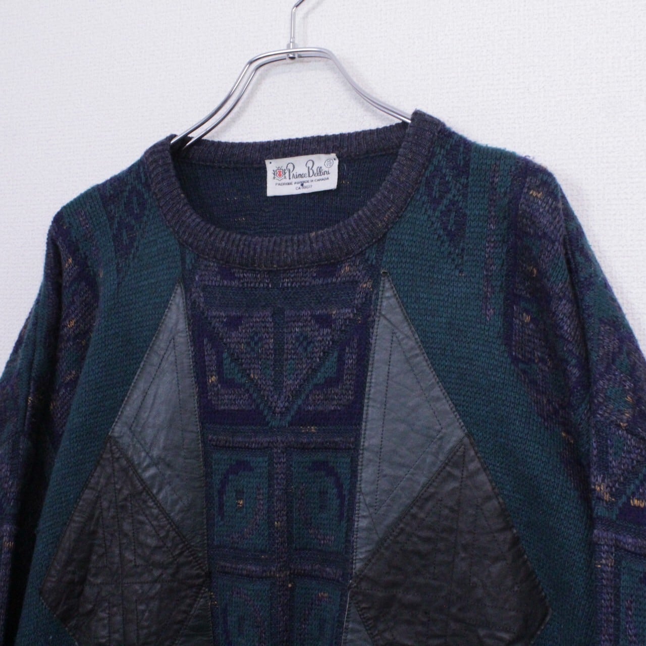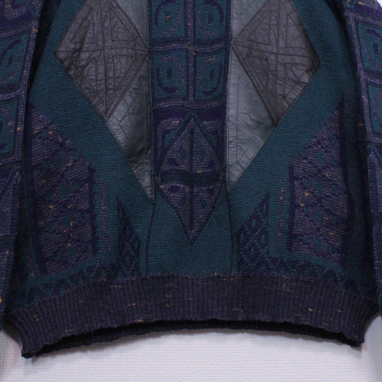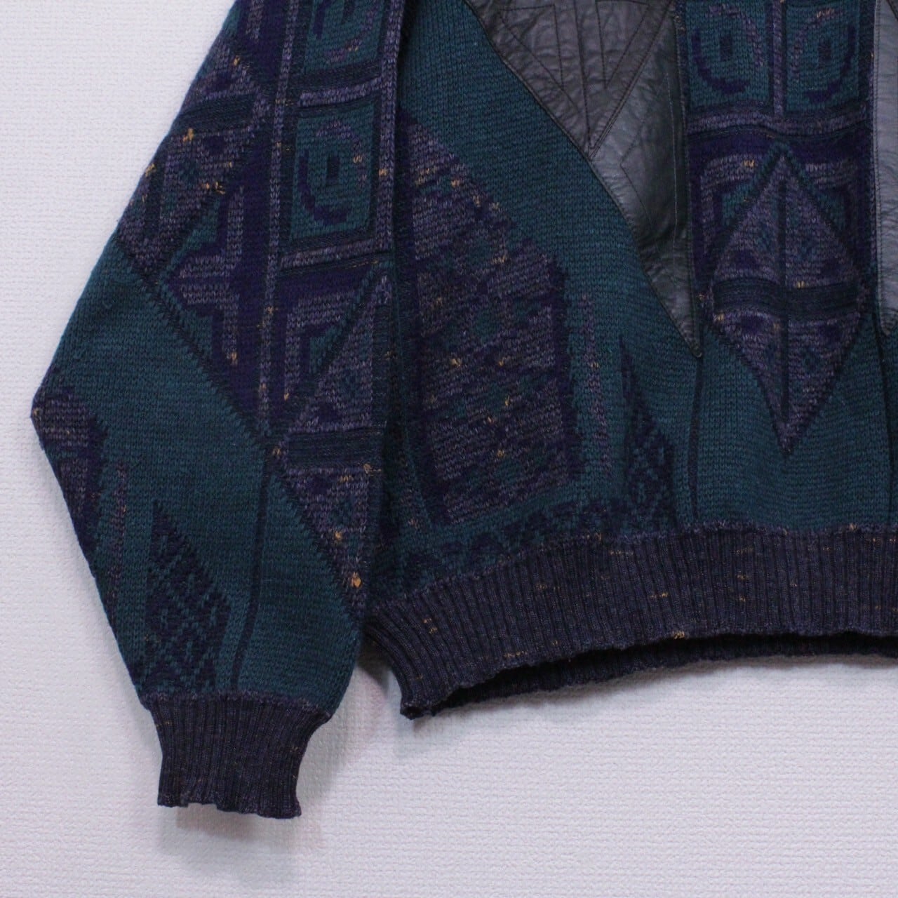 ダークグリーン、ネイビー、グレーを用いてアーティスティックな柄模様を載せたニットをベースに、ブラック×グリーンのカラーレザーを切り替えたプルオーバーニット。