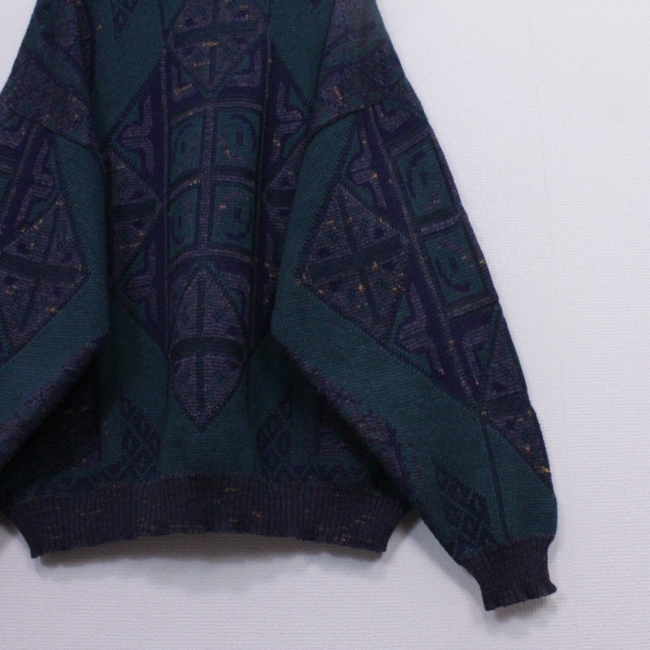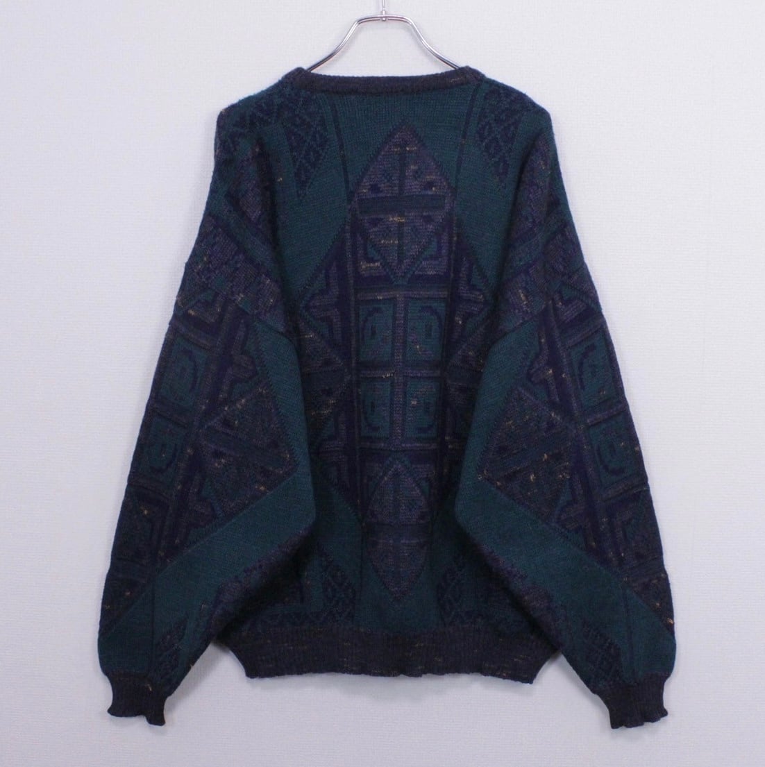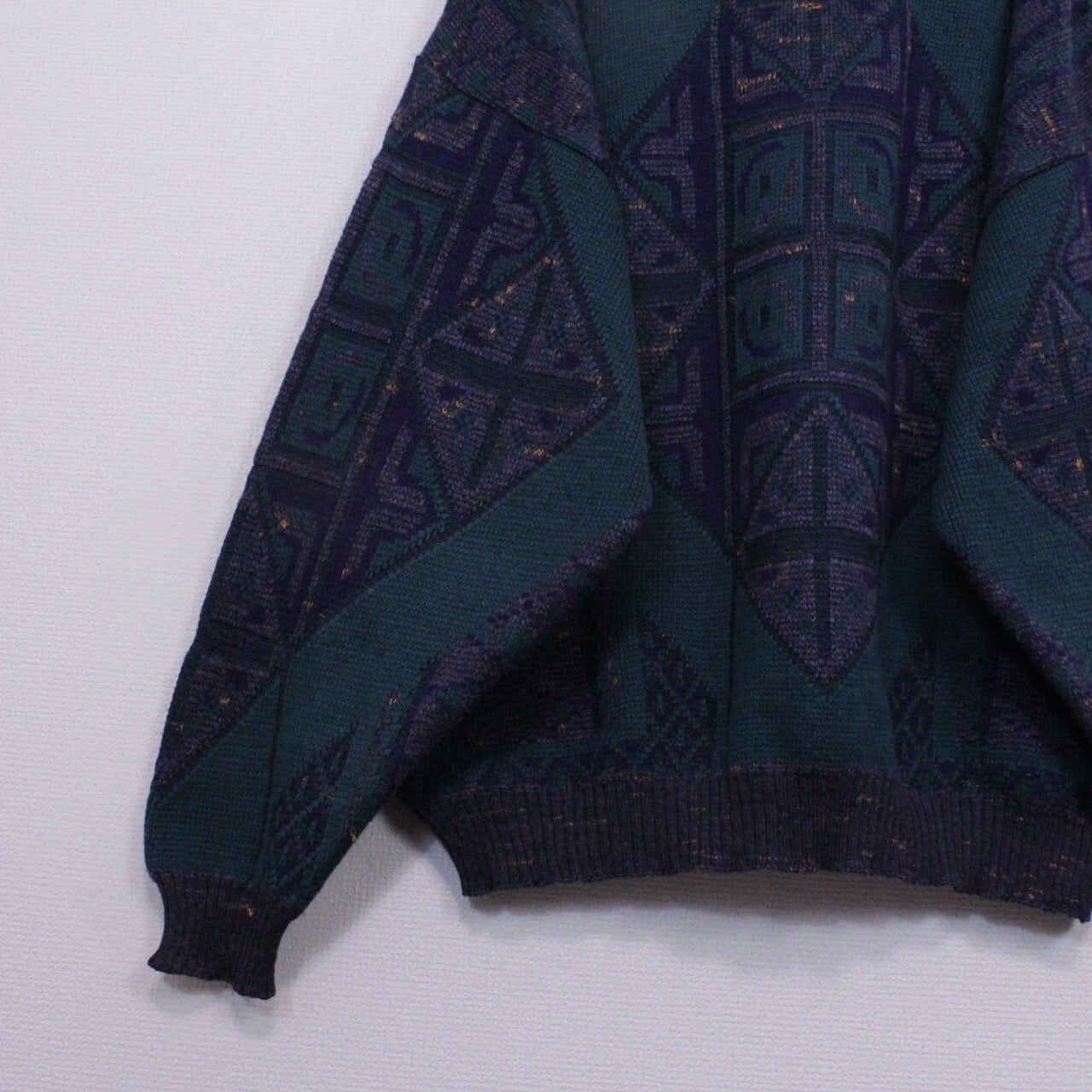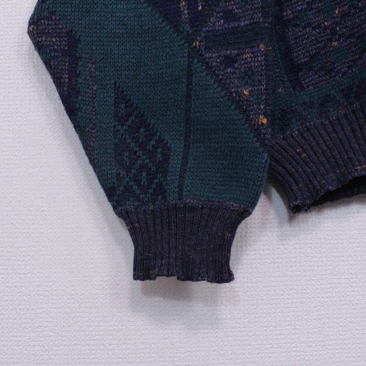 ダークグリーン、ネイビー、グレーを用いてアーティスティックな柄模様を載せたニットをベースに、ブラック×グリーンのカラーレザーを切り替えたプルオーバーニット。