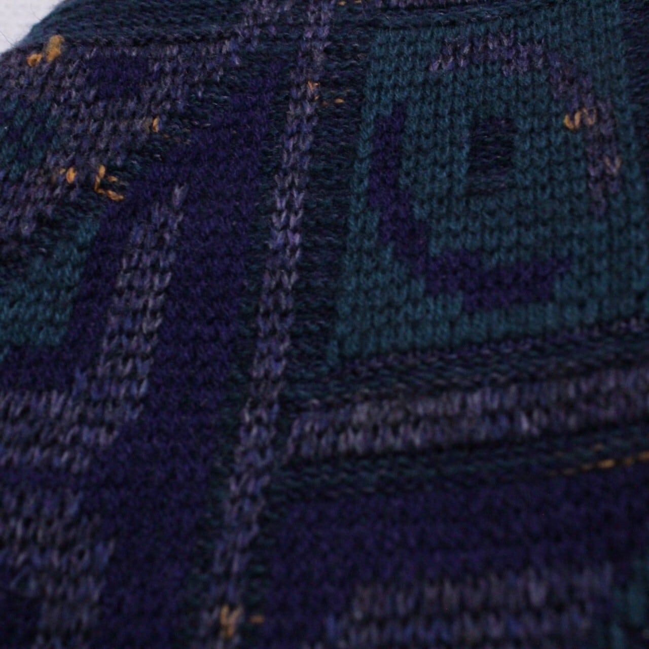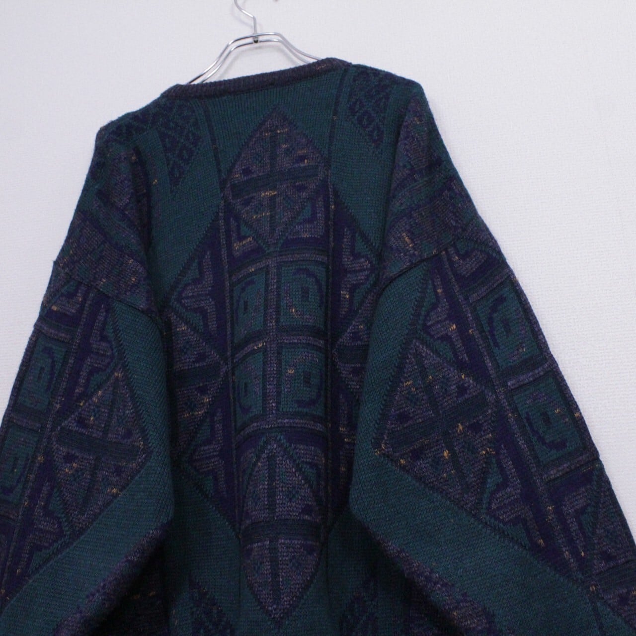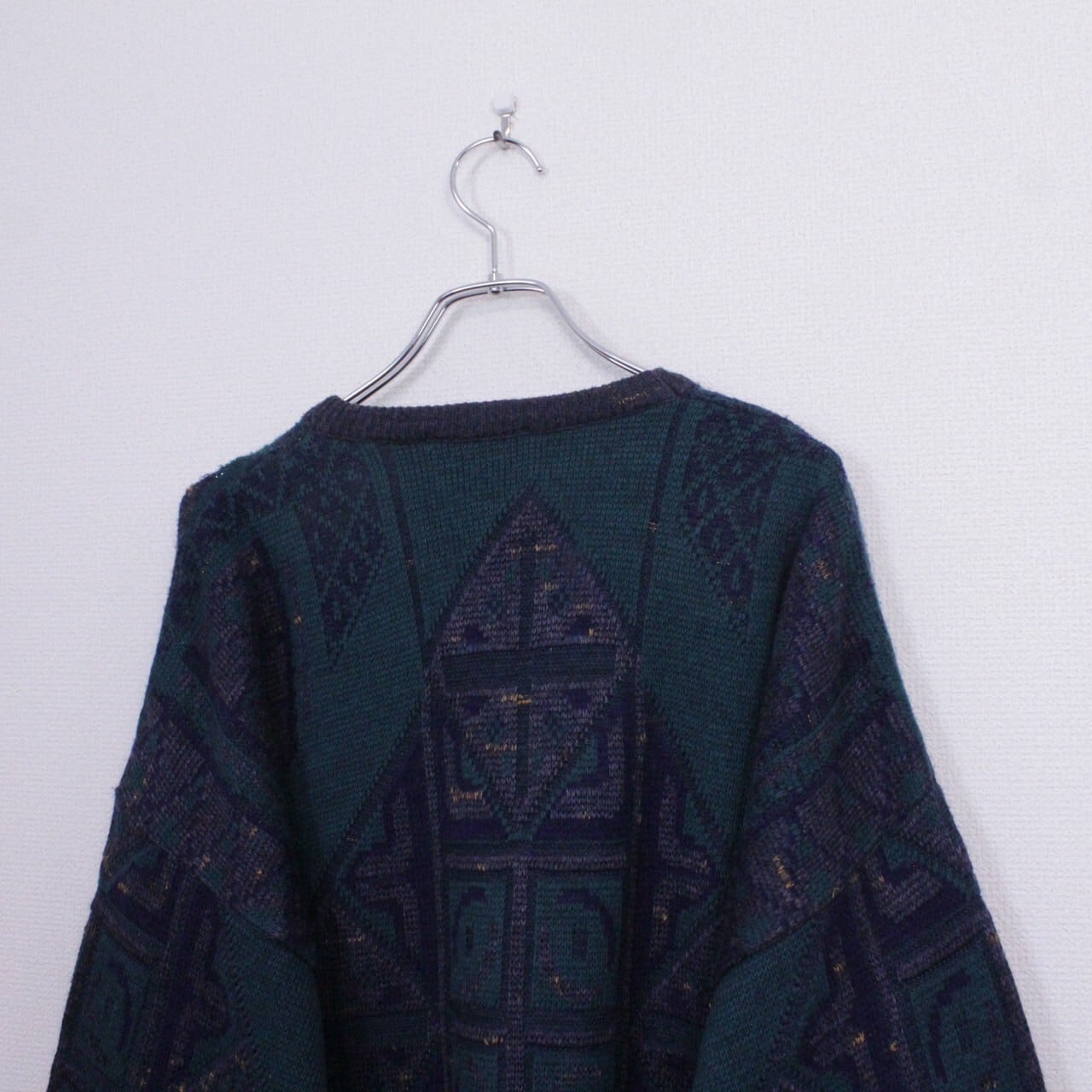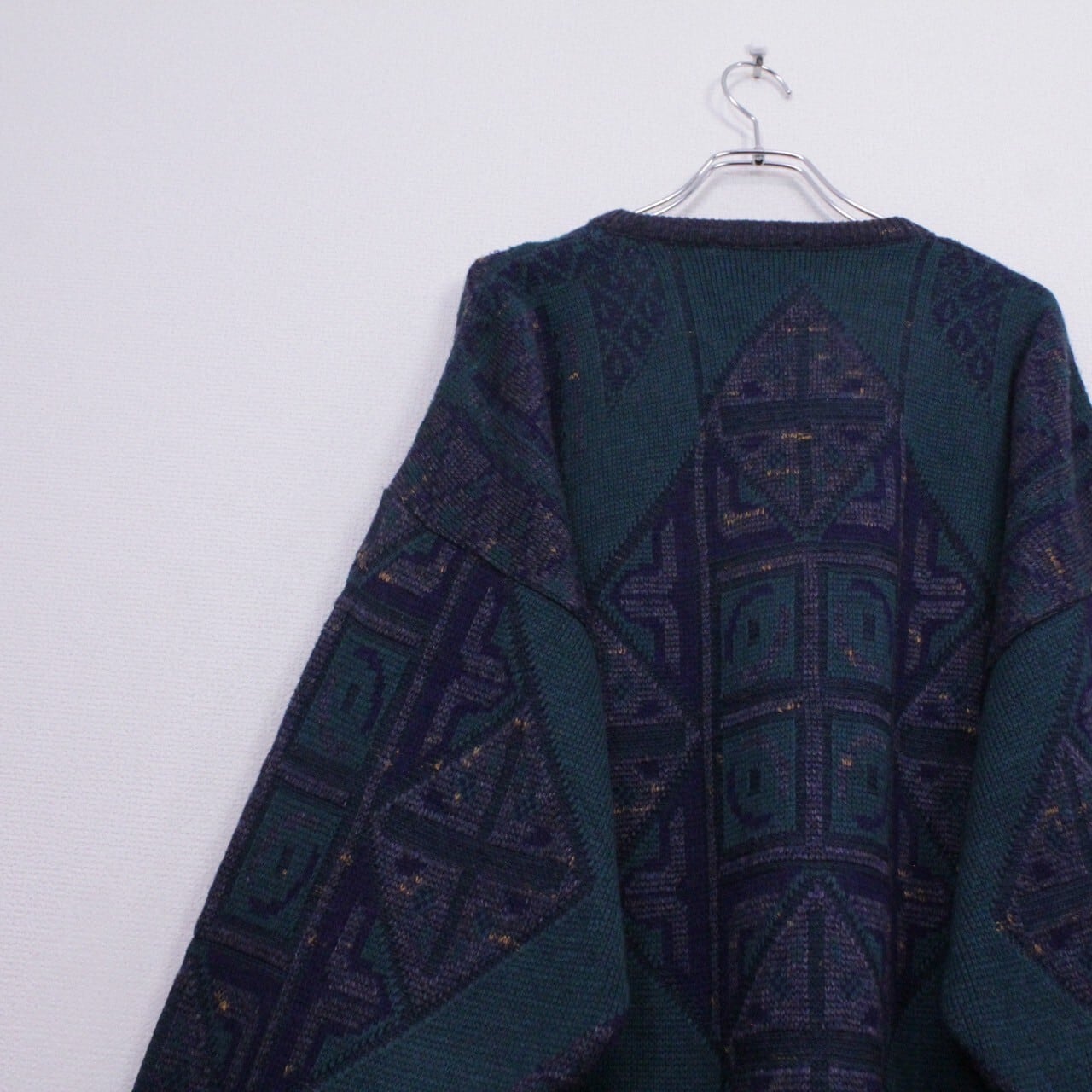 ダークグリーン、ネイビー、グレーを用いてアーティスティックな柄模様を載せたニットをベースに、ブラック×グリーンのカラーレザーを切り替えたプルオーバーニット。