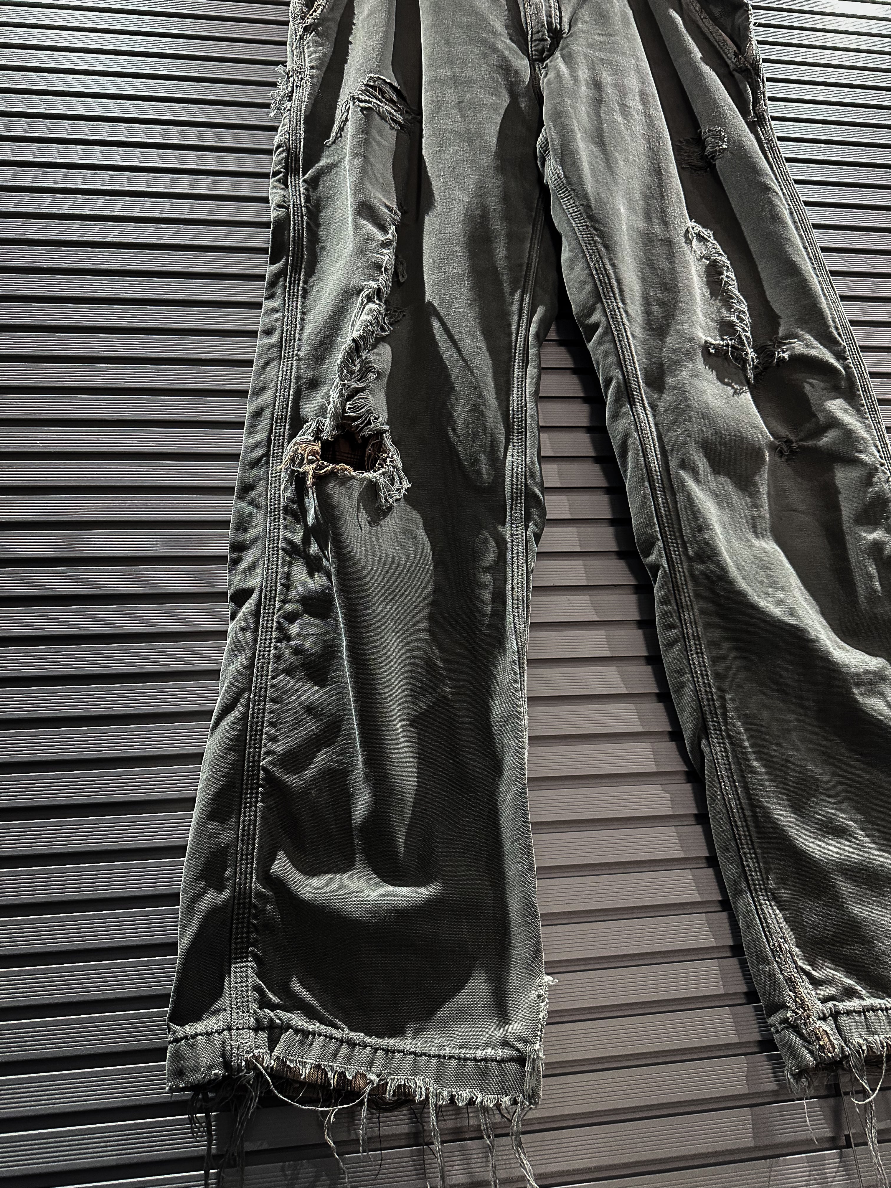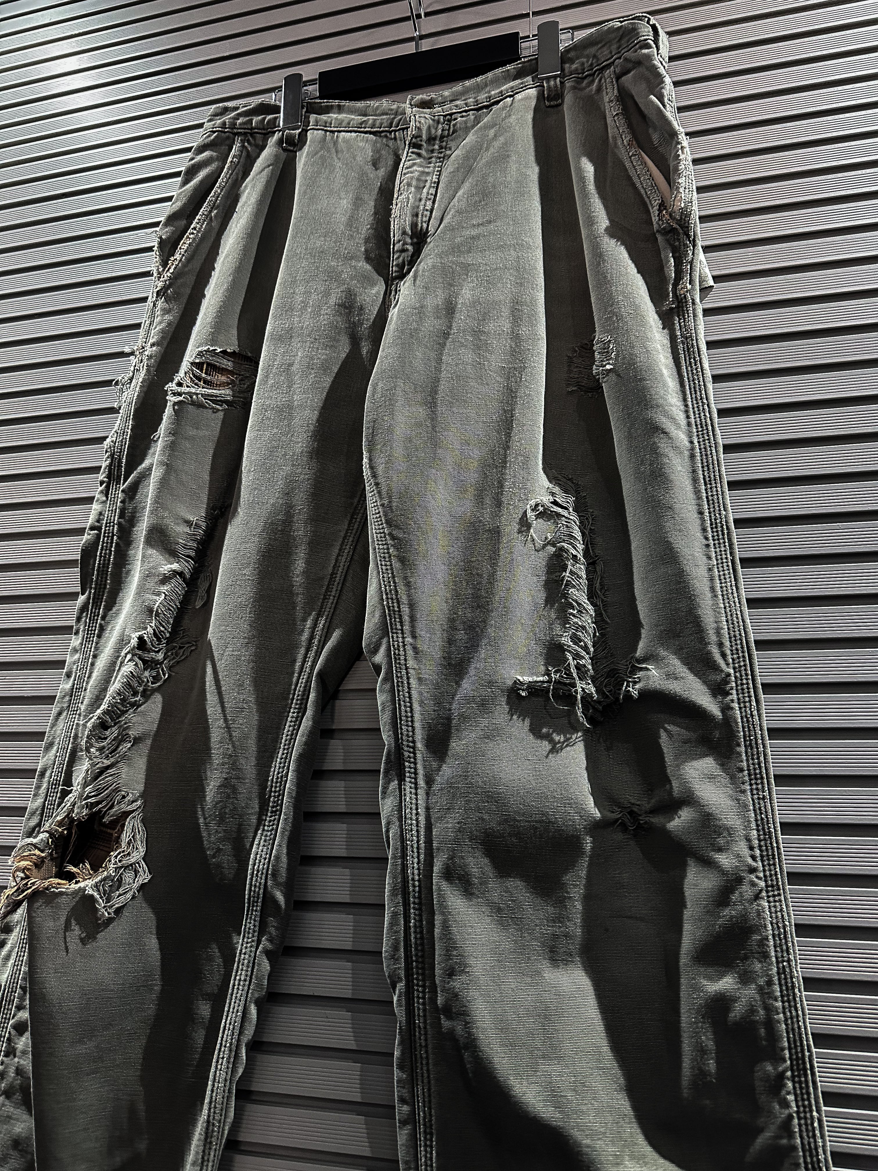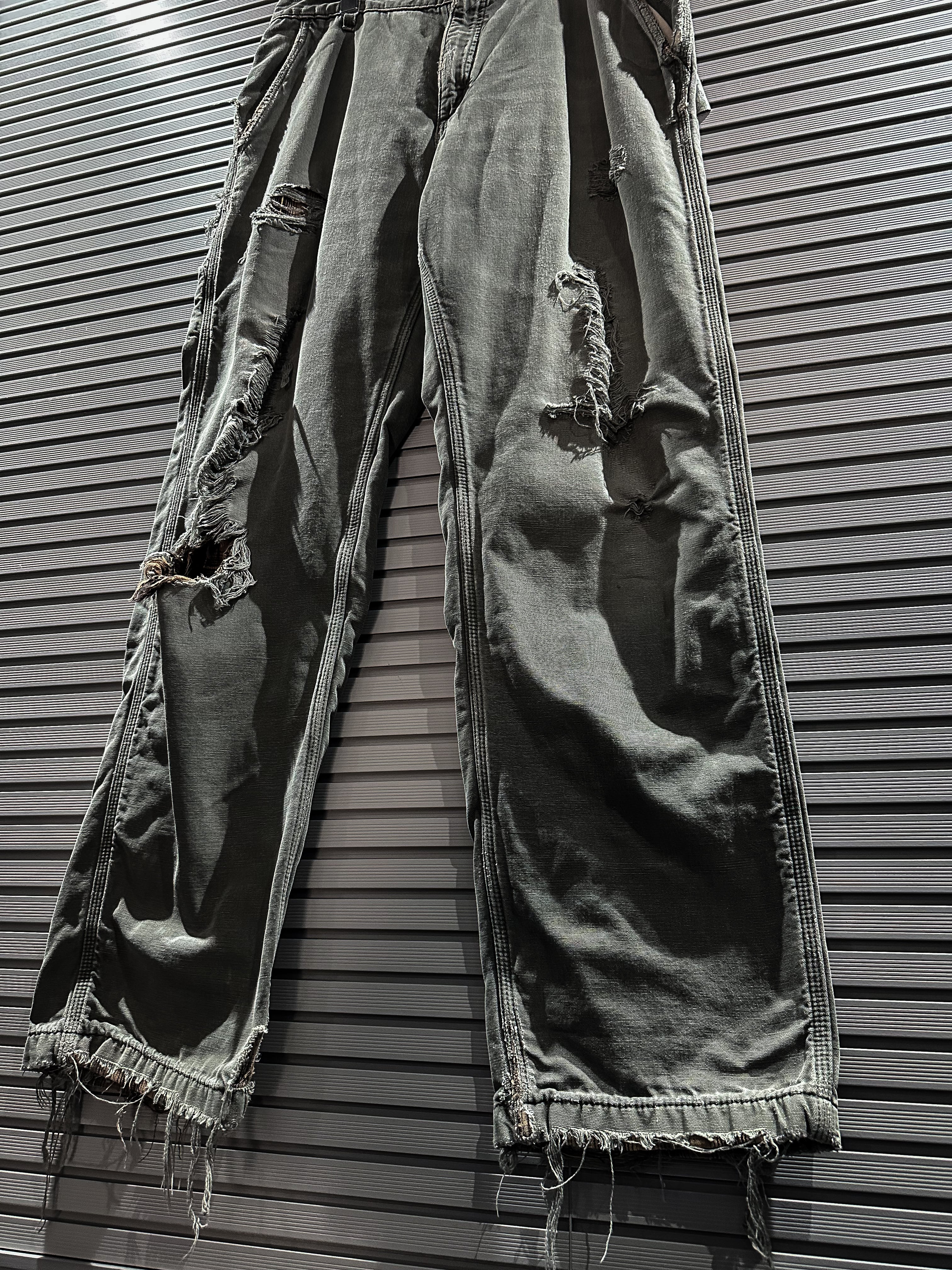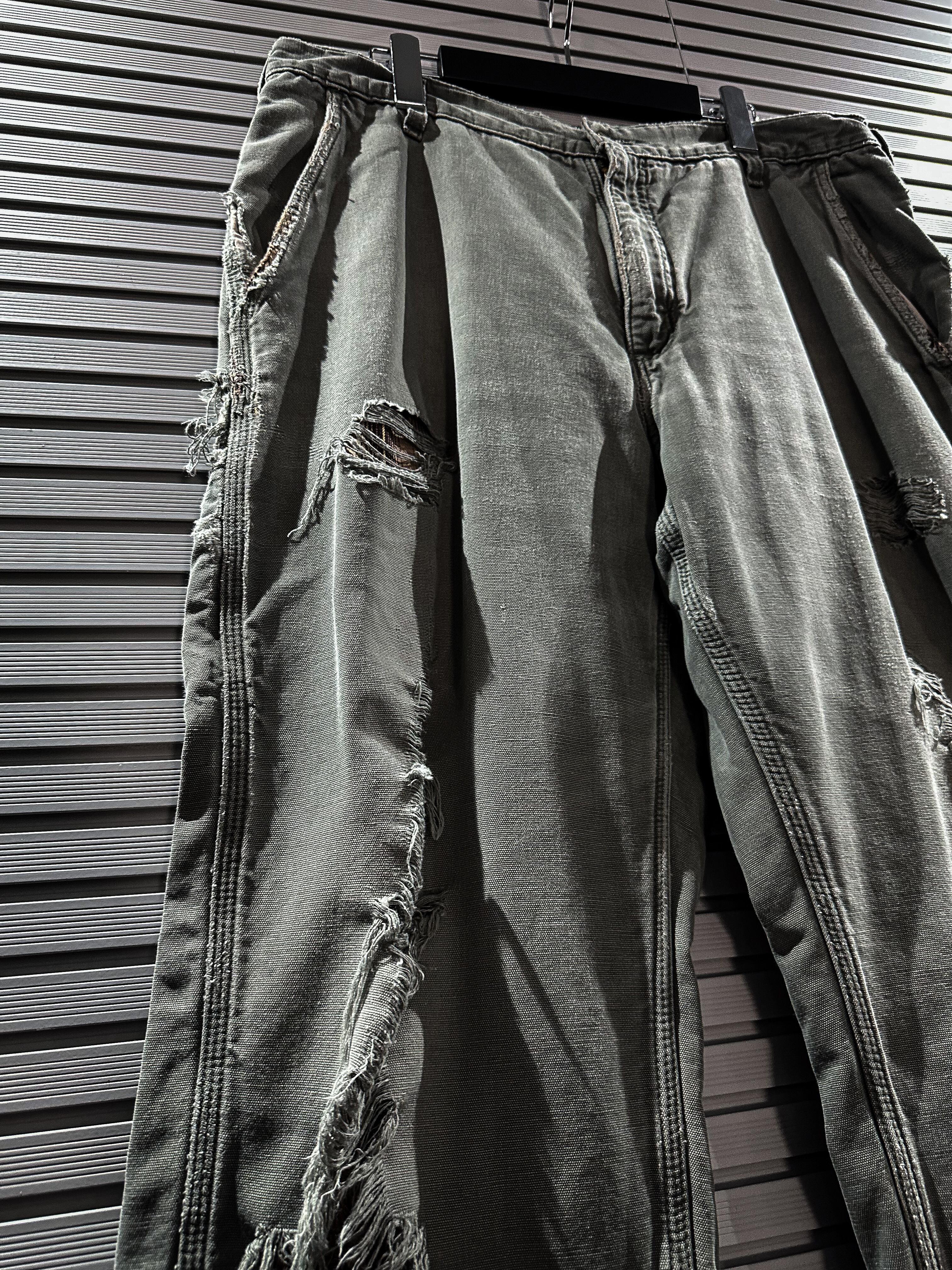 経年変化による美しいフェードの効いたダック地をボディに使用し、大胆なダメージ加工を施したペインターパンツ。
